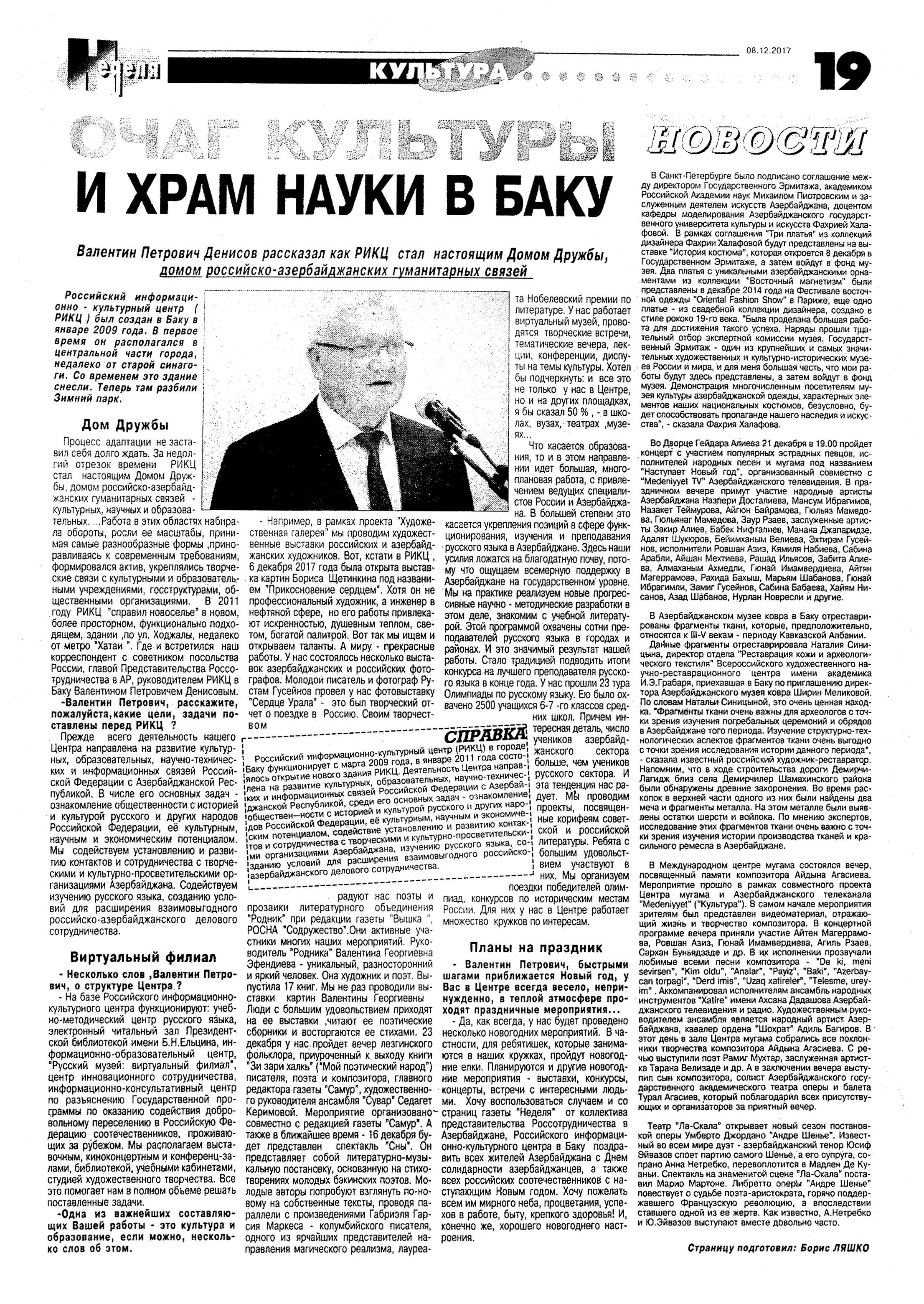 КУЛЬТУРНЫЕ СВЯЗИ 1126. Аббасова, Р. К вопросу о профессиональных контактах: Николай Цискаридзе: Балет «Легенда о любви» Арифа Меликова-один из моих любимых спектаклей //Каспiй.- 2017.- 9 декабря.- С.16-17. 1127. Агазаде, Х. Влияние русской литературы и культуры на Азербайджан: [о проектах фонда «Русский мир»] //Новое время.- 2017.- 9 -11 декабря.- С. 11. 1128. Алиев. Г. Музыка как отражение его души: Видеть планету мирной-жизненное кредо Дюсена Касеинова: [концерт к 70-летию генерального секретаря ТЮРКСОЙ в Анкаре] //Каспiй. - 2017.- 2 декабря.- С.11. 1129. Асадова, И. «Двойной стандарт»: Грузинский и австрийский художники представят в Баку совместный проект: [М.Хиршбихлер и Н. Кутателадзе] //Эхо.- 2017.- 20 декабря.- С. 8. 1130. Асадова, И. «Караваджо - Opera Omnia»: В Центре Гейдара Алиева представлены уникальные творения великого итальянского живописца //Эхо.- 2017.- 15 декабря.- С. 8. 1131. Асадова, И. Журналу «Русский язык и литература в Азербайджане» - 70 лет: [мероприятие в Бакинском Славянском Университете] //Эхо.- 2017.- 29 декабря.- С. 8. 1132. Асадова, И. Константин Райкин: «Для меня Баку это богатейший источник культурных традиций»: [гастроли Театра «Сатирикон» в РДТ имени С.Вургуна] //Эхо.- 2017.- 26 декабря.- С. 8. 1133. Асадова, И. Мистика, монументальность и феномен самосознания: [о совместной выставке художников Грузии, США, Бельгии и Великобритании в YARAT] //Эхо.- 2017.- 19 декабря.- С. 8. 1134. Асадова, И. Разрушаясь, стремимся ввысь: YARAT представит новый проект, отражающий двойственность положения человечества: [о выставке инсталляций зарубежных художников в YARAT] //Эхо.-2017.- 14 декабря.- С. 8. 1135. Асадова, И. Российский ученый отреставрировала в Баку ценные находки: [директор Реставрационного Центра Наталья Синицына в Музее Азербайджанского Ковра] //Эхо.- 2017.- 7 декабря.- С. 8. 1136. Асадова, И. Сын посла показал бакинцам «Вашингтон»: Молодой фотограф познакомил азербайджанцев со своим творчеством: [о фотовыставке Меттью Секута в Галерее «Art Villa»] //Эхо.- 2017.- 26 декабря.- С. 8. 1137. В Астане открылся Музей Гейдара Алиева //Бакинский рабочий.- 2017.- 12 декабря.- С. 3. 1138. В Баку пройдет выставка кукол: [в Музейном Центре] //Ежедневные новости.- 2017.- 15 декабря.- С.103. 1139. В Центре Гейдара Алиева будут представлены произведения известного итальянского художника Караваджо //Бакинский рабочий.-2017.- 8 декабря.- С.10. 1140. В Центре Гейдара Алиева открылась выставка произведений Караваджо //Бакинский рабочий.-2017.- 15 декабря.- С.7. 1141. Гаджиева, Л. Мастер света и тени: В Центре Гeйдapа Aлиeва открылась выставка «Караваджо - опера Омниа»: [представлены репродукции произведений итальянского художника] //Азербайджанские известия.- 2017 - 16 декабря.- С.3. 1142. Жвания, И. Иракли Жвания: «Баку-мое место!»: Интервью с известным грузинским скульптором /провела И.Асадова //Эхо.- 2017.- 22 декабря.- С.8. 1143. Жвания, И. Нам не дано предугадать…: Интервью с известным грузинским скульптором Ираклием Жвания /провела Е.Малахова //Каспiй.- 2017.- 19 декабря.- С.11. 1144. Ислам, А. Польский этнодизайн в Баку: Презентация работ мастеров в Центре современного искусства YARAT //Каспiй.- 2017.- 8 декабря.- С.13. 1145. Касеинов, Д. Маленькая история тюркских стран: Если где-то не знают Гара Гараева или Курмангазы, значит, мы мало работаем: [беседа с генеральным секретарем ТЮРКСОЙ Д.Касеиновым] /провела А.Ислам //Каспiй.- 2017.- 13 декабря.- С.8-9. 1146. Кязимова, С. Диалог культур: [о I фестивале искусства и музыки «Шелковый путь», организованном Goethe-Zentrum B