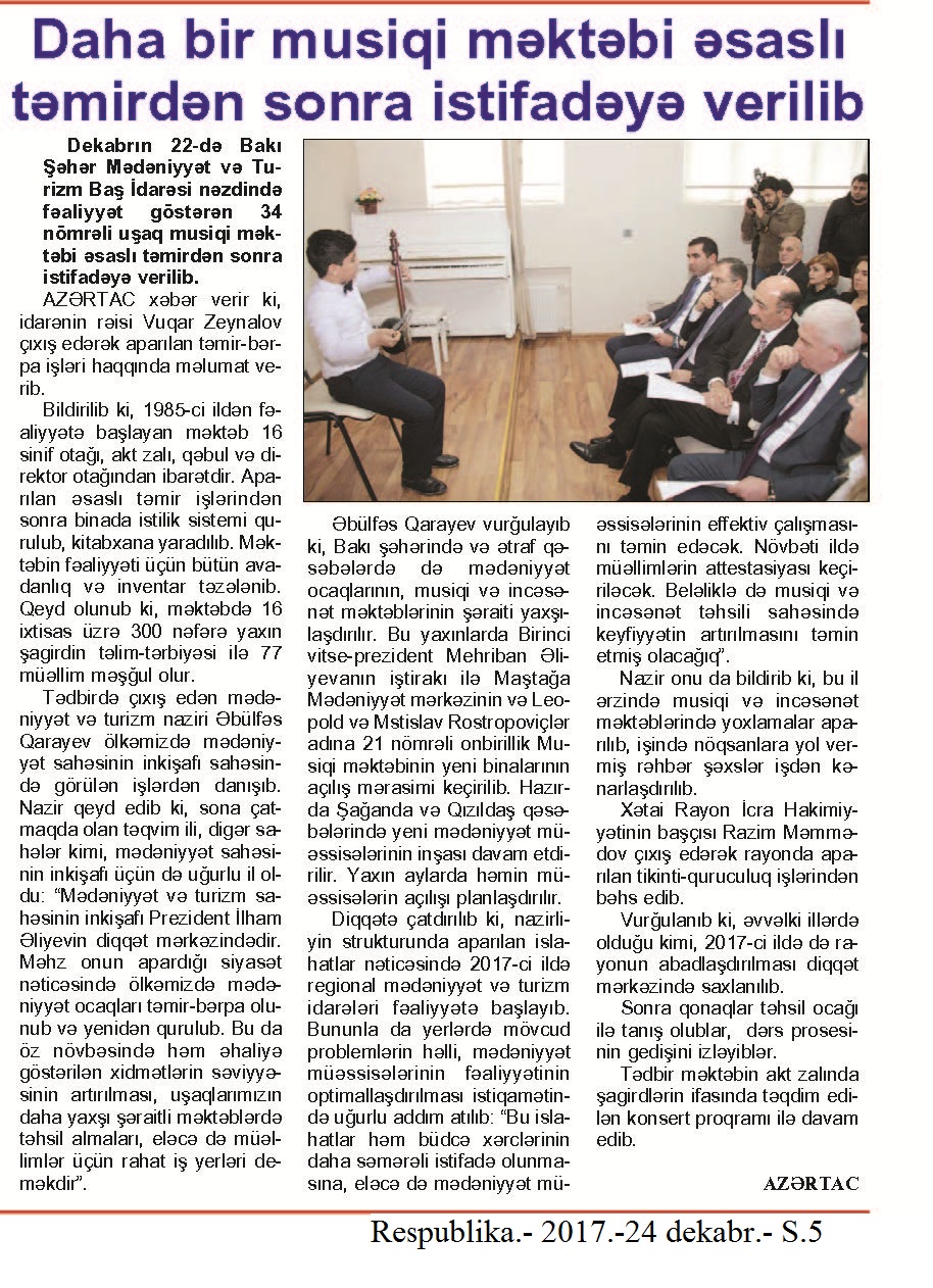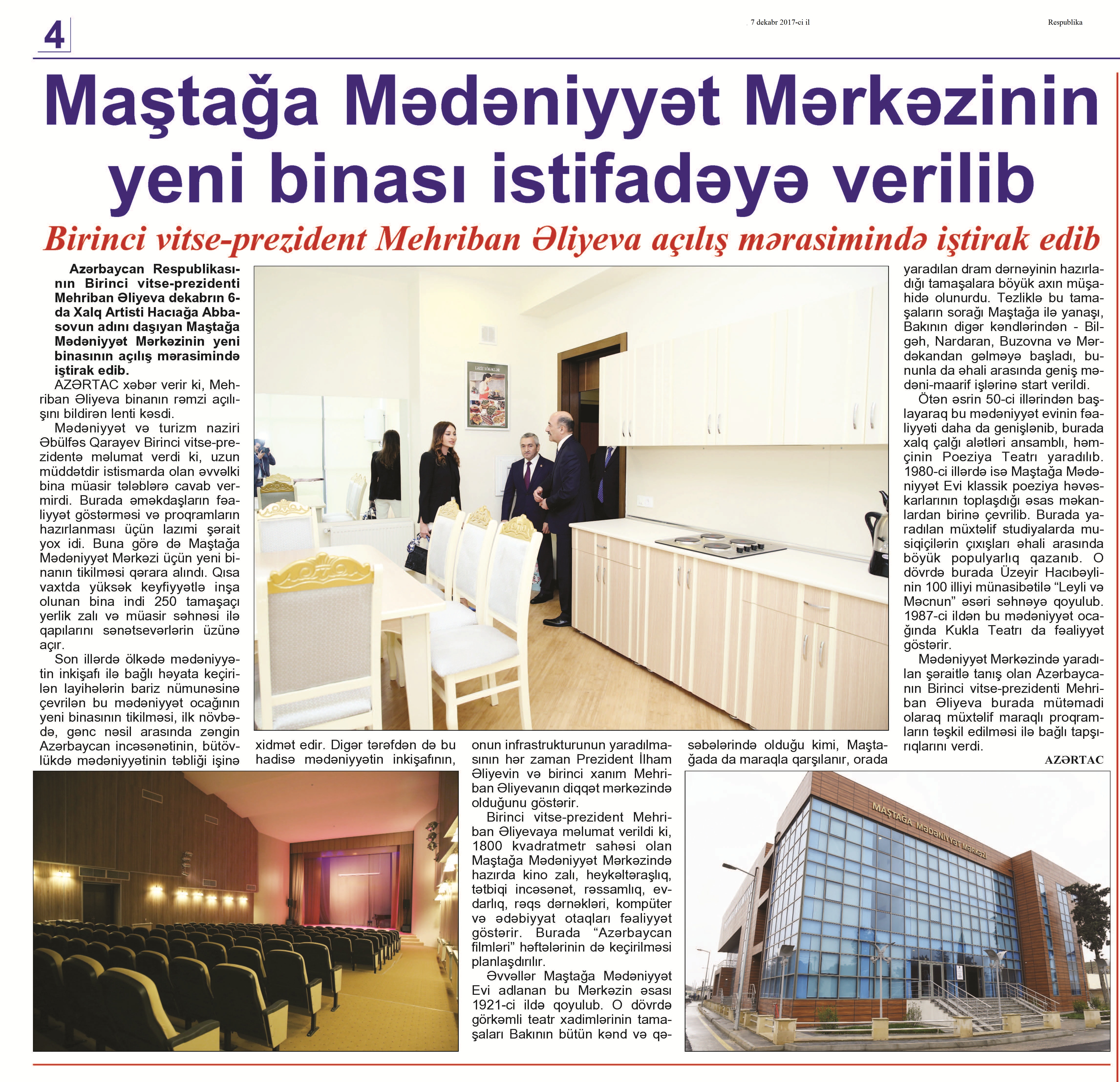 SARAYLAR, MƏDƏNİYYƏT EVLƏRİ VƏ İSTİRAHƏT PARKLARI 199. Maştağa Mədəniyyət Mərkəzinin yeni binası istifadəyə verilib //Respublika.- 2017.- 7 dekabr.- S.4. 200. Mədəniyyətin inkişafı hər zaman Birinci vitse-prezident Mehriban Əliyevanın diqqət mərkəzindədir: [Mehriban Əliyeva Xalq artisti Hacıağa Abbasovun adını daşıyan Maştağa Mədəniyyət Mərkəzinin yeni binasının açılış mərasimində iştirak edib] //Azərbaycan.- 2017.-7 dekabr.- S.5. 201. Paytaxtda yenilənən mədəniyyət ocaqları: Maştağa Mədəniyyət mərkəzinin və Rostropoviçlər adına Musiqi məktəbinin yeni binaları istifadəyə verilib //Mədəniyyət.- 2017.- 8 dekabr.- S.3. 202. Sumqayıtın gəzməli yerlərinə daha bir ünvan əlavə olunub: [Prezident İlham Əliyev Sumqayıt şəhərinə səfəri çərçivəsində Lüdviqşafen parkında əsaslı təmirdən sonra yaradılan şəraitlə tanış olub] //Azərbaycan.- 2017.-16 dekabr.- S.4.
