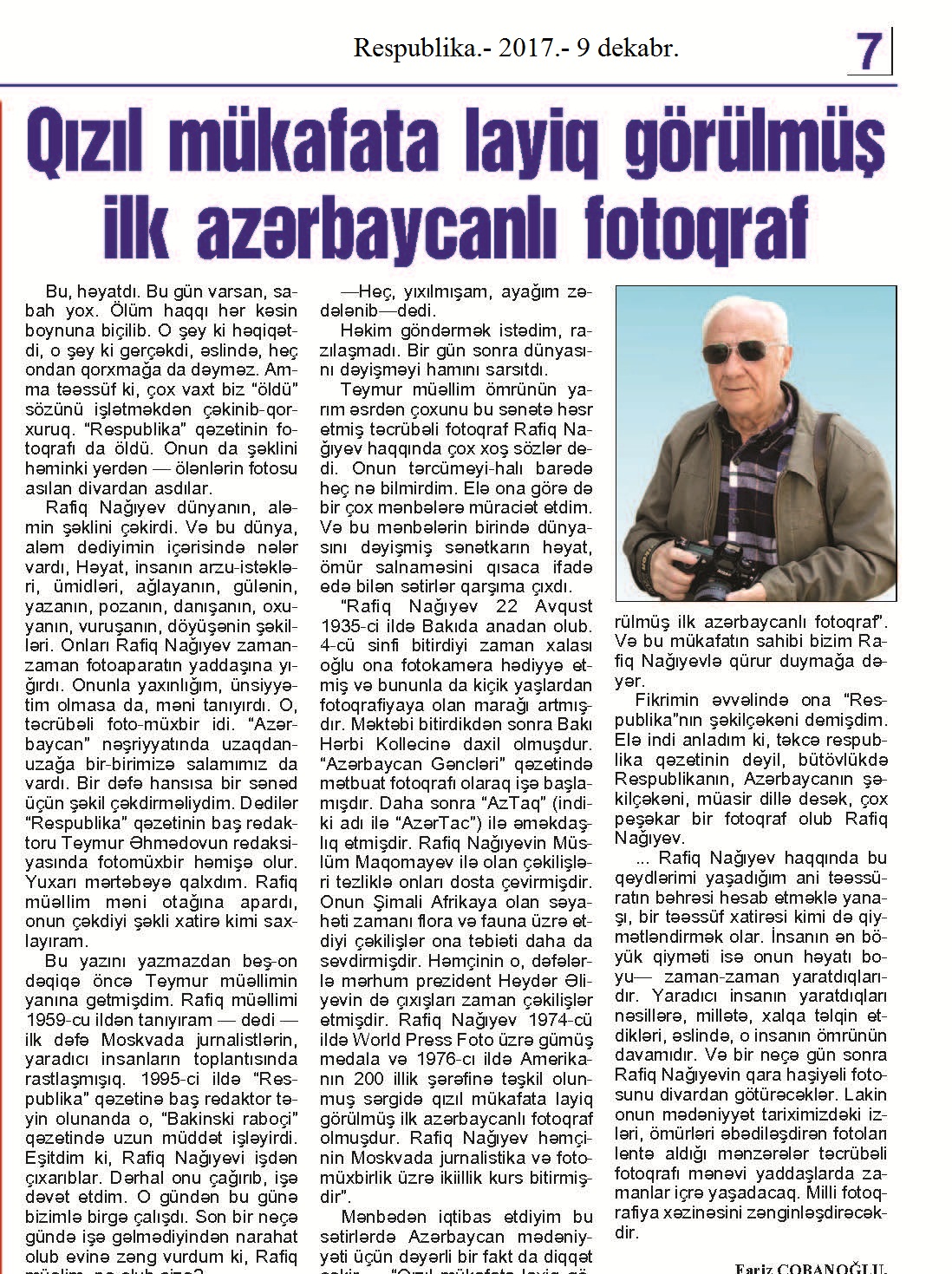 BƏDİİ FOTOQRAFİYA 293. Çobanoğlu, F. Qızıl mükafata layiq görülmüş ilk azərbaycanlı fotoqraf: [1976-cı ildə Amerikanın 200 illiyi şərəfinə təşkil olunmuş sərgidə mükafat almış Rafiq Nağıyev haqqında] //Respublika.- 2017.- 9 dekabr.- S.7.