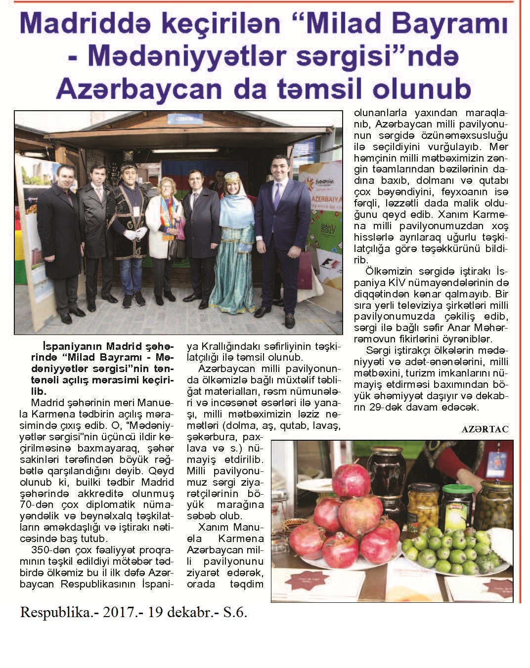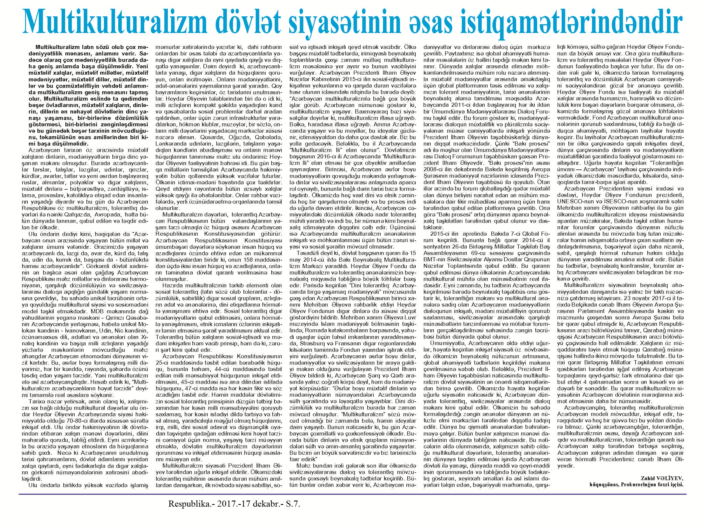 “Multikulturalizm” 111. Azərbaycanda multikulturalizm dövlət siyasətinin prioritet sahələrindən biridir: [Prezident İlham Əliyev ABŞ Etnik Anlaşma Fondunun prezidenti ravvin Mark Şnayeri qəbul edib] //Azərbaycan.- 2017.-21 dekabr.- S.2. 112. Cəfərov, Q. Multikultural dəyərlər diqqət mərkəzində //Respublika.- 2017.- 16 dekabr.- S.11. 113. Eminov, T. Multikulturalizmin dünyaya Azərbaycan örnəyi: [Multikulturalizm siyasəti haqqında] //Ədalət.- 2017.- 26 dekabr.- S.6. 114. İmamverdiyev, E. Azərbaycanda mültikultural dəyərlər insan hüquqları konteksində //Səs.- 2017.- 14 dekabr.- S.9. 115. İmanlı, K. Azərbaycanda multikulturalizm siyasəti: ənənə və müasirlik //525-ci qəzet.- 2017.- 26 dekabr.- S. 8. 116. İsmayılqızı, X. Bütün dinlərə qarşılıqlı hörmət xalqımızın həyat tərzidir //İki sahil.- 2017.-15 dekabr.- S.13. 117. Qarayeva, L. Çoxmədəniyyətliliyin və tolerantlığın Azərbaycanda tarixi ənənələri mövcuddur //Azərbaycan.- 2017.-29 dekabr.- S.6. 118. Lo.s Anceles din xadimləri: Azərbaycan multikulturalizmi bütün dünyaya örnəkdir: [Azərbaycanın Los Ancelesdəki baş konsulu Nəsimi Ağayev Azərbaycanın tarixi tolerantlığı və multikulturalizm ənənələri haqqında cıxış edib] //İki sahil.- 2017.- 9 dekabr.- S.11. 119. Məhərrəmov, K. Multikulturalizmin Azərbaycan modeli //Xalq qəzeti.- 2017.- 31 dekabr.- S.9. 120. Məmmədov, S. Mehriban Əliyeva: Hər bir cəmiyyətin gücü onun dini və milli müxtəlifliyindədir //Xalq qəzeti.- 2017.- 31 dekabr.- S.3. 121. Məmmədova, G. Azərbaycanda çoxmədəniyyətliyin və tolerantlığın tarixi ənənələri //Xalq qəzeti.- 2017.- 19 dekabr.- S.8. 122. Vəliyev, Z. Mültikulturalizm dövlət siyasətinin əsas istiqamətlərindəndir //Respublika.- 2017.- 17 dekabr.- S.7.