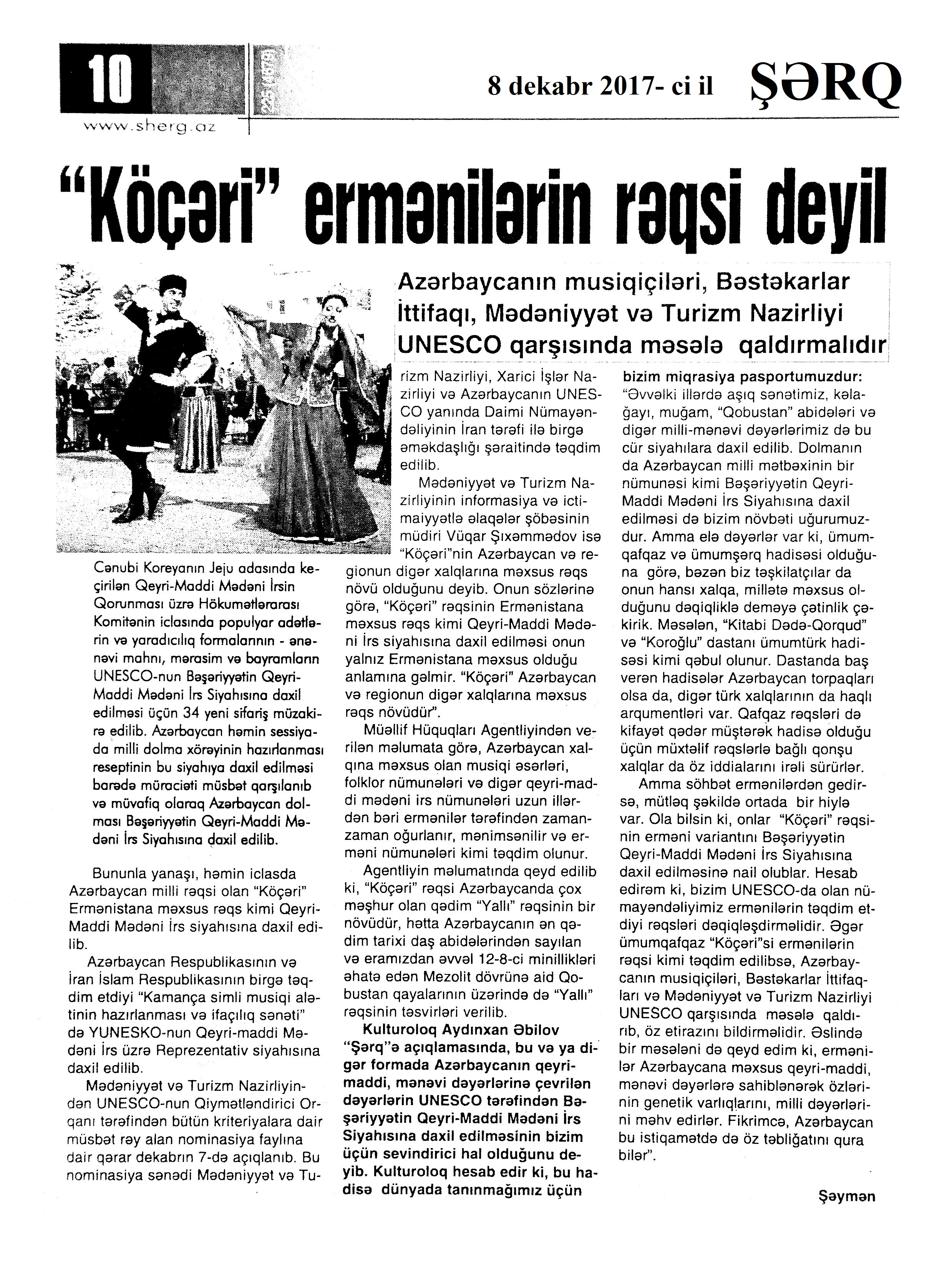 UNESCO-nun Qeyri-Maddi Mədəni İrsin Qorunması üzrə Hökumətlərarası Komitəsinin 12-ci sessiyası 191. Mədəni irsimizin dünyada növbəti təntənəsi: Milli mətbəximizin ləziz nemətlərindən dolmanın hazırlanma-paylaşma ənənəsi və musiqi irsimizin ecazkar nümunəsi olan kamançanın hazırlanması və ifaçılıq sənəti UNESCO-nun siyahısına salınıb: [Koreya Respublikasının Jeju adasında UNESCO-nun Qeyri-Maddi Mədəni İrsin Qorunması üzrə Hökumətlərarası Komitəsinin 12-ci sessiyasında] //Mədəniyyət.- 2017.- 8 dekabr.- S.8. 192. UNESCO-nun Hökumətlərarası Komitəsinin 12-ci sessiyası davam edir: [Koreya Respublikasının Jeju adasında davam edən tədbirdə Azərbaycan nümayəndə heyətinin iştirak etməsi haqqında] //Mədəniyyət.- 2017.- 6 dekabr.- S.2. 193. UNESCO-nun Qeyri-Maddi Mədəni İrsin Qorunması üzrə Hökumətlərarası Komitəsinin 12-ci sessiyası işə başlayıb: [Koreya Respublikasının Jeju adasında keçirilən tədbirdə Azərbaycan nümayəndə heyəti iştirak edib] //Azərbaycan.- 2017.-5 dekabr.- S.8. 194. UNESCO-nun QHT Forumunda Ermənistanın təxribatçılığı pislənilib: [Koreya Respublikasının Jeju adasında UNESCO-nun Qeyri-Maddi Mədəni İrsin Qorunması üzrə Hökumətlərarası Komitəsinin 12-ci sessiyasında] //Mədəniyyət.-2017.- 13 dekabr.- S.5.