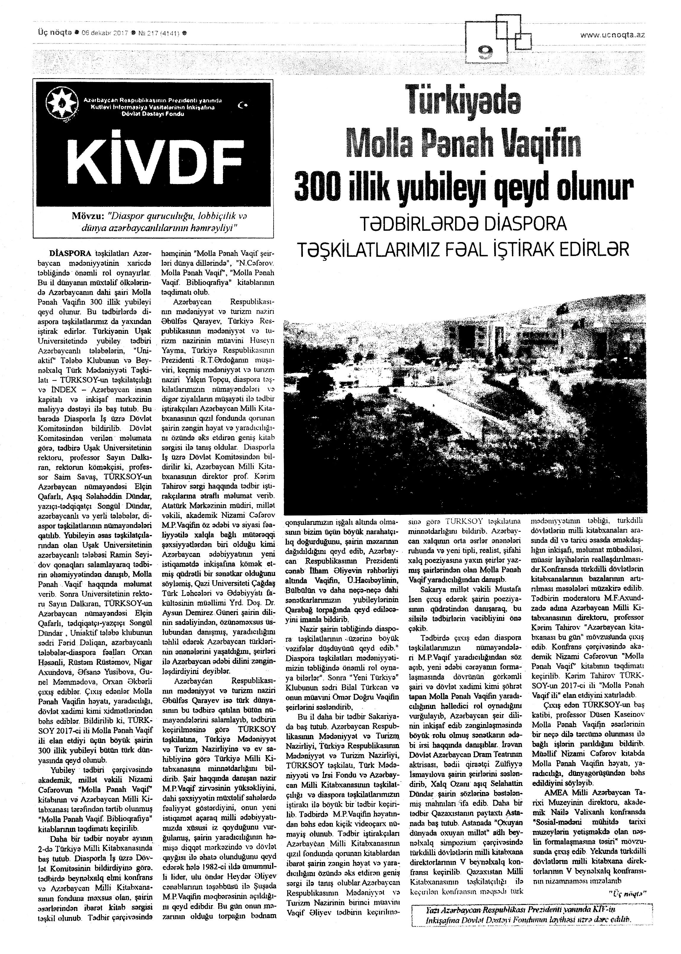 Bax: 86; 262; 269 Molla Pənah Vaqif – 300 1005. Anar. Yoxluqdan varlığa: “Səhər-səhər” rubrikası //525-ci qəzet.- 2017.- 9 dekabr.- S.10-11. 1006. Aslan, V. Molla Pənah Vaqif və Şəki ədəbi mühiti //Ədalət.- 2017.- 9 dekabr.- S.4. 1007. Bayramov, Q. Molla Pənah Vaqif və Qarabağ ədəbi mühiti //Ədalət.- 2017.- 21 dekabr.- S.7. 1008. Bayramov, Q. Molla Pənah Vaqif və Qarabağ ədəbi mühiti //Ədalət.- 2017.- 22 dekabr.- S.7. 1009. Bayramov, Q. Molla Pənah Vaqif və Qarabağ ədəbi mühiti //Ədalət.- 2017.- 23 dekabr.- S.4. 1010. Bayramov, Q. Molla Pənah Vaqif və Qarabağ ədəbi mühiti //Ədalət.- 2017.- 26 dekabr.- S.7. 1011. Bilman. Türk dünyasının böyük şairi: Molla Pənah Vaqif: [Pirallahı rayonundakı 186 saylı tam orta məktəbdə şairin yubileynə həsr edilmiş tədbirin keçirilməsi haqqında] //Azad Azərbaycan.- 2017.- 15 dekabr.- S.4. 1012. Əhmədov, R. Mirzə Fətəli Axundzadənin ədəbi tənqidi: Və ya onun imtahanından üzüağ çıxan Molla Pənah Vaqif //Kaspi.-2017.- 2 dekabr.- S.7. 1013. Əliyev, S. Qazaxda kitab sərgisi keçirilib: [tədbirdə akademik Nizami Cəfərovun “Molla Pənah Vaqif” və Milli Kitabxananın nəşr etdirdiyi “Molla Pənah Vaqif. Biblioqrafiya” kitablarının təqdimatı olmuşdur] //Azərbaycan.- 2017.-8 dekabr.- S.7. 1014. Fariz. Üç əsri arxada qoyan qüdrətli söz ustadı: Molla Pənah Vaqifin 300 illik yubileyi təntənəli mərasimlə qeyd olundu: [Dövlət Akademik Milli Dram Teatrında] //Mədəniyyət.- 2017.- 8 dekabr.- S.2. 1015. Görkəmli ədiblərin yubileyləri kitabxanalarda qeyd edilib: [Xətai Rayon Mərkəzi Kitabxanasında Hüseyn Cavidin 135 illiyi və Sabir adına Mərkəzi Şəhər Kitabxanasında Molla Pənah Vaqifin yubileyinə həsr olunmuş tədbirin keçirilməsi haqqında] //Mədəniyyət.- 2017.- 13 dekabr.- S.2. 1016. Görkəmli şairin 300 illiyinə həsr olunmuş tədbir: [Biləsuvar rayonundakı Heydər Əliyev Mərkəzində] //Mədəniyyət. - 2017.- 27 dekabr.- S.11. 1017. Xədicə. Qazaxda Molla Pənah Vaqif bayramı //525-ci qəzet.- 2017.- 6 dekabr.- S.7. 1018. Qasımov, H. Qazaxda Molla Pənah Vaqifin 300 illiyinə həsr olunmuş möhtəşəm tədbir //Xalq qəzeti.- 2017.- 7 dekabr.- S.10. 1019. Qazaxda Molla Pənah Vaqifin 300 illiyi qeyd olunub //Mədəniyyət.- 2017.- 6 dekabr.- S.5. 1020. Lalə. Türk dünyasının iki böyük şairi bir tədbirdə anıldı: [Milli Kitabxanada Qaysın Quliyevin anadan olmasının 100 illiyi və Molla Pənah Vaqifin yubileyi ilə əlaqədar TÜRKSOY tərəfindən təşkil olunan tədbirlərin yekun mərasimi haqqında] //Mədəniyyət.- 2017.- 13 dekabr.- S.4. 1021. Mahmud. Pirallahıda Molla Pənah Vaqifin 300 illik yubileyi qeyd edilib //Palitra.- 2017.- 15 dekabr.- S.13. 1022. Məcidova, X. Molla Pənah Vaqifin 300 illik yubileyi qeyd olunub: [Azərbaycan Dövlət Akademik Milli Dram Teatrında] //Ədəbiyyat qəzeti.- 2017.- 9 dekabr.- S.13. 1023. Molla Pənah Vaqifin 300 illiyi münasibətilə təntənəli mərasim keçiriləcək: [Azərbaycan Dövlət Akademik Milli Dram Teatrında] //Mədəniyyət.- 2017.- 6 dekabr.- S.2. 1024. Molla Pənah Vaqifin 300 illik yubileyi təntənəli mərasimlə qeyd olunub: [Azərbaycan Dövlət Akademik Milli Dram Teatrında] //Yeni Azərbaycan.- 2017.- 8 dekabr.- S.10. 1025. Mükərrəmoğlu, M. TÜRKSOY “Molla Pənah Vaqif İli”nə yekun vurdu: Tədbirdə həm də Kabardin-Balkar şairi Kaysın Kuliyevin 100 illik yubileyi də qeyd olundu: [Milli Kitabxanada keçirilən tədbir haqqında] //Xalq qəzeti.- 2017.- 9 dekabr.- S.8. 1026. Müşfiq, Ş. Bakıda Qaysın Quliyevin 100 illik yubileyi keçirildi: [Xalq şairinin yubileyi ilə əlaqədar TÜRKSOY tərəfindən keçirilən yekun tədbirində Kabardin-Balkar şairinin 100 illiyi də qeyd olundu] //525-ci qəzet.- 2017.- 9 dekabr.- S.7. 1027. Müşfiq, Ş. Vaqifin 300 illik yubileyi Milli Dram Teatrında qeyd olundu //525-ci qəzet.- 2017.- 9 dekabr.- S.7. 1028. “Sevən Molla Pənah Vaqif sevilir”: [Ağsuda şairin yubileyi münasibətilə keçirilən eyniadlı tədbir haqqında] //Mədəniyyət.- 2017.- 20 dekabr.- S.14. 1029. Türkiyədə Molla Pənah Vaqifin 300 illik yubileyi qeyd olunur: Tədbirlərdə diaspora təşkilatlarımız fəal iştrak edıblər //Üç nöqtə.- 2017.- 6 dekabr.- S.9. 1030. Vaqifin 300 illik yubileyi Şimali Kiprdə qeyd olunub //Mədəniyyət.- 2017.- 27 dekabr.- S.3. 1031. Zakirova, P. Molla Pənah Vaqifin əsərlərinin tədqiqi və nəşri tarixinə dair //Ədalət.- 2017.- 16 dekabr.- S.4.