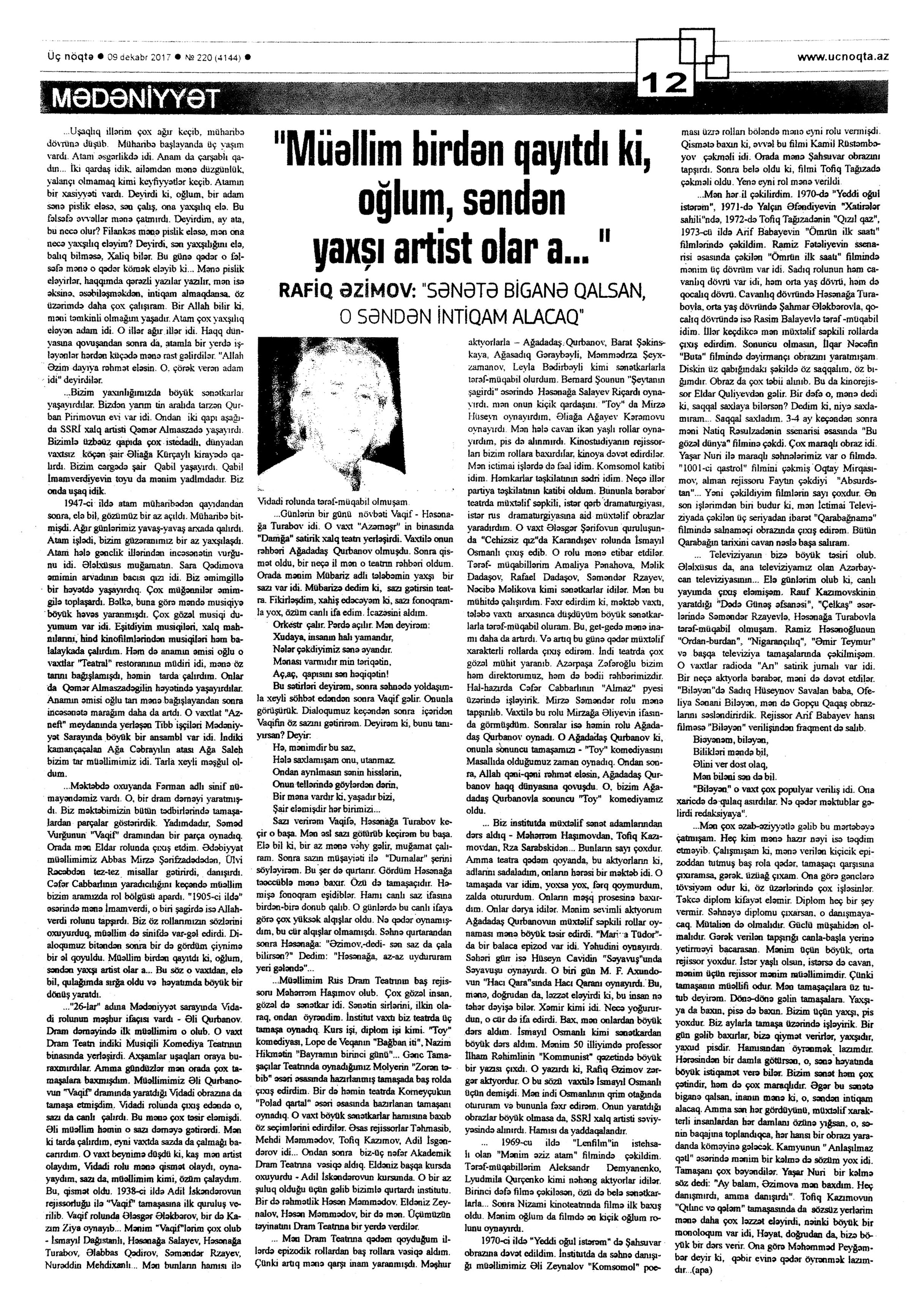 Bax: 146; 176 Akademik Milli Dram Teatrı 547. Azəri, L. Sevgini etiraf etməyi də bacarmaq lazımdır: [teatrda Mərahim Fərzəlibəyovun hazırladığı “Qətibə İnanc” tamaşasının premyerası haqqında] //Mədəniyyət.-2017.- 22 dekabr.- S.10. 548. Hüseynov, F. Vətəni coşqun məhəbbətlə sevən səhnə xadimi: Xalq artisti Mikayıl Mirzənin 70 illiyi qeyd olundu //Mədəniyyət.- 2017.- 1 dekabr.- S.6. 549. Xalq artisti Sona Hacıyevanın 110 illiyinə həsr olunmuş xatirə tədbiri: [Teatr Xadimləri İttifaqında] //Mədəniyyət.- 2017.- 27 dekabr.- S.13. 550. “Qılınc və qələm” yeni yozumda səhnəyə gəlir: [Mərahim Fərzəlibəyovun hazırladığı eyniadlı tamaşa teatrın səhnəsində] //Mədəniyyət.- 2017.- 8 dekabr.- S.6. 551. Lalə. Milli Dram Teatrında “Qətibə İnanc” tamaşasının premyerası: [Mərahim Fərzəlibəyovun hazırladığı eyniadlı tamaşa haqqında] //Mədəniyyət.- 2017.- 15 dekabr.- S.2. 552. Mədətov, A. Məhəbbəti rədd edilən qadının faciəsi: [Akademik Milli Dram Teatrında rejissor Mərahim Fərzəlibəyovun quruluş verdiyi “Qətibə İnanc” tamaşası haqqında] //525-ci qəzet.- 2017.- 27 dekabr.- S.6. 553. “Müəllim birdən qayitdı kı, oğlum, səndən yaxşı artist olar a...: Rafiq Əzimov: Sənətə biganə qalsan, o səndən intiqam alacaq”: [Xalq artisti haqqında] //Üç nöqtə.- 2017.- 9 dekabr.- S.12. 554. Mütəllimova, F. “Rahatlığım olsaydı, on uşaq böyüdərdim”: Firəngiz Mütəllimova: “Əhd eləmişəm ki, Şuşa alınsın, mədəniyyət evinin qabağında ayaqyalın oynayacam”: [Xalq artisti ilə müsahibə] Xalq cəbhəsi.- 2017. - 8 dekabr.- S.13. 555. Rəhman, X. Xalq artisti Mikayıl Mirzənin anadan olmasının 70 illiyi qeyd edildi //525-ci qəzet.- 2017.- 1 dekabr.- S.7. 556. Vahidqızı, Ü. Xalq artisti Sona Hacıyevanın 110 illiyi qeyd olunub: [teatrda keçirilən yubiley tədbiri haqqında] //Xalq qəzeti.- 2017.- 27 dekabr.- S.16.