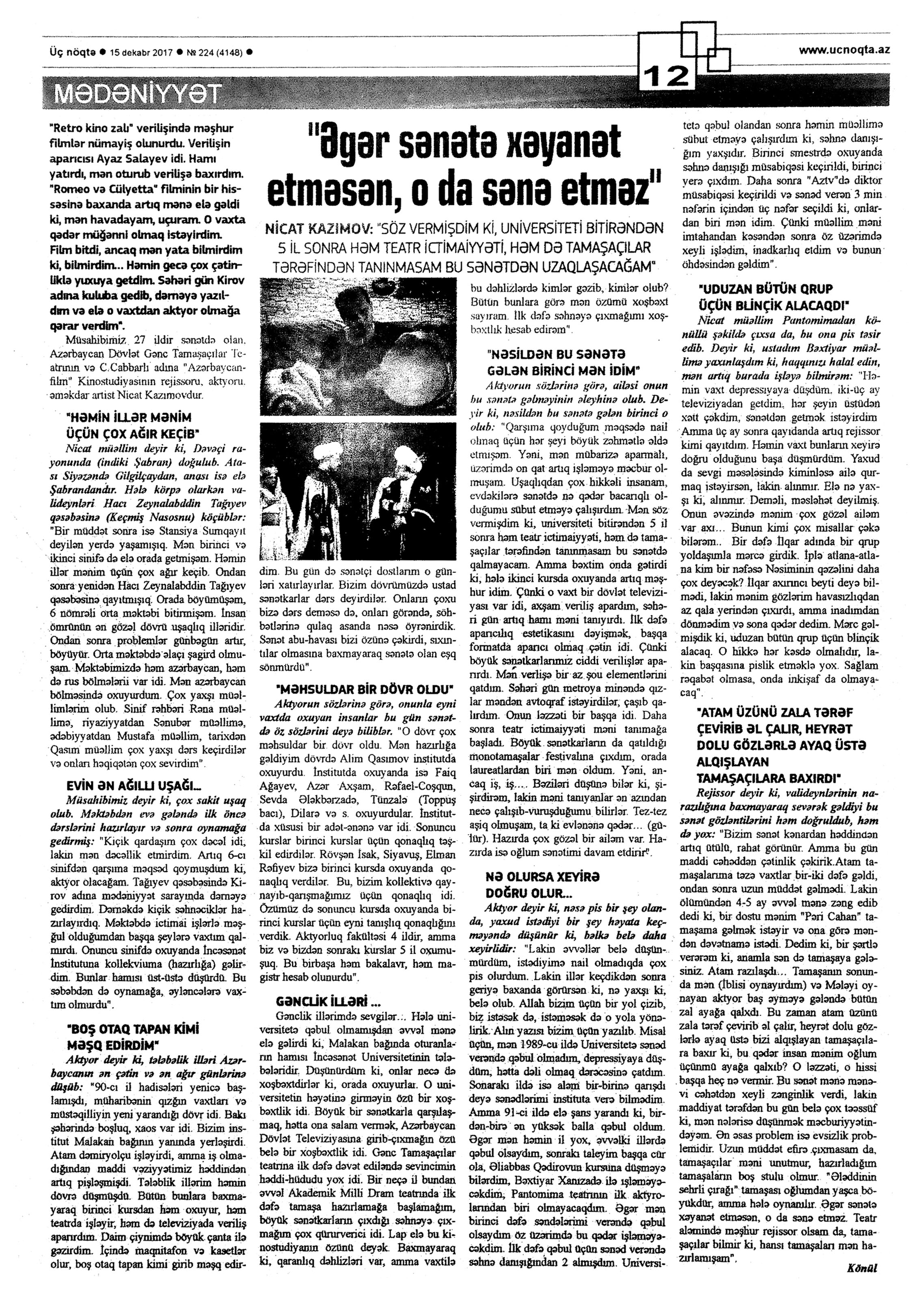 Azərbaycan Dövlət Gənc Tamaşaçılar Teatrı 557. Könül. “Əgər sənətə xəyanət etməsən, o da sənə etməz”: [teatrın rejissoru Nicat Kazımov haqqında] //Üç nöqtə.- 2017.- 15 dekabr.- S. 12. 558. Lalə. “İstədiyim kimi yaşayıram”: [Ağakişi Kazımovun hazırladığı eyniadlı tamaşa teatrın səhnəsində] //Mədəniyyət.- 2017.- 1 dekabr.- S.4. 559. Lalə. Uşaqlar üçün maraqlı Yeni il tamaşası: [Elşad Rəhimzadənin hazırladığı “Hörümçək adam” tamaşasının nümayişi haqqında] //Mədəniyyət. - 2017.- 8 dekabr.- S.6. 560. Mirməmməd, G. “Kimin üçün nəhəng, kimin üçün də cırtdan Qulliver: [Elşad Rəhimzadənin hazırladığı “Qulliver” tamaşasının nümayişi haqqında] //Mədəniyyət.- 2017.- 6 dekabr.- S.11. 561. Nəzrin. Məktəblilər Pərvinin pyesini oynadılar: Heydər Əliyev adına Müasir Təhsil Kompleksində gənc dramaturqun “Mauqlinin Yeni ili” pyesi səhnələşdirildi: [teatrın aktrisası Gülər Nəbiyevanın hazırladığı eyniadlı tamaşa haqqında] //525-ci qəzet.- 2017.- 27 dekabr.- S.7.