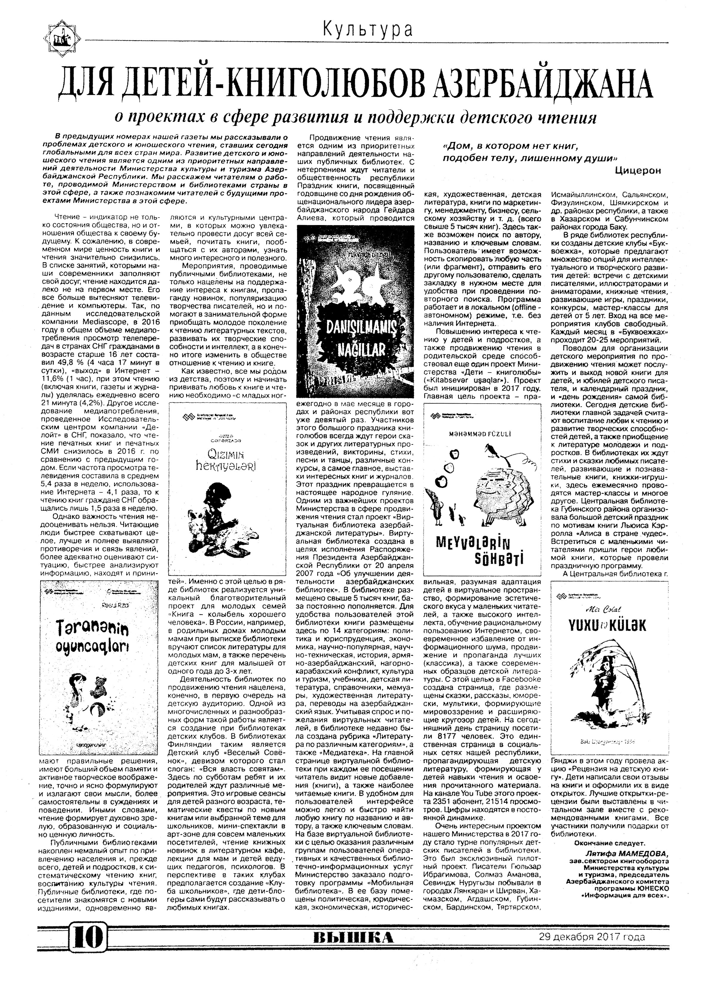 KİTABXANA İŞİ 205. Aşıq sənətinə töhfə – “Ozan” elm və sənət toplusu: [Milli Kitabxanada eyniadlı toplunun təqdimatı haqqında] //Mədəniyyət.- 2017.- 27 dekabr.- S.5. 206. Fərəcov, S. Görkəmli nasir, tarix və mədəniyyətimizin yorulmaz təbliğatçısı: “Yusif Vəzir Çəmənzəminli. Biblioqrafiya” kitabının təqdimatı keçirildi: [Milli Kitabxanada] //Mədəniyyət.- 2017.- 20 dekabr.- S.3. 207. Hüseynov, F. “İlin ən yaxşı kitabxanası” müsabiqəsinin qalibləri mükafatlandırılıb: Sabirabad rayonu Heydər Əliyev Mərkəzində “İlin ən yaxşı kitabxanası” müsabiqəsi qaliblərinin mükafatlandırılma mərasimi keçirildi: [mərasimdə çıxış edən Mədəniyyət və Turizm naziri Əbülfəs Qarayevin qalibləri təbrik etməsi haqqında] //Mədəniyyət.- 2017.- 20 dekabr.- S.6. 208. Kitabxanaçılar üçün təlimlər: [Bakı Şəhəri üzrə Təhsil İdarəsinin tabeliyindəki ümumtəhsil müəssisələrinin kitabxanaçıları üçün] //Mədəniyyət.- 2017.- 15 dekabr.- S.4. 209. Kitabxanalardakı “Amerika guşələri”ndə silsilə tədbirlər keçirilib: [regionlarda] //Mədəniyyət.- 2017.- 27 dekabr.- S.11. 210. Lalə. Hindistan səfiri Milli Kitabxana ilə tanış olub: [Hindistanın Azərbaycandakı səfiri Sancay Rana] //Mədəniyyət.- 2017.- 15 dekabr.- S.4. 211. Nazirliyin kitabxana-informasiya sahəsində növbəti layihəsi Gəncədə gerçəkləşib: [“Xalqların qədim irsinin qorunması və təbliğində kitabların rolu” mövzusunda keçirilən kitabxana mütəxəssislərinin konfransı haqqında] //Mədəniyyət.- 2017.- 6 dekabr.- S.7. 212. Şahanə. Milli Kitabxanada Hindistan səfiri ilə görüş olub: [Sancay Rana ilə] //525-ci qəzet.- 2017.- 14 dekabr.- S.2. 213. Şahanə. “Ozan” elm və sənət toplusu nəşrə başlayıb: [M.F.Axundzadə adına Milli Kitabxanada Azərbaycan Aşıqlar Birliyinin eyniadlı yeni nəşrinin təqdimatı keçirilib] //525-ci qəzet.- 2017.- 26 dekabr.- S.7. 214. UNESCO ilə əməkdaşlıq Azərbaycanın xarici siyasətində əsas istiqamətlərdən birini təşkil edir: [Prezident Kitabxanasının hazırladığı “Azərbaycan – UNESCO əlaqələri” elektron layihəsi internet istifadəçilərinə təqdim edilib] //Azərbaycan.- 2017.- 26 dekabr.- S.12.