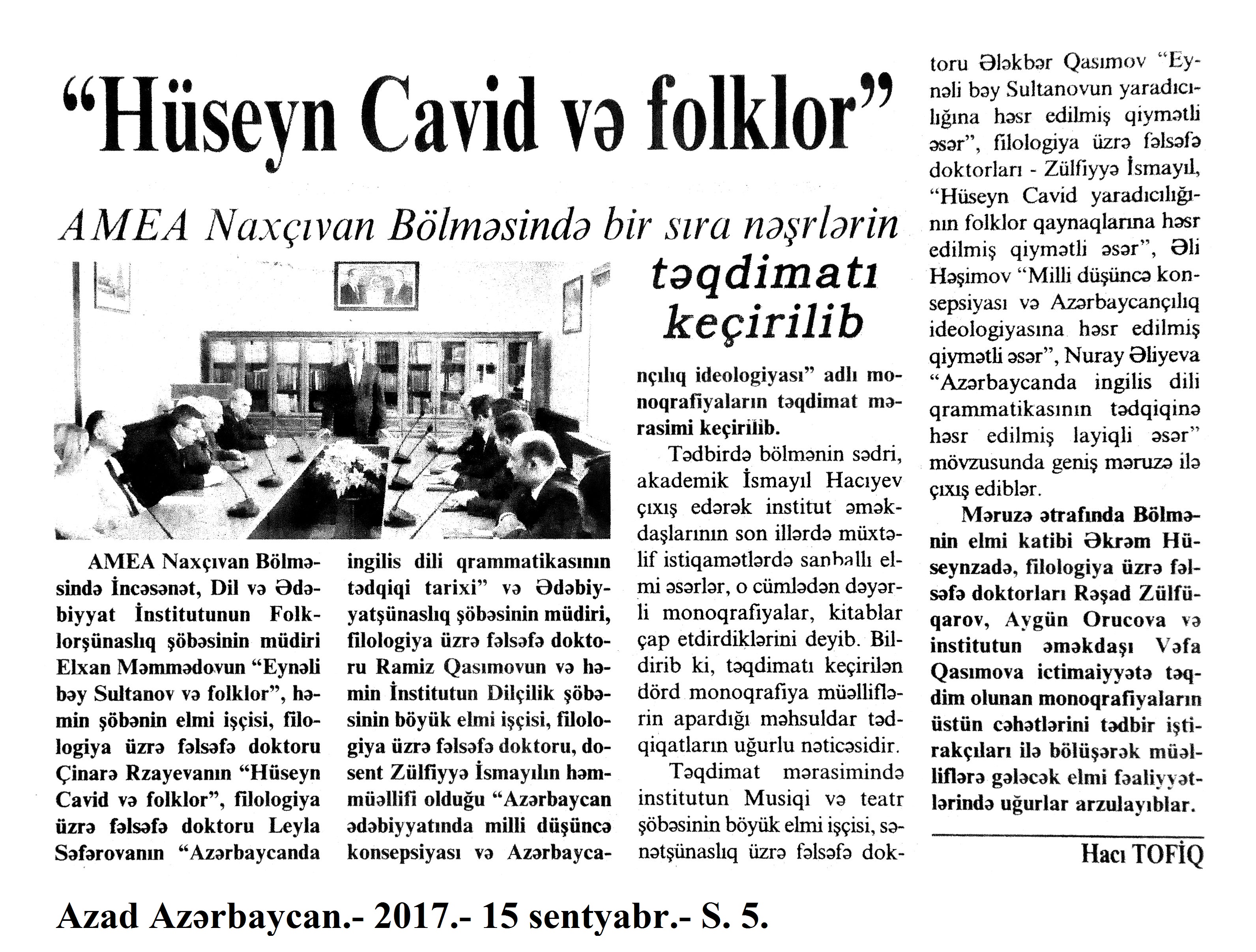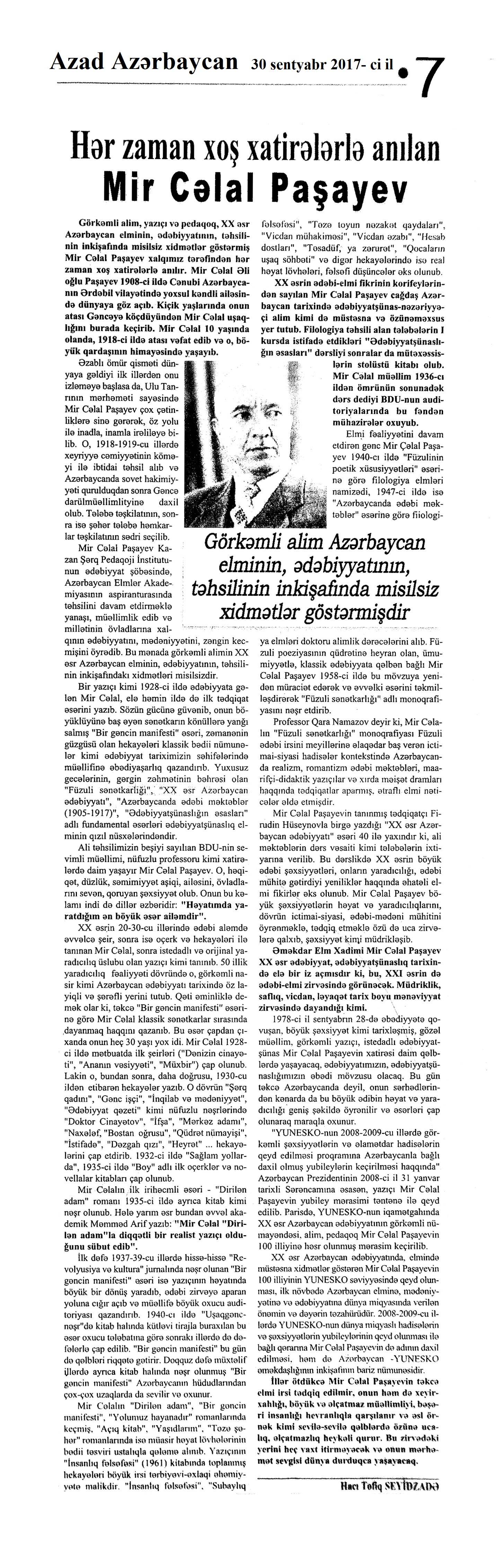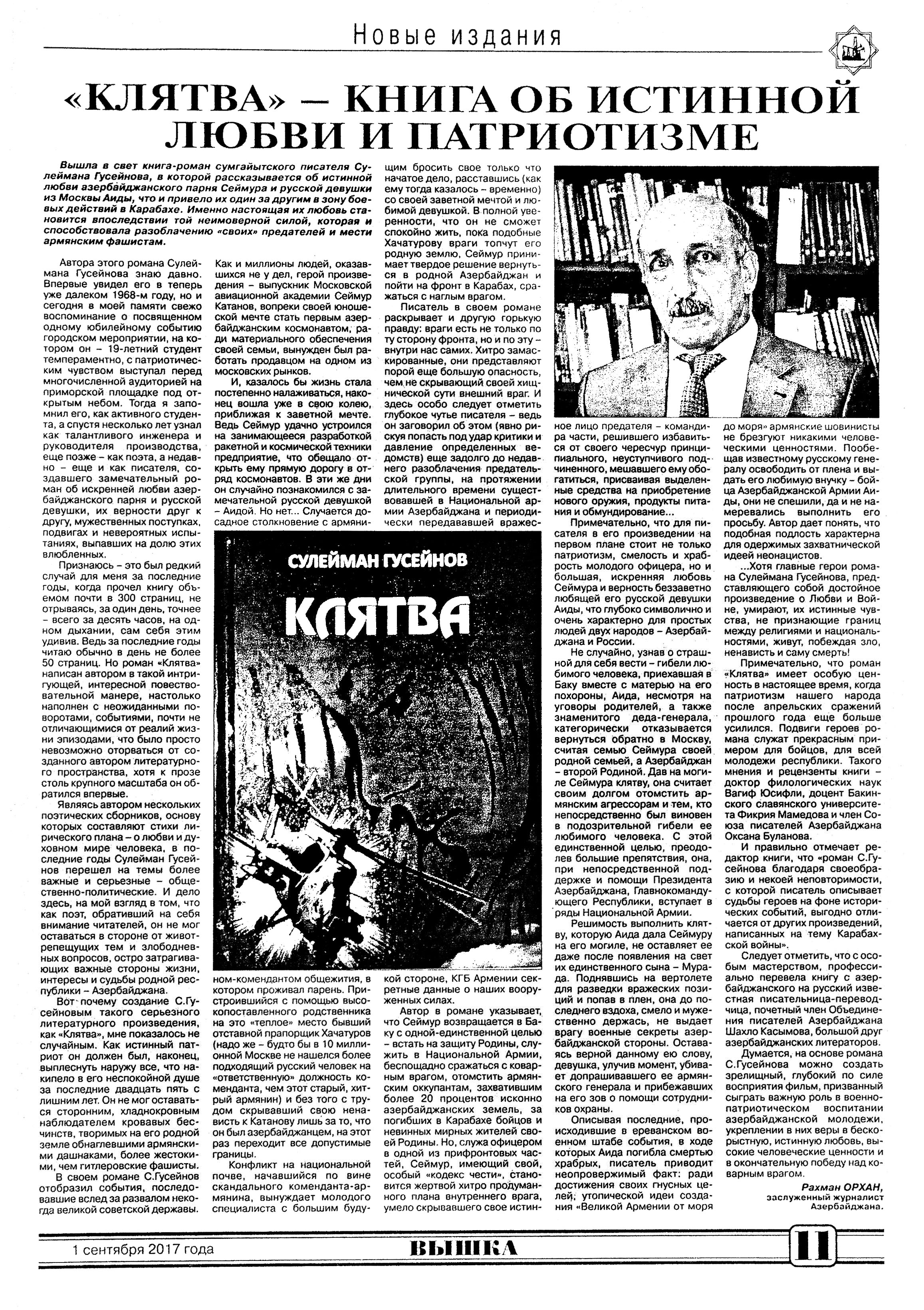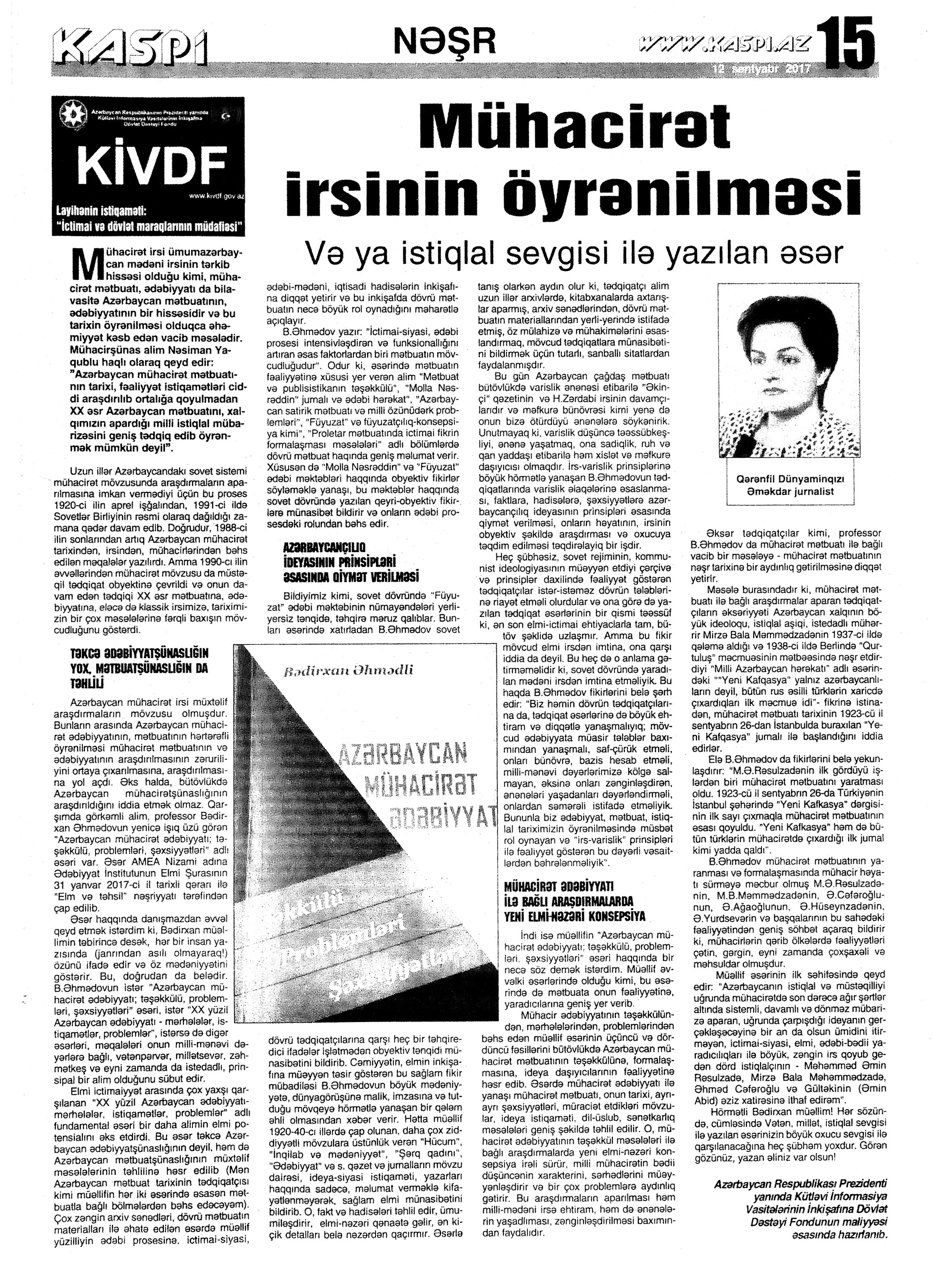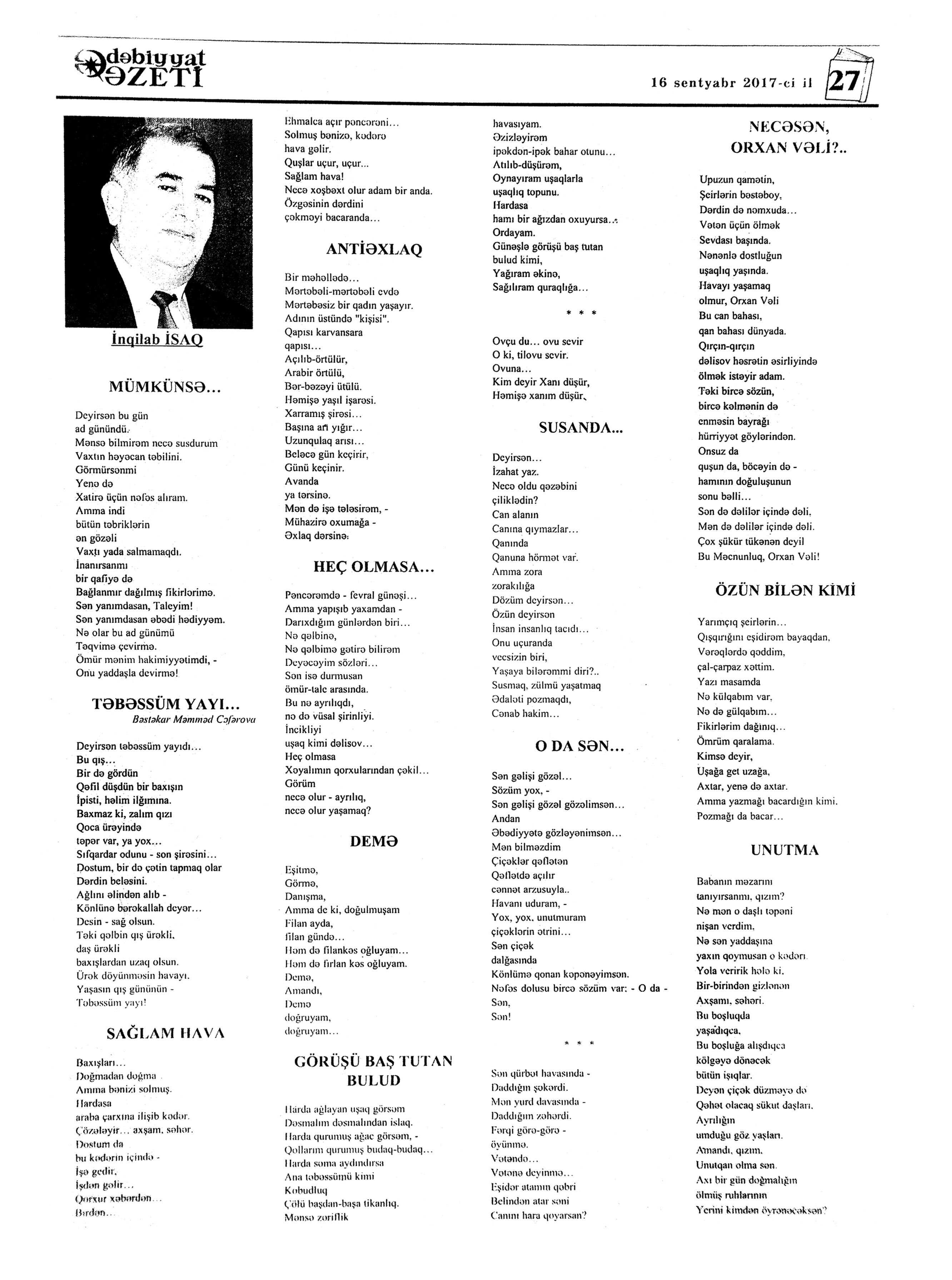 HEKAYƏLƏR 450. Coys, C. Evelin //Ədəbiyyat qəzeti.-2017.- 30 sentyabr.- S.13. 451. Fazilqizi, T. Nənəm //Kaspi.-2017.- 9 sentyabr.- S.22. 452. Mehdi, Q. Su vətənləşəndə //Kaspi.-2017.- 30 sentyabr.- S.22. 453. Məhərrəmov, V. Qəribə adamlar //Kaspi.-2017.- 23-25 sentyabr.- S. 22. 454. Musaoğlu, A. Müəlllim //Ədəbiyyat qəzeti.-2017.-30 sentyabr.- S.4-5. 455. Tahirzadə, Ə. Elçilik //525-ci qəzet.-2017.- 1 sentyabr.- S.23.