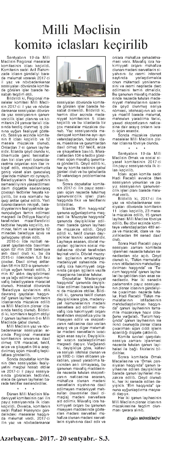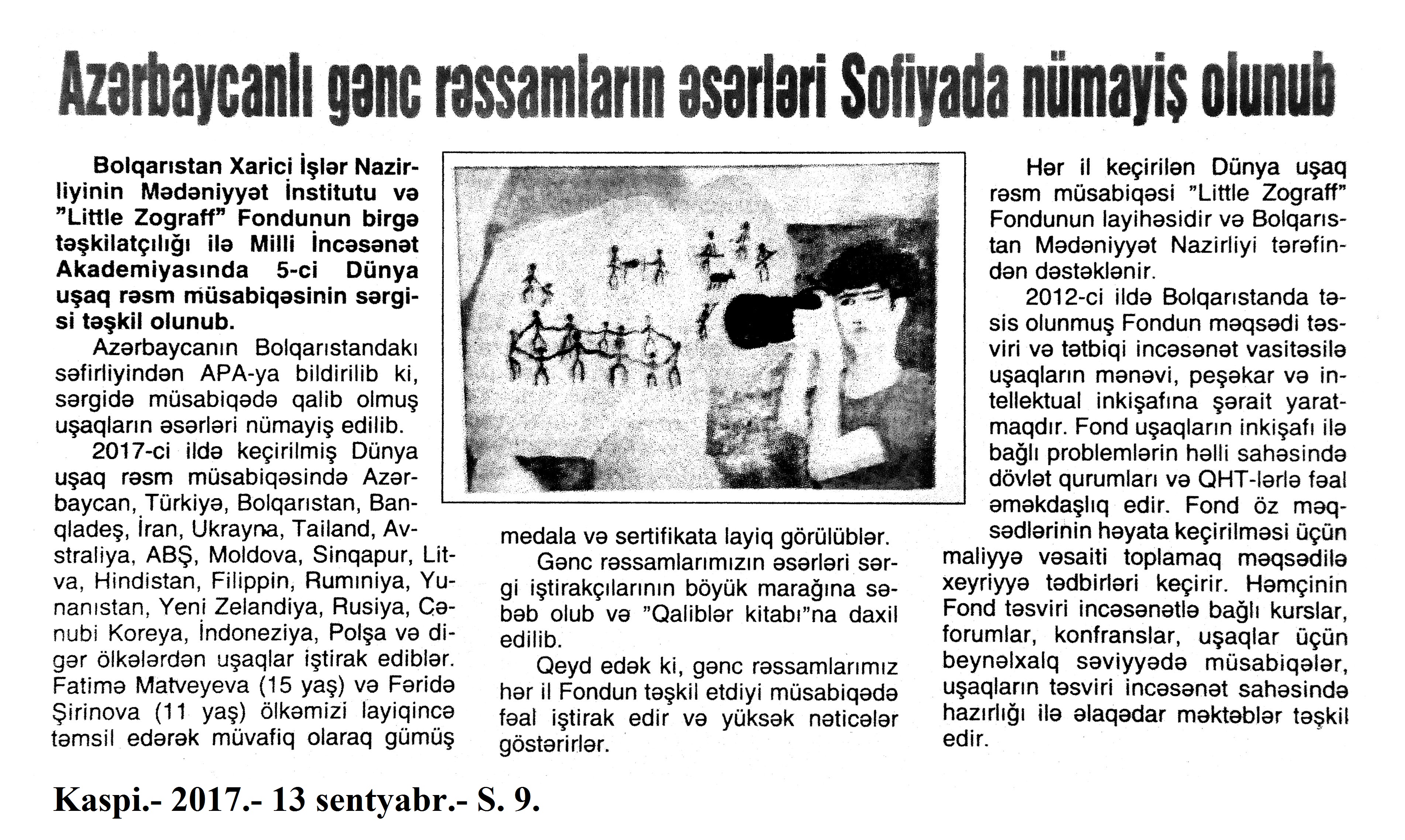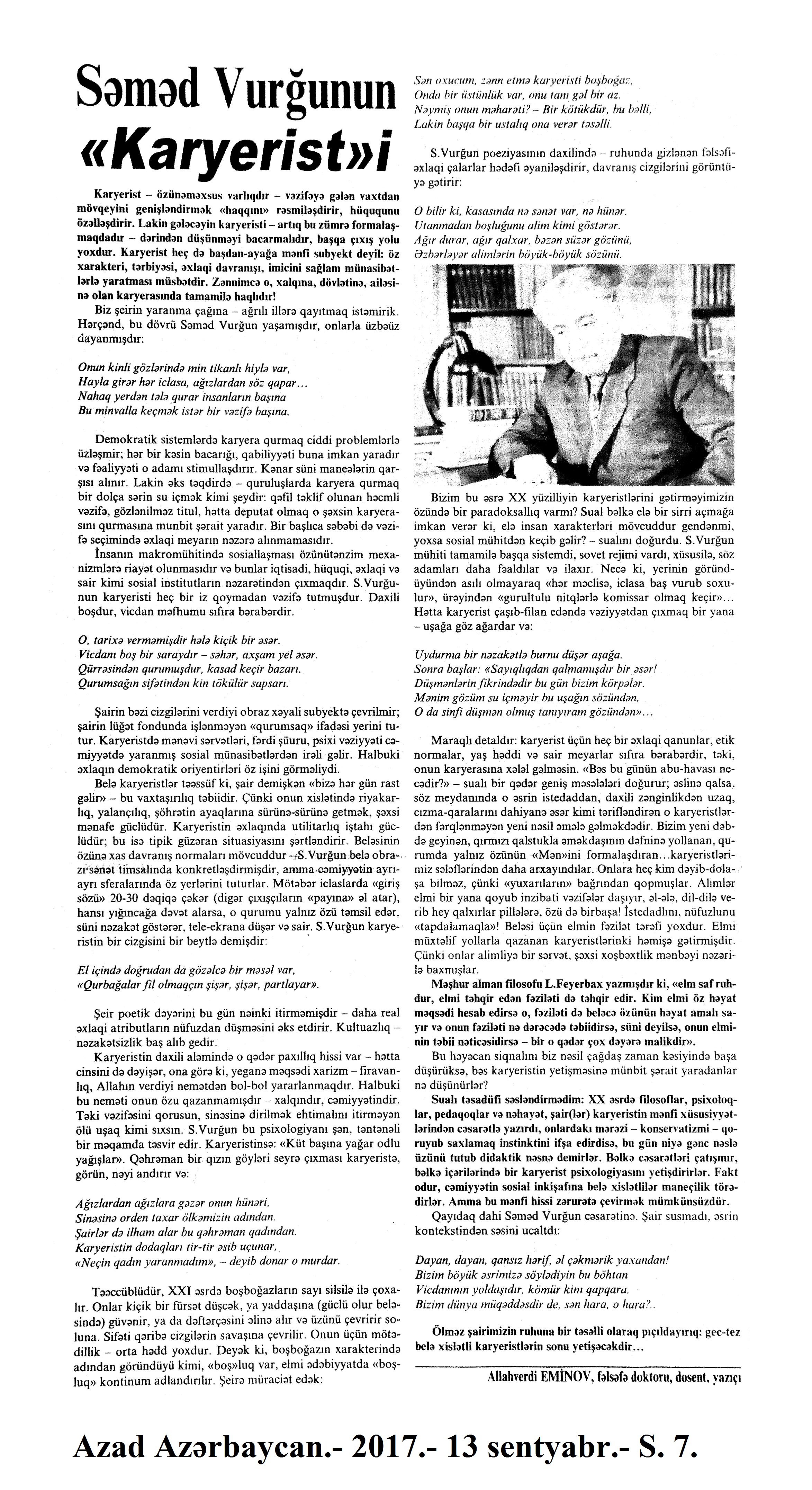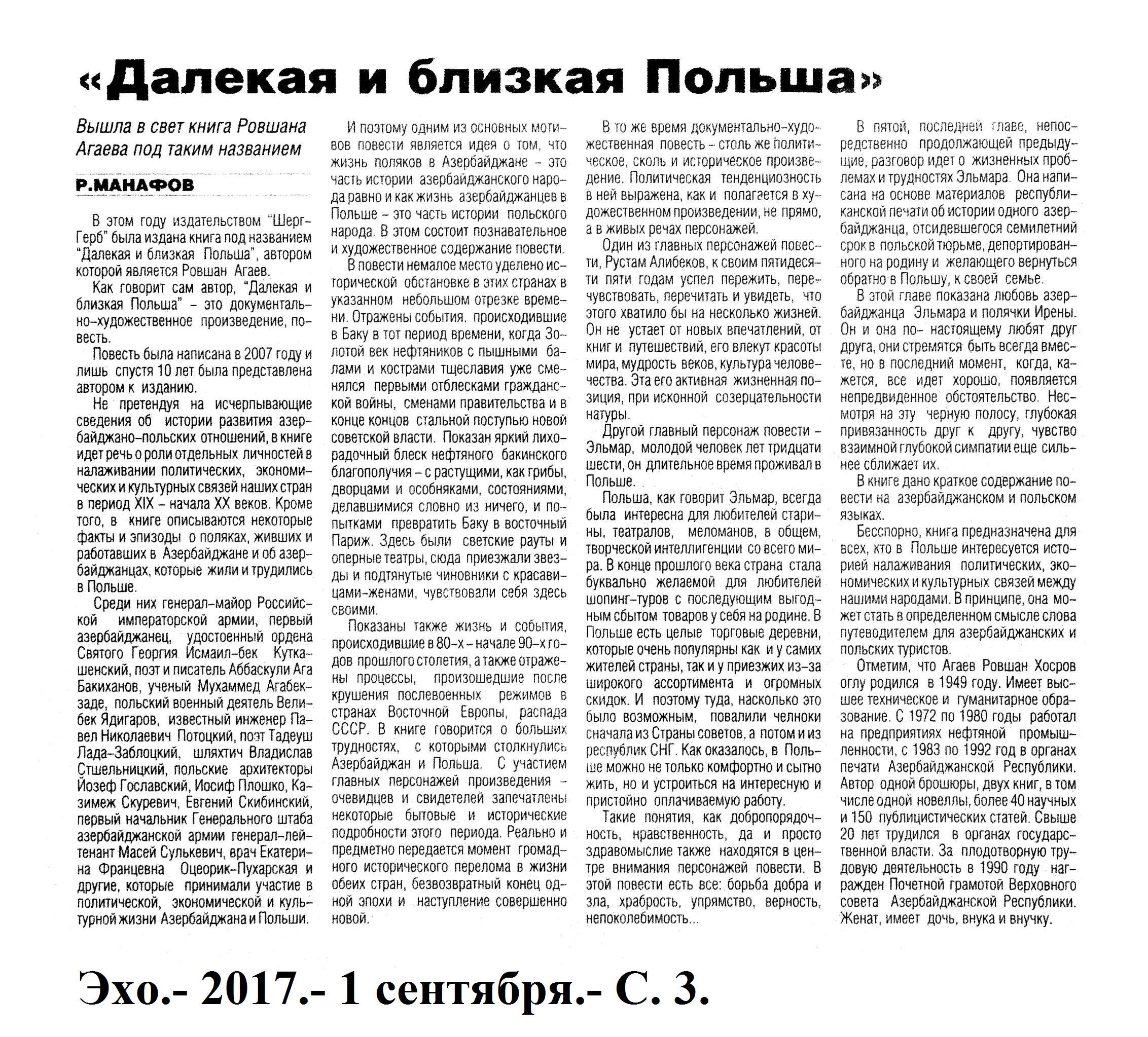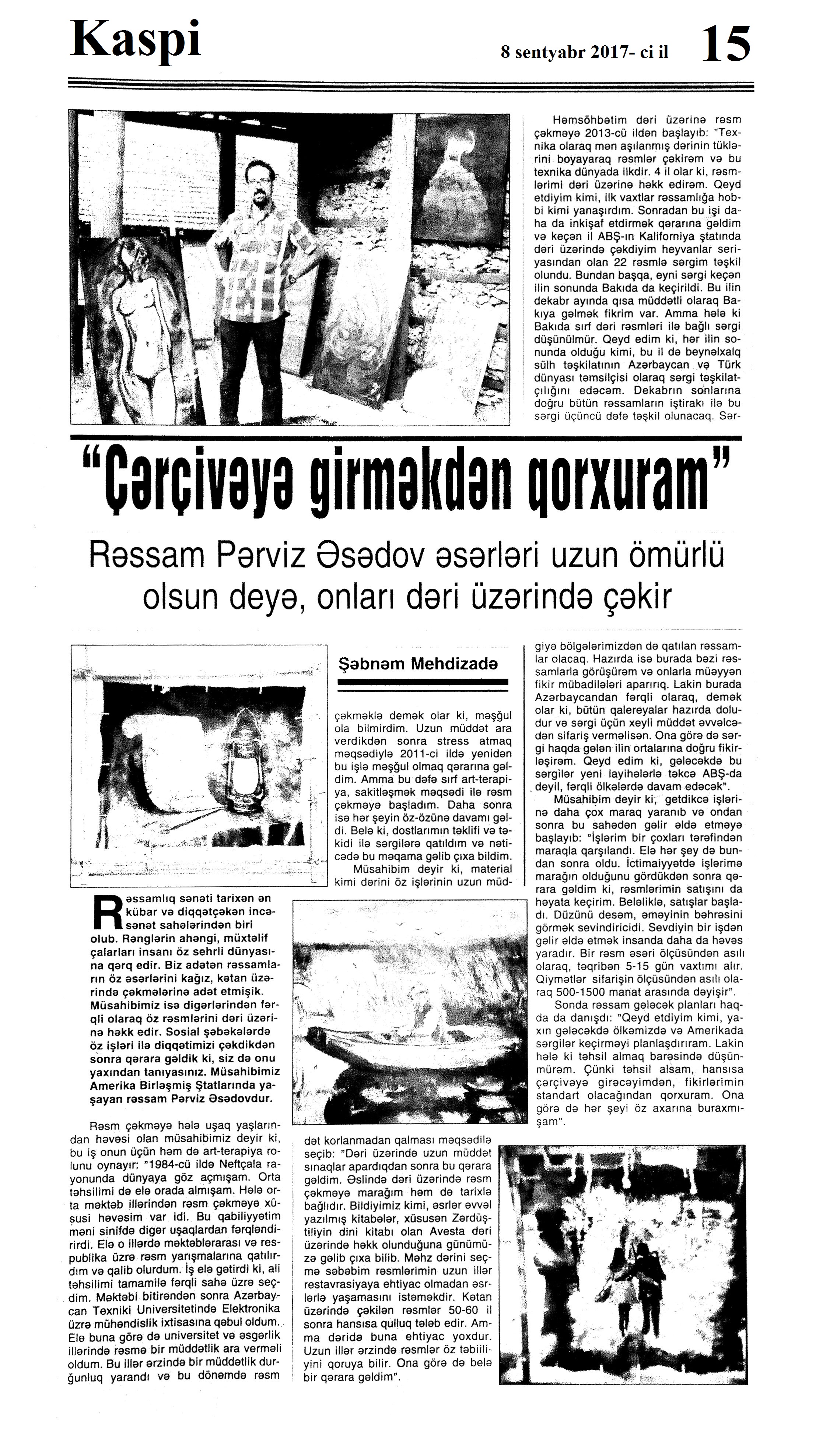 HEKAYƏLƏR 450. Coys, C. Evelin //Ədəbiyyat qəzeti.-2017.- 30 sentyabr.- S.13. 451. Fazilqizi, T. Nənəm //Kaspi.-2017.- 9 sentyabr.- S.22. 452. Mehdi, Q. Su vətənləşəndə //Kaspi.-2017.- 30 sentyabr.- S.22. 453. Məhərrəmov, V. Qəribə adamlar //Kaspi.-2017.- 23-25 sentyabr.- S. 22. 454. Musaoğlu, A. Müəlllim //Ədəbiyyat qəzeti.-2017.-30 sentyabr.- S.4-5. 455. Tahirzadə, Ə. Elçilik //525-ci qəzet.-2017.- 1 sentyabr.- S.23.