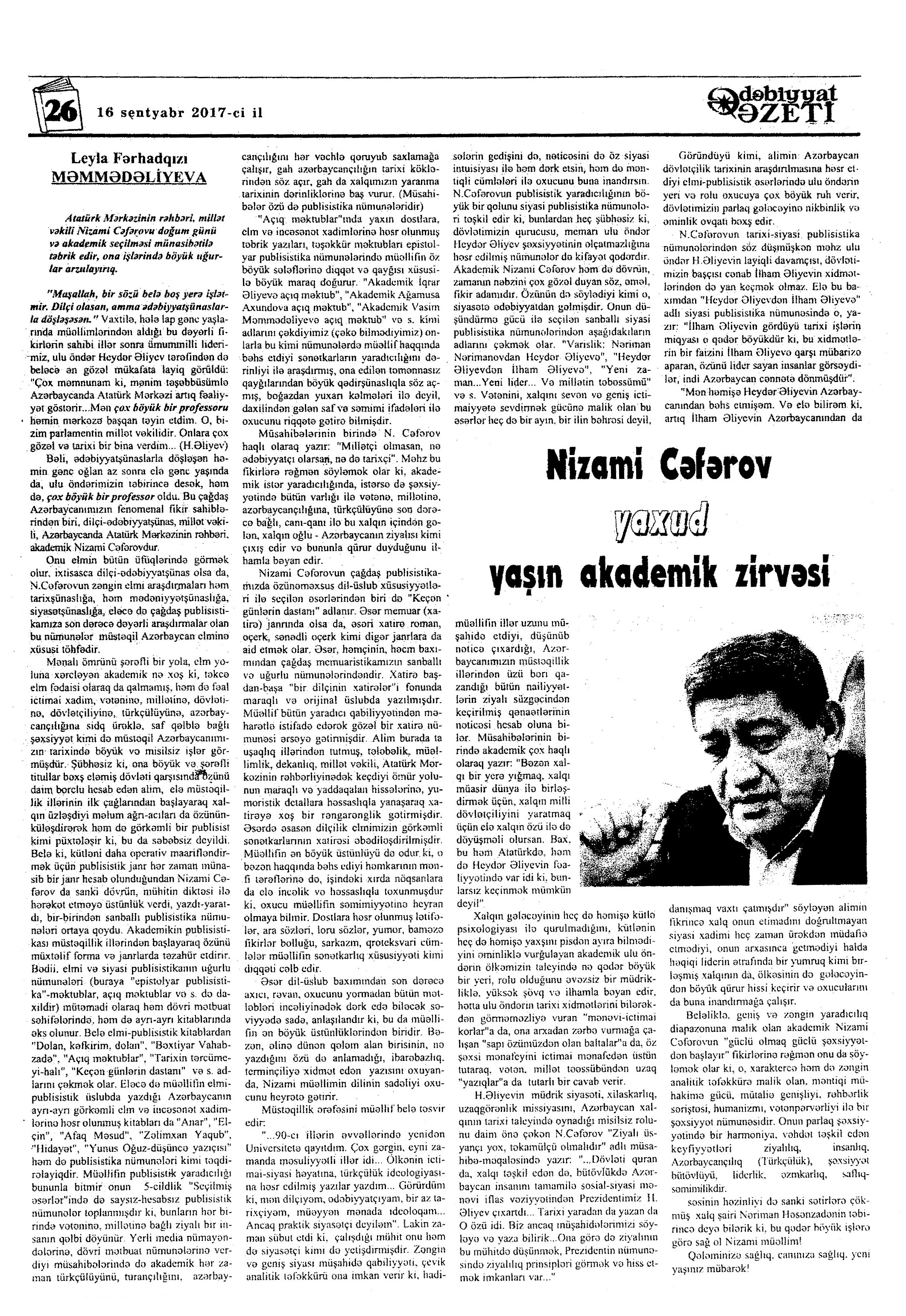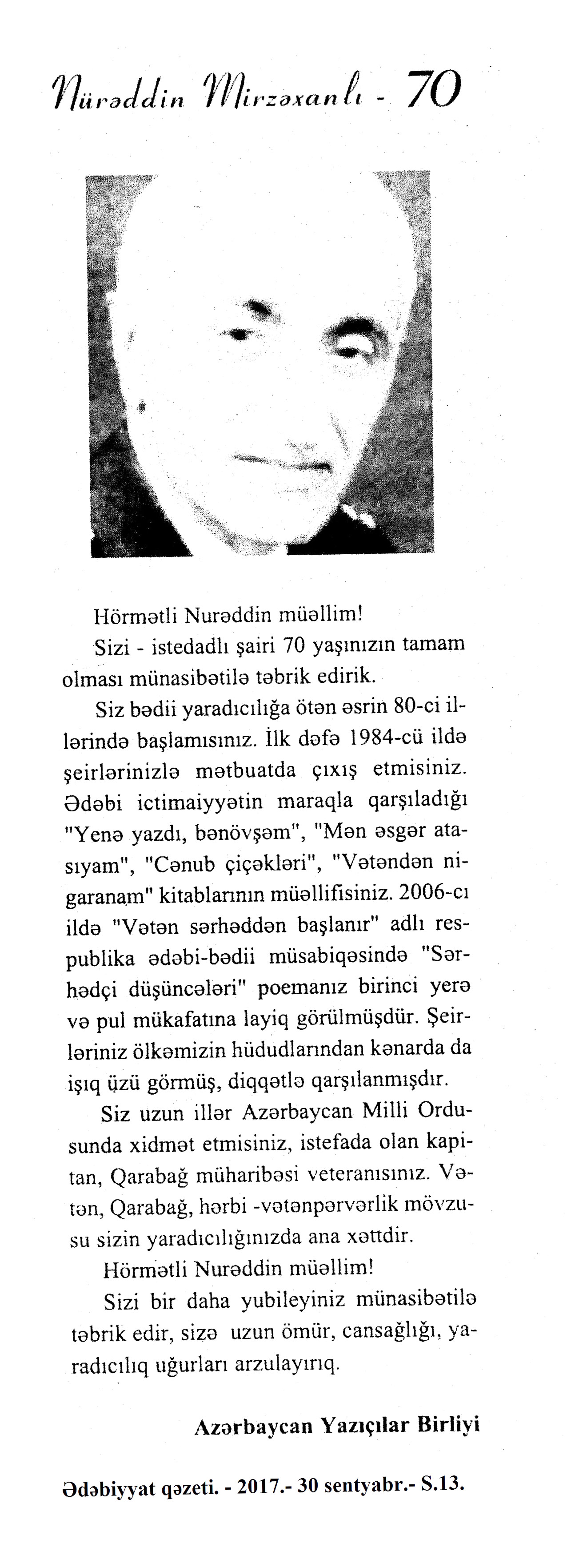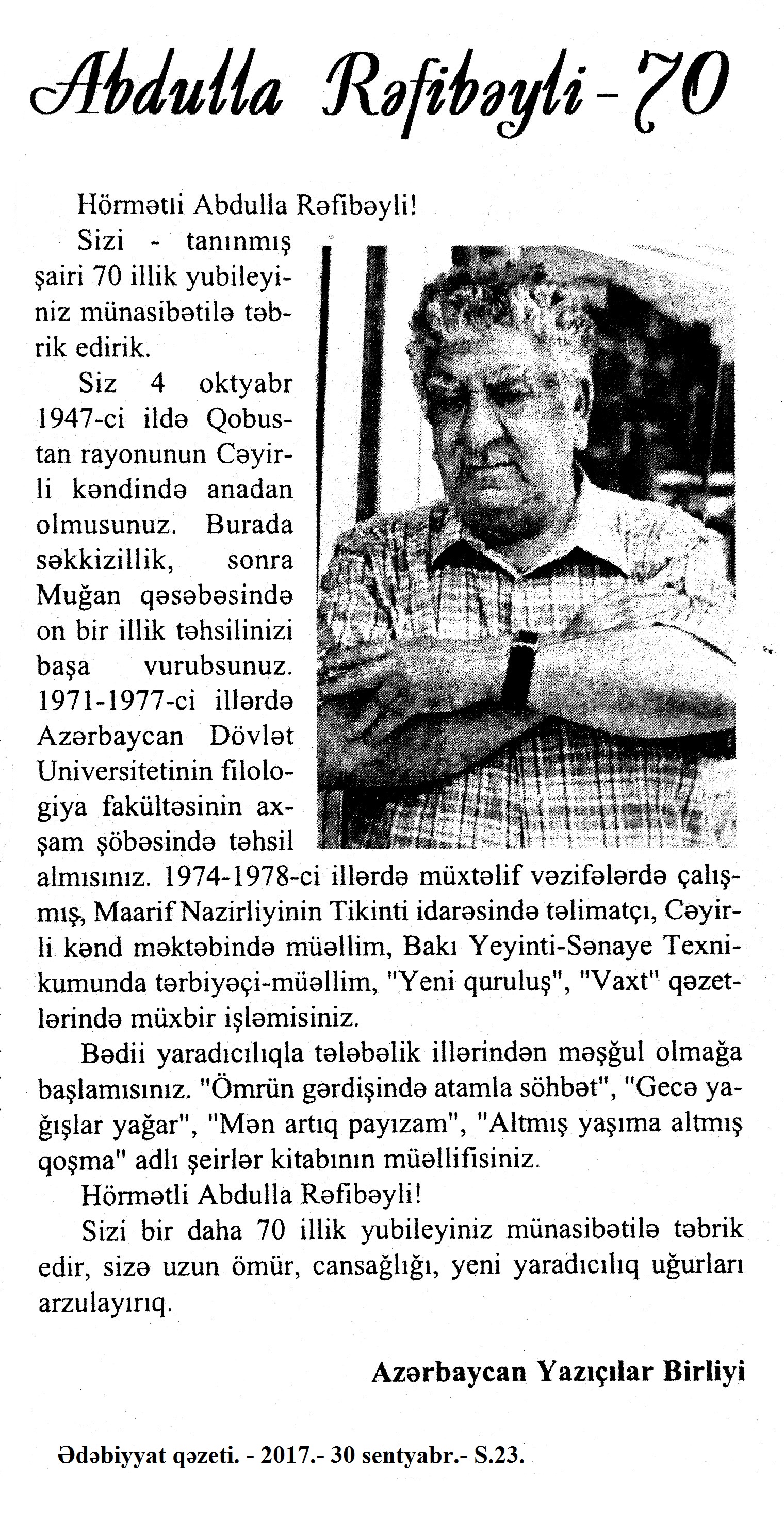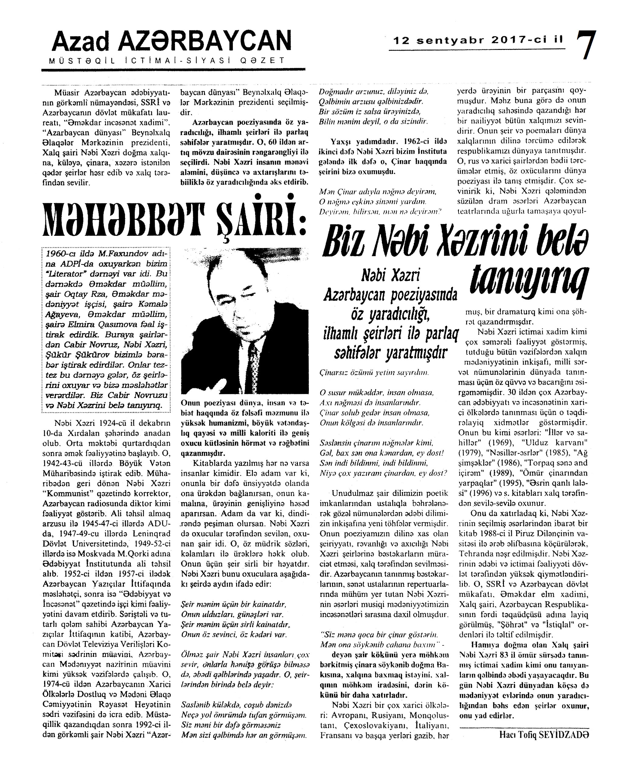 ƏDƏBİYYATŞÜNASLIQ VƏ ƏDƏBİ TƏNQİD 469. Abbaslı, T. Bənzərsiz qəlb və qələm təbiətlisi -: Poetik incəliklərilə tər-təbiət AĞAsı, müdrik “hərif”liklərilə el-elat QAĞAsı – Hüseyn Arif //Mədəniyyət.-2017.-13 sentyabr.- S.13. 470. Abbaslı, T. Əleyk-əssalam, Şəhriyar baba!..: Bu dünyaya xitabəti də, bu dünya barədə həmsöhbəti də DAĞ olmuş zirvəkar baba... //Mədəniyyət.-2017.-22 sentyabr.- S.12. 471. Abbaslı, T. Harada... iş - orada baş: Dövrünün ədəbiyyat, mədəniyyət, ictimaiyyət aləmi azmanlarından Sabit Rəhman //Mədəniyyət.-2017.-27 sentyabr.- S.13. 472. Abbaslı, T. Müəllimsiz-təlimsiz Alim: Dahi sənətkarlar yetirmiş Şuşamızın böyük elm-sənədkarı-Mir Möhsün Nəvvab //Mədəniyyət.-2017.-29 sentyabr.- S.12. 473. Abbaslı, T. 70-in də qutlu, Mustafa!: Ömrü uzunu sadə həyat dünyasını yazı-pozu ilə bəzəmiş, saya ailə-məişət aləmini halal qələm-iynə ilə gözəmiş Çəmənli!.. //Mədəniyyət.-2017.-8 sentyabr.- S.10. 474. Abbaslı, T. Vətən yanğılı, sənət qayğılı qələm əhli: Ömrü uzunu sadə həyat dünyasını yazı-pozu ilə bəzəmiş, saya ailə-məişət aləmini halal qələm-iynə ilə gözəmiş Çəmənli!.. //525-ci qəzet.-2017.- 14 sentyabr.- S.6. 475. Abbasova, M. Güney Azərbaycan folkloru dərindən öyrənilir: [filologiya üzrə fəlsəfə doktoru Mətanət Abbasovanın müsahibəsi] /müsahibəni apardı S.Qaliboğlu //Mədəniyyət.-2017.- 22 sentyabr.- S.11. 476. Abdulla Rəfibəyli – 70: [şairin 70 illiyi münasibətilə AYB-nin təbriki] //Ədəbiyyat qəzeti.-2017.- 30 sentyabr.- S.23. 477. Adışirin, T. Zil qara kirpiklərin; Haqq deyilən sözü axtar; Könlümdə bir ağac var; Bu torpaq gözümdə nurlanan ocaq və s. //Ədəbiyyat qəzeti.-2017.- 16 sentyabr.- S.21. 478. Ağamusa, D. Bitməyən düşüncələr...: Nurəngiz Gün, ad günün mübarək! //525-ci qəzet.-2017.- 21 sentyabr.- S.8. 479. Akimova, E. Balıq gülüşü, böyümə anı yaxud uşaqlığın son yuxusu: [Mübariz Örənin “Balıq gülüşü” hekayəsi haqqında] //Ədəbiyyat qəzeti.-2017. 23 sentyabr.- S.18. 480. Aqşin Babayev: “Nazim Hikmətdən söz açmaq mənim üçün həmişə bəxtiyarlıqdır”: Filologiya elmləri doktoru, professorla müsahibə /müsahibəni apardı Əhməd, Ramil //525-ci qəzet.-2017.- 16 sentyabr.- S.18. 481. Amin, S. Ağac kölgəsində böyüyər: [Həyatla çarpışaraq böyüyən fidanların timsalında yaradıcı insanların yaradıcılıqda uğur qazananadək mübarizə aparmalarının vacibliyi haqqında] //Ədəbiyyat qəzeti.-2017.-23 sentyabr.- S.29. 482. Anar. Kərkükün mənəvi elçisi - Qəzənfər Paşayevin yubileyilə bağlı düşüncələr: Xalq yazıçısı Anar “Səhər-səhər” rubrikasını davam etdirir//525-ci qəzet.-2017.- 1 sentyabr.- S.11. 483. Anar. Ziyalı borcu: “Səhər-səhər” rubrikasında: [türkoloq alim Tofiq Məliklinin 75 illiyi münasibətilə] //525-ci qəzet.-2017.- 9 sentyabr.- S.9. 484. Arxipova, Z. Türküstanda “Şairlər görüşü” xoş təəssüratlarla yadda qaldı: Molla Pənah Vaqif – 300: [“Dilbar Hotun” jurnalının baş redaktoru Zinaida Arxipovanın müsahibəsi] /müsahibəni apardı Sultanova Mehparə //Mədəniyyət.-2017.- 6 sentyabr.- S.11. 485. Aruz, S. Müasir irfan nəzəriyyəsi: İrfan nədir, irfan haqqında müxtəsər qeydlər //Ədəbiyyat qəzeti.-2017.-16 sentyabr.- S.18-19. 486. Aruz, S. “Post irfan”, ya müasir irfan nəzəriyyəsi //Ədəbiyyat qəzeti.-2017.-23 sentyabr.- S.10. 487. Aruz, S. “Post irfan”, ya müasir irfan nəzəriyyəsi: Üçüncü hissə //Ədəbiyyat qəzeti.-2017.-30 sentyabr.- S.8. 488. Asimqızı, A. “Bəxtiyar Vahabzadə ilə müsahibəyə gedəndə 3 gün kitabxanadan çıxmadım” //Kaspi.-2017.- 8 sentyabr.- S.12. 489. Aslan, A. “Sükutdan sitat” Elçin Şıxlı nəşr olunan kitabından danışdı //Şərq.-2017.- 28 sentyabr.- S.13. 490. Aşırlı, A. Bəy qızı: [Mirvarid Dilbazinin yaradıcılıq dünyası haqqında] //525-ci qəzet.-2017.- 1 sentyabr.- S.10. 491. Atababa İsmayıloğlu – 70: [yazıçı-publisistin 70 illiyi münasibətilə AYB-nin təbriki] //Ədəbiyyat qəzeti.-2017.- 23 sentyabr.- S.15. 492. Babayeva, A. Tarix və ədəbiyyat aynasında qadın obrazları: Mustafa Çəmənlinin “Ölüm mələyi” romanına bir baxış //525-ci qəzet.-2017.- 28 sentyabr.- S.6. 493. Babayeva, A. Tarix və ədəbiyyat aynasında qadın obrazları: Mustafa Çəmənlinin “Ölüm mələyi” romanına bir baxış //525-ci qəzet.-2017.- 29 sentyabr.- S.4. 494. Bayramov, Q. Nazim Hikmət, Ceviz ağacı və Hidayətin essesi...: [müəllifin Hidayət Orucovun Nazim Hikmətin “Ceviz ağacı” şeirinə yazdığı essesi haqqında təəssüratları] //Ədəbiyyat qəzeti.-2017.-16 sentyabr.- S.23-24. 495. Bayramova, G. Bəşər varlığının təkmilləşməsinə xidmət edən əsər: [ professor İdris Abbasov Mirzə Kazımbəyin “Türk-tatar dilinin ümumi qrammatikası” adlı kitabı haqqında] //Kaspi.-2017.- 23-25 sentyabr.- S. 14. 496. Bayramov, Q. Xəlil Rza Ulutürk: O, bugündür, o, gələcəkdir: [Xalq şairinin “Yurdum, sənin sağlığına” şeiri haqqında] //Ədəbiyyat qəzeti.-2017.- 30 sentyabr.- S.6-7. 497. Behrudi, R. Dünyada ən gözəl başdaşı sözdür: [yazıçı ilə müsahibə] /musahibəni apardı: Nigar İsfəndiyar //Kaspi.-2017.- 9 sentyabr.- S.12-13. 498. Bərdəli, B. Nurəngiz Günün “Ağ qanadlar”ı : [şairənin eyniadlı poeması haqqında] //Ədəbiyyat qəzeti.-2017.- 23 sentyabr.- S.11. 499. Bəşirli, Ə. Tanrının ömür payı :[yazıçı Böyükxan Bağırlı haqqında] //Ədalət.-2017.- 30 sentyabr.- S.12. 500. Cahangirova, N. Gündönümü: [Kərim Özcanın eyniadlı romanı haqqında] //Ədəbiyyat qəzeti.-2017.-16 sentyabr.- S.25. 501. Cavanşir, C. Klassiklərlə müqayisə olunan yazıçılarımız: Müb