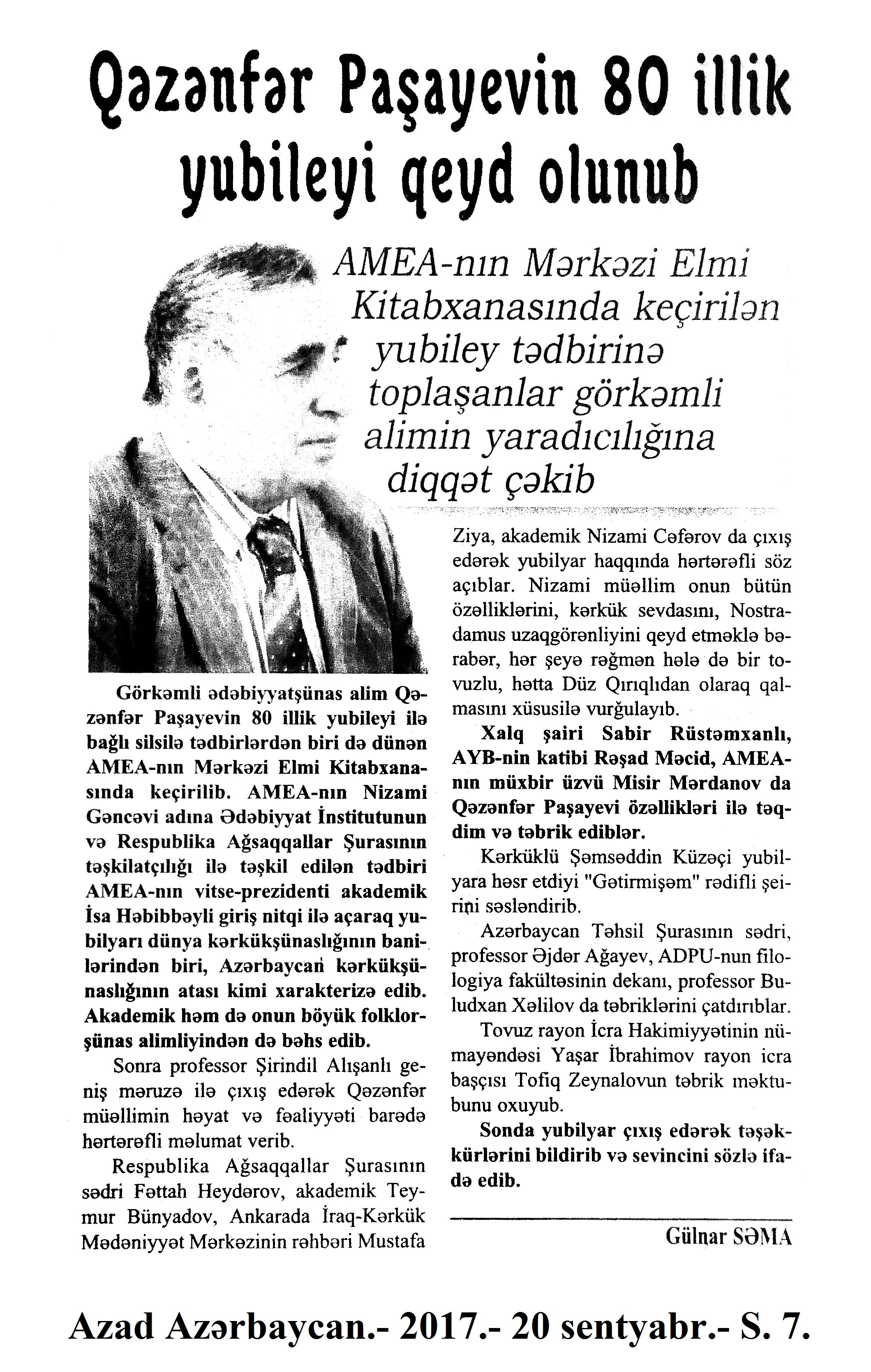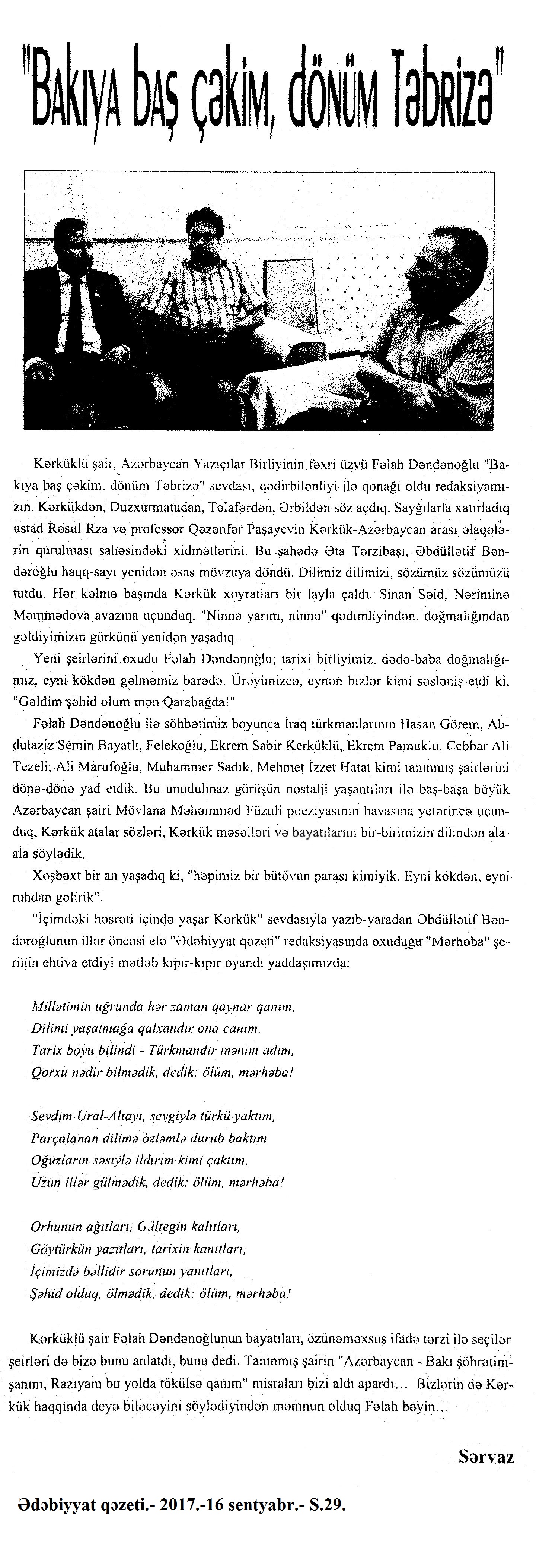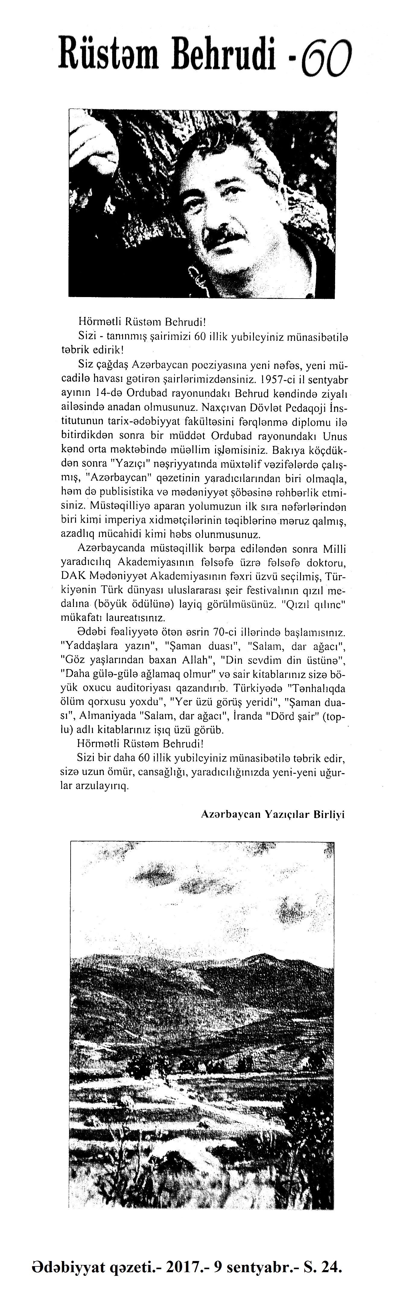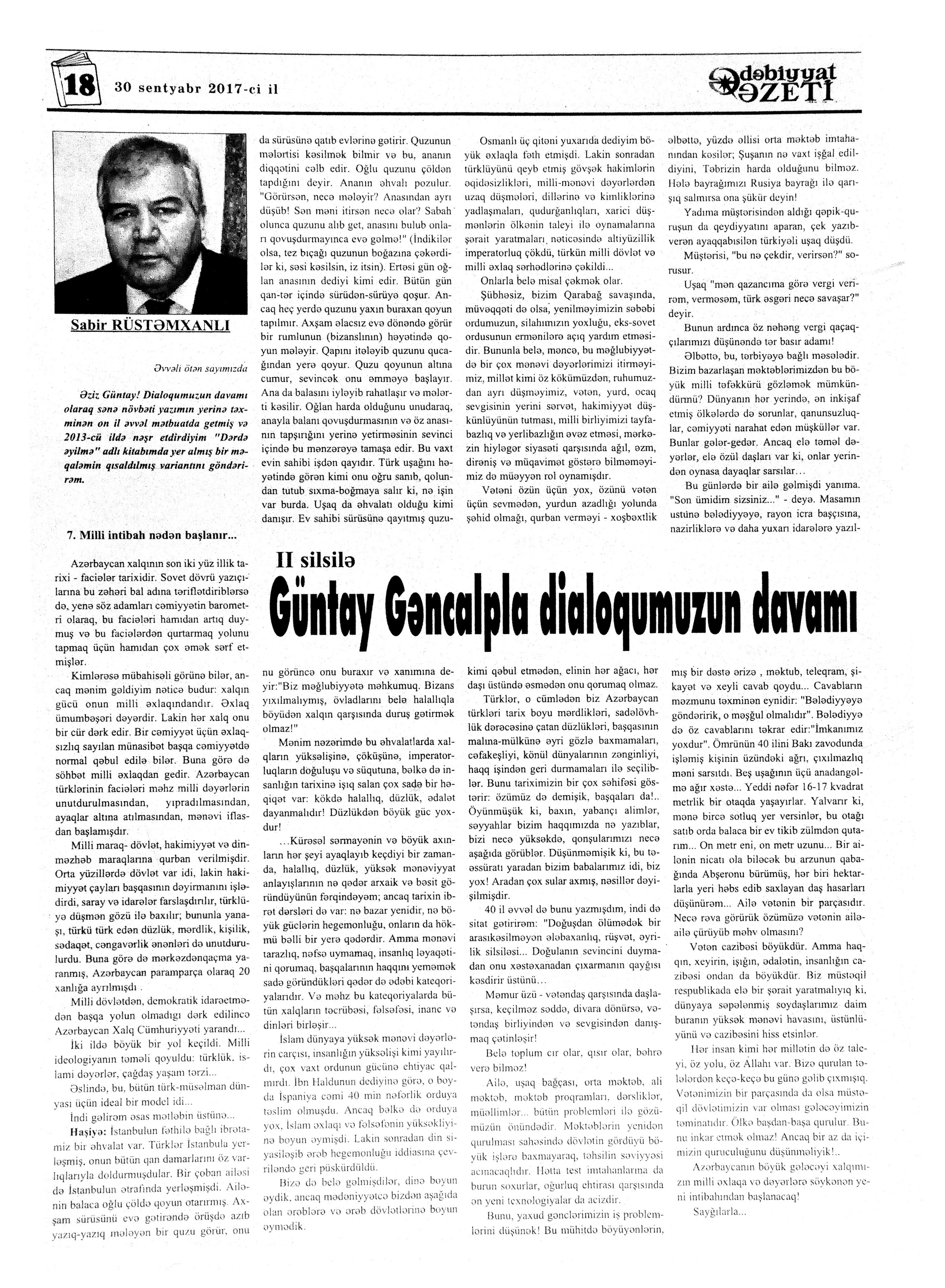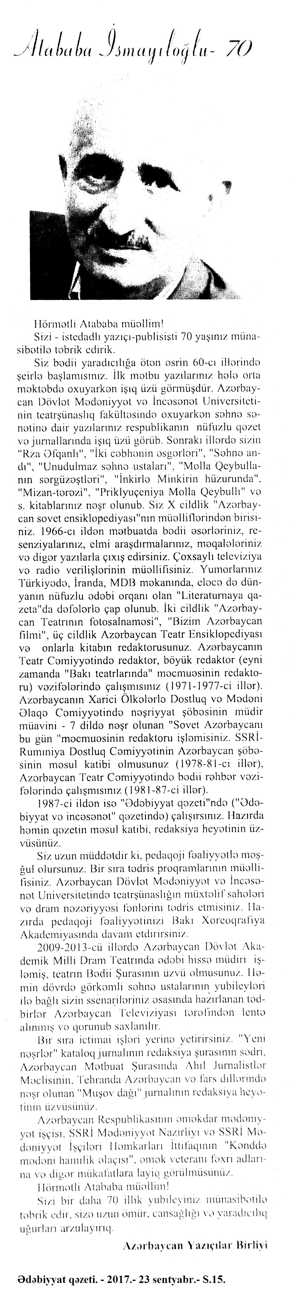 ƏDƏBİYYATŞÜNASLIQ VƏ ƏDƏBİ TƏNQİD 469. Abbaslı, T. Bənzərsiz qəlb və qələm təbiətlisi -: Poetik incəliklərilə tər-təbiət AĞAsı, müdrik “hərif”liklərilə el-elat QAĞAsı – Hüseyn Arif //Mədəniyyət.-2017.-13 sentyabr.- S.13. 470. Abbaslı, T. Əleyk-əssalam, Şəhriyar baba!..: Bu dünyaya xitabəti də, bu dünya barədə həmsöhbəti də DAĞ olmuş zirvəkar baba... //Mədəniyyət.-2017.-22 sentyabr.- S.12. 471. Abbaslı, T. Harada... iş - orada baş: Dövrünün ədəbiyyat, mədəniyyət, ictimaiyyət aləmi azmanlarından Sabit Rəhman //Mədəniyyət.-2017.-27 sentyabr.- S.13. 472. Abbaslı, T. Müəllimsiz-təlimsiz Alim: Dahi sənətkarlar yetirmiş Şuşamızın böyük elm-sənədkarı-Mir Möhsün Nəvvab //Mədəniyyət.-2017.-29 sentyabr.- S.12. 473. Abbaslı, T. 70-in də qutlu, Mustafa!: Ömrü uzunu sadə həyat dünyasını yazı-pozu ilə bəzəmiş, saya ailə-məişət aləmini halal qələm-iynə ilə gözəmiş Çəmənli!.. //Mədəniyyət.-2017.-8 sentyabr.- S.10. 474. Abbaslı, T. Vətən yanğılı, sənət qayğılı qələm əhli: Ömrü uzunu sadə həyat dünyasını yazı-pozu ilə bəzəmiş, saya ailə-məişət aləmini halal qələm-iynə ilə gözəmiş Çəmənli!.. //525-ci qəzet.-2017.- 14 sentyabr.- S.6. 475. Abbasova, M. Güney Azərbaycan folkloru dərindən öyrənilir: [filologiya üzrə fəlsəfə doktoru Mətanət Abbasovanın müsahibəsi] /müsahibəni apardı S.Qaliboğlu //Mədəniyyət.-2017.- 22 sentyabr.- S.11. 476. Abdulla Rəfibəyli – 70: [şairin 70 illiyi münasibətilə AYB-nin təbriki] //Ədəbiyyat qəzeti.-2017.- 30 sentyabr.- S.23. 477. Adışirin, T. Zil qara kirpiklərin; Haqq deyilən sözü axtar; Könlümdə bir ağac var; Bu torpaq gözümdə nurlanan ocaq və s. //Ədəbiyyat qəzeti.-2017.- 16 sentyabr.- S.21. 478. Ağamusa, D. Bitməyən düşüncələr...: Nurəngiz Gün, ad günün mübarək! //525-ci qəzet.-2017.- 21 sentyabr.- S.8. 479. Akimova, E. Balıq gülüşü, böyümə anı yaxud uşaqlığın son yuxusu: [Mübariz Örənin “Balıq gülüşü” hekayəsi haqqında] //Ədəbiyyat qəzeti.-2017. 23 sentyabr.- S.18. 480. Aqşin Babayev: “Nazim Hikmətdən söz açmaq mənim üçün həmişə bəxtiyarlıqdır”: Filologiya elmləri doktoru, professorla müsahibə /müsahibəni apardı Əhməd, Ramil //525-ci qəzet.-2017.- 16 sentyabr.- S.18. 481. Amin, S. Ağac kölgəsində böyüyər: [Həyatla çarpışaraq böyüyən fidanların timsalında yaradıcı insanların yaradıcılıqda uğur qazananadək mübarizə aparmalarının vacibliyi haqqında] //Ədəbiyyat qəzeti.-2017.-23 sentyabr.- S.29. 482. Anar. Kərkükün mənəvi elçisi - Qəzənfər Paşayevin yubileyilə bağlı düşüncələr: Xalq yazıçısı Anar “Səhər-səhər” rubrikasını davam etdirir//525-ci qəzet.-2017.- 1 sentyabr.- S.11. 483. Anar. Ziyalı borcu: “Səhər-səhər” rubrikasında: [türkoloq alim Tofiq Məliklinin 75 illiyi münasibətilə] //525-ci qəzet.-2017.- 9 sentyabr.- S.9. 484. Arxipova, Z. Türküstanda “Şairlər görüşü” xoş təəssüratlarla yadda qaldı: Molla Pənah Vaqif – 300: [“Dilbar Hotun” jurnalının baş redaktoru Zinaida Arxipovanın müsahibəsi] /müsahibəni apardı Sultanova Mehparə //Mədəniyyət.-2017.- 6 sentyabr.- S.11. 485. Aruz, S. Müasir irfan nəzəriyyəsi: İrfan nədir, irfan haqqında müxtəsər qeydlər //Ədəbiyyat qəzeti.-2017.-16 sentyabr.- S.18-19. 486. Aruz, S. “Post irfan”, ya müasir irfan nəzəriyyəsi //Ədəbiyyat qəzeti.-2017.-23 sentyabr.- S.10. 487. Aruz, S. “Post irfan”, ya müasir irfan nəzəriyyəsi: Üçüncü hissə //Ədəbiyyat qəzeti.-2017.-30 sentyabr.- S.8. 488. Asimqızı, A. “Bəxtiyar Vahabzadə ilə müsahibəyə gedəndə 3 gün kitabxanadan çıxmadım” //Kaspi.-2017.- 8 sentyabr.- S.12. 489. Aslan, A. “Sükutdan sitat” Elçin Şıxlı nəşr olunan kitabından danışdı //Şərq.-2017.- 28 sentyabr.- S.13. 490. Aşırlı, A. Bəy qızı: [Mirvarid Dilbazinin yaradıcılıq dünyası haqqında] //525-ci qəzet.-2017.- 1 sentyabr.- S.10. 491. Atababa İsmayıloğlu – 70: [yazıçı-publisistin 70 illiyi münasibətilə AYB-nin təbriki] //Ədəbiyyat qəzeti.-2017.- 23 sentyabr.- S.15. 492. Babayeva, A. Tarix və ədəbiyyat aynasında qadın obrazları: Mustafa Çəmənlinin “Ölüm mələyi” romanına bir baxış //525-ci qəzet.-2017.- 28 sentyabr.- S.6. 493. Babayeva, A. Tarix və ədəbiyyat aynasında qadın obrazları: Mustafa Çəmənlinin “Ölüm mələyi” romanına bir baxış //525-ci qəzet.-2017.- 29 sentyabr.- S.4. 494. Bayramov, Q. Nazim Hikmət, Ceviz ağacı və Hidayətin essesi...: [müəllifin Hidayət Orucovun Nazim Hikmətin “Ceviz ağacı” şeirinə yazdığı essesi haqqında təəssüratları] //Ədəbiyyat qəzeti.-2017.-16 sentyabr.- S.23-24. 495. Bayramova, G. Bəşər varlığının təkmilləşməsinə xidmət edən əsər: [ professor İdris Abbasov Mirzə Kazımbəyin “Türk-tatar dilinin ümumi qrammatikası” adlı kitabı haqqında] //Kaspi.-2017.- 23-25 sentyabr.- S. 14. 496. Bayramov, Q. Xəlil Rza Ulutürk: O, bugündür, o, gələcəkdir: [Xalq şairinin “Yurdum, sənin sağlığına” şeiri haqqında] //Ədəbiyyat qəzeti.-2017.- 30 sentyabr.- S.6-7. 497. Behrudi, R. Dünyada ən gözəl başdaşı sözdür: [yazıçı ilə müsahibə] /musahibəni apardı: Nigar İsfəndiyar //Kaspi.-2017.- 9 sentyabr.- S.12-13. 498. Bərdəli, B. Nurəngiz Günün “Ağ qanadlar”ı : [şairənin eyniadlı poeması haqqında] //Ədəbiyyat qəzeti.-2017.- 23 sentyabr.- S.11. 499. Bəşirli, Ə. Tanrının ömür payı :[yazıçı Böyükxan Bağırlı haqqında] //Ədalət.-2017.- 30 sentyabr.- S.12. 500. Cahangirova, N. Gündönümü: [Kərim Özcanın eyniadlı romanı haqqında] //Ədəbiyyat qəzeti.-2017.-16 sentyabr.- S.25. 501. Cavanşir, C. Klassiklərlə müqayisə olunan yazıçılarımız: Müb