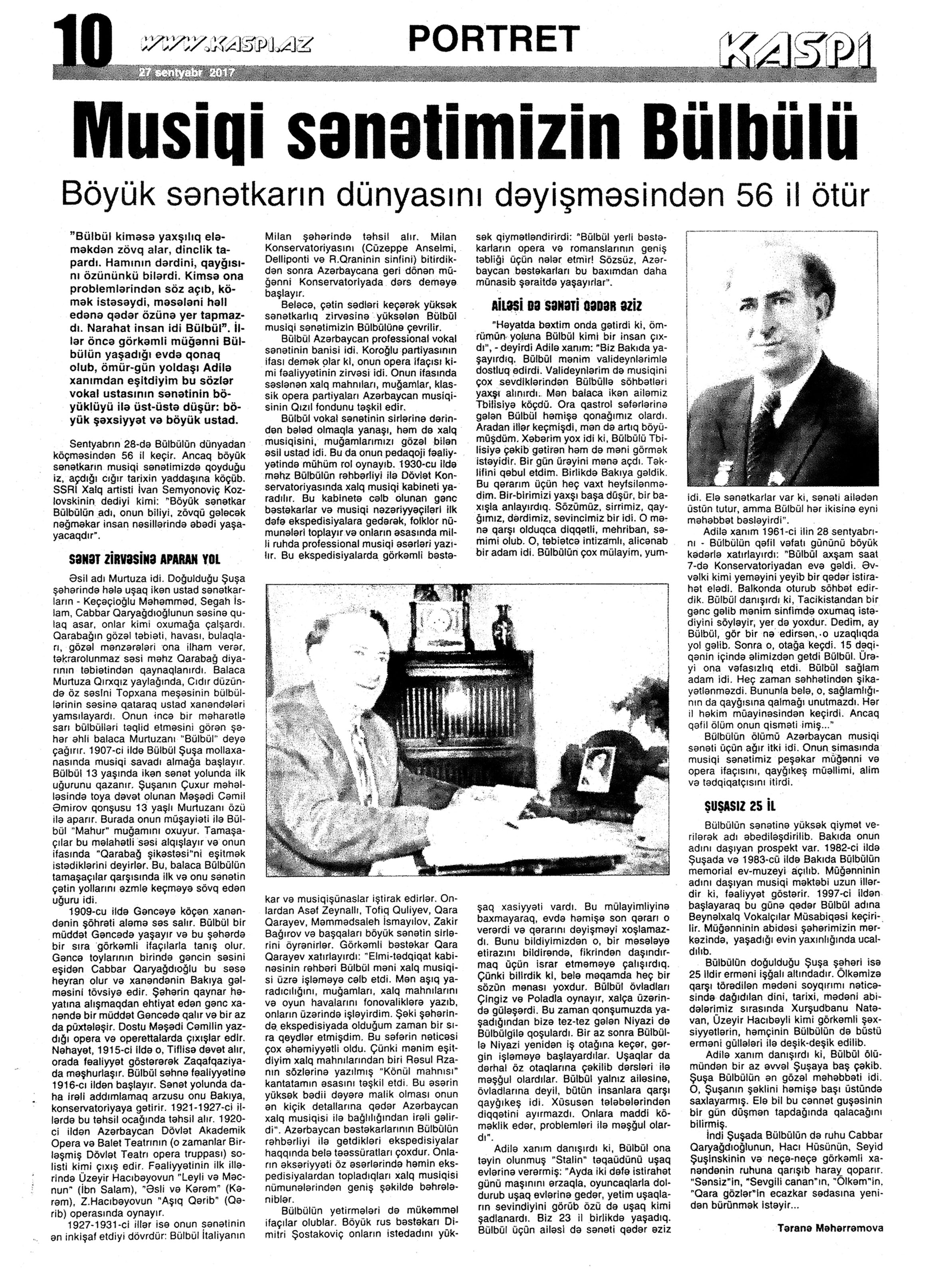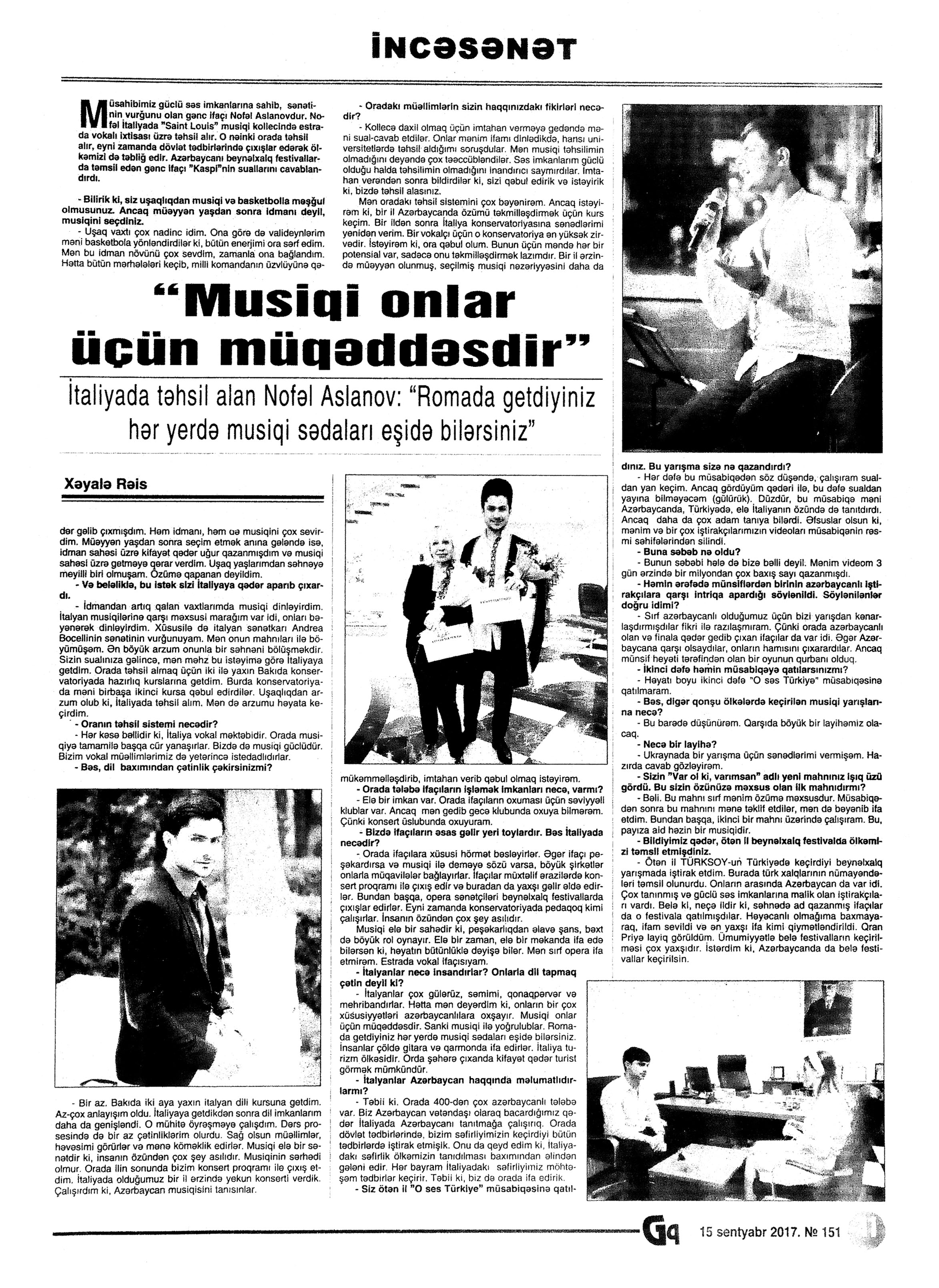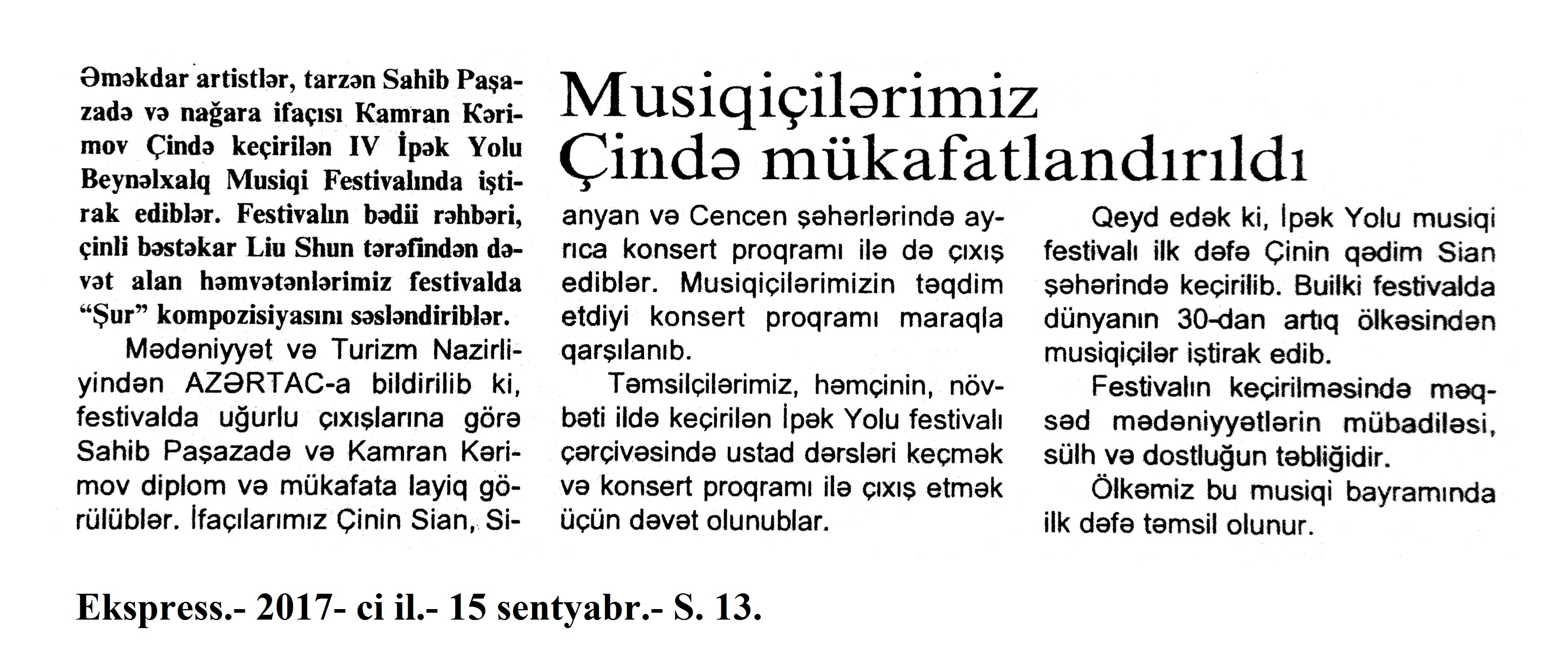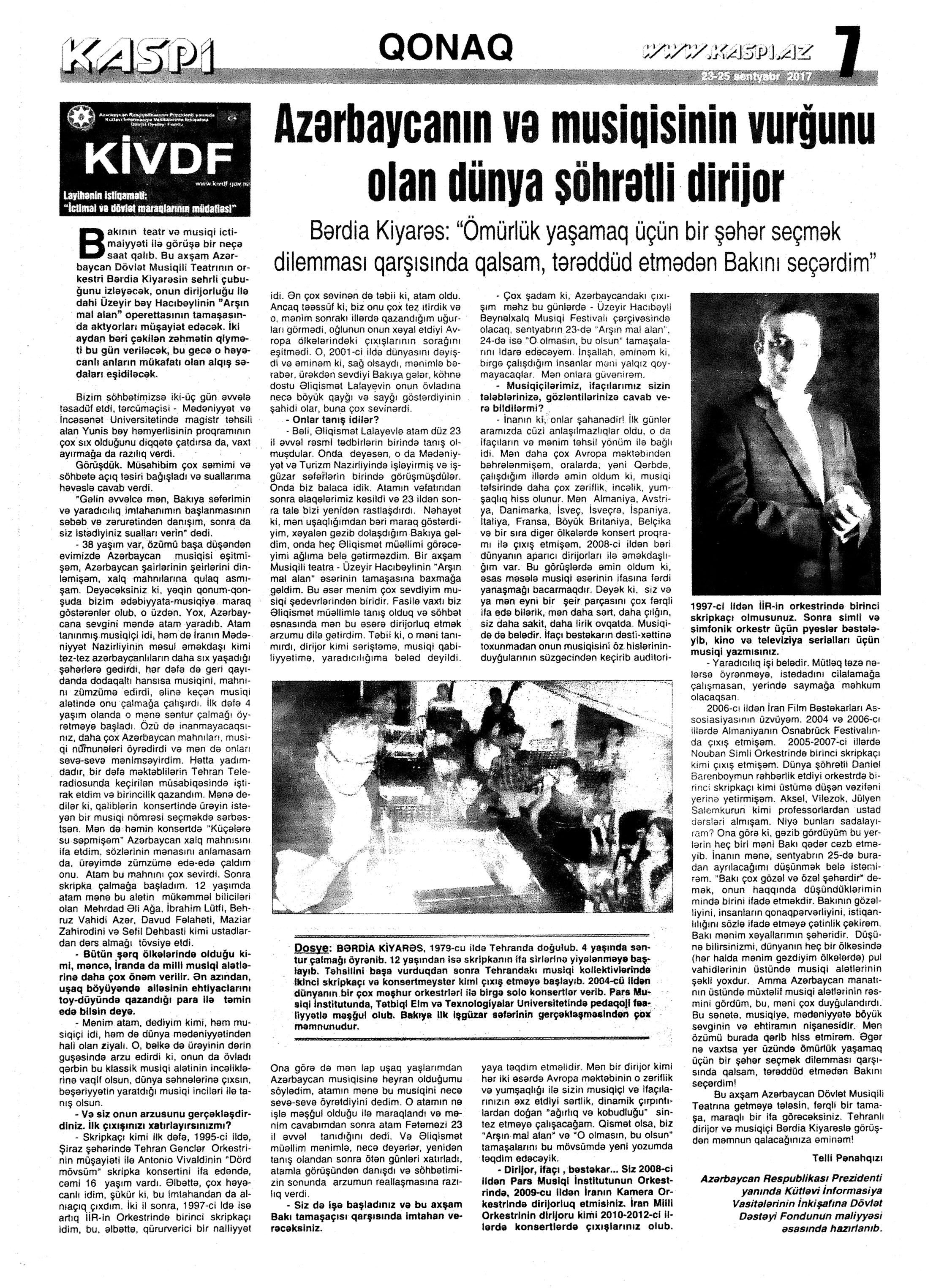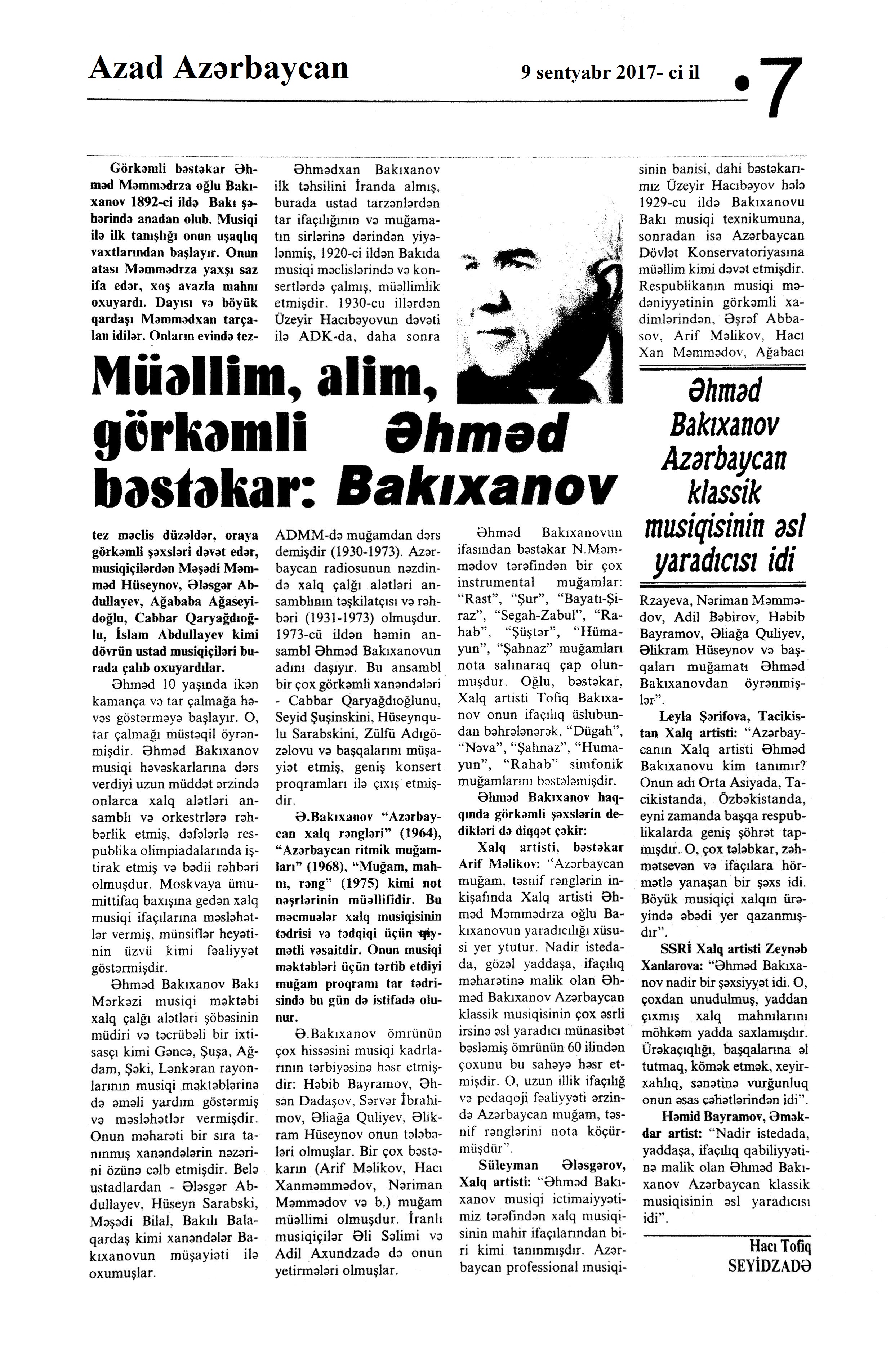 MUSİQİ 169. Abbaslı, T. Soltan Hacıbəyov: Azərbaycanımızın böyük sənət “Karvan”ının müəllif-sarbanı... //Mədəniyyət.- 2017.- 1 sentyabr.- S.13. 170. Abdullayev, Ə. “Almaniyaya daha yaxşı şərtlərlə işləməyə getmişəm”: Xalq artisti Əvəz Abdullayevlə ölkəmiz və musiqi barədə söhbət /müsahibəni apardı Mirməmməd Gülcahan //Mədəniyyət.- 2017.- 6 sentyabr.- S. 10. 171. Almaniyada Müslüm Maqomayevə həsr edilmiş gecə: [75 illiyi ilə bağlı] //Mədəniyyət.- 2017.- 27 sentyabr.- S.5. 172. Aslanov, N. “Musiqi onlar üçün müqəddəsdir”: İtaliyada təhsil alan Nofəl Aslanov: “Romada getdiyiniz hər yerdə musiqi sədaları eşidə bilərsiniz”: [tələbə ilə müsahibə] //Kaspi.- 2017.- 15 sentyabr.- S.11. 173. Azərbaycan xalqının əvəzsiz irsi: Portuqaliya portalında tar barədə yazı dərc olunub //Mədəniyyət.- 2017.- 22 sentyabr.- S.13. 174. Azərbaycan musiqisinin daha bir möhtəşəm uğuru: Əməkdar artist Sahib Paşazadə “Şərq təranələri” XI Beynəlxalq Musiqi Festivalının baş mükafatına layiq görülüb: [Özbəkistanın Səmərqənd şəhərinin Reqistan meydanında keçirilən festivalda] //Mədəniyyət.- 2017.- 1 sentyabr.- S.4. 175. Azəri, L. “Muğamın meracı” kitabının təqdimatı keçirildi: Nəşr muğam ustadı Alim Qasımovun sənət dünyasından bəhs edir: [Muğam Mərkəzində] //Mədəniyyət.- 2017.- 29 sentyabr.- S.6. 176. Azəri, L. Bakının ruhunu musiqidə tərənnüm edən bəstəkar: Tofiq Quliyev – 100 //Mədəniyyət.- 2017.- 1 sentyabr.- S.10. 177. Bakıxanov, T. Zakir Mirzəyevin “Türk marşı”: Və ya Vyanada Azərbaycan qarmonu ilə görüş //Ekspress.- 2017.- 15 sentyabr.- S.13. 178. Bayramov, R. Sənətlə qovuşan qardaş ürəklər: Maestro Niyazinin 105 və görkəmli türk bəstəkarı Əhməd Adnan Sayqunun 110 illiyinə həsr olunur //Mədəniyyət.- 2017.- 13 sentyabr.- S.11. 179. “Euronews” kanalı Azərbaycanın musiqi ənənələri haqqında //Mədəniyyət.- 2017.- 8 sentyabr.- S.11. 180. Əliyeva , N. “Təhsilimi xaricdə davam etdirmək arzusundayam”: Beynəlxalq müsabiqələr qalibi Nuranə Əliyeva gələcəkdə istedadlı tələbələr yetişdirmək istəyir: [pianoçu ilə söhbət] //Azərbaycan müəllimi.-2017.- 16 sentyabr.- S.14. 181. Əliyeva, A. Böyük caz ustası Vaqif Mustafazadənin xatirəsi əbədiyaşardır: [cazmenin ev-muzeyinin direktoru Afaq Əliyevanın müsahibəsi] //Həftə içi.- 2017.-16-18 sentyabr.- S.7. 182. “Fəxr edirəm ki, Azərbaycan musiqisini layiqincə təmsil etdik”: Özbəkistan mətbuatı azərbaycanlı ifaçıların Səmərqənd festivalındakı uğurundan yazır //Mədəniyyət.- 2017.- 6 sentyabr.- S.6. 183. Fərəcov, S. Fikrət Əmirov adına incəsənət məktəbində ikiqat yubiley: [Fikrət Əmirovun anadan olmasının 95 və məktəbin 55 illiyi münasibətilə] //Mədəniyyət.- 2017.- 29 sentyabr.- S.10. 184. Fərəcov, S. Xəzər Universitetində məşhur pianoçunun ustad konserti: [Beynəlxalq Musiqi Festivalı çərçivəsində Eliso Bolkvadzenin konserti və ustad dərsinin keçirilməsi haqqında] //Mədəniyyət.- 2017.- 22 sentyabr.- S.3. 185. Fərəcov, S. İfası da adı kimi şirin idi...: [tarzən, salyanlı Şirin Axundov haqqında] //Mədəniyyət.- 2017.- 15 sentyabr.- S.15. 186. Fərəcov, S. Məclislər yaraşığı, ustad sənətkar: [xanəndə Məşədi İsi haqqında] //Mədəniyyət.- 2017.- 20 sentyabr.- S.15. 187. Fərəcov, S. Milli vokal sənətimizin təməlçisi: Şövkət Məmmədova – 120 //Mədəniyyət.- 2017.-27 sentyabr.- S.12. 188. Fərəcov, S. Tar ifaçılığı sənətinin görkəmli nümayəndəsi: [Əməkdar artist Əhsən Dadaşov haqqında] //Mədəniyyət.- 2017.- 6 sentyabr.- S.12. 189. Fərəcov, S. Tarı xanəndə kimi “oxutduran” sənətkar: [tar ifaçısı Məşədi Zeynal haqqında] //Mədəniyyət.-2017.- 29 sentyabr.- S.15. 190. Fransanın “La Gazette Musicale” portalı azərbaycanlı bəstəkardan yazır: [Firəngiz Əlizadənin həyat və yaradıcılığı haqqında] //Mədəniyyət.- 2017.- 1 sentyabr.- S.3. 191. Gülüstan Əliyeva: Dövlətimizin mənə verdiyi adı doğrulduramsa xoşbəxtəm: [Əməkdar artistlə müsahibə] /müsahibəni apardı Şəfiqə Dadaşova //İki sahil.- 2017.- 22 sentyabt.- S.12. 192. Hüseynov, F. Üzeyir Hacıbəyli IX Beynəlxalq Musiqi Festivalına hazırlıq müzakirə edilib: [Milli Kitabxanada Mədəniyyət və Turizm nazirinin müavini Ədalət Vəliyevin iştirakı ilə] //Mədəniyyət.- 2017.- 8 sentyabr.- S.4. 193. Xoyski, L. “Hər şey könlünüzcə olsun”: Fətəli xan Xoyskinin qardaşı nəvəsi: Mürtuza Məmmədova Bülbül adını nənəm verib: [Leyla xan Xoyski ilə müsahibə] //Ekspress.- 2017.- 8 sentyabr.- S.9. 194. İbrahimov, M. “Adım gənc istedadlıların “Qızıl kitabı”na yazıldı”: Beynəlxalq müsabiqələr qalibi Murad İbrahimov uğurları çoxaldıqca məsuliyyətinin artdığını etiraf edir: [Murad İbrahimovla söhbət] /müsahibəni apardı Sifai Səfərova //Azərbaycan müəllimi.- 2017.- 29 sentyabr.- S.13. 195. Kənan, A. Dünyada səsim qaldı...: Böyük xanəndə Seyid Mirbabayevin 150 illiyinə //525-ci qəzet.- 2017.- 8 sentyabr.- S.4. 196. Lalə. Maqomayevin 75 illiyi münasibətilə gənc ifaçıların konserti: [Bakıda Rusiya İnformasiya-Mədəniyyət Mərkəzində] //Mədəniyyət.- 2017.- 8 sentyabr.- S.2. 197. Məhərrəmova, T. Musiqi sənətimizin Bülbülü: Böyük sənətkarın dünyasını dəyişməsindən 56 il ötür //Kaspi.- 2017.- 27 sentyabr.- S.10. 198. Məşhur opera cütlüyü Vyana səhnəsində: [Azərbaycanın Əməkdar artisti Yusif Eyvazov və Rusiyanın Xalq artisti Anna Netrebko haqqında] //Mədəniyyət.- 2017.- 6 sentyabr.- S.10. 199. Mirməmməd, G. Avropa səhnələrindən gələn səsimiz...: [Azərbaycan musiqisinin təbliği haqqında] //Mədəniyyət.- 2017.- 1