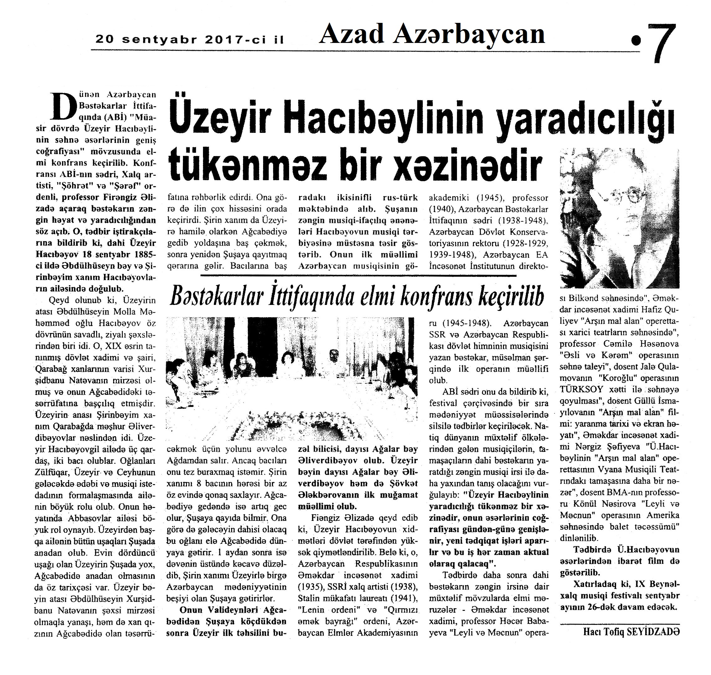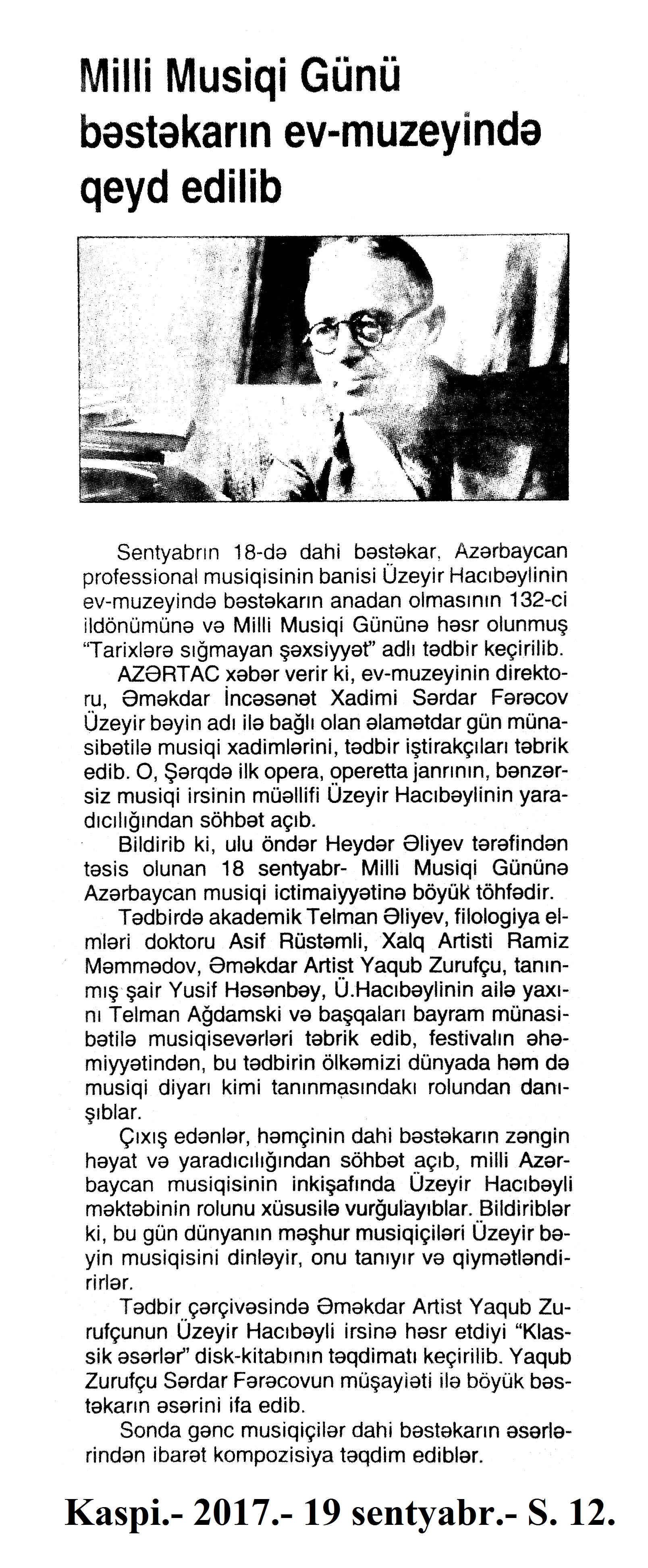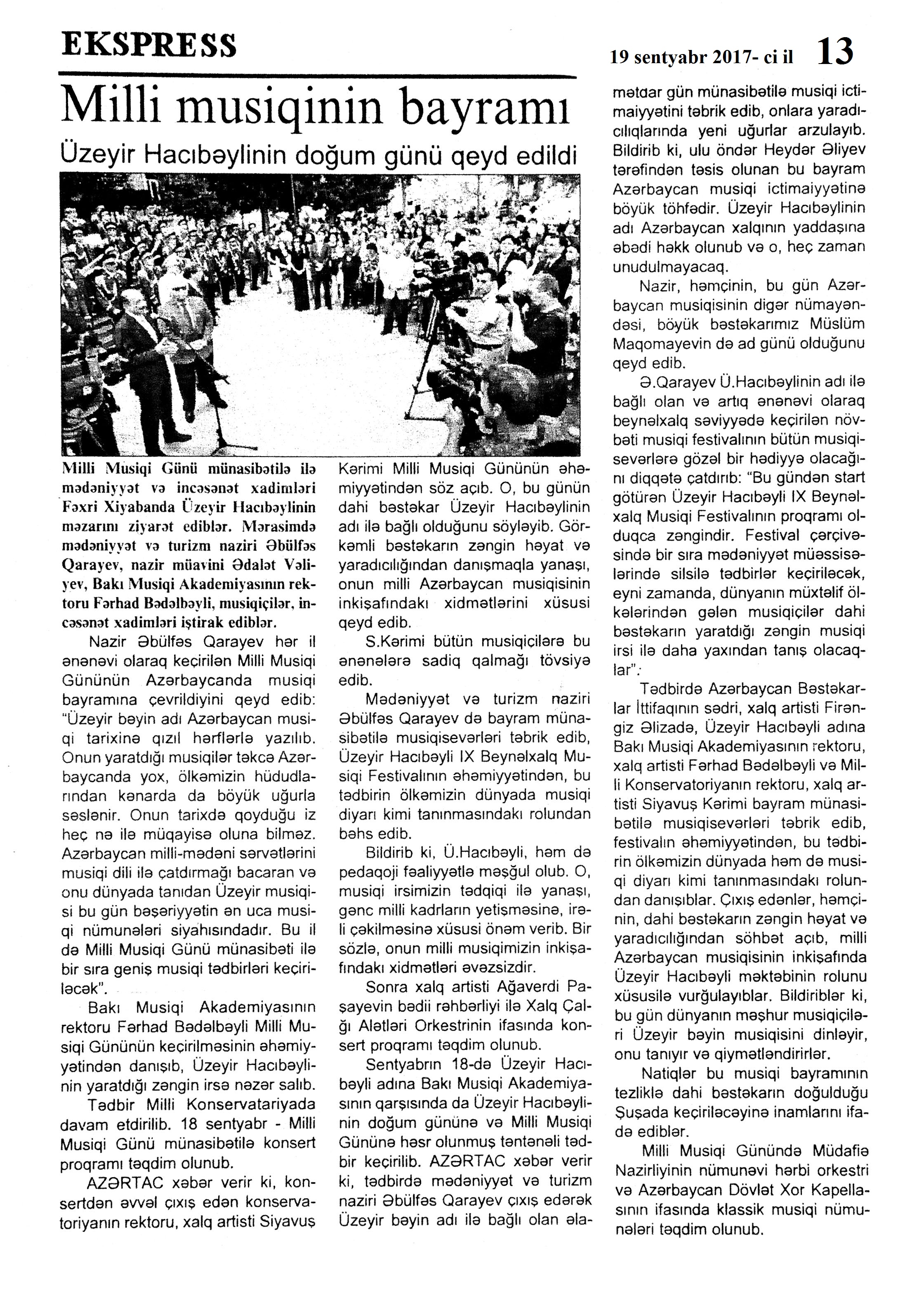 Bax: 58; 66; 80 Üzeyir Musiqi Günü 215. Abbaslı, T. Bənzərsiz DAHİ: Türk-müsəlman dünyasının milli iftixarı Üzeyir bəy Hacıbəyli //Mədəniyyət.- 2017.- 20 sentyabr.- S.13. 216. Adı özünə yaraşan ansamblın festival töhfəsi: [Beynəlxalq Musiqi Festivalı haqqında] //Mədəniyyət. - 2017.- 27 sentyabr.- S.8. 217. Anar. Üzeyir bəyin qəribə taleyi: “Səhər-səhər” rubrikasında //525-ci qəzet.- 2017.- 16 sentyabr.- S.11. 218. “Arşın mal alan” Serbiya paytaxtında nümayiş olunub: [Üzeyir Hacıbəylinin doğum günü münasibətilə] //Mədəniyyət.- 2017.- 20 sentyabr.- S.2. 219. Azəri, L. Beynəlxalq festival çərçivəsində daha bir konsert: Bəstəkarlarımızın xor, kamera-vokal və kamera-instrumental əsərləri səslənib: [Bəstəkarlar İttifaqında] //Mədəniyyət.- 2017.- 22 sentyabr.- S.5. 220. Azəri, L. Musiqi Mədəniyyəti Dövlət Muzeyinin 50 illik yubileyi qeyd olundu //Mədəniyyət.- 2017.- 27 sentyabr.- S.5. 221. Azəri, L. Üzeyir bəyin səhnə əsərlərinin coğrafiyası: Musiqi festivalı çərçivəsində elmi konfrans keçirildi: [Bəstəkarlar İttifaqında “Müasir dövrdə Üzeyir Hacıbəylinin səhnə əsərlərinin geniş coğrafiyası” mövzusunda] //Mədəniyyət.- 2017.- 20 sentyabr.- S.4. 222. Bakıxanov, T. Üzeyir bəy Hacıbəylini xatırlayarkən... //Ekspress.- 2017.- 16-18 sentyabr.- S.13. 223. Barokko və renessans musiqisi səsləndirilib: [Azərbaycan Dövlət Filarmoniyasında Beynəlxalq Musiqi Festivalı çərçivəsində] //Mədəniyyət.- 2017.- 22 sentyabr.- S.8. 224. Beynəlxalq festivalın daha bir konserti Ağcabədidə keçirilib //Mədəniyyət.- 2017.- 27 sentyabr.- S.6. 225. Beynəlxalq Üzeyir Hacıbəyli festivalı başa çatıb //Bizim yol.- 2017.- 28 sentyabr.- S.15. 226. Bir səhnəni paylaşan iki orkestr: [Azərbaycan Dövlət Filarmoniyasında Türkiyənin Başkənd Akademik Orkestri ilə Qara Qarayev adına Azərbaycan Dövlət Kamera Orkestrinin keçirdiyi konsert proqramı haqqında] //Mədəniyyət.- 2017.- 27 sentyabr.- S.8. 227. Bolkvadze, E. “Şansınız yoxdur” deyənləri dinləməyin”: Tanınmış pianoçunun bu məsləhəti hamı üçündür: [Eliso Bolkvadzenin müsahibəsi] /müsahibəni apardı Gülcahan Mirməmməd //Mədəniyyət.- 2017.- 27 sentyabr.- S.10. 228. Dahi bəstəkar Üzeyir Hacıbəylinin xatirəsi anılıb //Xalq qəzeti.- 2017.-19 sentyabr.- S.7.; Həftə içi.- 2017.-19 sentyabr.- S.8. 229. Dövrləri və zövqləri qovuşduran konsert: [Beynəlxalq Musiqi Festivalı haqqında] //Mədəniyyət.- 2017.- 27 sentyabr.- S.8. 230. Əhmədova, M. Bakı Musiqi Akademiyasında Rusiya fortepiano triosunun konserti: [Beynəlxalq Musiqi Festivalı çərçivəsində] //Mədəniyyət.- 2017.- 22 sentyabr.- S.8. 231. Əliyev, V. İmişlidə dahi Üzeyir Hacıbəylinin əsərləri səsləndirilib: [Milli Musiqi Günü münasibətilə] //Azərbaycan müəllimi.- 2017.- 22 sentyabr.- S.6. 232. Fariz. “Sevgili canan” adlı konsert proqramı təqdim olundu //Mədəniyyət.- 2017.- 22 sentyabr.- S.2. 233. Fariz. Dahi bəstəkarın əbədi sənət işığı: Milli Musiqi Günü təntənəli şəkildə qeyd olundu:[Beynəlxalq Muğam Mərkəzində] //Mədəniyyət.- 2017.- 20 sentyabr.- S.3. 234. Fariz. Festivalın konsert proqramları davam edir: [Üzeyir Hacıbəylinin doğum günü münasibətilə] //Mədəniyyət.- 2017.- 20 sentyabr.- S.2. 235. Fərəcov, S. “Tarixlərə sığmayan şəxsiyyət”: Üzeyir Hacıbəylinin ev-muzeyində Milli Musiqi Günü qeyd olundu //Mədəniyyət.- 2017.- 20 sentyabr.- S.7. 236. Gülcahan. Nağıllardan notlara köçən əsərlərlə vurulan son akkordlar: [Üzeyir Hacıbəyli Beynəlxalq Musiqi Festivalının başa çatması haqqında] //Mədəniyyət.- 2017.- 29 sentyabr.- S.6. 237. Həsənova, C. Musiqi dühası: 18 sentyabr Milli Musiqi Günüdür //Azərbaycan.- 2017.-17 sentyabr.- S.5. 238. Hüseynov, F. “Üzeyir Hacıbəyliyə ithaf”: [Azərbaycan Dövlət Filarmoniyasında eyniadlı konsert proqramının təqdim olunması haqqında] //Mədəniyyət.- 2017.- 27 sentyabr.- S.6. 239. Kazımov, N. Üzeyir sənəti sönməz məşəldir: [Ü. Hacıbəylinin doğum günü haqqında] //Xalq qəzeti.-2017.-14 sentyabr.- S.7. 240. Lalə. Musiqi Günü Berlində də qeyd edilib //Mədəniyyət.- 2017.- 22 sentyabr.- S.2. 241. Maestronun ev-muzeyində kamera musiqisi axşamı: [Leopold və Mstislav Rostropoviçlərin ev-muzeyində] //Mədəniyyət.- 2017.- 22 sentyabr.- S.3. 242. Maestronun ev-muzeyində konsert və sərgi maraqla qarşılanıb: [Leopold və Mstislav Rostropoviçlərin ev-muzeyində “Kamera musiqi axşamı” adlı tədbirin keçirilməsi haqqında] //Mədəniyyət.- 2017.- 27 sentyabr.- S.10. 243. Məhərrəmova, T. Hər gün təmasda olduğumuz dahi: Bu məkana gələndə insan təmizlənir, saflaşır: [Üzeyir Hacıbəylinin ev-muzeyi haqqında] //Kaspi.- 2017.- 19 sentyabr.- S.9. 244. Milli Musiqi Günü bəstəkarın ev-muzeyində qeyd edilib //Kaspi.- 2017.- 19 sentyabr.- S.12. 245. Milli Musiqi Günü münasibətilə konsertlər //Mədəniyyət.- 2017.- 20 sentyabr.- S.4. 246. Milli Musiqi Gününə həsr olunmuş konsert: [Naxçıvan Dövlət Universitetinin incəsənət fakültəsində] //Azərbaycan müəllimi.- 2017.- 22 sentyabr.- S.6. 247. Milli musiqinin bayramı: Üzeyir Hacıbəylinin doğum günü qeyd edildi: [Mədəniyyət və Turizm naziri Əbülfəs Qarayevin başçılığı ilə Fəxri Xiyabanda] //Ekspress.- 2017.- 19 sentyabr.- S.13. 248. Mirməmməd, G. Doğma tamaşaların festival variasiyası fərqli olacaq: [Dövlət Musiqili Teatrında “Arşın mal alan” və “O olmasın, bu olsun” musiqili komediyalarının oynanılması haqqında] //Mədəniyyət.- 2017.- 22 sentyabr.- S.6. 249. Mirməmməd, G. Qonşu qonşu ilə unison oxumasa...: [Azərbaycan Dövlət Filarmoniyasında keçirilən konsert proqramı haqqında] //Mədəniyyət.- 2017.- 27 sentyab