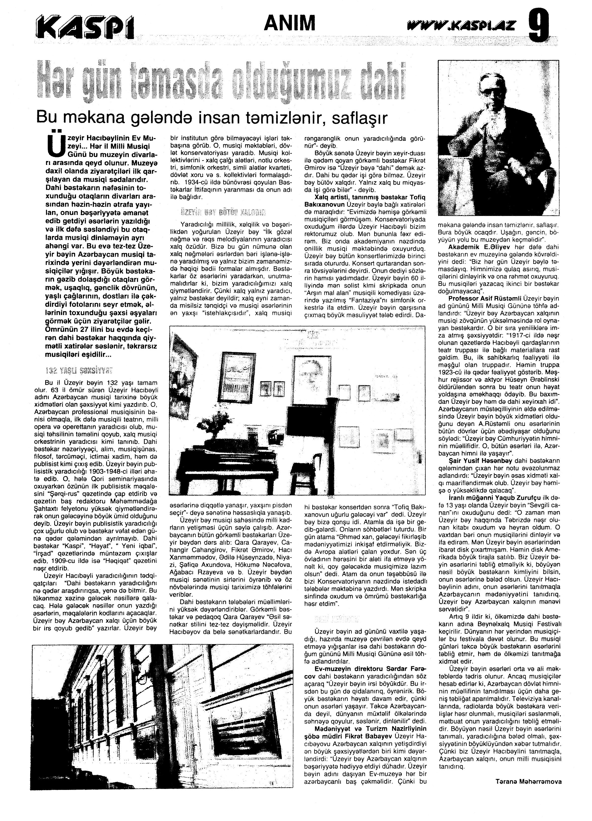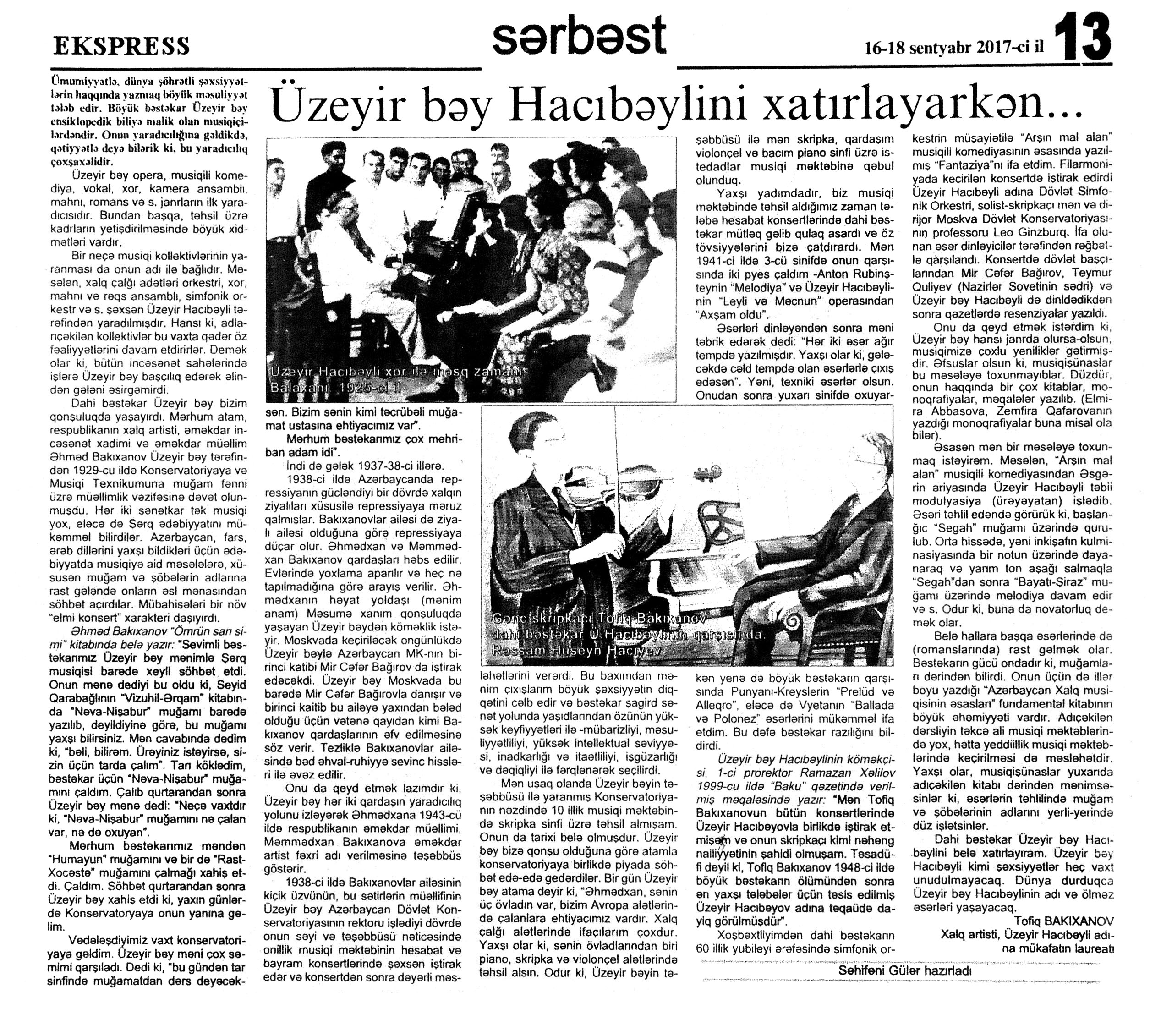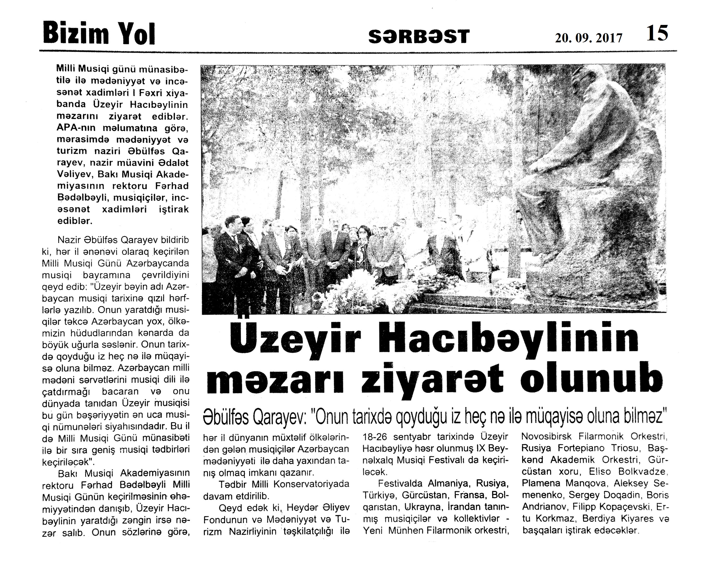 Bax: 58; 66; 80 Üzeyir Musiqi Günü 215. Abbaslı, T. Bənzərsiz DAHİ: Türk-müsəlman dünyasının milli iftixarı Üzeyir bəy Hacıbəyli //Mədəniyyət.- 2017.- 20 sentyabr.- S.13. 216. Adı özünə yaraşan ansamblın festival töhfəsi: [Beynəlxalq Musiqi Festivalı haqqında] //Mədəniyyət. - 2017.- 27 sentyabr.- S.8. 217. Anar. Üzeyir bəyin qəribə taleyi: “Səhər-səhər” rubrikasında //525-ci qəzet.- 2017.- 16 sentyabr.- S.11. 218. “Arşın mal alan” Serbiya paytaxtında nümayiş olunub: [Üzeyir Hacıbəylinin doğum günü münasibətilə] //Mədəniyyət.- 2017.- 20 sentyabr.- S.2. 219. Azəri, L. Beynəlxalq festival çərçivəsində daha bir konsert: Bəstəkarlarımızın xor, kamera-vokal və kamera-instrumental əsərləri səslənib: [Bəstəkarlar İttifaqında] //Mədəniyyət.- 2017.- 22 sentyabr.- S.5. 220. Azəri, L. Musiqi Mədəniyyəti Dövlət Muzeyinin 50 illik yubileyi qeyd olundu //Mədəniyyət.- 2017.- 27 sentyabr.- S.5. 221. Azəri, L. Üzeyir bəyin səhnə əsərlərinin coğrafiyası: Musiqi festivalı çərçivəsində elmi konfrans keçirildi: [Bəstəkarlar İttifaqında “Müasir dövrdə Üzeyir Hacıbəylinin səhnə əsərlərinin geniş coğrafiyası” mövzusunda] //Mədəniyyət.- 2017.- 20 sentyabr.- S.4. 222. Bakıxanov, T. Üzeyir bəy Hacıbəylini xatırlayarkən... //Ekspress.- 2017.- 16-18 sentyabr.- S.13. 223. Barokko və renessans musiqisi səsləndirilib: [Azərbaycan Dövlət Filarmoniyasında Beynəlxalq Musiqi Festivalı çərçivəsində] //Mədəniyyət.- 2017.- 22 sentyabr.- S.8. 224. Beynəlxalq festivalın daha bir konserti Ağcabədidə keçirilib //Mədəniyyət.- 2017.- 27 sentyabr.- S.6. 225. Beynəlxalq Üzeyir Hacıbəyli festivalı başa çatıb //Bizim yol.- 2017.- 28 sentyabr.- S.15. 226. Bir səhnəni paylaşan iki orkestr: [Azərbaycan Dövlət Filarmoniyasında Türkiyənin Başkənd Akademik Orkestri ilə Qara Qarayev adına Azərbaycan Dövlət Kamera Orkestrinin keçirdiyi konsert proqramı haqqında] //Mədəniyyət.- 2017.- 27 sentyabr.- S.8. 227. Bolkvadze, E. “Şansınız yoxdur” deyənləri dinləməyin”: Tanınmış pianoçunun bu məsləhəti hamı üçündür: [Eliso Bolkvadzenin müsahibəsi] /müsahibəni apardı Gülcahan Mirməmməd //Mədəniyyət.- 2017.- 27 sentyabr.- S.10. 228. Dahi bəstəkar Üzeyir Hacıbəylinin xatirəsi anılıb //Xalq qəzeti.- 2017.-19 sentyabr.- S.7.; Həftə içi.- 2017.-19 sentyabr.- S.8. 229. Dövrləri və zövqləri qovuşduran konsert: [Beynəlxalq Musiqi Festivalı haqqında] //Mədəniyyət.- 2017.- 27 sentyabr.- S.8. 230. Əhmədova, M. Bakı Musiqi Akademiyasında Rusiya fortepiano triosunun konserti: [Beynəlxalq Musiqi Festivalı çərçivəsində] //Mədəniyyət.- 2017.- 22 sentyabr.- S.8. 231. Əliyev, V. İmişlidə dahi Üzeyir Hacıbəylinin əsərləri səsləndirilib: [Milli Musiqi Günü münasibətilə] //Azərbaycan müəllimi.- 2017.- 22 sentyabr.- S.6. 232. Fariz. “Sevgili canan” adlı konsert proqramı təqdim olundu //Mədəniyyət.- 2017.- 22 sentyabr.- S.2. 233. Fariz. Dahi bəstəkarın əbədi sənət işığı: Milli Musiqi Günü təntənəli şəkildə qeyd olundu:[Beynəlxalq Muğam Mərkəzində] //Mədəniyyət.- 2017.- 20 sentyabr.- S.3. 234. Fariz. Festivalın konsert proqramları davam edir: [Üzeyir Hacıbəylinin doğum günü münasibətilə] //Mədəniyyət.- 2017.- 20 sentyabr.- S.2. 235. Fərəcov, S. “Tarixlərə sığmayan şəxsiyyət”: Üzeyir Hacıbəylinin ev-muzeyində Milli Musiqi Günü qeyd olundu //Mədəniyyət.- 2017.- 20 sentyabr.- S.7. 236. Gülcahan. Nağıllardan notlara köçən əsərlərlə vurulan son akkordlar: [Üzeyir Hacıbəyli Beynəlxalq Musiqi Festivalının başa çatması haqqında] //Mədəniyyət.- 2017.- 29 sentyabr.- S.6. 237. Həsənova, C. Musiqi dühası: 18 sentyabr Milli Musiqi Günüdür //Azərbaycan.- 2017.-17 sentyabr.- S.5. 238. Hüseynov, F. “Üzeyir Hacıbəyliyə ithaf”: [Azərbaycan Dövlət Filarmoniyasında eyniadlı konsert proqramının təqdim olunması haqqında] //Mədəniyyət.- 2017.- 27 sentyabr.- S.6. 239. Kazımov, N. Üzeyir sənəti sönməz məşəldir: [Ü. Hacıbəylinin doğum günü haqqında] //Xalq qəzeti.-2017.-14 sentyabr.- S.7. 240. Lalə. Musiqi Günü Berlində də qeyd edilib //Mədəniyyət.- 2017.- 22 sentyabr.- S.2. 241. Maestronun ev-muzeyində kamera musiqisi axşamı: [Leopold və Mstislav Rostropoviçlərin ev-muzeyində] //Mədəniyyət.- 2017.- 22 sentyabr.- S.3. 242. Maestronun ev-muzeyində konsert və sərgi maraqla qarşılanıb: [Leopold və Mstislav Rostropoviçlərin ev-muzeyində “Kamera musiqi axşamı” adlı tədbirin keçirilməsi haqqında] //Mədəniyyət.- 2017.- 27 sentyabr.- S.10. 243. Məhərrəmova, T. Hər gün təmasda olduğumuz dahi: Bu məkana gələndə insan təmizlənir, saflaşır: [Üzeyir Hacıbəylinin ev-muzeyi haqqında] //Kaspi.- 2017.- 19 sentyabr.- S.9. 244. Milli Musiqi Günü bəstəkarın ev-muzeyində qeyd edilib //Kaspi.- 2017.- 19 sentyabr.- S.12. 245. Milli Musiqi Günü münasibətilə konsertlər //Mədəniyyət.- 2017.- 20 sentyabr.- S.4. 246. Milli Musiqi Gününə həsr olunmuş konsert: [Naxçıvan Dövlət Universitetinin incəsənət fakültəsində] //Azərbaycan müəllimi.- 2017.- 22 sentyabr.- S.6. 247. Milli musiqinin bayramı: Üzeyir Hacıbəylinin doğum günü qeyd edildi: [Mədəniyyət və Turizm naziri Əbülfəs Qarayevin başçılığı ilə Fəxri Xiyabanda] //Ekspress.- 2017.- 19 sentyabr.- S.13. 248. Mirməmməd, G. Doğma tamaşaların festival variasiyası fərqli olacaq: [Dövlət Musiqili Teatrında “Arşın mal alan” və “O olmasın, bu olsun” musiqili komediyalarının oynanılması haqqında] //Mədəniyyət.- 2017.- 22 sentyabr.- S.6. 249. Mirməmməd, G. Qonşu qonşu ilə unison oxumasa...: [Azərbaycan Dövlət Filarmoniyasında keçirilən konsert proqramı haqqında] //Mədəniyyət.- 2017.- 27 sentyab