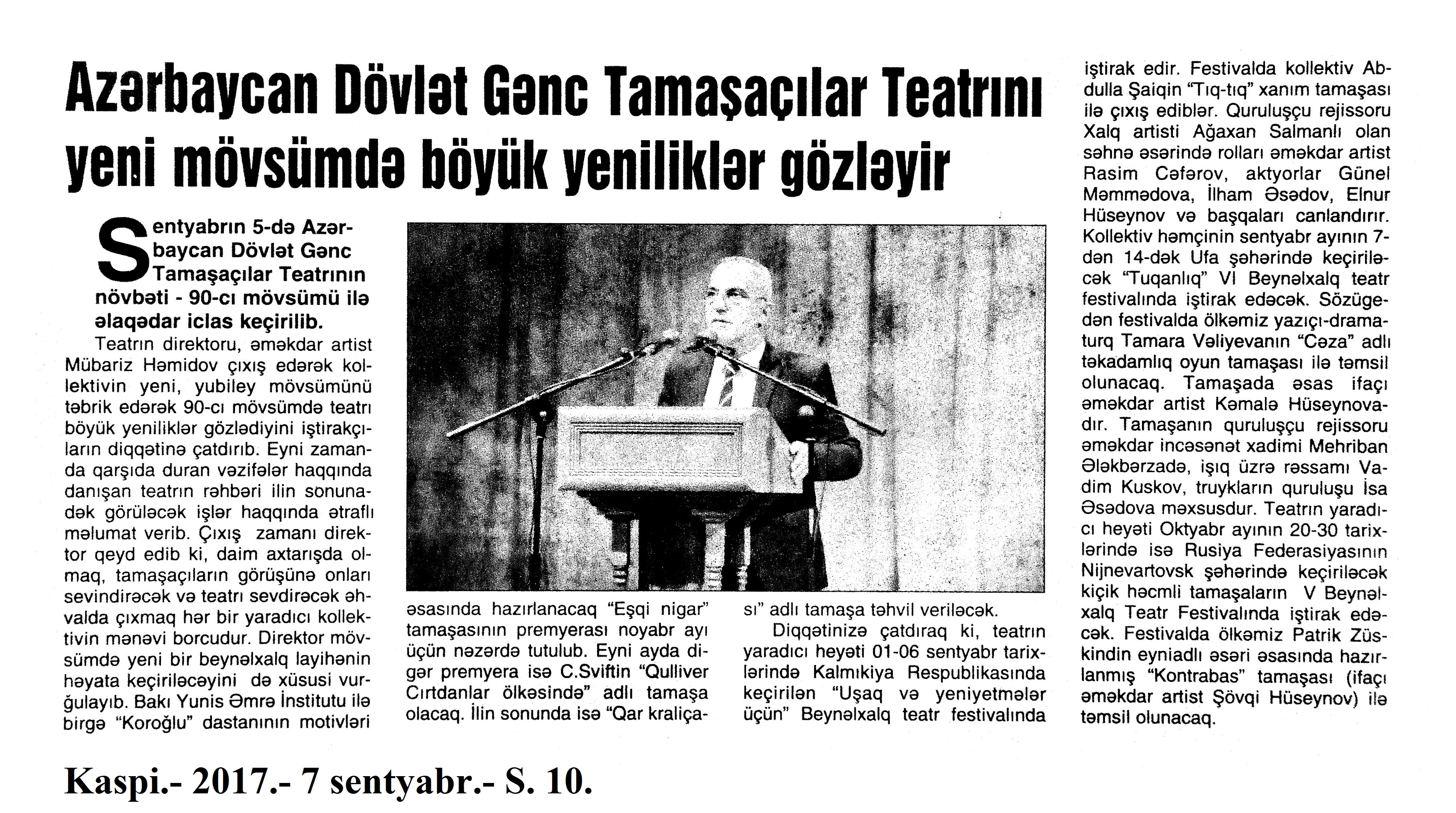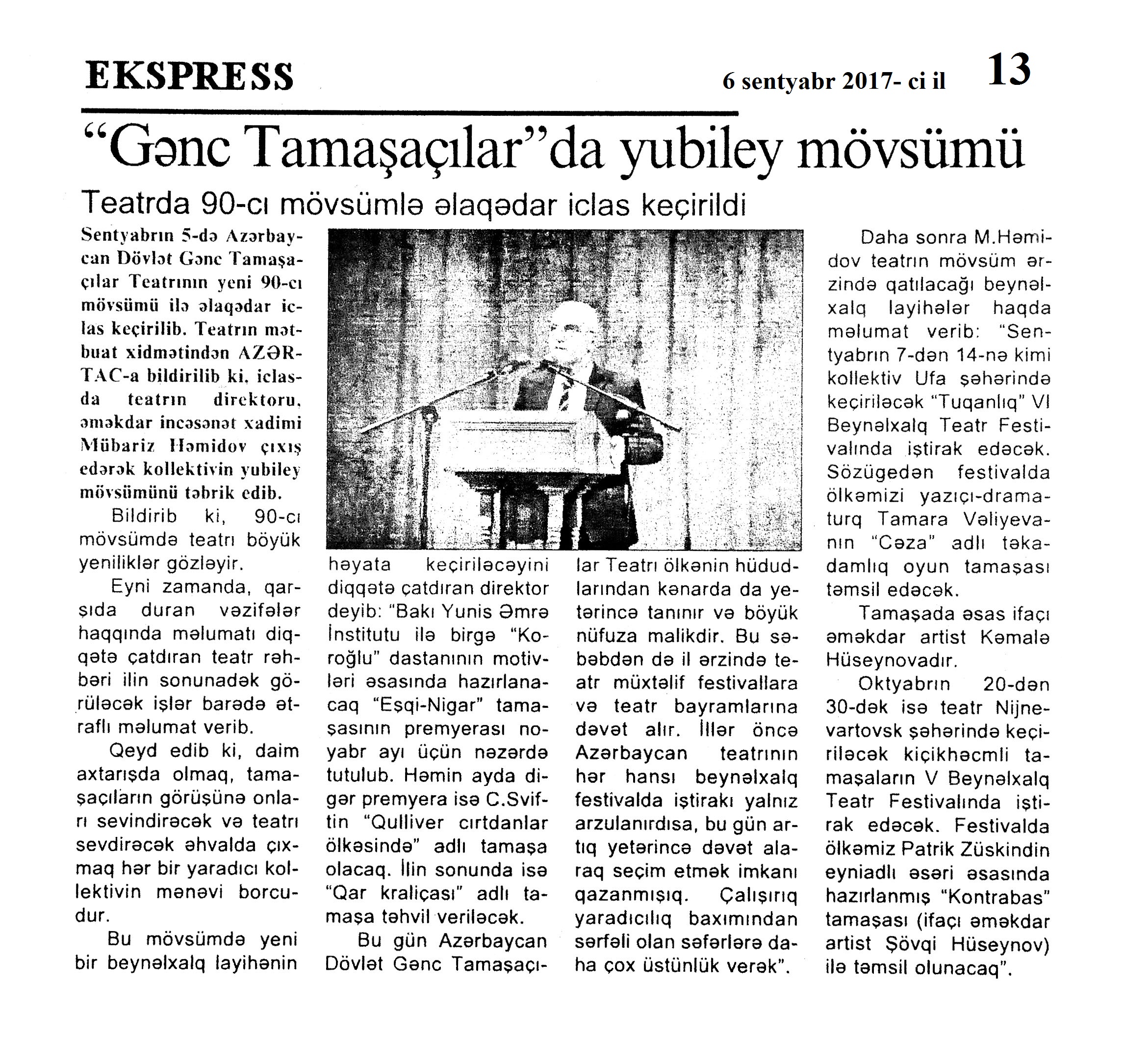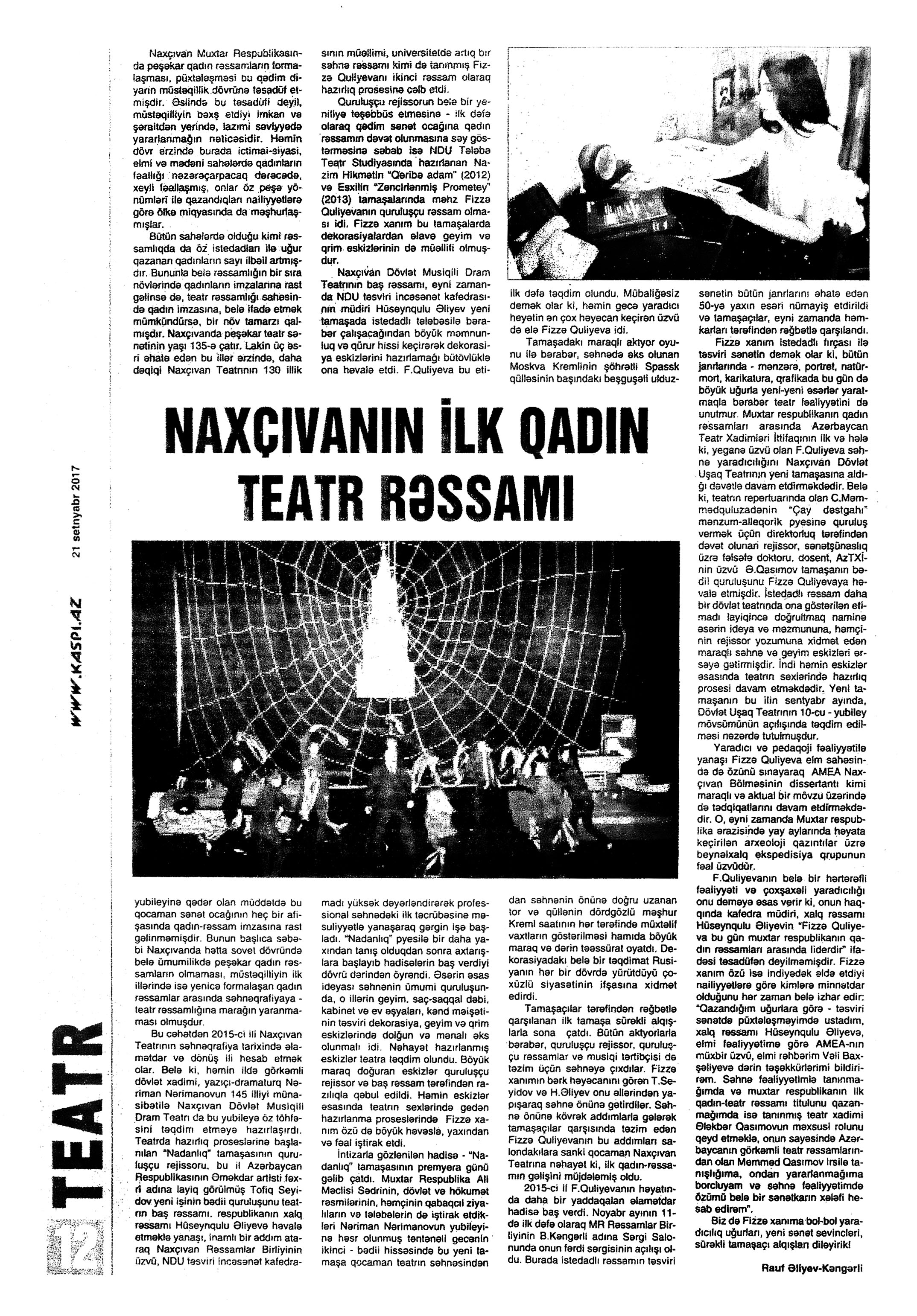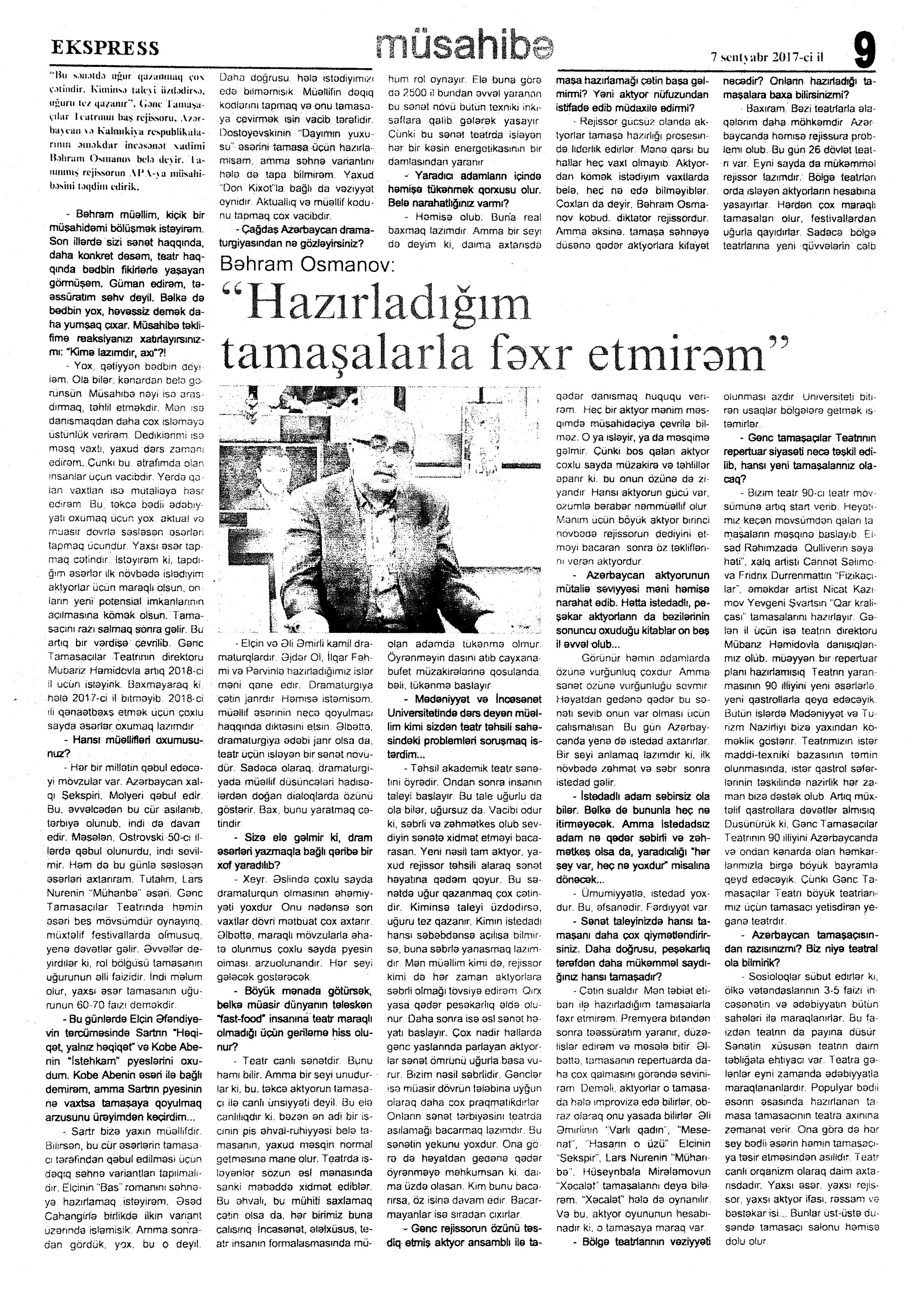 Bax: 55; 57; 70; 82; 145 Akademik Milli Dram Teatrı 325. Abbaslı, T. Fenomenal-teatral sənətkar: Hər səhnədə bir “lo” salan, özü heç vaxt gülmədən - hər vaxt hamını uğunduran Siyavuş Aslan.. //Mədəniyyət.- 2017.- 6 sentyabr.- S.13. 326. Dadaşov R. “Dözə bilmədim, içimdə çəkdim”: [Xalq artisti Rəfael Dadaşovun müsahibəsi] /müsahibəni apardı Tahirə Məmmədova //Şərq.- 2017.- 20 sentyabr.- S.13. 327. Fərəcov, S. Bir rejissorun ömür və sənət yolu: [Xalq artisti Ələsgər Şərifov haqqında] //Mədəniyyət.- 2017.- 8 sentyabr.- S.15. 328. Qurbanlı, R. “Sən əsl Azərbaycan gözəlisən”: [Xalq artisti Leyla Bədirbəyli haqqında] //Üç nöqtə.- 2017.- 6 sentyabr.- S. 12. 329. Qurbanlı, R. Həyatda hər şeyim vardı, sevdim də: [teatrın aktrisası Ağasıbəyli İradənın müsahibəsi] //Üç nöqtə.- 2017.- 27 sentyabr- S.12. 330. Milli Dram Teatrı tamaşaçıların görüşünə “Qarabağnamə” ilə gəldi: [Mərahim Fərzəlibəyovun hazırladığı eyniadlı tamaşa ilə] //Mədəniyyət.- 2017.- 27 sentyabr.- S.7. 331. Mirməmməd, G. “Mən gözəllərdə gözəl ruh araram”...: [Fatma Muxtarova, Leyla Bədirbəyli və Nəcibə Məlikova haqqında] //Mədəniyyət.- 2017.- 8 sentyabr.- S. 13. 332. Muxtar, R. Tofiq Kazımov haqqında xatirələrim //Səs.- 2017.- 21 sentyabr.- S. 13. 333. Nəsibova, R. “Seriallar aktyorları dolandırır”: [teatrın aktrisası Rada Nəsibova ilə müsahibə] /müsahibəni apardı Namiq Məmmədli //Ekspress.- 2017.- 22 sentyabr.- S.13. 334. Su, A. “Meydanda tək idim...”: [teatrın aktrisası Afət Su ilə müsahibə] /müsahibəni apardı Xəyalə Rəis //Kaspi.- 2017.- 20 sentyabr.- S.12. Azərbaycan Dövlət Gənc Tamaşaçılar Teatrı 335. Azərbaycan Dövlət Gənc Tamaşaçılar Teatrını yeni mövsümdə böyük yeniliklər gözləyir //Kaspi.- 2017.- 7 sentyabr.- S.10. 336. “Cəza” monotamaşasının premyerası: [rejissor Mehriban Ələkbərzadənin hazırladığı eyniadlı tamaşa Gənc Tamaşaçılar Teatrının səhnəsində] //Mədəniyyət.-2017.- 29 oktyabr.- S. 4. 337. Gənc Tamaşaçılar Teatrının yubiley mövsümü başlayıb: [Bəhram Osmanovun hazırladığı “Hekayəti-xırs-quldurbasan” tamaşası ilə] //Mədəniyyət.- 2017.- 27 sentyabr.- S.7. 338. “Gənc Tamaşaçılar”da yubiley mövsümü: Teatrda 90-cı mövsümlə əlaqədar iclas keçirildi //Ekspress.- 2017.- 6 sentyabr.- S.13. 339. Osmanov, B. Bəhram Osmanov: “Hazırladığım tamaşalarla fəxr etmirəm”: [teatrın baş rejissorunun müsahibəsi] //Ekspress.- 2017.- 7 sentyabr.- S.9. 340. Ötən teatr mövsümünün son akkordları...: [teatrın 89-cu mövsümə yekun vurması haqqında] //Kaspi.- 2017.- 7 sentyabr.- S.10.