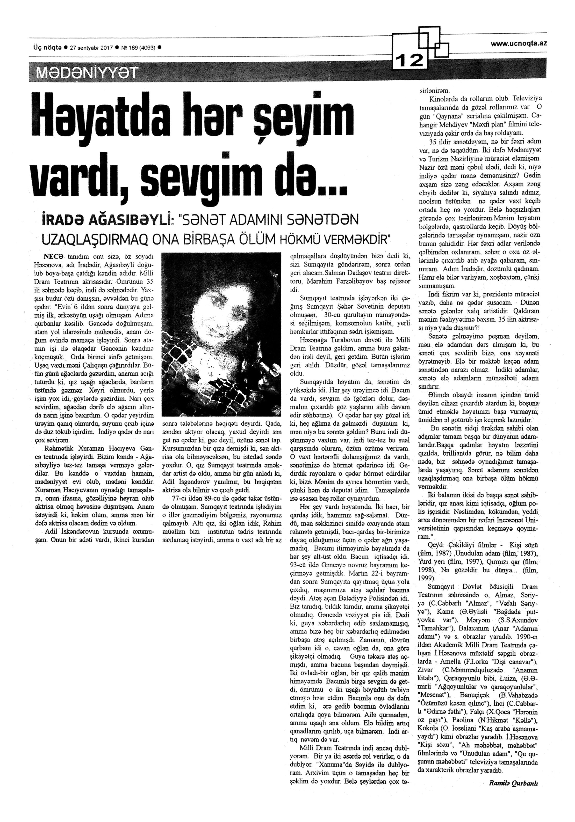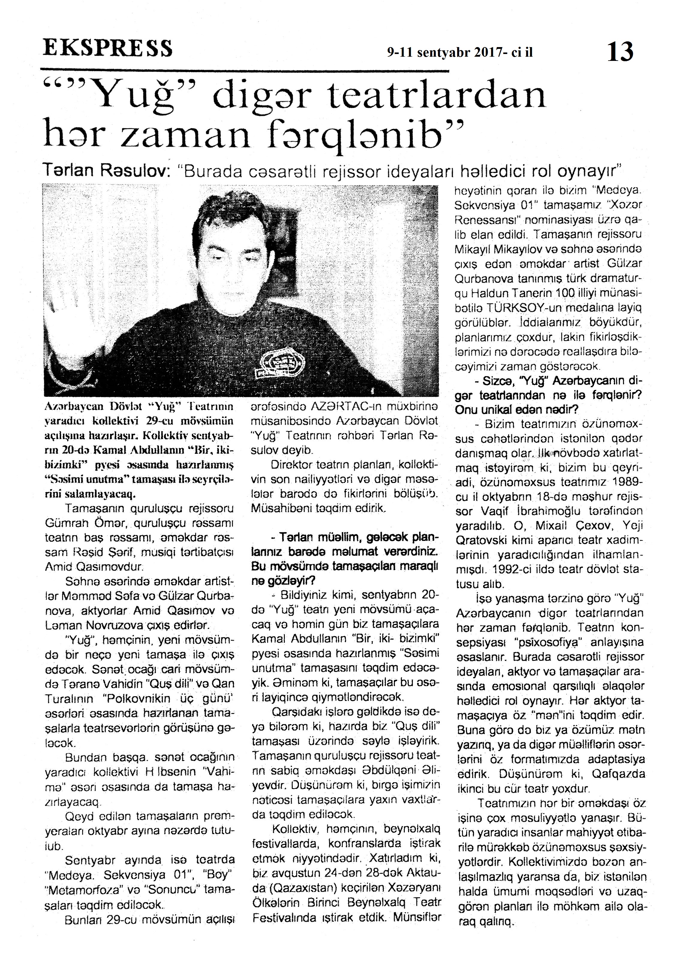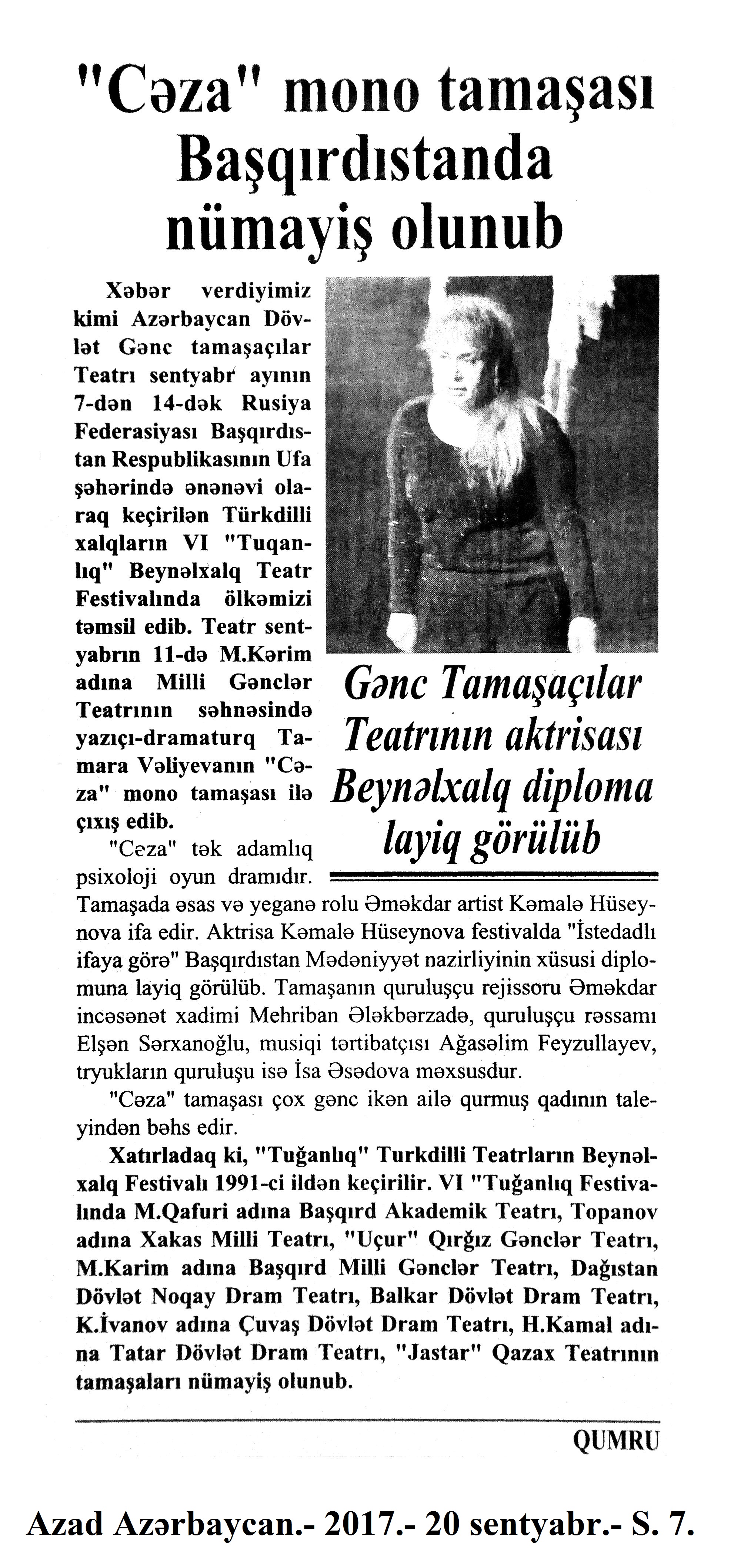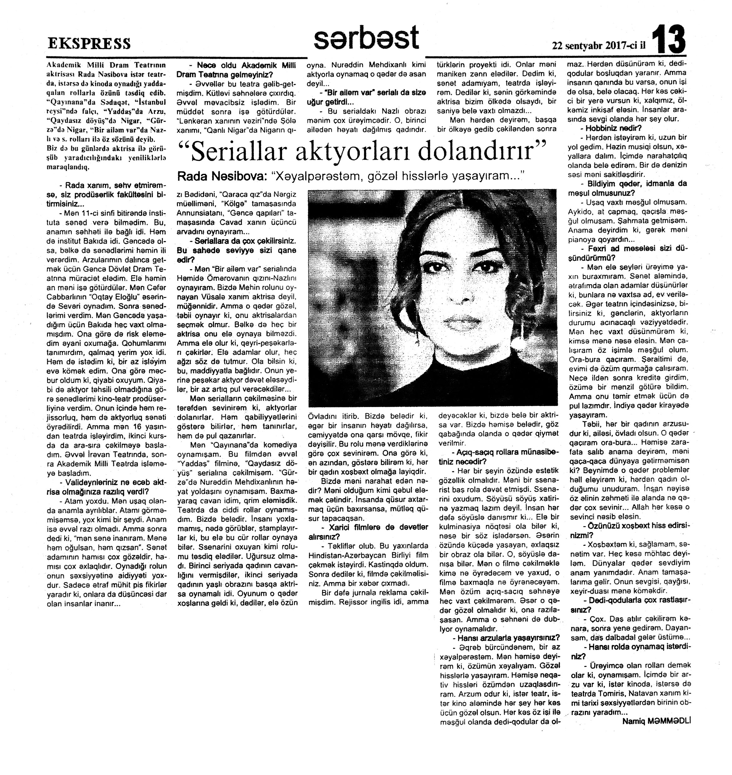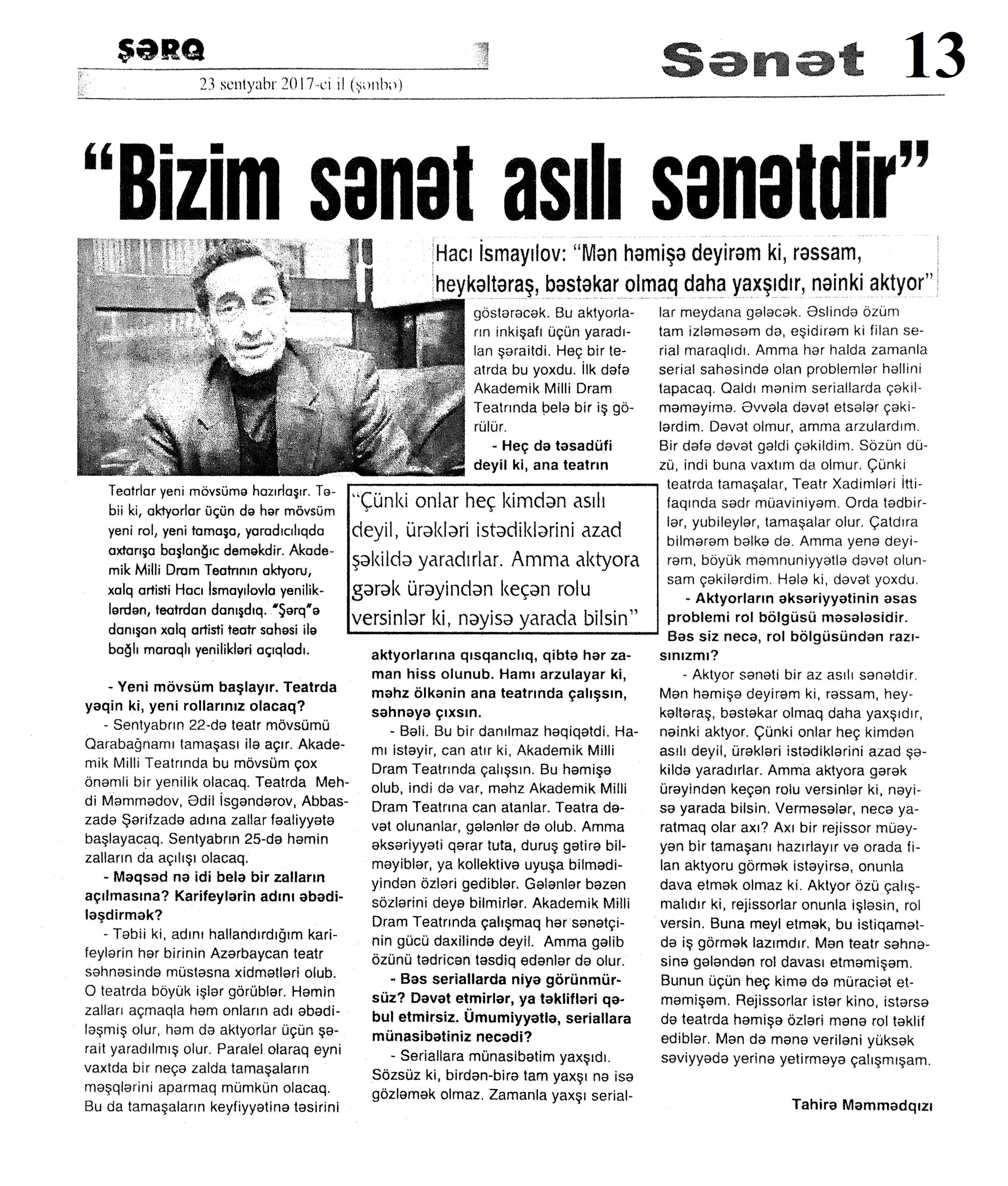 Bax: 55; 57; 70; 82; 145 Akademik Milli Dram Teatrı 325. Abbaslı, T. Fenomenal-teatral sənətkar: Hər səhnədə bir “lo” salan, özü heç vaxt gülmədən - hər vaxt hamını uğunduran Siyavuş Aslan.. //Mədəniyyət.- 2017.- 6 sentyabr.- S.13. 326. Dadaşov R. “Dözə bilmədim, içimdə çəkdim”: [Xalq artisti Rəfael Dadaşovun müsahibəsi] /müsahibəni apardı Tahirə Məmmədova //Şərq.- 2017.- 20 sentyabr.- S.13. 327. Fərəcov, S. Bir rejissorun ömür və sənət yolu: [Xalq artisti Ələsgər Şərifov haqqında] //Mədəniyyət.- 2017.- 8 sentyabr.- S.15. 328. Qurbanlı, R. “Sən əsl Azərbaycan gözəlisən”: [Xalq artisti Leyla Bədirbəyli haqqında] //Üç nöqtə.- 2017.- 6 sentyabr.- S. 12. 329. Qurbanlı, R. Həyatda hər şeyim vardı, sevdim də: [teatrın aktrisası Ağasıbəyli İradənın müsahibəsi] //Üç nöqtə.- 2017.- 27 sentyabr- S.12. 330. Milli Dram Teatrı tamaşaçıların görüşünə “Qarabağnamə” ilə gəldi: [Mərahim Fərzəlibəyovun hazırladığı eyniadlı tamaşa ilə] //Mədəniyyət.- 2017.- 27 sentyabr.- S.7. 331. Mirməmməd, G. “Mən gözəllərdə gözəl ruh araram”...: [Fatma Muxtarova, Leyla Bədirbəyli və Nəcibə Məlikova haqqında] //Mədəniyyət.- 2017.- 8 sentyabr.- S. 13. 332. Muxtar, R. Tofiq Kazımov haqqında xatirələrim //Səs.- 2017.- 21 sentyabr.- S. 13. 333. Nəsibova, R. “Seriallar aktyorları dolandırır”: [teatrın aktrisası Rada Nəsibova ilə müsahibə] /müsahibəni apardı Namiq Məmmədli //Ekspress.- 2017.- 22 sentyabr.- S.13. 334. Su, A. “Meydanda tək idim...”: [teatrın aktrisası Afət Su ilə müsahibə] /müsahibəni apardı Xəyalə Rəis //Kaspi.- 2017.- 20 sentyabr.- S.12. Azərbaycan Dövlət Gənc Tamaşaçılar Teatrı 335. Azərbaycan Dövlət Gənc Tamaşaçılar Teatrını yeni mövsümdə böyük yeniliklər gözləyir //Kaspi.- 2017.- 7 sentyabr.- S.10. 336. “Cəza” monotamaşasının premyerası: [rejissor Mehriban Ələkbərzadənin hazırladığı eyniadlı tamaşa Gənc Tamaşaçılar Teatrının səhnəsində] //Mədəniyyət.-2017.- 29 oktyabr.- S. 4. 337. Gənc Tamaşaçılar Teatrının yubiley mövsümü başlayıb: [Bəhram Osmanovun hazırladığı “Hekayəti-xırs-quldurbasan” tamaşası ilə] //Mədəniyyət.- 2017.- 27 sentyabr.- S.7. 338. “Gənc Tamaşaçılar”da yubiley mövsümü: Teatrda 90-cı mövsümlə əlaqədar iclas keçirildi //Ekspress.- 2017.- 6 sentyabr.- S.13. 339. Osmanov, B. Bəhram Osmanov: “Hazırladığım tamaşalarla fəxr etmirəm”: [teatrın baş rejissorunun müsahibəsi] //Ekspress.- 2017.- 7 sentyabr.- S.9. 340. Ötən teatr mövsümünün son akkordları...: [teatrın 89-cu mövsümə yekun vurması haqqında] //Kaspi.- 2017.- 7 sentyabr.- S.10.