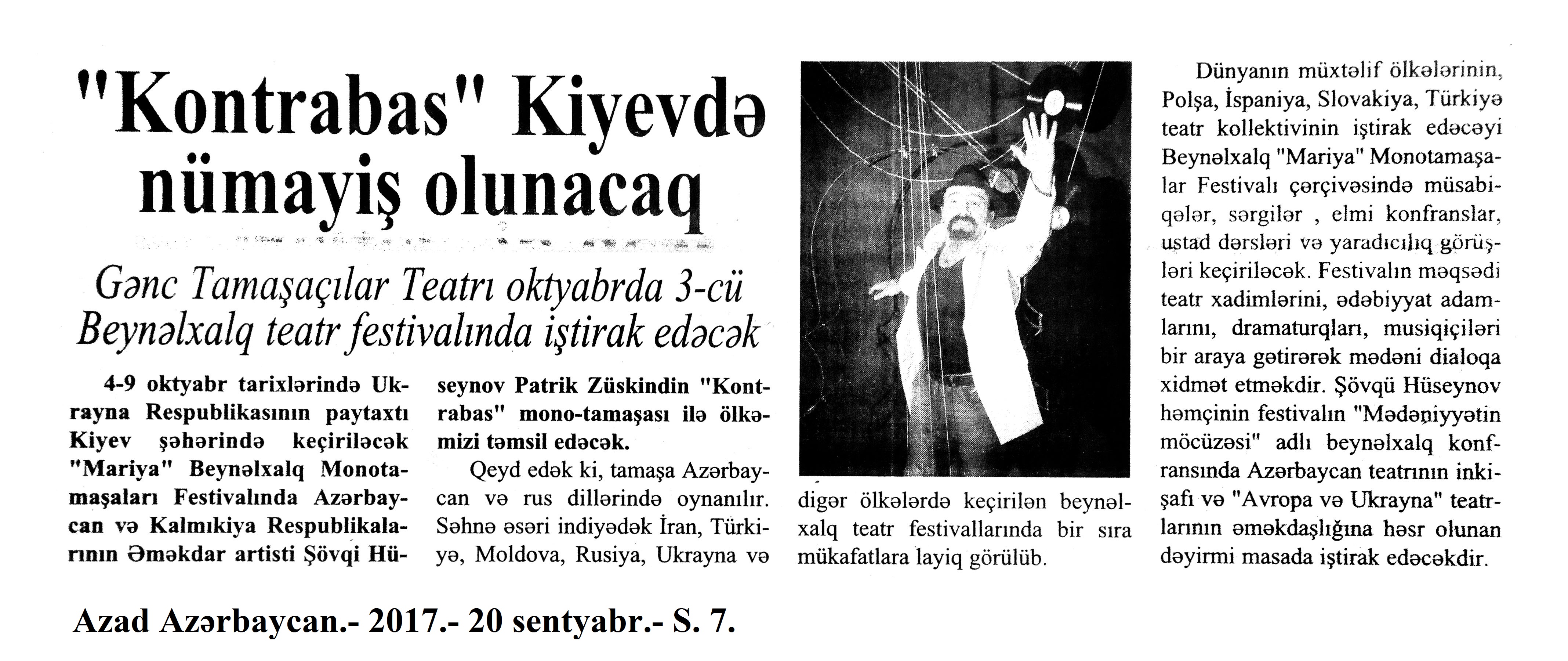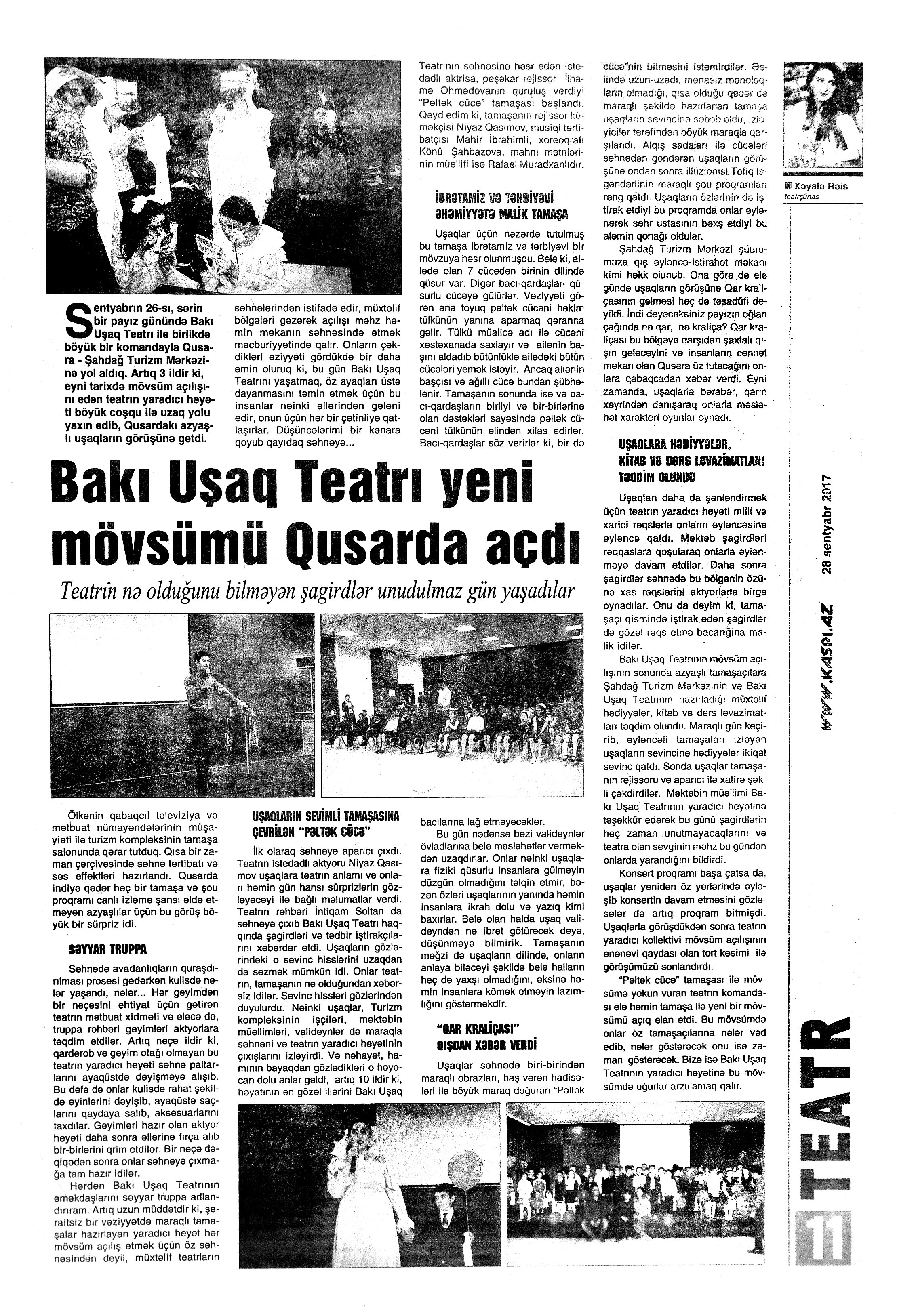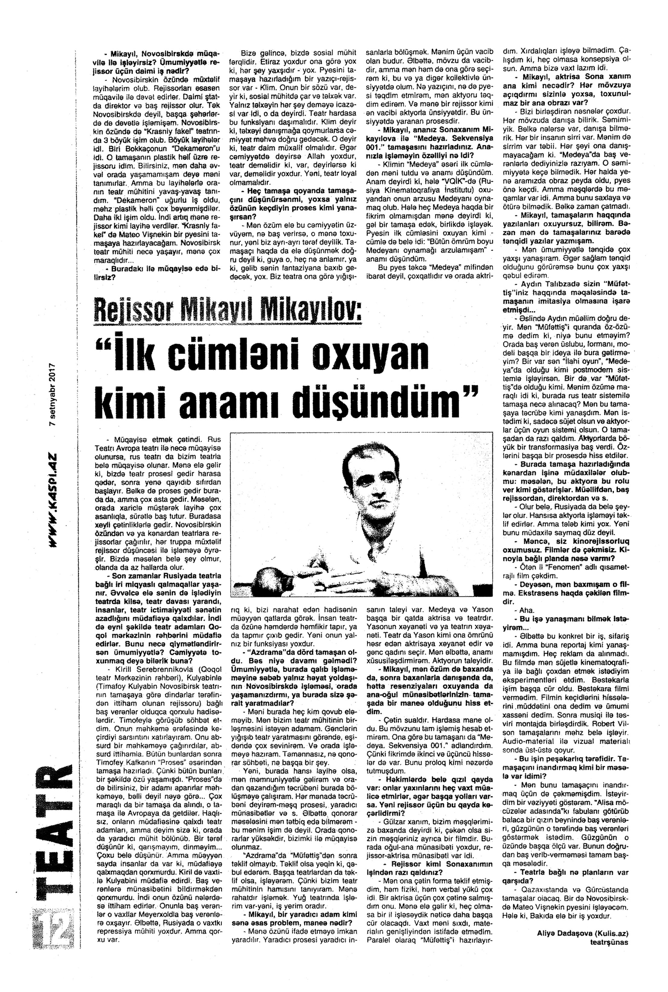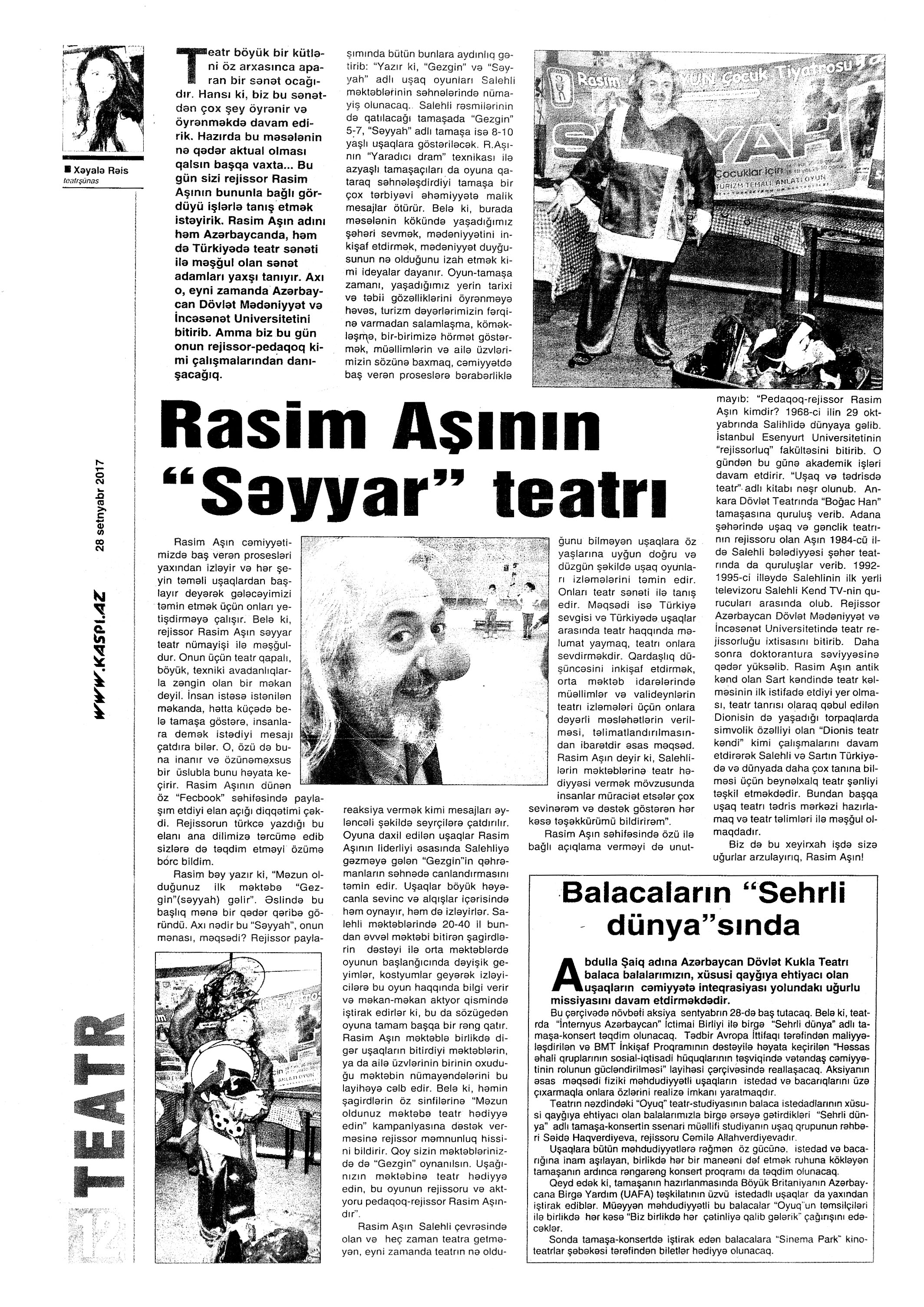 Bax: 55; 57; 70; 82; 145 Akademik Milli Dram Teatrı 325. Abbaslı, T. Fenomenal-teatral sənətkar: Hər səhnədə bir “lo” salan, özü heç vaxt gülmədən - hər vaxt hamını uğunduran Siyavuş Aslan.. //Mədəniyyət.- 2017.- 6 sentyabr.- S.13. 326. Dadaşov R. “Dözə bilmədim, içimdə çəkdim”: [Xalq artisti Rəfael Dadaşovun müsahibəsi] /müsahibəni apardı Tahirə Məmmədova //Şərq.- 2017.- 20 sentyabr.- S.13. 327. Fərəcov, S. Bir rejissorun ömür və sənət yolu: [Xalq artisti Ələsgər Şərifov haqqında] //Mədəniyyət.- 2017.- 8 sentyabr.- S.15. 328. Qurbanlı, R. “Sən əsl Azərbaycan gözəlisən”: [Xalq artisti Leyla Bədirbəyli haqqında] //Üç nöqtə.- 2017.- 6 sentyabr.- S. 12. 329. Qurbanlı, R. Həyatda hər şeyim vardı, sevdim də: [teatrın aktrisası Ağasıbəyli İradənın müsahibəsi] //Üç nöqtə.- 2017.- 27 sentyabr- S.12. 330. Milli Dram Teatrı tamaşaçıların görüşünə “Qarabağnamə” ilə gəldi: [Mərahim Fərzəlibəyovun hazırladığı eyniadlı tamaşa ilə] //Mədəniyyət.- 2017.- 27 sentyabr.- S.7. 331. Mirməmməd, G. “Mən gözəllərdə gözəl ruh araram”...: [Fatma Muxtarova, Leyla Bədirbəyli və Nəcibə Məlikova haqqında] //Mədəniyyət.- 2017.- 8 sentyabr.- S. 13. 332. Muxtar, R. Tofiq Kazımov haqqında xatirələrim //Səs.- 2017.- 21 sentyabr.- S. 13. 333. Nəsibova, R. “Seriallar aktyorları dolandırır”: [teatrın aktrisası Rada Nəsibova ilə müsahibə] /müsahibəni apardı Namiq Məmmədli //Ekspress.- 2017.- 22 sentyabr.- S.13. 334. Su, A. “Meydanda tək idim...”: [teatrın aktrisası Afət Su ilə müsahibə] /müsahibəni apardı Xəyalə Rəis //Kaspi.- 2017.- 20 sentyabr.- S.12. Azərbaycan Dövlət Gənc Tamaşaçılar Teatrı 335. Azərbaycan Dövlət Gənc Tamaşaçılar Teatrını yeni mövsümdə böyük yeniliklər gözləyir //Kaspi.- 2017.- 7 sentyabr.- S.10. 336. “Cəza” monotamaşasının premyerası: [rejissor Mehriban Ələkbərzadənin hazırladığı eyniadlı tamaşa Gənc Tamaşaçılar Teatrının səhnəsində] //Mədəniyyət.-2017.- 29 oktyabr.- S. 4. 337. Gənc Tamaşaçılar Teatrının yubiley mövsümü başlayıb: [Bəhram Osmanovun hazırladığı “Hekayəti-xırs-quldurbasan” tamaşası ilə] //Mədəniyyət.- 2017.- 27 sentyabr.- S.7. 338. “Gənc Tamaşaçılar”da yubiley mövsümü: Teatrda 90-cı mövsümlə əlaqədar iclas keçirildi //Ekspress.- 2017.- 6 sentyabr.- S.13. 339. Osmanov, B. Bəhram Osmanov: “Hazırladığım tamaşalarla fəxr etmirəm”: [teatrın baş rejissorunun müsahibəsi] //Ekspress.- 2017.- 7 sentyabr.- S.9. 340. Ötən teatr mövsümünün son akkordları...: [teatrın 89-cu mövsümə yekun vurması haqqında] //Kaspi.- 2017.- 7 sentyabr.- S.10.