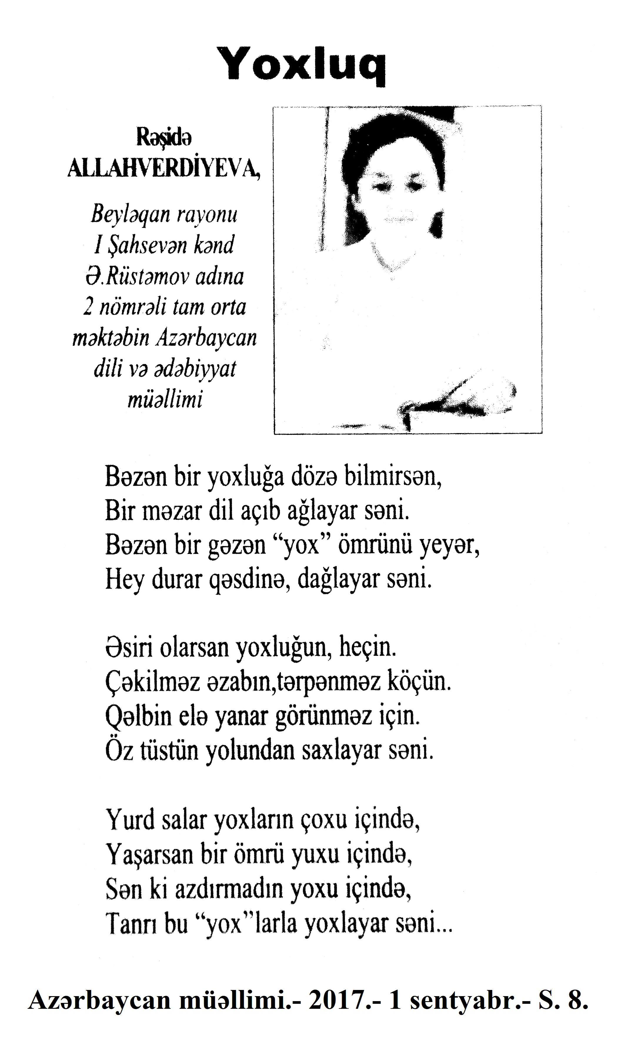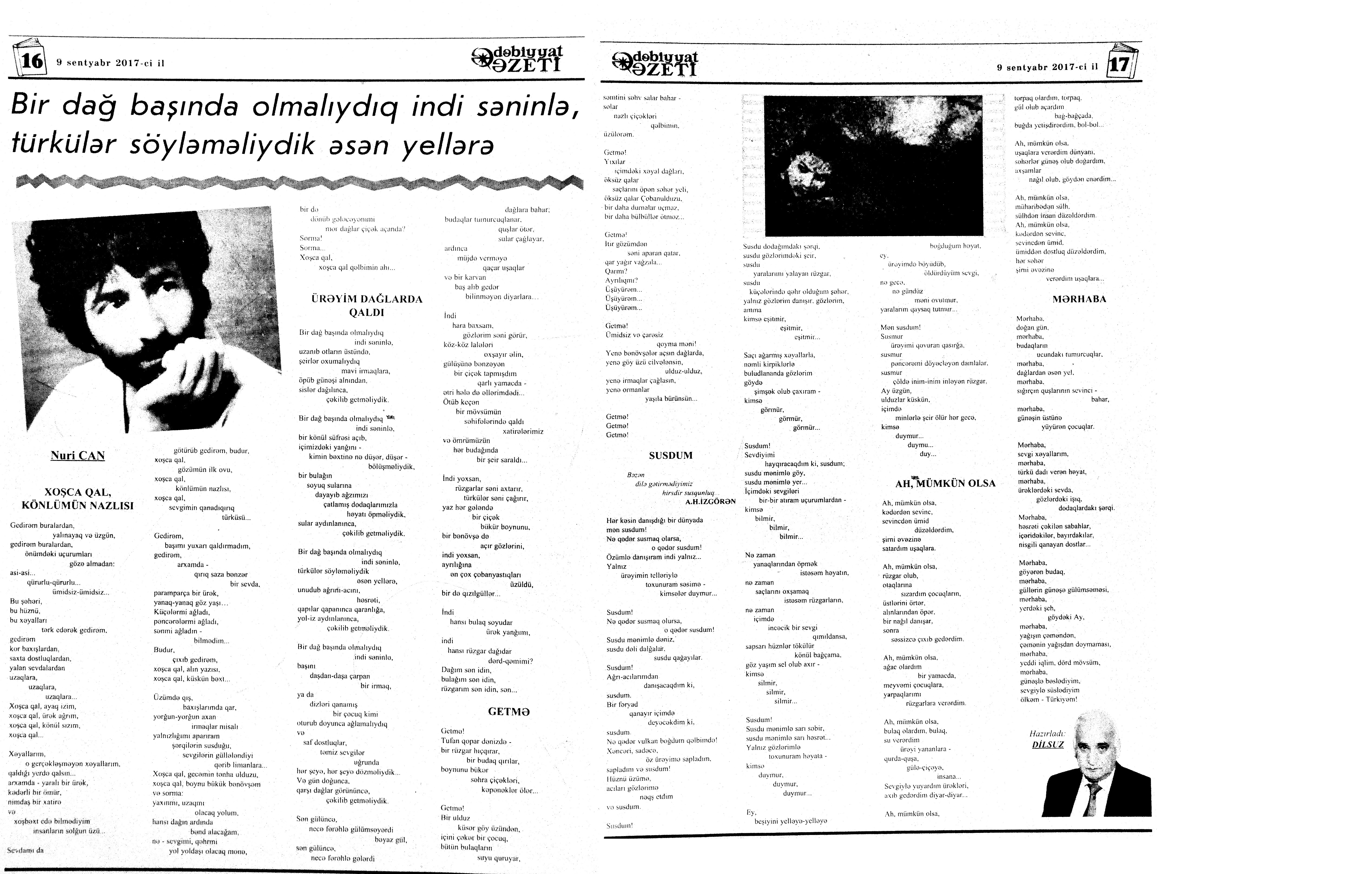 BƏDİİ ƏDƏBİYYAT VƏ ƏDƏBİYYATŞÜNASLIQ ŞEİRLƏR 381. Abdıyev, E. Bu dünya mənlik olmadı; Yarıdan; Heç kəs //Kaspi.-2017.- 30 sentyabr.- S.22. 382. Adışirin, T. Zilqara kirpiklərin //Kaspi.-2017.- 30 sentyabr.- S.23. 383. Albantürk, A. Üç dilək dua; Dörd türlü dördlük; Beş hallı bayatı; Qaçqın olmasam da //Ədalət.-2017.- 29 sentyabr.- S.7. 384. Albantürk, C. Üç dilək dua; Dörd türlü dördlük; Ələkbər Salahzadə sayağı //Ədəbiyyat qəzeti.-2017.- 30 sentyabr.- S.20. 385. Allahverdiyeva, R. Yoxluq //Azərbaycan müəllimi.-2017.- 1 sentyabr.- S.8. 386. Aytmatov, Ç. Əkinçinin nəğməsi //Kaspi.- 2017.- 23-25 oktyabr.- S.19. 387. Bahadır, Ü. Unutduqlarına...; Gecə duası; Qoxular... Qorxular //Ədəbiyyat qəzeti.-2017.-16 sentyabr.- S.3. 388. Baloğlanova, A. Son zəng //Azərbaycan müəllimi.- 2017.- 1 sentyabr.- S.8. 389. Behrudi, R. Dağlar duman olmadan //Ədəbiyyat qəzeti.-2017.- 16 sentyabr.- S.11. 390. Benice, M. Qardələn: [türk dilindən tərcümə] /tərc. etdi Dilsuz. //Ədəbiyyat qəzeti.-2017.- 23 sentyabr.- S.16-17. 391. Bilgin, A. Ərik ağacının hekayəsi; Sevda türküsü //Ədəbiyyat qəzeti.-2017.- 16 sentyabr.- S.16-17. 392. Budaq, R. Ağ yol; Behiştin gülləri solmaz //525-ci qəzet.-2017.-21 sentyabr.- S.7. 393. Can, N. Xoşca qal, könlümün Nazlısı; Ürəyim dağlarda qaldı; Getmə; Susdum; Ah, mümkün olsa; Mərhaba //Ədəbiyyat qəzeti.-2017.- 9 sentyabr.- S.16-17. 394. Cəfərli, A.Yaşadacaq dünya səni; Toz qonub sözüm üstə; Həsrət, yerin gor olsun //525-ci qəzet.-2017.-21 sentyabr.- S.7. 395. Cumalı, N.Şeir yazmaq; Günəş dələsi; Yalnızlıq; Şərqi; Yayın işıq seli //Ədəbiyyat qəzeti.-2017.- 30 sentyabr.- S.12-13. 396. Çapan, C.Quş baxışı: [türk dilindən tərcümə] /tərc. etdi Dilsuz. //Ədəbiyyat qəzeti.-2017.- 23 sentyabr.- S.17. 397. Çələbi, A. Şəfqət: [türk dilindən tərcümə] /tərc. etdi Dilsuz. //Ədəbiyyat qəzeti.-2017.- 23 sentyabr.- S.16. 398. Dadaş, G. Ötdü aramızdan bir cüt qağayı //Kaspi.-2017.- 9 sentyabr.- S.21. 399. Dəmiroğlu, A. Qarmaqarışıq //Ədəbiyyat qəzeti.-2017.- 16 sentyabr.- S.17. 400. Ediboğlu, B. Qaranlıqda keçən gəmilər //Ədəbiyyat qəzeti.-2017.- 16 sentyabr.- S.17. 401. Eyyubova, M. Payız //Azərbaycan müəllimi.-2017.-29 sentyabr.- S.14. 402. Eyvazlı, G. Araxna - Hörümçək qadın //Ədəbiyyat qəzeti.-2017.- 9 sentyabr.- S.19. 403. Əfəndi, A. Həyat qanadlarını çırpır; Kütlə; Reallıqla toqquşan həyat; Zaman içində tək və s. //Ədəbiyyat qəzeti.-2017.- 30 sentyabr.- S.9. 404. Ərdəm, K. Bu, eşqdir: [türk dilindən tərcümə] /tərc. etdi Dilsuz. //Ədəbiyyat qəzeti.-2017.- 23 sentyabr.- S.17. 405. Ərəbsoy, Y. Böyümədi //Ədəbiyyat qəzeti.-2017.- 30 sentyabr.- S.9. 406. Əroğlu, M. Haydı, oyan: [türk dilindən tərcümə] /tərc. etdi Dilsuz. //Ədəbiyyat qəzeti.-2017.- 23 sentyabr.- S.17. 407. Əsəd, F. Ümid ver, Ümid mənə; Körpətək üzümə gülür //525-ci qəzet.-2017.-21 sentyabr.- S.7. 408. Fərrux, A. Arzum; Yəhərləyin Bozatları; Fani dünya //Azərbaycan müəllimi.-2017.-29 sentyabr.- S.14. 409. Fikrət, A. İntihar; Gec; Qadın; Vətəndir; Yorulur və s. //Kaspi.-2017.- 23-25 sentyabr.- S.17. 410. Həsənli, A. Rəşadətin yaşıdı: Azərbaycanın Milli Qəhrəmanı, polkovnik-leytenant Şirin Mirzəyevin doğum günü münasibətilə müqəddəs ruhuna bağışlayıram //525-ci qəzet.-2017.- 6 sentyabr.- S.8. 411. Həsənli, A. Mübarək //525-ci qəzet.-2017.-21 sentyabr.- S.7. 412. Həsrət, Ə. Sinəmin dağında dumana düşər; Ayrılaq; Divanə duruşu var zirvələrin; Şeirlə aldatmaq olmur qızları; və s. //Kaspi.-2017.- 9 sentyabr.- S.21. 413. Hümmət, R. Çobanın arvadı; Tiflisdə yay yağmuru; Həsrət; ...Sənə nə, adam...; Sükranlıq və s. //Ədəbiyyat qəzeti.-2017.- 23 sentyabr.- S.3. 414. İsaq, İ. Mümkünsə... ; Təbəssüm yayı; Sağlam hava; Antiəxlaq vəs. //Ədəbiyyat qəzeti.-2017.- 16 sentyabr.- S.27. 415. İsgəndərzadə, E. Düşüncələr; Bəyaz mələyin gecə duası; Ömür; Təklik və.s. //525-ci qəzet.-2017.-16 sentyabr.- S.23. 416. İsgəndərzadə, E. Qəbirlə çiçək arası; Düşüncələr; Bəyaz mələyin gecə duası; Qürbət hücrəsində və s. //Kaspi.-2017.- 16 sentyabr.- S. 18. 417. İsgəndərzadə, E. Yuxu; Qəbirlə çiçək arası; Qürbət hücrəsində; Tüfəng qundağına yazılmış şeir və s. //Ədəbiyyat qəzeti.-2017.-16 sentyabr.- S.7. 418. İsmayıl, R. Məhəbbətdən danışaq; Neynirəm; İtən ildən danışaq; Vurulmuşam bu kəndə //Ədalət.-2017.- 29 sentyabr.- S.7. 419. İsrafiloğlu, E. Axtarıram; Sevgi qatili //525-ci qəzet.-2017.-21 sentyabr.- S.7. 420. İzgörən, A. Susqun; Uzaq; Qanayan yara //Ədəbiyyat qəzeti.-2017.- 16 sentyabr.- S.16. 421. Göyçəli, M. Oxu, Elnarə, oxu //Ədalət.-2017.- 30 sentyabr.- S.10. 422. Kiçik İ. De, gülüm; Necə istəmişdinsə...; Asan deyil , Əlbəttə: [türk dilindən tərcümə] /tərc. etdi Dilsuz. //Ədəbiyyat qəzeti.-2017.- 23 sentyabr.- S.17. 423. Qəhrəman, İ. Sevgi; Mərmiyəcən yaşamaq; Anamın sevgisi; Atam toya gedəndə //Ədəbiyyat qəzeti.-2017.- 30 sentyabr.- S.22. 424. Qoca, F. Hələ gec deyil //Azərbaycan.-2017.- 13 sentyabr.- S.8; Ədəbiyyat qəzeti.-2017.- 16 sentyabr.- S.8. 425. Qoca, F. Şəki; Oxud kəndi; Haqq axtarana; Bayraq meydanı; Cocuq Mərcanlıya məhəbbət qayıdır //Ədəbiyyat qəzeti.-2017.- 9 sentyabr.- S.10. 426. Qocayev, M. “İnsan insanı başa düşsə, müharibə olmaz”: Kamran Əliyev: “Dünya romantizmi Azərbaycanda başa çatıb”: [professor Məmməd Qocayevlə müsahibə] /müsahibəni apardı: Fərid Hüseyn; C.Seyidzadə; A.Kərimova //Kaspi.-2017.- 30 sentyabr.- S.12-13. 427. Qorxmaz, A. Sevdim //Ədəbiyyat qəzeti.-2017.- 16 sentyabr.- S.17. 428. Lorka, F. Sevindirici haldır //Kaspi.-2017.- 30 sentyabr.- S.22.