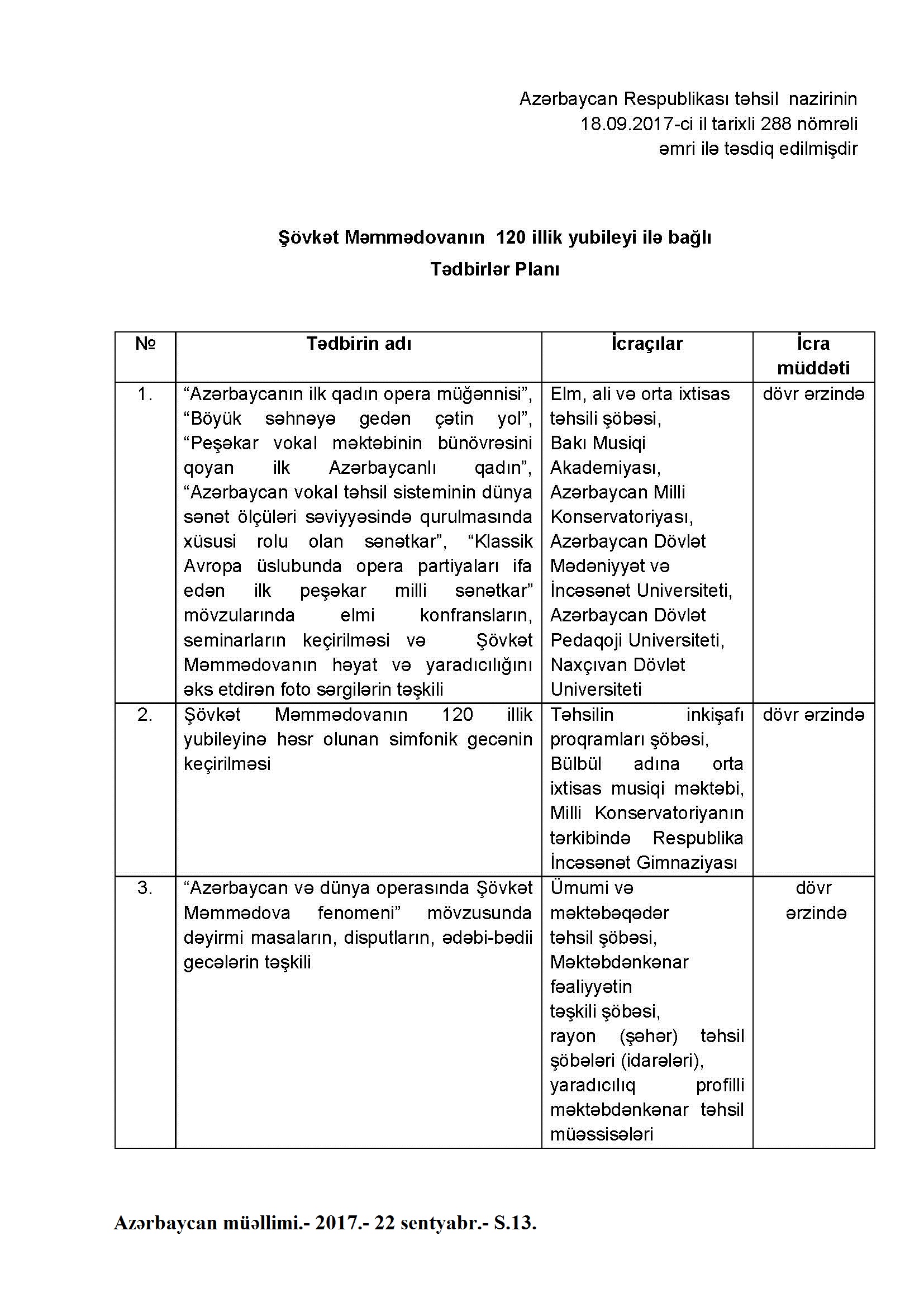MƏDƏNİYYƏT Mədəniyyət, incəsənət və turizm haqqında rəhbər materiallar 1. A.H.Bayramovanın “Tərəqqi” medalı ilə təltif edilməsi haqqında: Azərbaycan Respublikası Prezidentinin Sərəncamı, 26 sentyabr 2017-ci il: [musiqi mədəniyyətinin təbliğindəki səmərəli fəaliyyətinə görə] //Azərbaycan.- 2017.-27 sentyabr.- S.2. 2. Azərbaycan Xalça Muzeyinin əməkdaşlarına fəxri adların verilməsi haqqında: Azərbaycan Respublikası Prezidentinin Sərəncamı, 27 sentyabr 2017-ci il: [xalça sənətinin təbliğindəki səmərəli fəaliyyətlərinə görə] //Azərbaycan.- 2017.-28 sentyabr.- S.2. 3. Azərbaycan Xalça Muzeyinin əməkdaşlarının “Azərbaycan Respublikası Prezidentinin fəxri diplomu” ilə təltif edilməsi haqqında: Azərbaycan Respublikası Prezidentinin Sərəncamı, 27 sentyabr 2017-ci il: [xalça sənətinin təbliğindəki səmərəli fəaliyyətlərinə görə] //Azərbaycan.- 2017.- 28 sentyabr.- S.2. 4. Azərbaycan Xalça Muzeyinin əməkdaşlarının “Tərəqqi” medalı ilə təltif edilməsi haqqında: Azərbaycan Respublikası Prezidentinin Sərəncamı, 27sentyabr 2017-ci il: [xalça sənətinin təbliğindəki səmərəli fəaliyyətlərinə görə] //Azərbaycan.- 2017.-28 sentyabr.- S.2. 5. Azərbaycan Milli İncəsənət Muzeyinin əməkdaşlarına “Əməkdar mədəniyyət işçisi” fəxri adının verilməsi haqqında: Azərbaycan Respublikası Prezidentinin Sərəncamı, 27 sentyabr 2017-ci il: [muzey işinin inkişafı və mədəni irsin təbliğindəki səmərəli fəaliyyətlərinə görə] //Azərbaycan.- 2017.- 28 sentyabr.- S.2. 6. Azərbaycan Musiqi Mədəniyyəti Dövlət Muzeyinin əməkdaşlarına “Əməkdar artist” fəxri adının verilməsi haqqında: Azərbaycan Respublikası Prezidentinin Sərəncamı, 26 sentyabr 2017-ci il: [Azərbaycanın musiqi irsinin təbliğindəki səmərəli fəaliyyətlərinə görə] //Azərbaycan.- 2017.- 27 sentyabr.- S.2. 7. Azərbaycan Respublikasında turizmin inkişafında xidmətləri olan şəxslərin təltif edilməsi haqqında: Azərbaycan Respublikası Prezidentinin Sərəncamı, 26 sentyabr 2017-ci il//Azərbaycan.- 2017.-27 sentyabr.- S.2. 8. Azərbaycan Respublikasının mədəniyyət xadimlərinə fəxri adların verilməsi haqqında: Azərbaycan Respublikası Prezidentinin Sərəncamı, 15 sentyabr: [Azərbaycan musiqi mədəniyyətinin inkişafındakı xidmətlərinə görə] //Azərbaycan.- 2017.-16 sentyabr.- S.3. 9. 2017-ci il oktyabrın 15-dən noyabrın 15-dək Bakı şəhərində keçiriləcək ticarət festivalı (“shopping festival”) ilə bağlı əlavə tədbirlər haqqında: Azərbaycan Respublikası Prezidentinin Sərəncamı, 28 sentyabr 2017-ci il: [turizm potensialından istifadə imkanlarının genişləndirilməsi münasibətilə] //Azərbaycan.- 2017.-29 sentyabr.- S.2. 10. İ.D.Kobzonun “Azərbaycan Respublikası Prezidentinin fəxri diplomu” ilə təltif edilməsi haqqında: Azərbaycan Respublikası Prezidentinin Sərəncamı, 9 sentyabr 2017-ci il: [Rusiya Federasiyası ilə Azərbaycan Respublikası arasında mədəni əlaqələrin inkişafındakı böyük xidmətlərinə görə] //Azərbaycan.-2017.-10 sentyabr.- S.1. 11. İ.İ.Mədətovun Azərbaycan Turizm və Menecment Universitetinin rektoru təyin edilməsi haqqında: Azərbaycan Respublikası Prezidentinin Sərəncamı, 11 sentyabr 2017-ci il //Azərbaycan.- 2017.-12 sentyabr.- S.4. 12. M.H.Ağayevin “Dostluq” ordeni ilə təltif edilməsi haqqında: Azərbaycan Respublikası Prezidentinin Sərəncamı, 7 sentyabr 2017-ci il: [Rusiya Federasiyası ilə Azərbaycan Respublikası arasında mədəni əlaqələrin möhkəmləndirilməsindəki xidmətlərinə görə] //Azərbaycan.- 2017.-8 sentyabr.- S.2. 13. M.V.Ocaqova Azərbaycan Respublikası Prezidentinin fərdi təqaüdünün verilməsi haqqında: Azərbaycan Respublikası Prezidentinin Sərəncamı, 15 sentyabr: [Azərbaycanda musiqi sahəsindəki uzunmüddətli səmərəli fəaliyyətinə görə] //Azərbaycan.- 2017.-16 sentyabr.- S.3. 14. T.Q.İsgəndərovanın “Tərəqqi” medalı ilə təltif edilməsi haqqında: [mədəni irsin təbliğindəki səmərəli fəaliyyətinə görə]: Azərbaycan Respublikası Prezidentinin Sərəncamı, 27 sentyabr 2017-ci il //Azərbaycan.- 2017.-28 sentyabr.- S.2. 15. Şəki rayonunun Kiş kəndində abadlıq-quruculuq işləri aparılmasına dair tədbirlər haqqında: Azərbaycan Respublikası Prezidentinin Sərəncamı, 27: [turizm potensialından istifadə imkanlarının genişləndirilməsi məqsədilə] //Azərbaycan.- 2017.-28 sentyabr.- S.2. __________ 16. Cabbarov, M. Şövkət Məmmədovanın 120 illik yubileyi haqqında: Azərbaycan Respublikası Təhsil nazirinin əmri; 18 sentyabr 2017-ci il //Azərbaycan müəllimi.- 2017.- 22 sentyabr.- S.13. __________ 17. Şövkət Məmmədovanın 120 illik yubileyi ilə bağlı Tədbirlər Planı: Azərbaycan Respublikası Təhsil nazirinin 18 sentyabr 2017-ci il tarixli 288 nömrəli əmri ilə təsdiq edilib //Azərbaycan müəllimi.- 2017.- 22 sentyabr.- S.13. __________ 18. Ağalarov, V. Naxçıvan – İslam mədəniyyətinin paytaxtı //Xalq qəzeti.- 2017.- 17 sentyabr.- S.5. 19. Avropa İttifaqına üzv ölkələrin səfirlikləri Şəki şəhəri ilə əlaqələrin daha da genişləndirilməsində maraqlıdır: [quruma üzv ölkələrin Azərbaycanda fəaliyyət göstərən səfirlərinin Şəki şəhər rəhbərləri ilə görüşü haqqında] //Azərbaycan.- 2017.- 24 sentyabr.- S. 4. 20. Azərbaycan Heydər Əliyev Fondunun dəstəyi ilə Beynəlxalq Memarlar İttifaqının konqresində təmsil olunub //Azərbaycan.- 2017.- 13 sentyabr.- S.4. 21. Azərbaycan mədəni və dini rəngarəngliyə əsaslanan, ayrı-seçkiliyin mövcud olmadığı cəmiyyətin yaradılmasına parlaq nümunədir: [Xarici İşlər naziri Elmar Məmmədyarov İslam Əməkdaşlıq Təşkilatına üzv dövlətlərin X