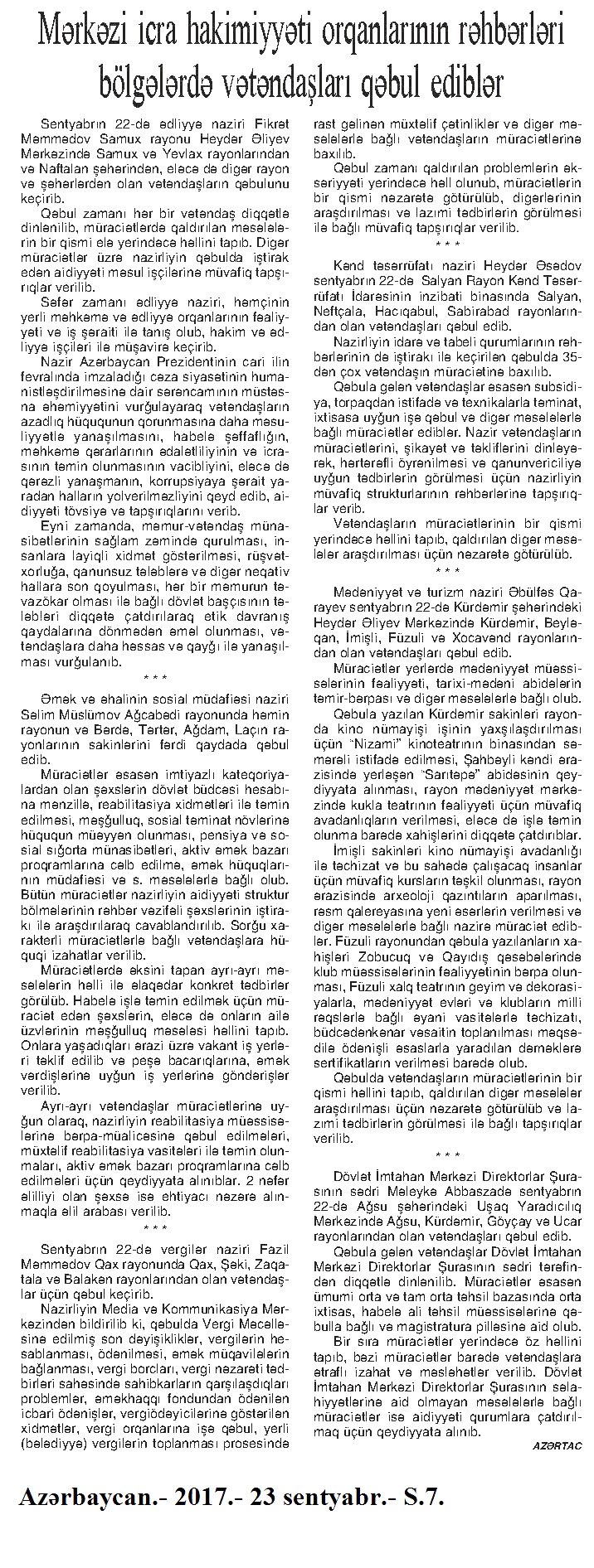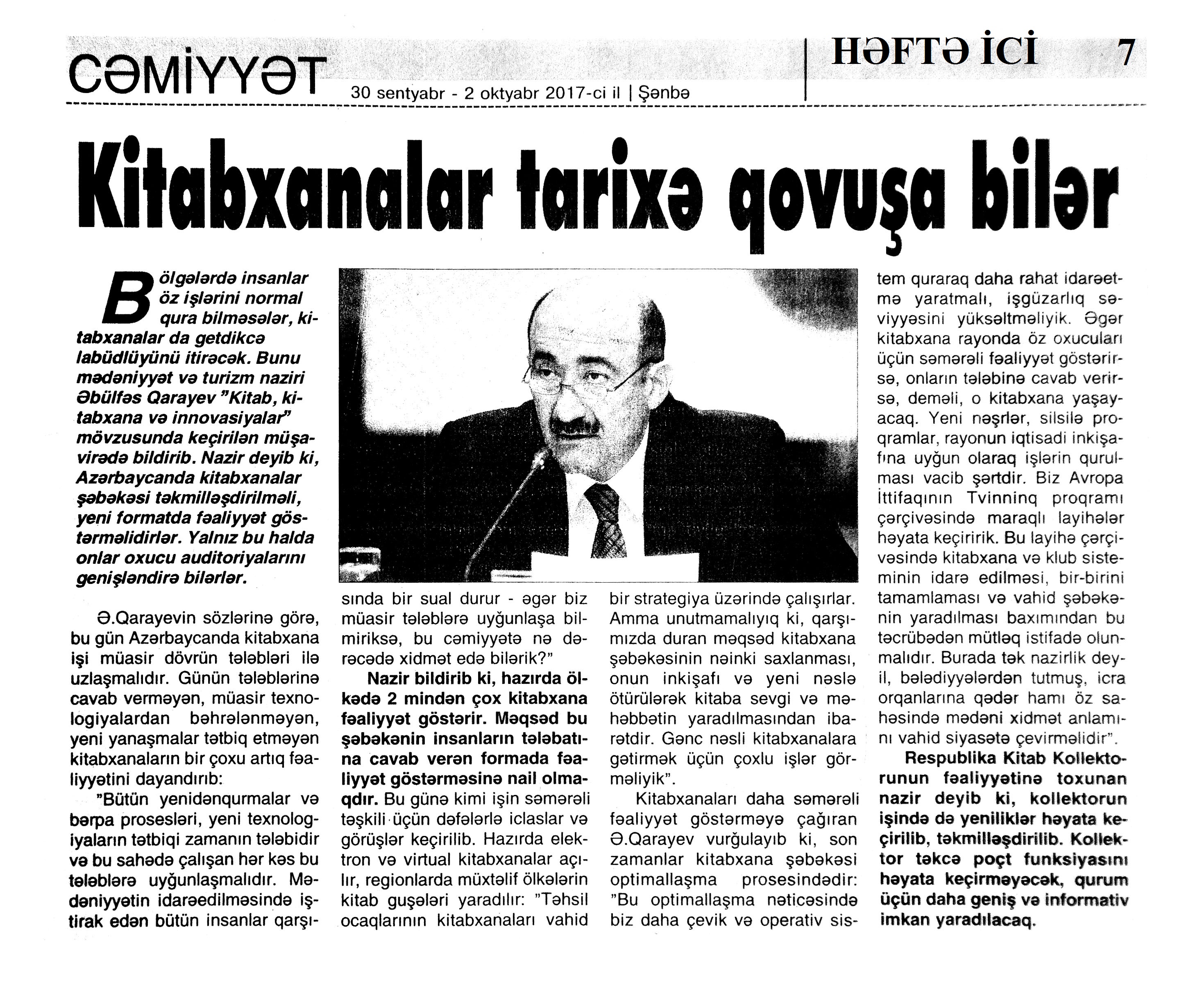 KİTABXANA İŞİ 113. Aydın, X. Ədəbi gəncliyin əsərləri tapılmayan kitabxana: [Zaqatala Mərkəzi Kitabxanasının fəaliyyəti haqqında] //Kaspi.- 2017.- 9 sentyabr.- S.17. 114. Aydın, X. Kitab bayramı //Kaspi.- 2017.- 30 sentyabr.- S.16-17. 115. Aydın, X. Oxuyan var...: Balakən Rayon Mərkəzi Kitabxanasından reportaj //Kaspi.- 2017.- 23-25 sentyabr.- S.24. 116. Azərbaycan Kitabxanaçılarının Respublika Müşavirəsinin qətnaməsi: [M. F. Axundov adına Azərbaycan Milli Kitabxanasında] //Respublika.- 2017.- 29 sentyabr.- S. 3. 117. Azəri, L. Ölkəmiz Moskvada kitab sərgi-yarmarkasında təmsil olunur //Mədəniyyət.- 2017.- 8 sentyabr.- S.5. 118. Balacalar üçün səyyar kitabxana xidməti: [Qusar Rayon Mərkəzi Kitabxanasının Uşaq şöbəsi tərəfindən səyyar kitabxana xidmətinin təşkil edilməsi haqqında] //Mədəniyyət.- 2017.- 1 sentyabr.- S.6. 119. Hüseynov, F. Mütaliə həvəskarlarının yeni ünvanı: Paytaxtın Nizami rayonundakı Heydər Əliyev parkında məktəblilər üçün kitab sərgi-yarmarkası təşkil olunub //Mədəniyyət.- 2017.- 13 sentyabr.- S. 3. 120. “Kitab sənəti” müsabiqəsinin diplomları təqdim olunub: [Moskvada keçirilən MDB ölkələri XIV Beynəlxalq “Kitab sənəti” müsabiqəsində Azərbaycan nümayəndə heyətinin iştirak etməsi haqqında] //Mədəniyyət.- 2017.- 20 sentyabr.- S. 12. 121. Kitabxanalar tarixə qovuşa bilər: [Mədəniyyət və Turizm naziri Əbülfəs Qarayev “Kitab, kitabxana və innovasiyalar” mövzusunda keçirilən müşavirədə çıxış edib] //Həftə içi.- 2017.- 30 sentyabr - 2 oktyabr.- S.7. 122. Mükərrəmoğlu, M. Azərbaycan və Belarus milli kitabxanaları arasında saziş imzalanmışdır: [Azərbaycandan Milli Kitabxananın direktoru, professor Kərim Tahirov da tədbirlərdə iştirak etmişdir] //Xalq qəzeti.- 2017.- 19 sentyabr.- S.7. 123. Sarıyeva, İ. Kitabxanalarımızda uşaq ədəbiyyatı qıtlığı?...: [F.Köçərli adına Respublika Uşaq Kitabxanasının əməkdaşı Kəmalə Qəzənfərlinin söylədiklərı] //Bakı xəbər.- 2017.- 2017.-22 sentyabr.- S.15.