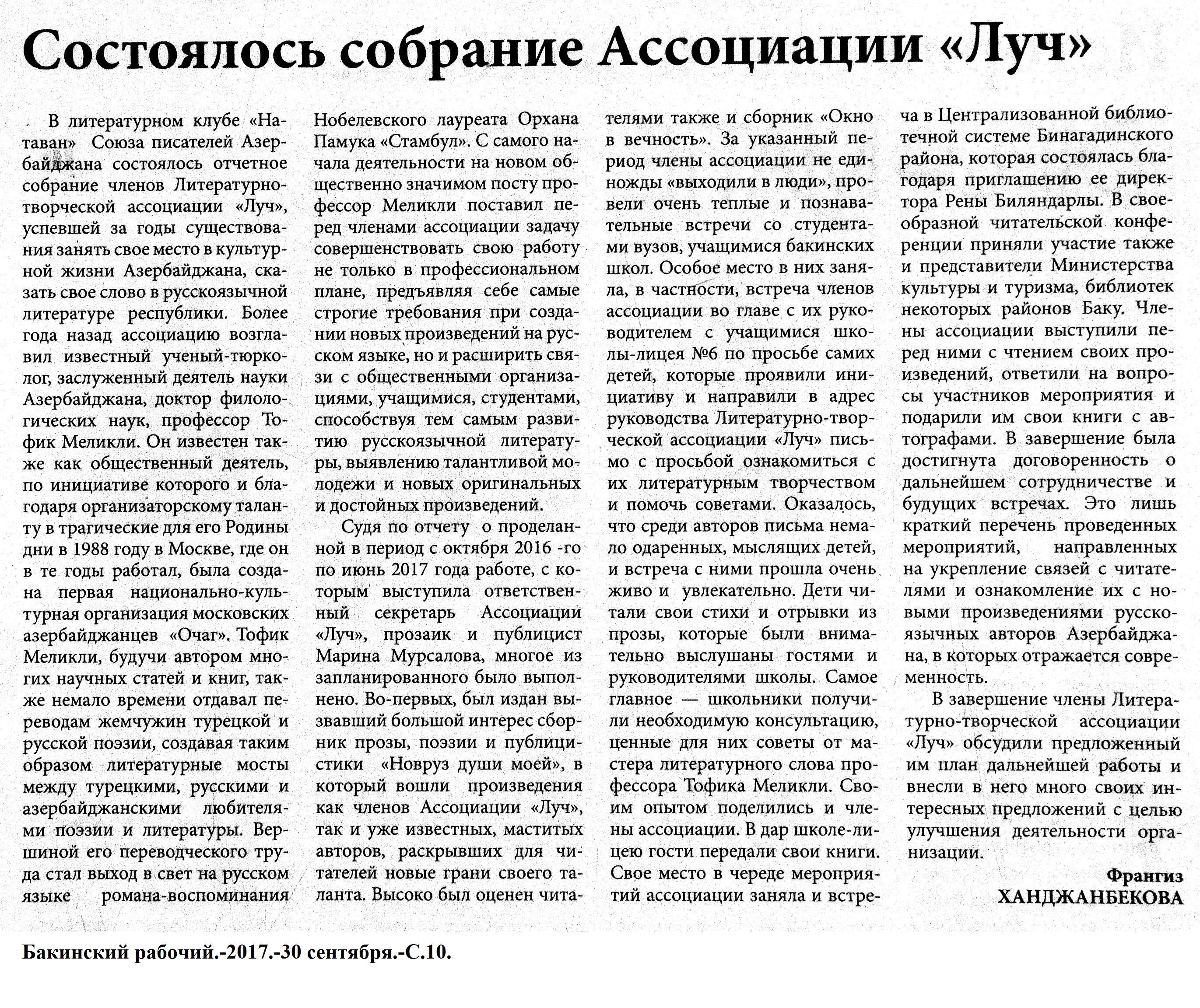 ЛИТЕРАТУРОВЕДЕНИЕ И ЛИТЕРАТУРНАЯ КРИТИКА 842. Амирли, А. Писатель, поющий свою песнь: К 70-летию Мустафы Чеменли //Каспiй.- 2017.- 9 сентября.- С. 20. 843. В Центре мугама пройдет вечер газелей Мамедали Саиля //Ежедневные новости.- 2017.- 22 сентября.- С. 10. 844. Вышли в свет мемуары Джейхуна Гаджибейли //Бакинский рабочий.-2017.- 1 сентября.- С. 2. 845. Манафов, Р. «Красные воспоминания»: Вчера в Ичери шехер в галерее Art Tower состоялась презентация книги Али Дамирзаде //Эхо.-2017.- 13 сентября.- С. 8. 846. Орхан, Р. «Клятва» – книга об истинной любви и патриотизме: [об одноименном романе писателя Сулеймана Гусейнова] //Вышка.-2017.- 1 сентября.- С. 11. 847. Османоглу, М. Литература пестует читателя: Мети Османоглу: Я приветствую тех, кто берет в руки книгу и рекламирует ее /беседу с писателем провел Дж.Сейидзаде //Каспiй.- 2017.- 23 сентября.- С. 17-18. 848. Ханджанбекова, Ф. Состоялось собрание Ассоциации «Луч»: [посвященное творчеству Тофика Меликли] //Бакинский рабочий.- 2017.- 30 сентября.- С. 10. 849. Хохлова, Л. Мир литературы Ляман Багировой: [о творческой деятельности писателя] //Мир литературы.-2017.- №7(121) сентябрь.- С. 7.