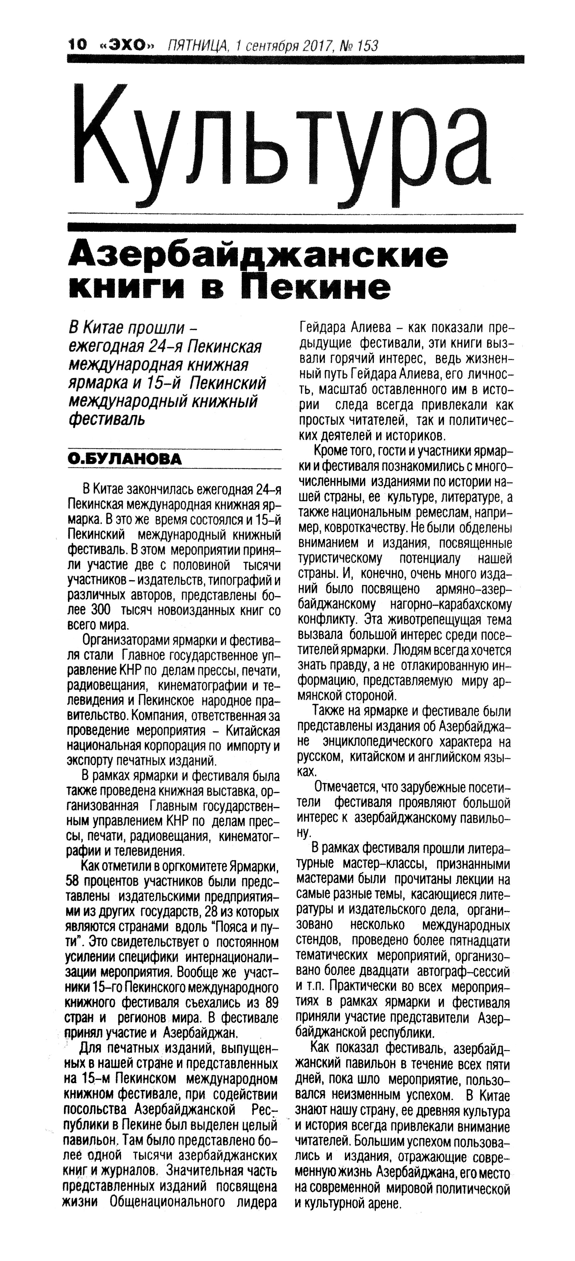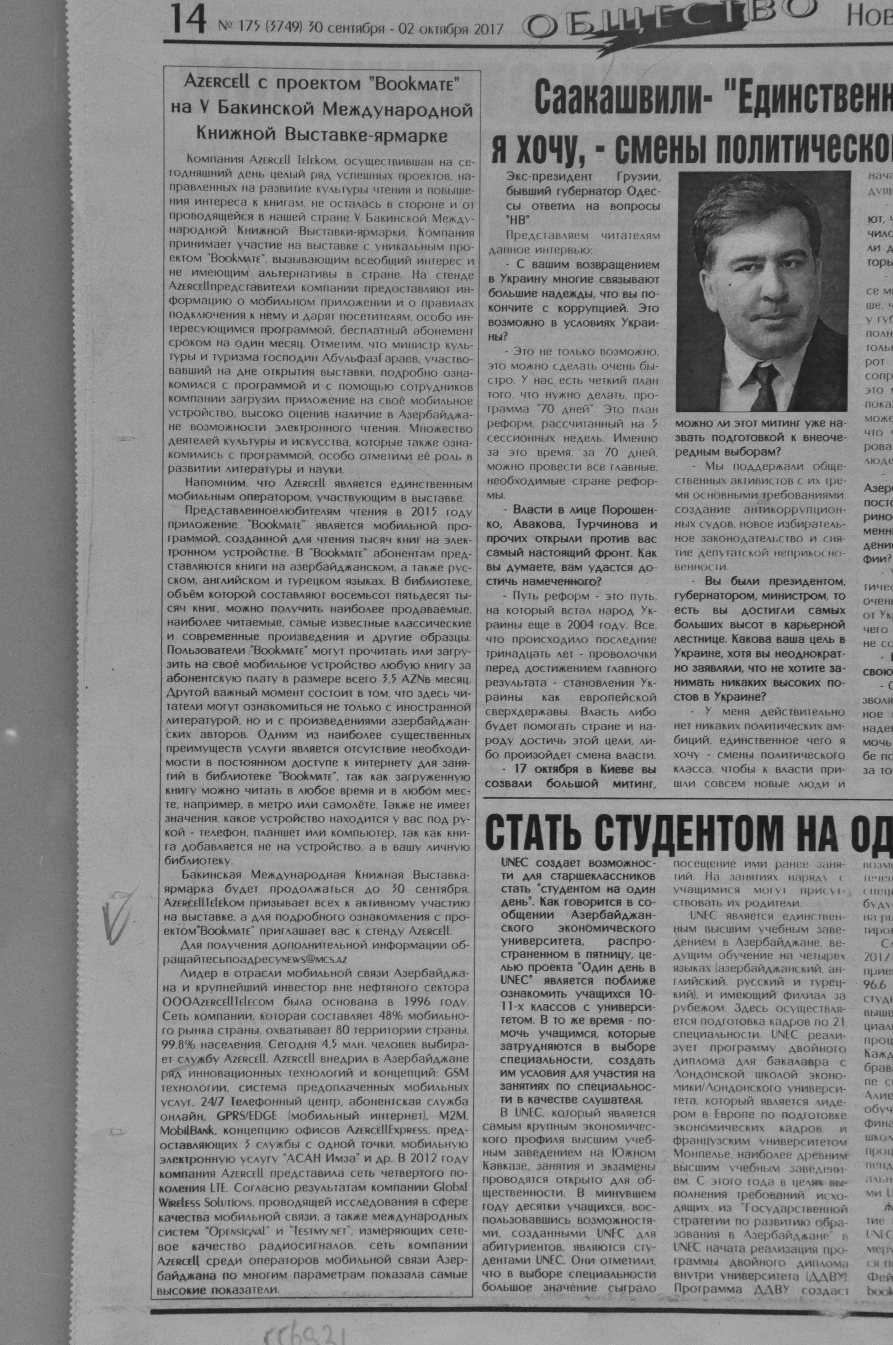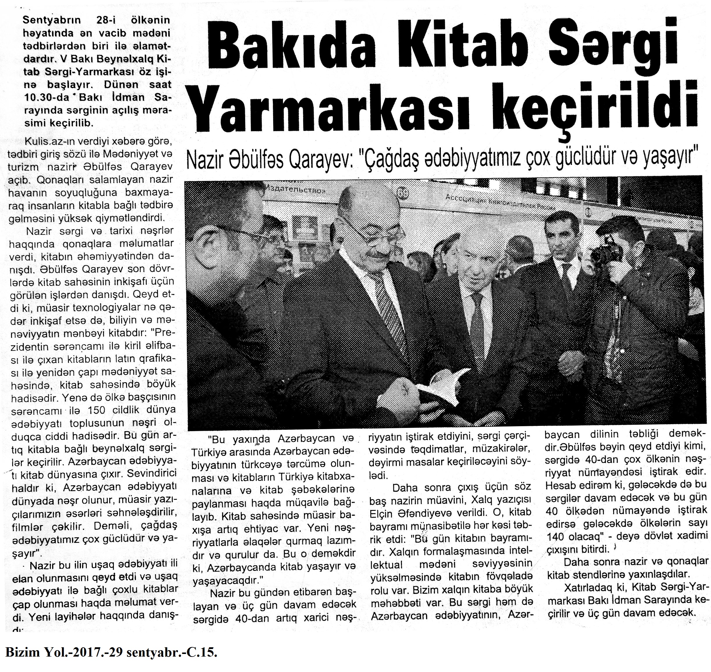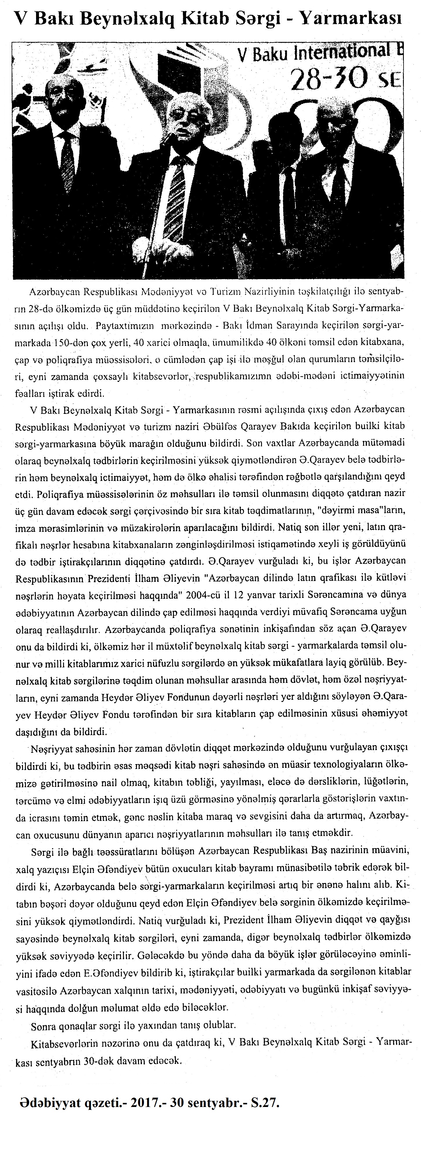 V Международная книжная выставка-ярмарка 689. Azercell с проектом «Bookmate» на V Бакинский Международной книжной выставке-ярмарке //Новое время.- 2017.- 30 сентября-2 октября.- С.14. 690. В Баку стартует книжная ярмарка //Эхо.- 2017.- 28 сентября.- С.8. 691. Гусейнзаде, Р. Праздник книги: Пропагандируя азербайджанскую литературу //Каспiй.- 2017.- 29 сентября.- С.13. 692. Кязимова, С. Праздник тех, кто любит читать: V Международная книжная выставка-ярмарка собрала представителей 150 издательств из 40 стран //Азербайджанские известия.- 2017.- 30 сентября.- С.3.