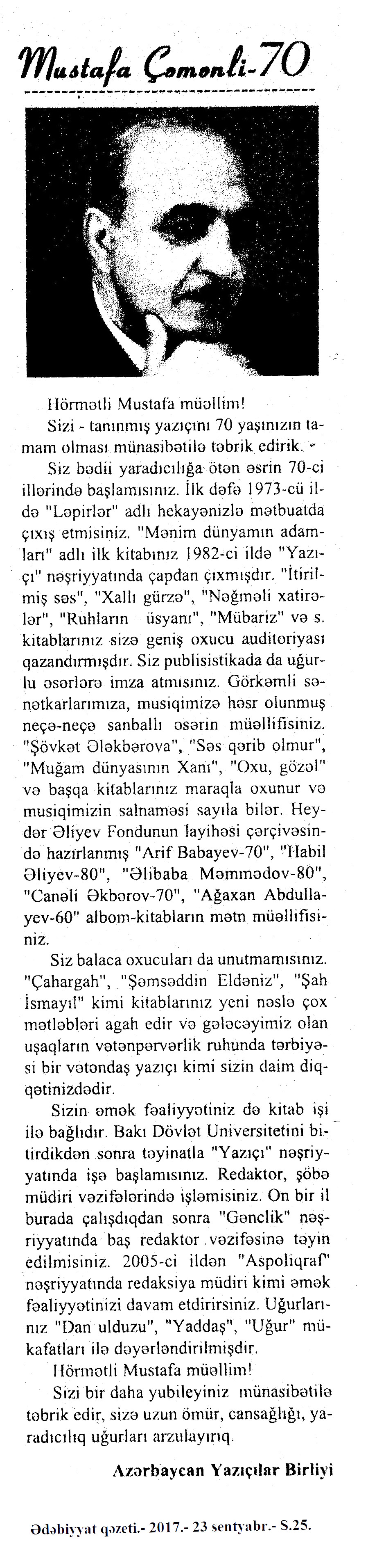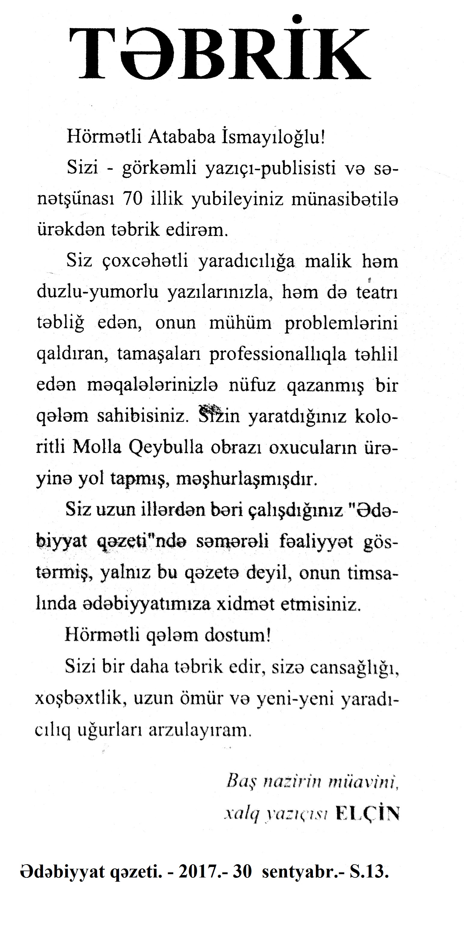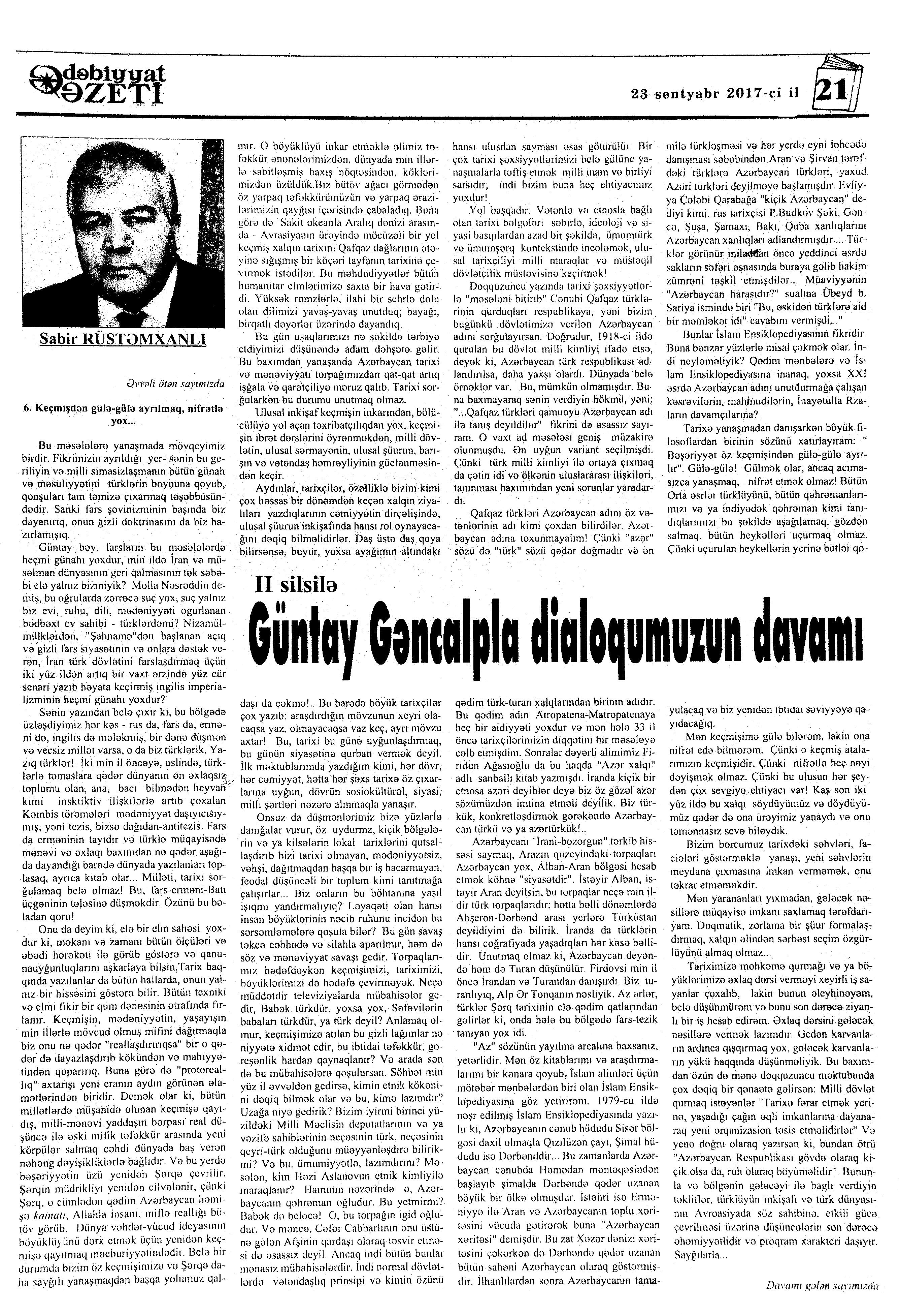 ESSELƏR 456. Çapli, Ç. Qızıma məktub: [ingilis dilindən tərcümə] /tərc. etdi Elcan Salmanqızı //Kaspi.-2017.- 30 sentyabr.- S.21. 457. Hidayət. Ceviz ağacı //525-ci qəzet.-2017.- 1 sentyabr.- S.15. 458. Hidayət. İntellektimizin Ağamusa Axundov abidəsi //525-ci qəzet.-2017.- 1 sentyabr.- S.14. 459. İsmayıl, M. Bəxtsiz arzuların zoğalı rəngi //Ədəbiyyat qəzeti.-2017.- 9 sentyabr.- S.20. 460. Qasımoğlu, N. Bu Arəstə xanım Şahsuvarqızıdır, rəhmətlik nənəm //Ədəbiyyat qəzeti.-2017.- 9 sentyabr.- S.22-23.