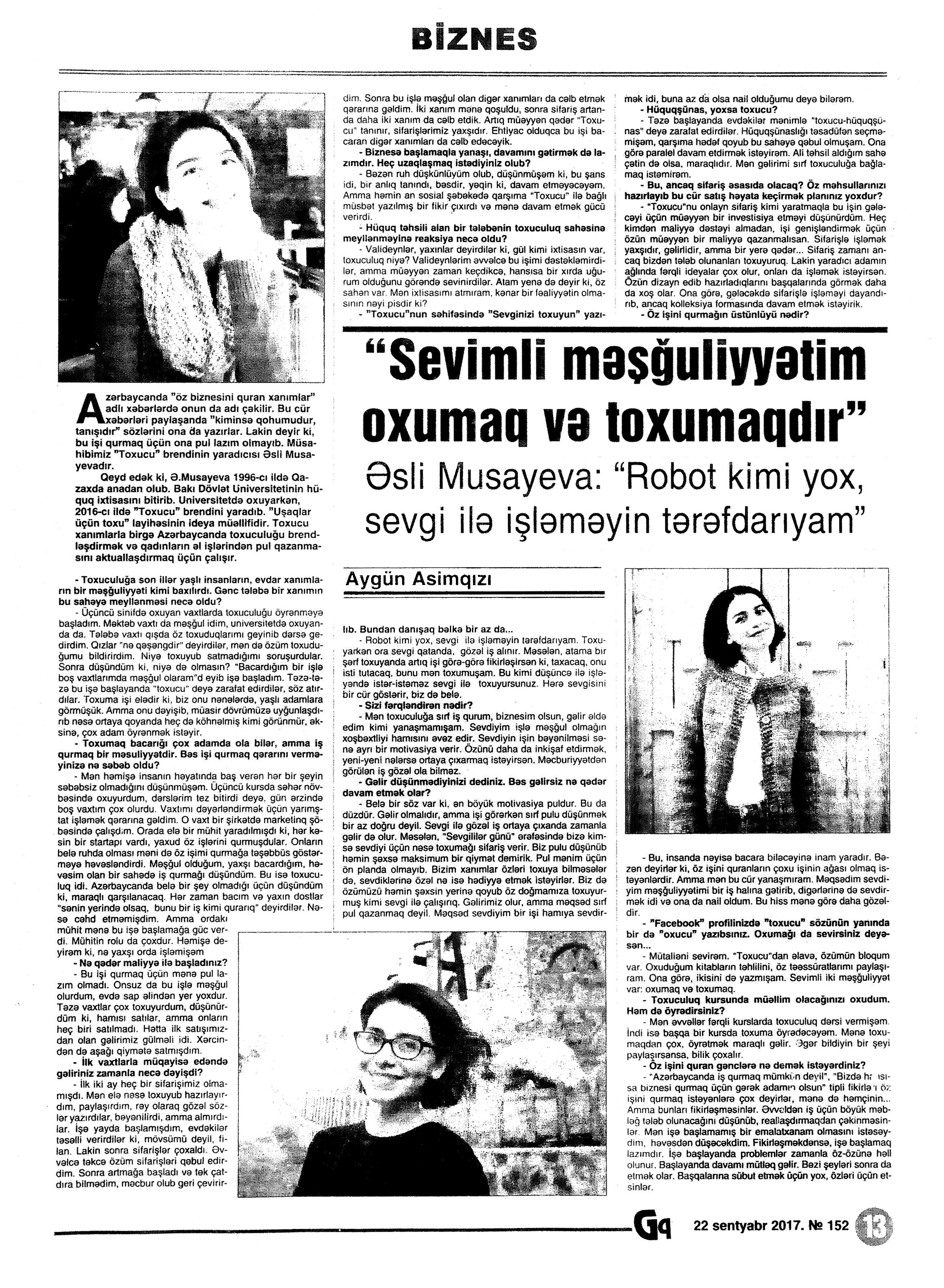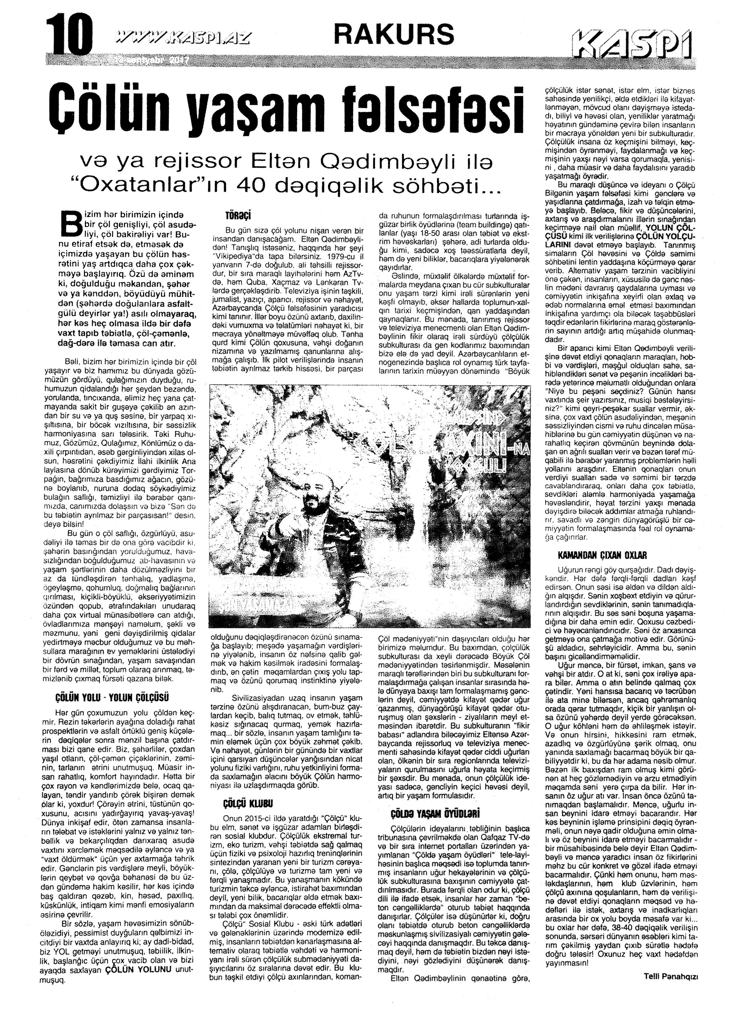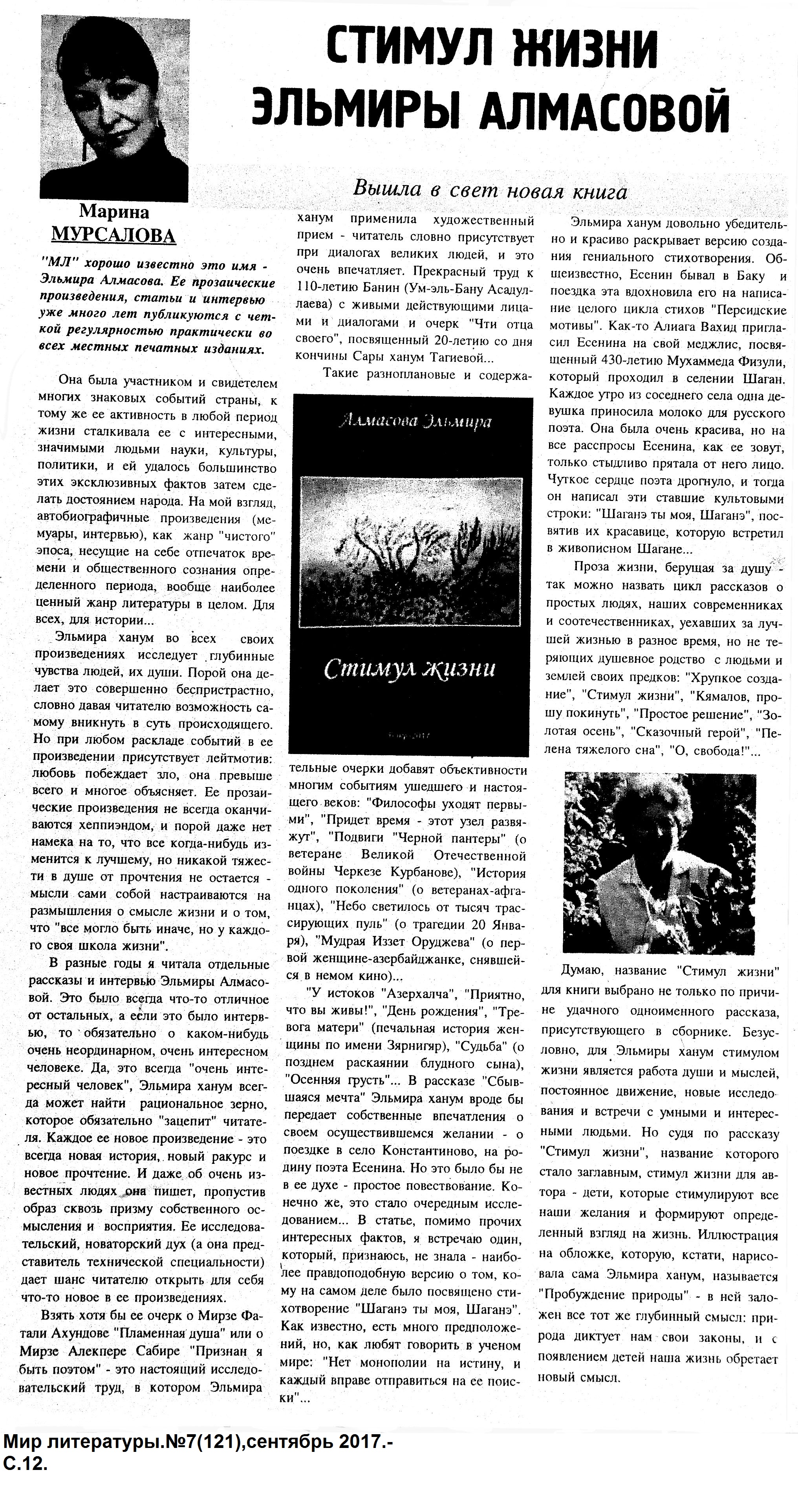 ESSELƏR 456. Çapli, Ç. Qızıma məktub: [ingilis dilindən tərcümə] /tərc. etdi Elcan Salmanqızı //Kaspi.-2017.- 30 sentyabr.- S.21. 457. Hidayət. Ceviz ağacı //525-ci qəzet.-2017.- 1 sentyabr.- S.15. 458. Hidayət. İntellektimizin Ağamusa Axundov abidəsi //525-ci qəzet.-2017.- 1 sentyabr.- S.14. 459. İsmayıl, M. Bəxtsiz arzuların zoğalı rəngi //Ədəbiyyat qəzeti.-2017.- 9 sentyabr.- S.20. 460. Qasımoğlu, N. Bu Arəstə xanım Şahsuvarqızıdır, rəhmətlik nənəm //Ədəbiyyat qəzeti.-2017.- 9 sentyabr.- S.22-23.
