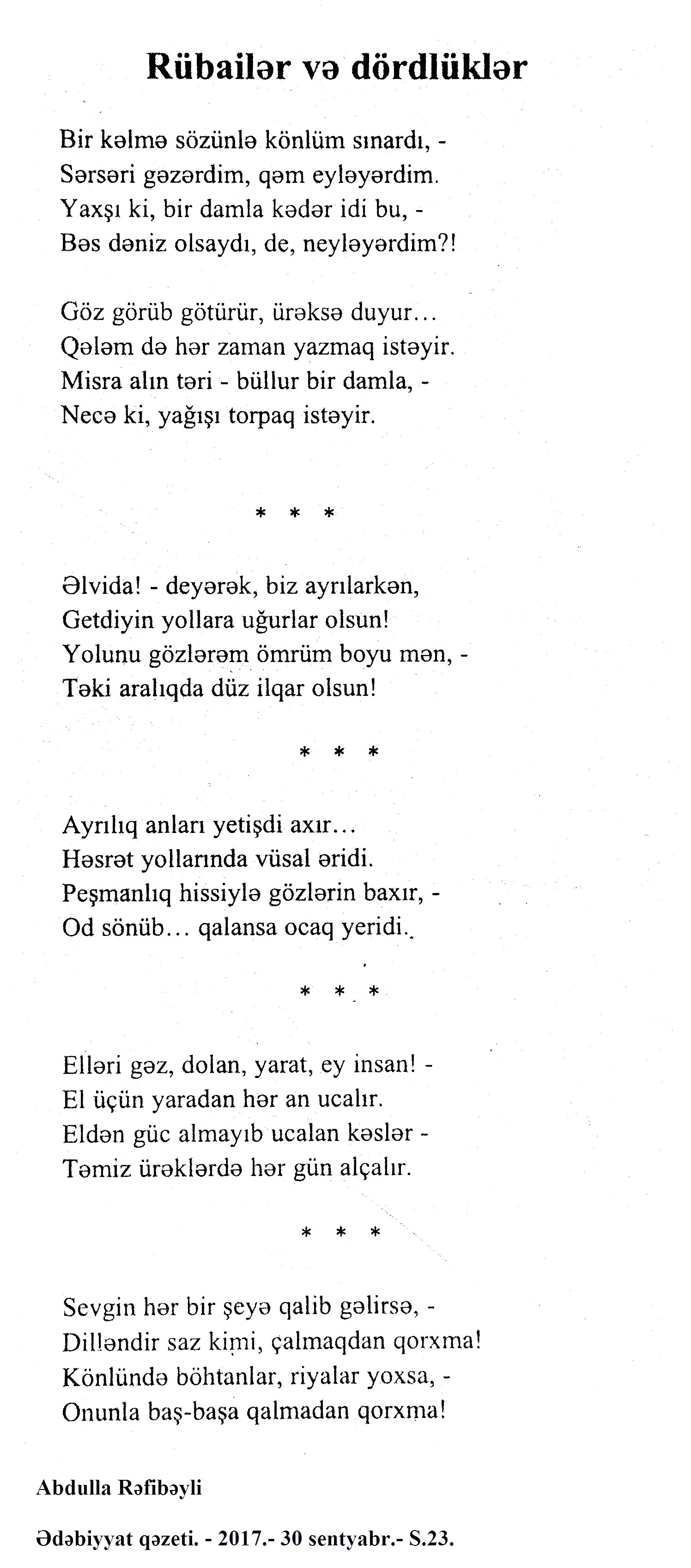PYESLƏR 466. Cəfərov, M. Get dolangilən, xainsən hələ... //Ədəbiyyat qəzeti.-2017.- 23 sentyabr.- S.23-24.