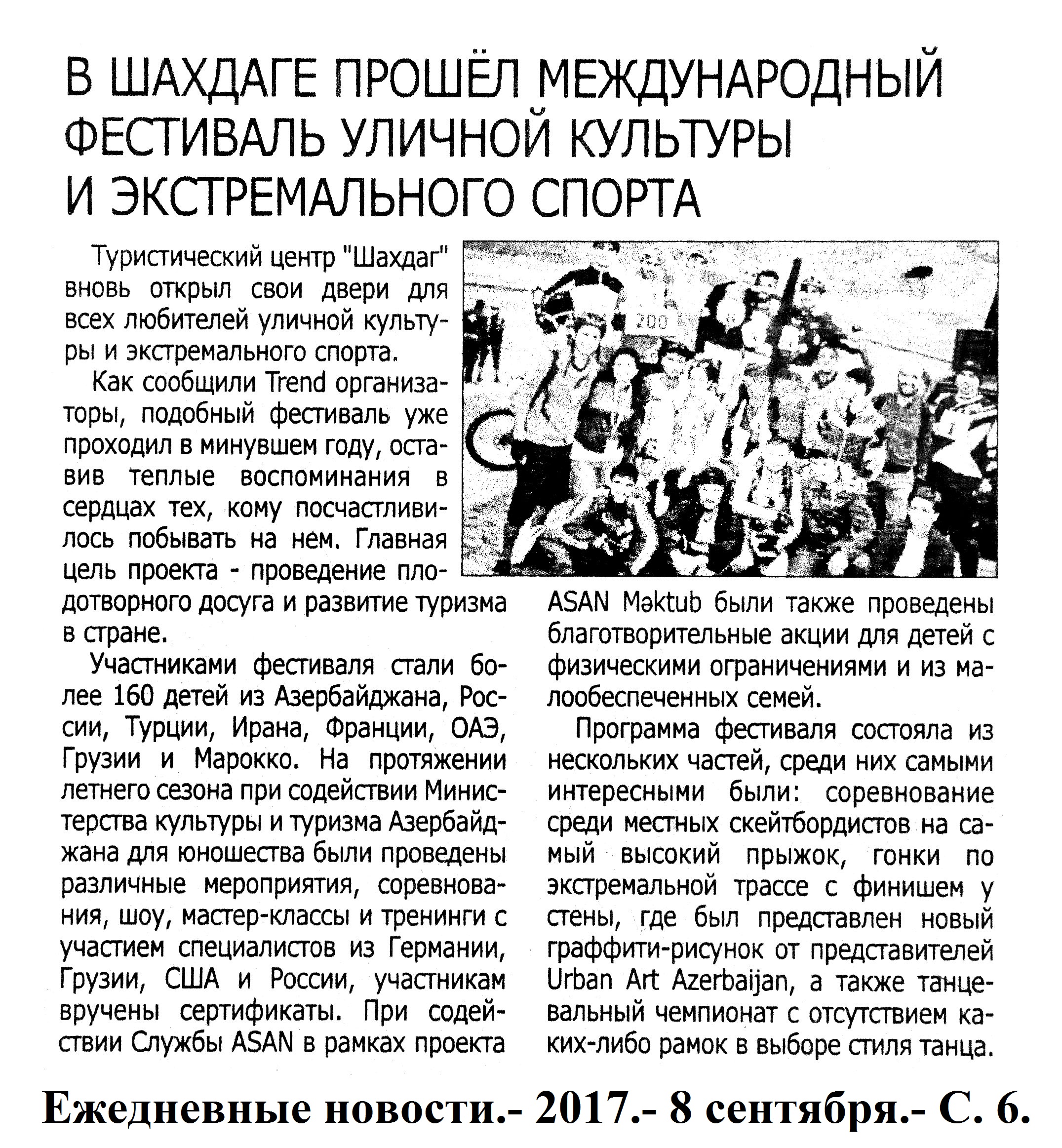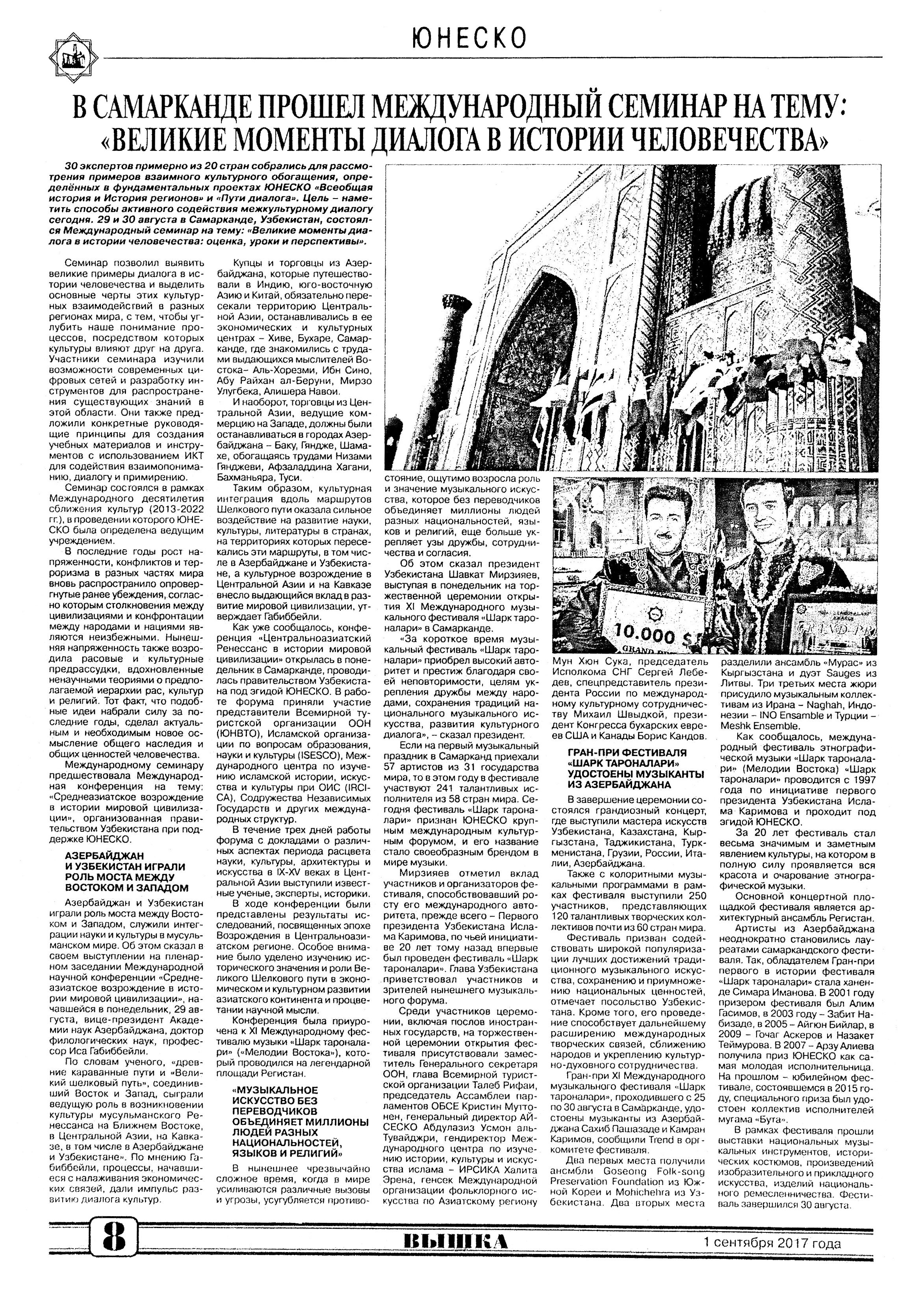 MƏDƏNİ ƏLAQƏLƏR 40. Almaniyada ölkəmizin mədəniyyət və mətbəxini tanıdan kitab: [Heydər Əliyev Fondunun dəstəyilə ərsəyə gələn “A guest in Azerbaijan” adlı kitab haqqında] //Mədəniyyət.- 2017.-8 sentyabr.- S.8. 41. Avrasiya Kitabxanalar Assambleyasının növbəti illik yığıncağı Bakıda keçiriləcək: [professor, Milli Kitabxananın direktoru Kərim Tahirovun Minskdə Belarus kitab nəşrinin və ilk kitabın naşiri Frantsisk Skorinanın 500 illiyinə həsr olunmuş tədbirdə iştirak etməsi haqqında] //Mədəniyyət.- 2017.-20 sentyabr.- S.5. 42. Aydınoğlu, T. Təbriz – İslam ölkələrinin növbəti mədəniyyət paytaxtı: Qardaşlıq körpüsü //Xalq qəzeti.- 2017.- 9 sentyabr.- S.4. 43. “Azərbaycan Evi” Danimarkada yaşayan azərbaycanlıların toplaşdığı mərkəz rolunu oynayr //Üç nöqtə.- 2017.- 14 setyabr.- S.5. 44. “Azərbaycanın mədəni sərvəti”: Xalça Muzeyində Dağıstanın əl sənəti nümunələrinə dair ustad dərsləri təşkil olunacaq //Mədəniyyət.- 2017.- 1 sentyabr.- S.8. 45. Azərbaycan nümayəndə heyəti Daşkənddə mədəniyyət festivalında iştirak edib //Mədəniyyət.- 2017.- 13 sentyabr.- S.5. 46. Azərbaycan və alman xalqlarının dostluğu zəngin tarixə söykənir: Azərbaycan səfiri Cənubi Qafqazda alman məskənlərinin 200 illiyinin qeyd olunmasından söhbət açıb: [Ramin Həsənov “Business & Diplomacy” jurnalının “Səfirlə söhbət” silsiləsinin növbəti qonağı olması haqqında] //Mədəniyyət.- 2017.-8 sentyabr.- S.2. 47. Azərbaycanın xalça inciləri Vaşinqtonda //Həftə içi.- 2017.- 9-11 sentyabr.- S.8. 48. Azərbaycanın xalça nümunələri Vaşinqtonda sərgilənib //Mədəniyyət. - 2017.- 13 sentyabr.- S.6. 49. Azərbaycanın turizm imkanları Parisdə sərgilənir: Fransalı turistlərin Bakını daha yaxından tanıması üçün turistik proqramlar tərtib ediləcək //Mədəniyyət.- 2017.- 29 sentyabr.- S.8. 50. Azərbaycanlı gənc rəssamların əsərləri Sofiyada nümayiş olunub:[5-ci Dünya Uşaq rəsm müsabiqəsi qaliblərinin sərgisi haqqında] //Kaspi.- 2017.- 13 sentyabr.- S.9. 51. Azəri, L. Rəqs sənətinə sonsuz sevgi: “Azərbaycan-İran rəqs gecəsi” tamaşaçılara unudulmaz anlar yaşatdı //Mədəniyyət.- 2017.-20 sentyabr.- S.8. 52. Bakıda Əfqanıstanın milli bayramı qeyd edilib //Şərq.- 2017.- 19 sentyabr- S.5. 53. Bakıda İndoneziya mədəniyyəti festivalının açılışı olub: [Bakıda keçirilən II İndoneziya mədəniyyəti festivalı haqqında] //Xalq qəzeti.- 2017.-10 sentyabr.- S.2. 54. Çin və Azərbaycan etibarlı dost və tərəfdaşdır: İki ölkə arasında mədəniyyət və turizm sahəsində də əməkdaşlığın geniş potensialı var //Mədəniyyət.- 2017.- 29 sentybar.- S.4. 55. Dadaşova, Ş. “Leyli və Məcnun” ilk dəfə Rusiya səhnəsində: [Xalq artisti Mənsum İbrahimovun və Arzu Əliyevanın ifalrında] //İki sahil.- 2017.- 22 sentyabr.- S.10. 56. Dirijor Bərdia Kiyarəs Musiqili Teatra belə təşəkkür etdi: [tehranlı dirijor və musiqiçi haqqında] //Kaspi.- 2017.- 28 sentyabr.- S.10. 57. Elçinin “Şekspir” pyesinin İtaliyada yeni tamaşası //Yeni Azərbaycan.- 2017.- 20 sentyabr.- S.7. 58. “Etnik musiqi inciləri”: Muğam Mərkəzində Moldova və Azərbaycan musiqiləri səslənəcək //Mədəniyyət.- 2017.-13 sentyabr.- S.3. 59. Əhməd S. “Ölkələrimiz arasında mədəni əlaqələrdə körpü rolunu oynamağa çalışırıq”: [Misir Ərəb Respublikasının Azərbaycandakı səfirliyinin numayəndəsi Əhməd Sami Əl-Aydi ilə müsahibə] /müsahibəni apardı Məmmədzadə //Mədəniyyət.- 2017.- 22 sentyabr.- S. 10. 60. Əliyeva, S. Azərbaycan Beynəlxalq Qastronomiya festivalında təmsil olunub: [Azərbaycanın Dostları Assosiasiyası və Azərbaycan Evinin təşkilatçılığı ilə] //Xalq qəzeti.- 2017.- 28 sentyabr.- S.7. 61. Fərəcov, S. Türkiyə və Azərbaycanın nəşriyyat işi sahəsində əməkdaşlığı: Bakıda iki ölkənin naşir, redaktor və yazarlarının iştirakı ilə simpozium keçirilir: [AMEA-nın Mərkəzi Elmi Kitabxanasında “Türkiyə-Azərbaycan nəşriyyatçılığı” adlı simpoziumun açılışı haqqında] //Mədəniyyət.- 2017.- 29 sentyabr.- S.4. 62. Heydər Əliyev Mərkəzində müasir türk sənətkarlarının əsərlərindən ibarət sərgi açılıb: [Türkiyə Respublikasının Azərbaycandakı səfirliyi ilə birgə əməkdaşlıq çərçivəsində] //Azərbaycan.- 2017.- 7 sentyabr.- S.5. 63. “İpək yolu və dünya sivilizasiyası”: Azərbaycan incəsənət ustalarının əsərləri Pekin biennalesində //Mədəniyyət.- 2017.- 29 sentybar.- S.11. 64. 25 ildə Yaponiya-Azərbaycan münasibətləri davamlı inkişaf edib: Hər iki ölkədə mədəniyyətlərimizin təbliği istiqamətində tədbirlər həyata keçirilir //Mədəniyyət.- 2017.- 8 sentyabr.- S.5. 65. Kavunc O. “Özbək türkü olduğumu universitetə qəbul olduqdan sonra öyrəndim”: [professor Orxan Kavuncun müsahibəsi] /müsahibəni apardı Mehparə Sultanova //Mədəniyyət.- 2017.- 15 sentyabr.- S.13. 66. Kiyarəs, B. Azərbaycanın və musiqisinin vurğunu olan dünya şöhrətli dirijor: [tehranlı dirijor və musiqiçi Bərdia Kiyarəslə müsahibə] //Kaspi.- 2017.- 23-25 sentyabr.- S.7. 67. “Kontrabas” Kiyevdə nümayiş olunacaq //Azad Azərbaycan.- 2017.- 20 sentyabr.- S.7. 68. Kulbek E. “İndi bir daha dərk edirik ki, biz vahid xalqıq, bir ağacın qollarıyıq”: “Molla Pənah Vaqifin şeirləri qazax dilinə tərcümə edilməlidir və mən bilavasitə bu işlə məşğul olacağam”: [Qazaxıstanın tanınmış türkoloq və filoloqu Kulbek Ergöbek Sarsenulın müsahibəsi] /müsahibəni apardı Mehparə Sultanova //Mədəniyyət.- 2017.- 20 sentyabr.- S.12. 69. Qəbələdə beynəlxalq festival keçirilib: Azərbaycan və Cənubi Koreya arasında münasibətlə