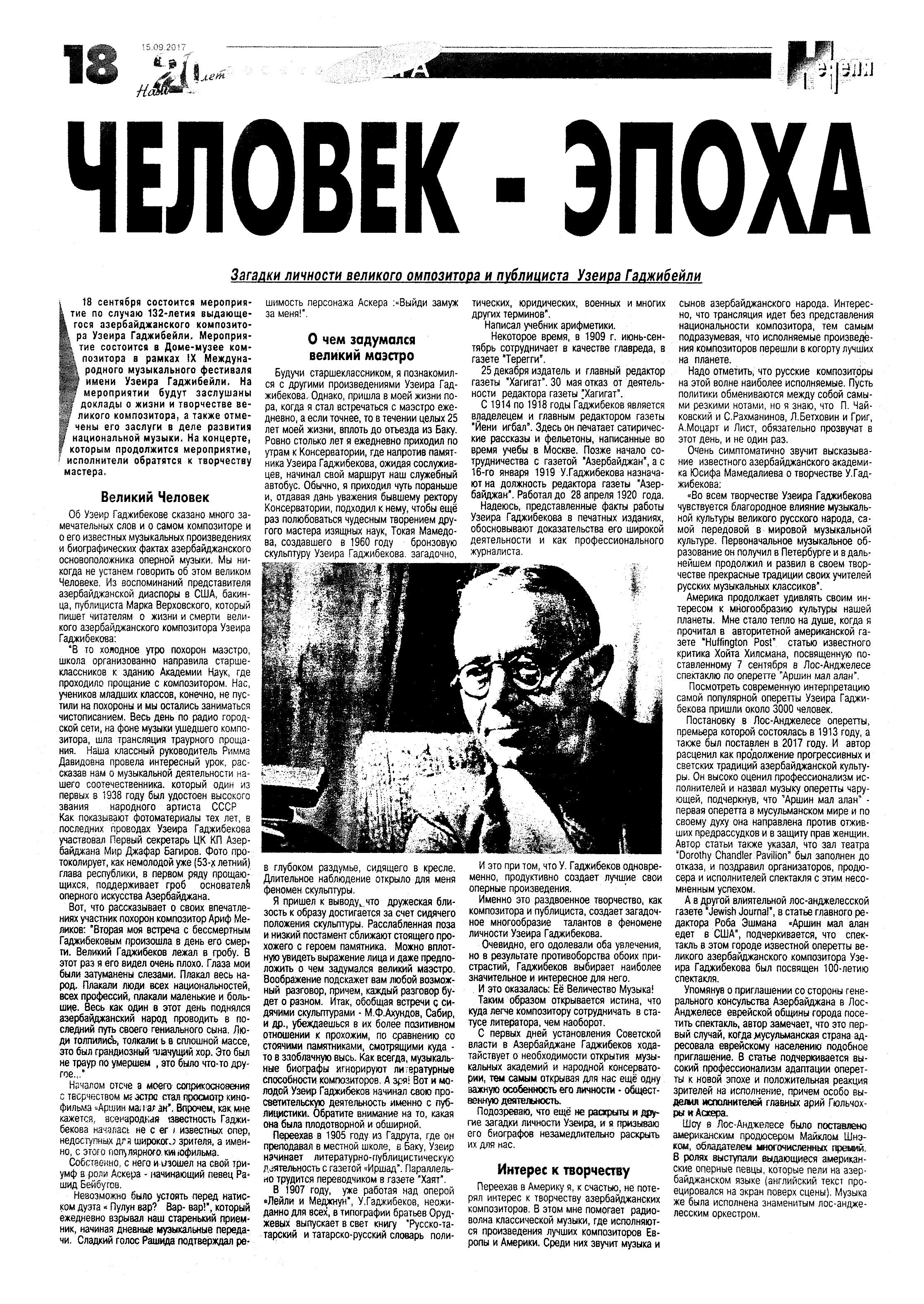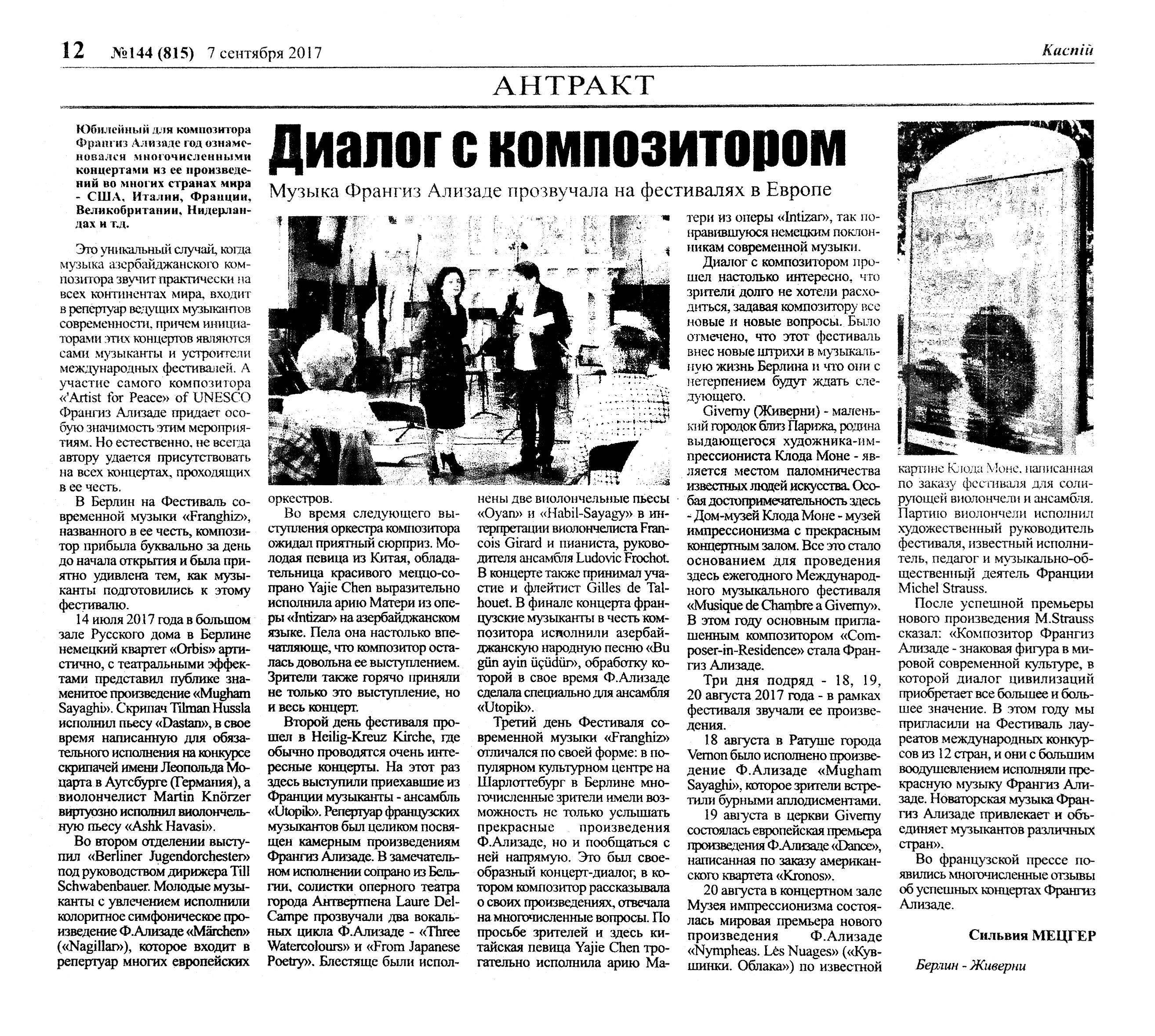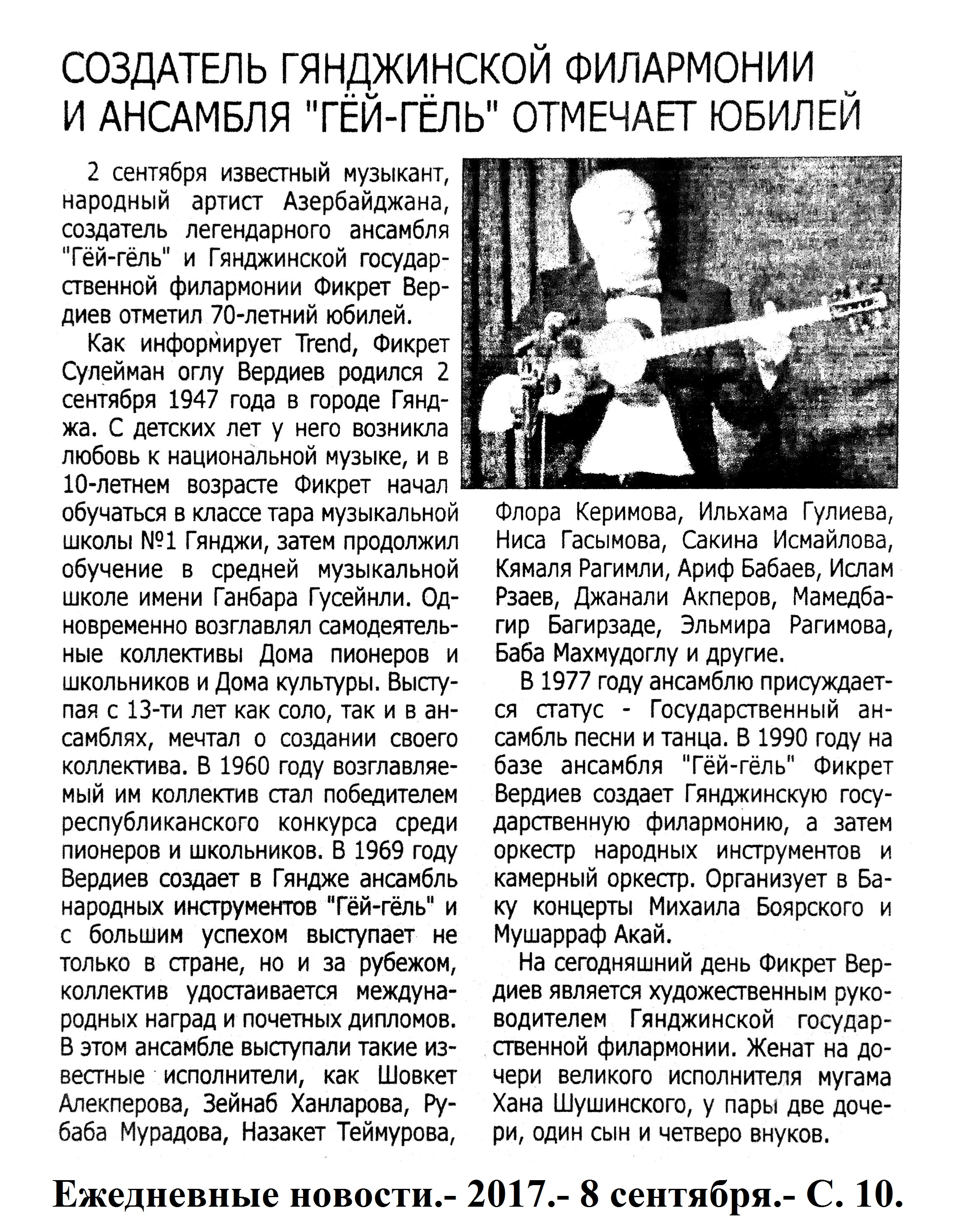 МУЗЫКА 772. Аббасова, Р. Бессмертна душа музыканта: Памяти Сарвара Ганиева посвящается //Каспiй.- 2017.- 9 сентября.- С.18-19. 773. Асадова, И. В Польше отметили 90-летие со дня рождения Ростроповича //Эхо.- 2017.- 27 сентября.- С.8. 774. Буланова, О. Фирангиз Ахмедова: Оперная дива //Эхо.- 2017.- 23 сентября.- С.10. 775. Мецгер, С. Диалог с композитором: Музыка Франгиз Ализаде прозвучала на фестивале в Европе //Каспiй.- 2017.- 7 сентября.- С.12. 776. Опера «Лейли и Меджнун» Узеира Гаджибейли впервые будет представлена в России //Бакинский рабочий.- 2017.- 22 сентября.- С.3. 777. Скончался ашуг Адалят //Ежедневные новости.- 2017.- 15 сентября.- С.10. 778. Создатель Гянджинской филармонии и ансамбля «Гейгель» отмечает юбилей: [Заслуженный артист Фикрет Вердиев] //Ежедневные новости.- 2017.- 8 сентября.- С.10. 779. Тарист Сахиб Пашазаде представил Азербайджан на узбекском фестивале //Ежедневные новости.- 2017.- 1 сентября.- С.10. 780. Шовкет Мамедова первая ласточка азербайджанской оперы: [к 120-летию народной артистки] //Вышка.- 2017.- 8 сентября.- С.9.
