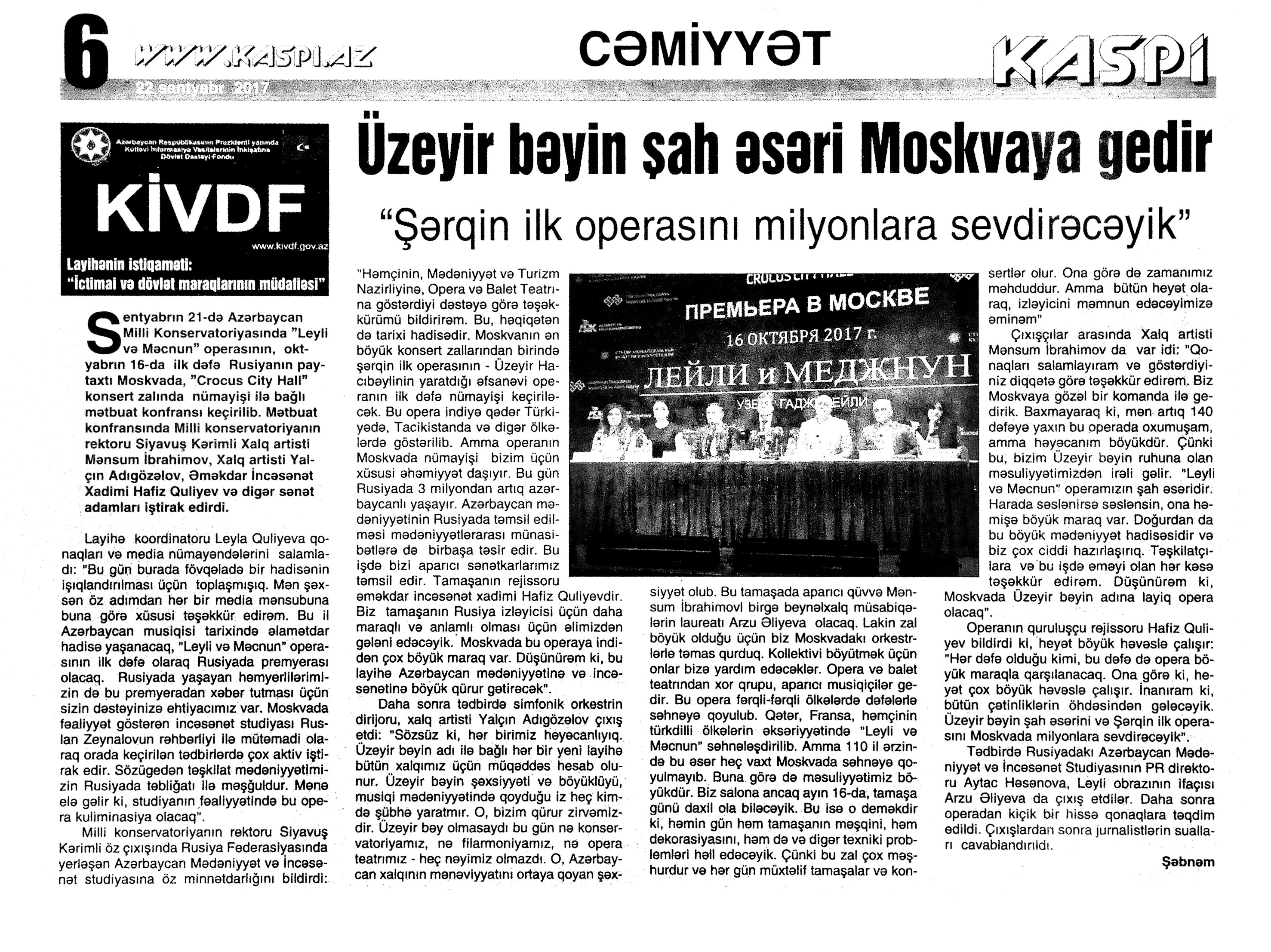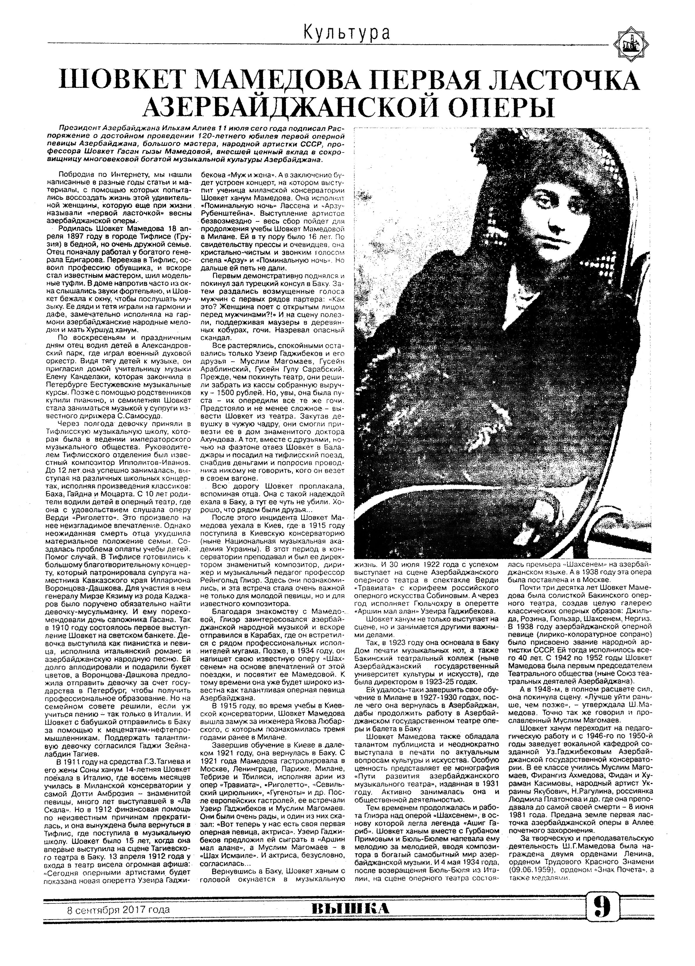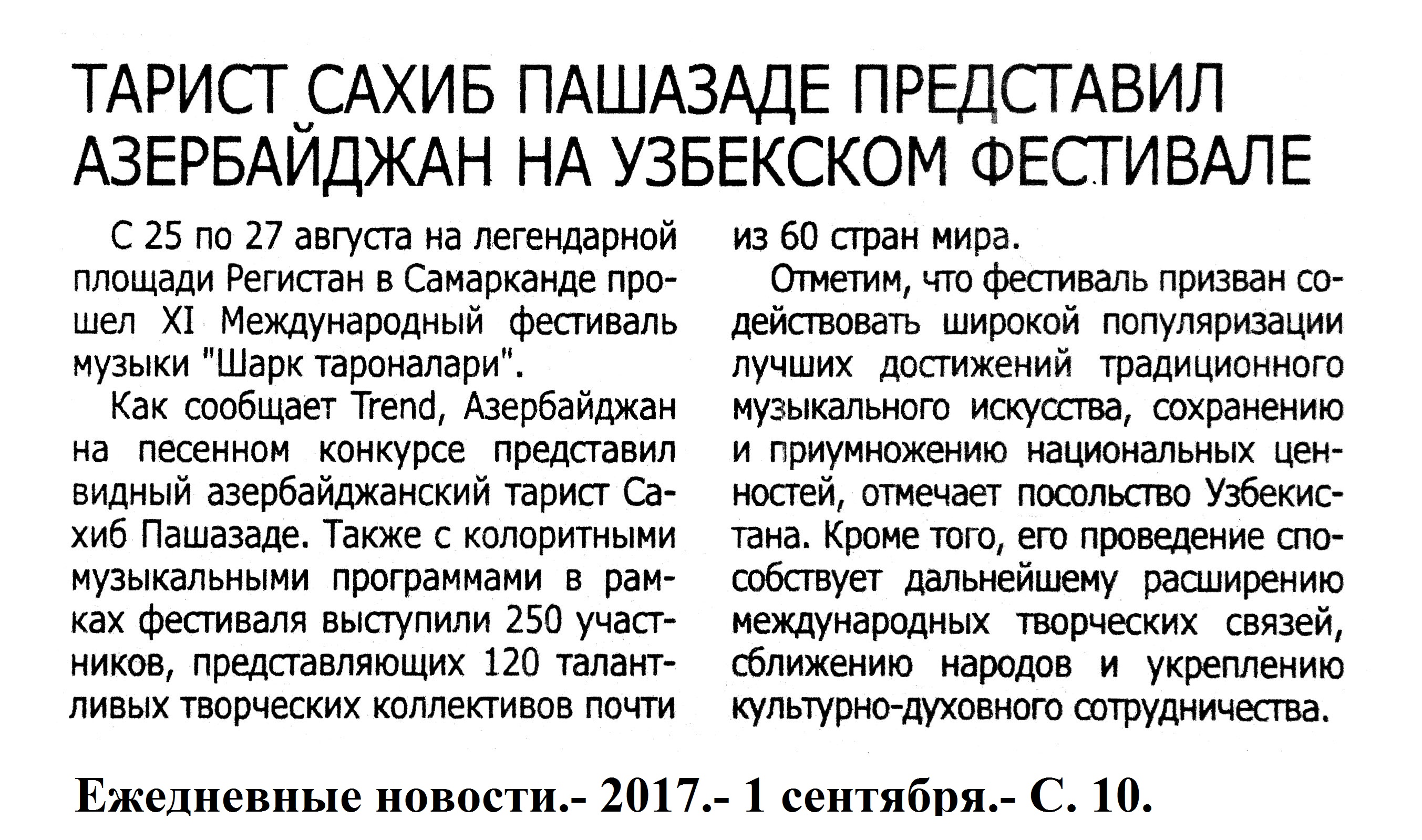 МУЗЫКА 772. Аббасова, Р. Бессмертна душа музыканта: Памяти Сарвара Ганиева посвящается //Каспiй.- 2017.- 9 сентября.- С.18-19. 773. Асадова, И. В Польше отметили 90-летие со дня рождения Ростроповича //Эхо.- 2017.- 27 сентября.- С.8. 774. Буланова, О. Фирангиз Ахмедова: Оперная дива //Эхо.- 2017.- 23 сентября.- С.10. 775. Мецгер, С. Диалог с композитором: Музыка Франгиз Ализаде прозвучала на фестивале в Европе //Каспiй.- 2017.- 7 сентября.- С.12. 776. Опера «Лейли и Меджнун» Узеира Гаджибейли впервые будет представлена в России //Бакинский рабочий.- 2017.- 22 сентября.- С.3. 777. Скончался ашуг Адалят //Ежедневные новости.- 2017.- 15 сентября.- С.10. 778. Создатель Гянджинской филармонии и ансамбля «Гейгель» отмечает юбилей: [Заслуженный артист Фикрет Вердиев] //Ежедневные новости.- 2017.- 8 сентября.- С.10. 779. Тарист Сахиб Пашазаде представил Азербайджан на узбекском фестивале //Ежедневные новости.- 2017.- 1 сентября.- С.10. 780. Шовкет Мамедова первая ласточка азербайджанской оперы: [к 120-летию народной артистки] //Вышка.- 2017.- 8 сентября.- С.9.