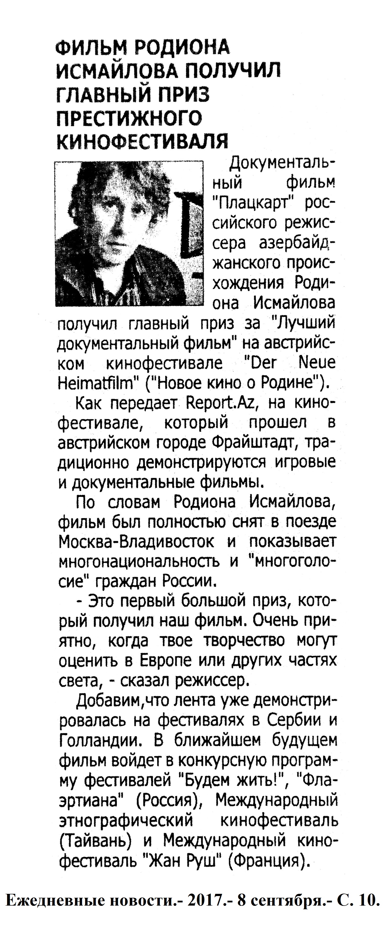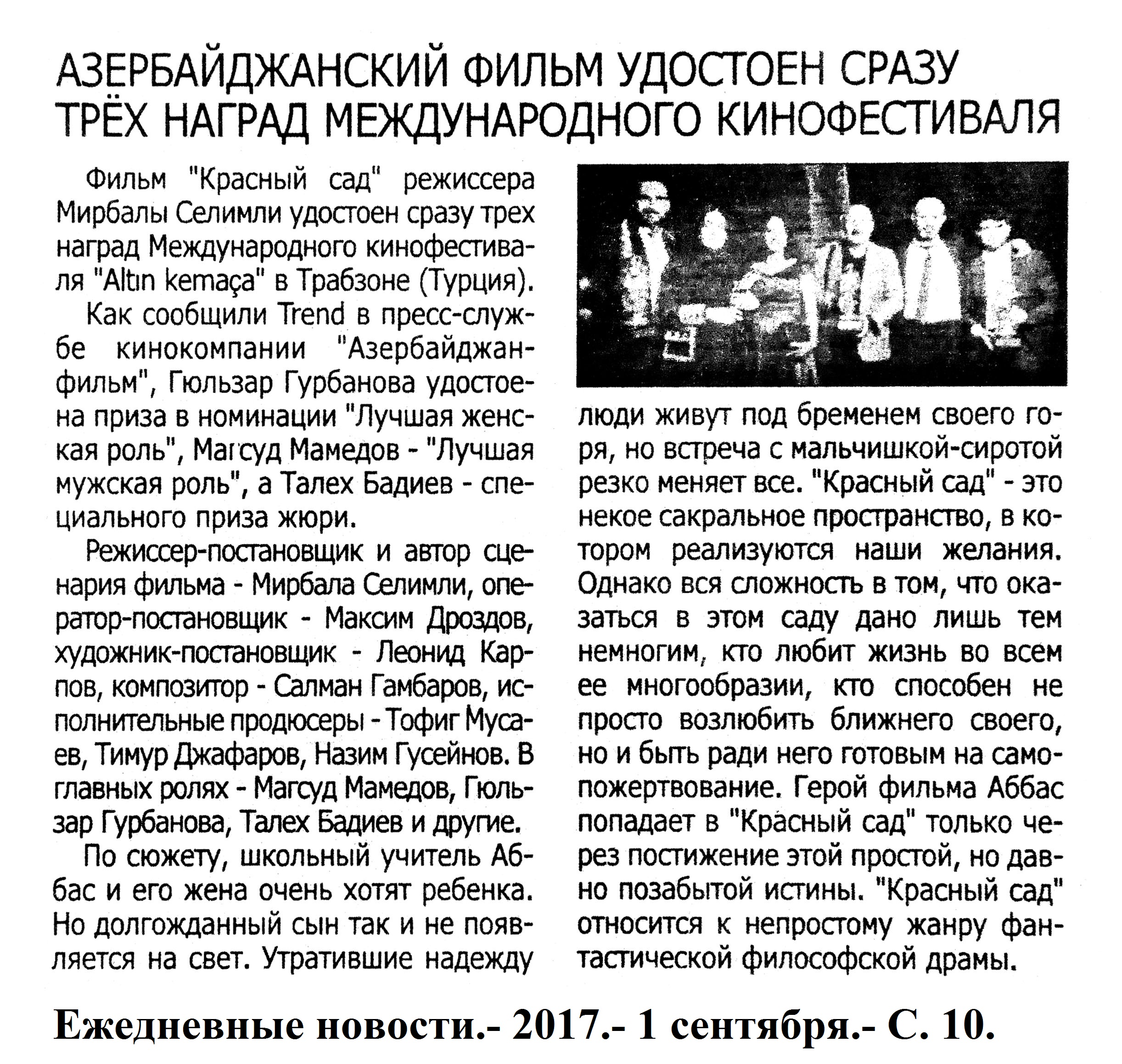 КИНО 805. Азербайджанские фильмы представлены на фестивале мусульманского кино в Казани: [«Это любовь» Теймура Даими» и «Голос» Дариуша Наджафи] //Бакинский рабочий.-2017.- 12 сентября.- С. 10. 806. Азербайджанский фильм удостоен сразу трех наград международного кинофестиваля: [о фильме Мирбалы Салимли «Красный сад»] //Ежедневные новости.-2017.- 1 сентября.- С. 10. 807. В Центре современного искусства YARAT!: Состоится премьерный показ фильма режиссера Ильгара Наджафа «Гранатовый сад» //Бакинский рабочий.-2017.- 19 сентября.- С. 5. 808. Даими, Т. Теймур Даими, кинорежиссер: Любовь - это чувство, не подвластное ни времени, ни обстоятельствам /интервью провела Л.Багирзаде //Азербайджанские известия.-2017.- 16 сентября.- С. 1, 3. 809. Манафов, Р. Азербайджанские фильмы признаны лучшими на фестивале мусульманского кино: [о кинокартинах «Голос» - Дариуша Наджафи и «Это любовь» режиссера Теймура Даими] //Эхо.-2017.- 14 сентября.- С. 8. 810. Манафов, Р. «Это любовь» и «Голос»: [о кинокартинах Теймура Даими и Дариуша Наджафи на фестивале мусульманского кино] //Эхо.-2017.- 12 сентября.- С. 8. 811. Фильм Родиона Исмайлова получил главный приз престижного кинофестиваля: [о фильме «Плацкарт» на фестивале в Австрии] //Ежедневные новости.-2017.- 8 сентября.- С. 10. 812. Ширинсифет, Б. Урок кинематографа: Бабек Ширинсифет: От меня ждут чего-то наподобие Рэмбо, но это невозможно /беседу с кинорежиссером провел Г.Туралы //Каспiй.-2017.- 16 сентября.- С. 19-20.