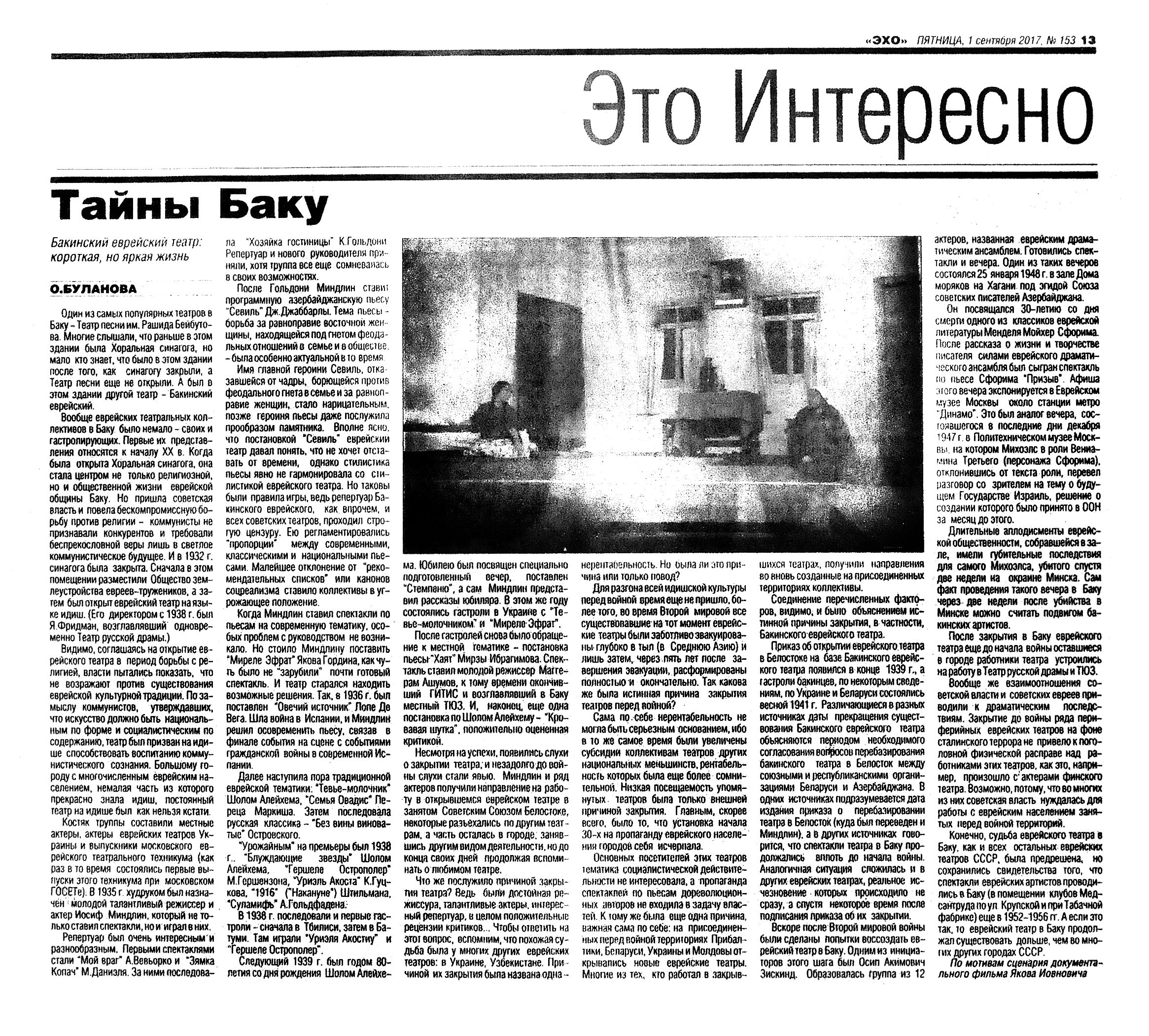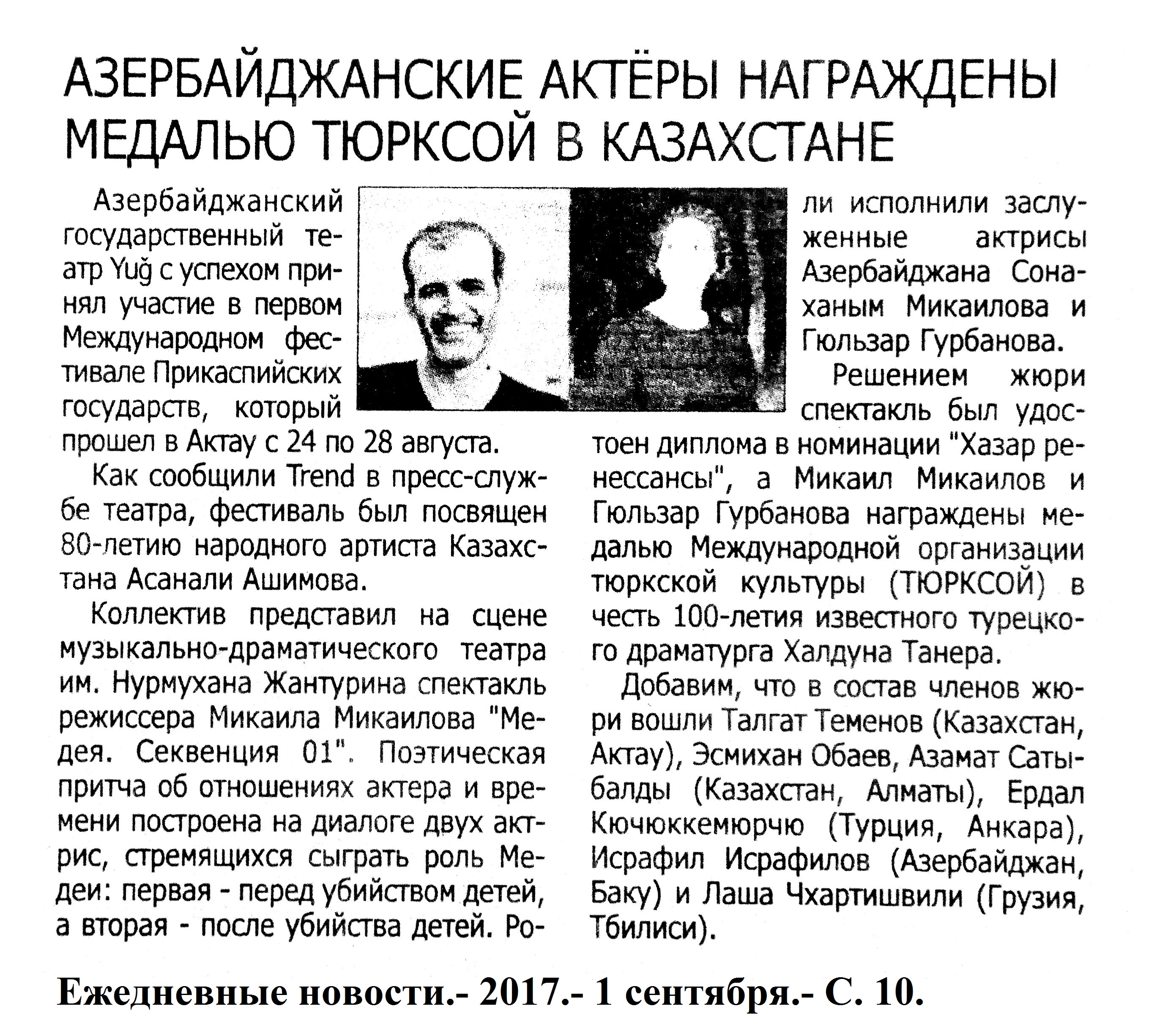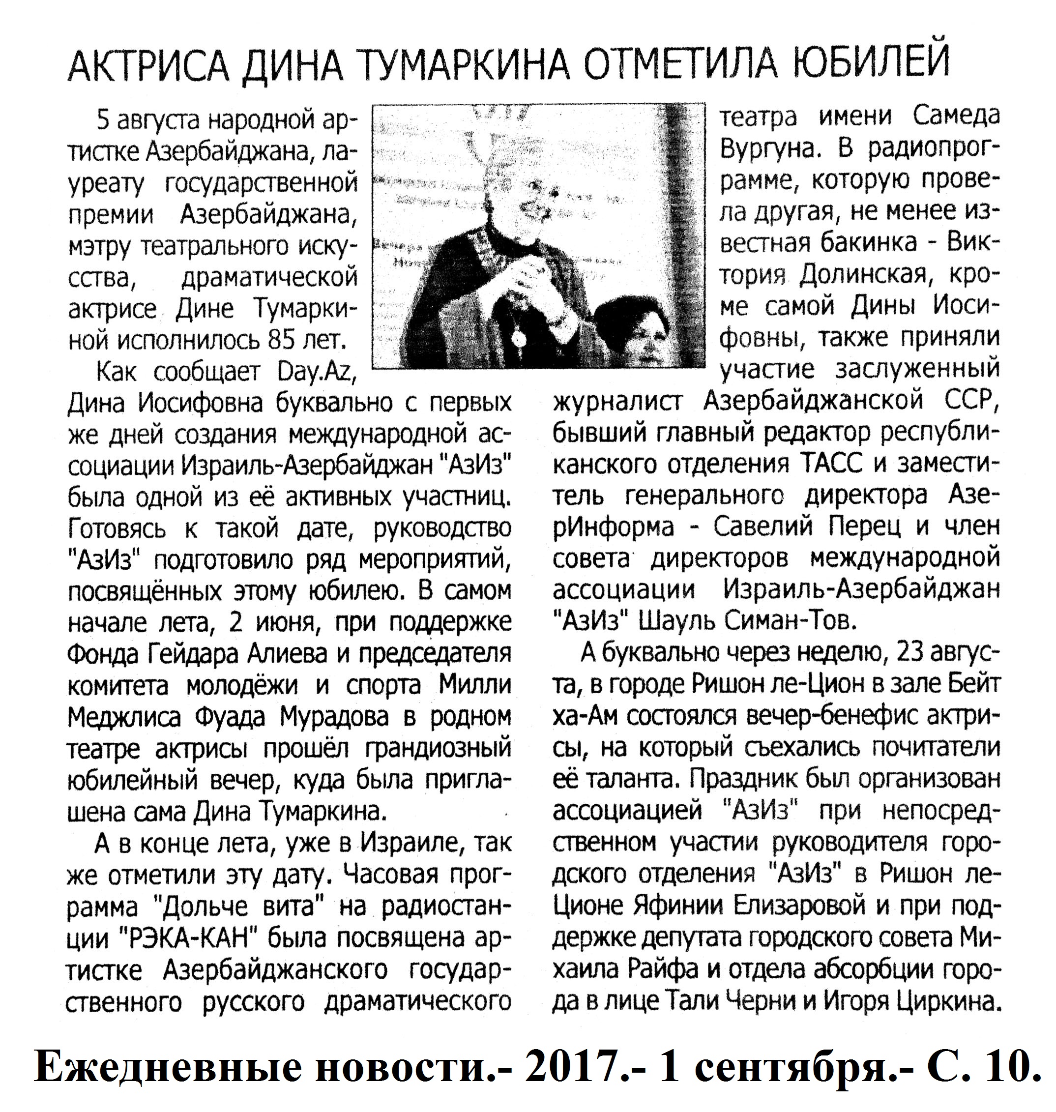 ТЕАТР 813. Азербайджанские актеры награждены медалью ТЮРКСОЙ в Казахстане: [Театр «Йух» на Первом Международном театральном фестивале прикаспийских стран] //Ежедневные новости.-2017.- 1 сентября.- С. 10. 814. Актриса Дина Тумаркина отметила юбилей: [актриса РДТ имени С.Вургуна, проживающая в Израиле] //Ежедневные новости.-2017.- 1 сентября.- С. 10. 815. Асадова, И. Фахраддин Манафов открыл сезон в Русском драмтеатре: [премьера спектакля «Церемонии» режиссера Аршада Алекперова] //Эхо.-2017.- 19 сентября.- С. 8. 816. Буланова, О. Тайны Баку: Бакинский еврейский театр: Короткая, но яркая жизнь //Эхо.-2017.- 1 сентября.- С. 13. 817. Буланова, О. Театр Yug открывает сезон //Эхо.-2017.- 16 сентября.- С. 10. 818. Буланова, О. Театр Yug — призер фестиваля в Актау //Эхо.-2017.- 1 сентября.- С. 10. 819. Буланова, О. «Феномен Театра Музкомедии»: [история театра] //Эхо.-2017.- 23 сентября.- С. 6. 820. Манафов, Р. Азербайджанский актер принял участие в ХI Международной летней театральной школе: [Джейхун Дадашев в школе Александра Калягина] //Эхо.-2017.- 16 сентября.- С. 10. 821. Манафов, Ф. Фахраддин Манафов, народный артист Азербайджана: «Наш новый спектакль - о главной тайне человека, о тайне бытия»: [о «Церемонии» режиссера Аршада Алекперова на сцене РДТ имени С.Вургуна] //Азербайджанские известия.-2017.- 16 сентября.- С. 3.