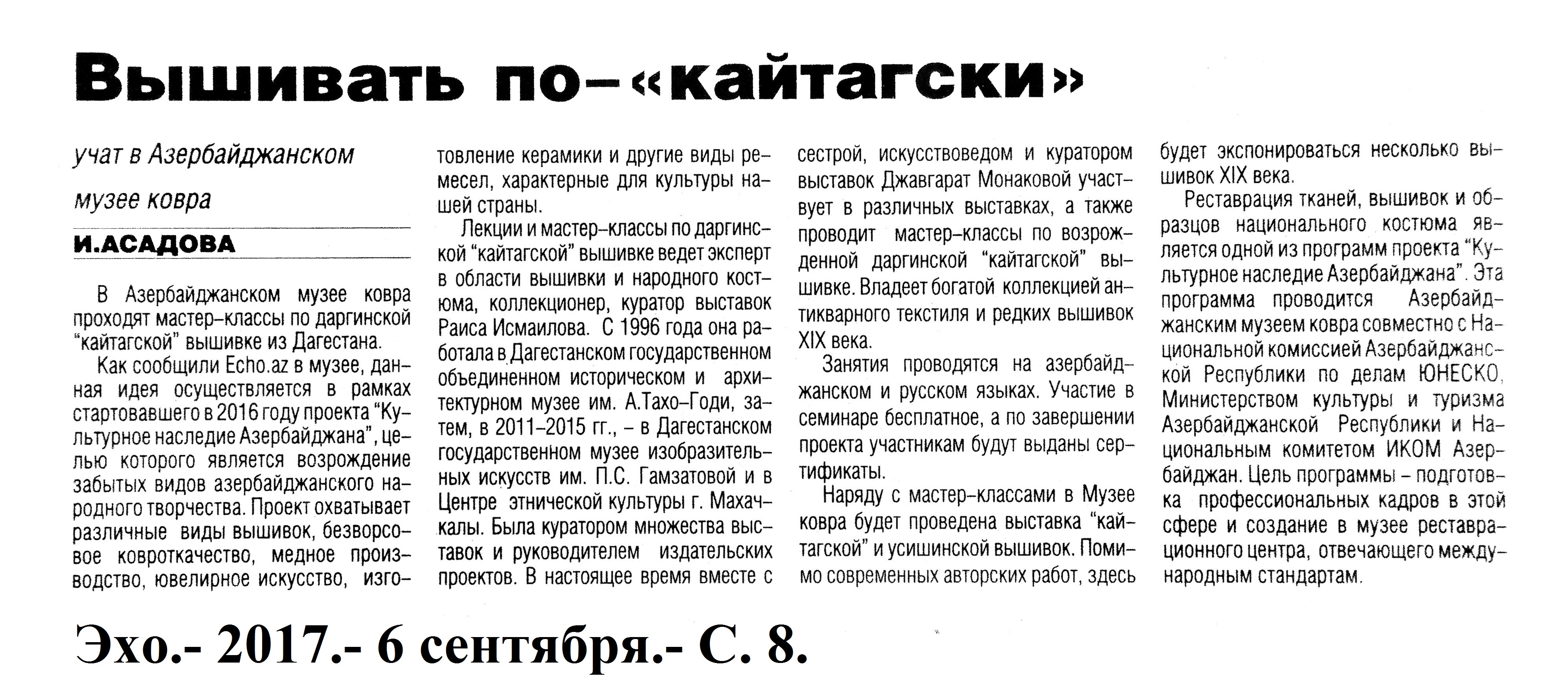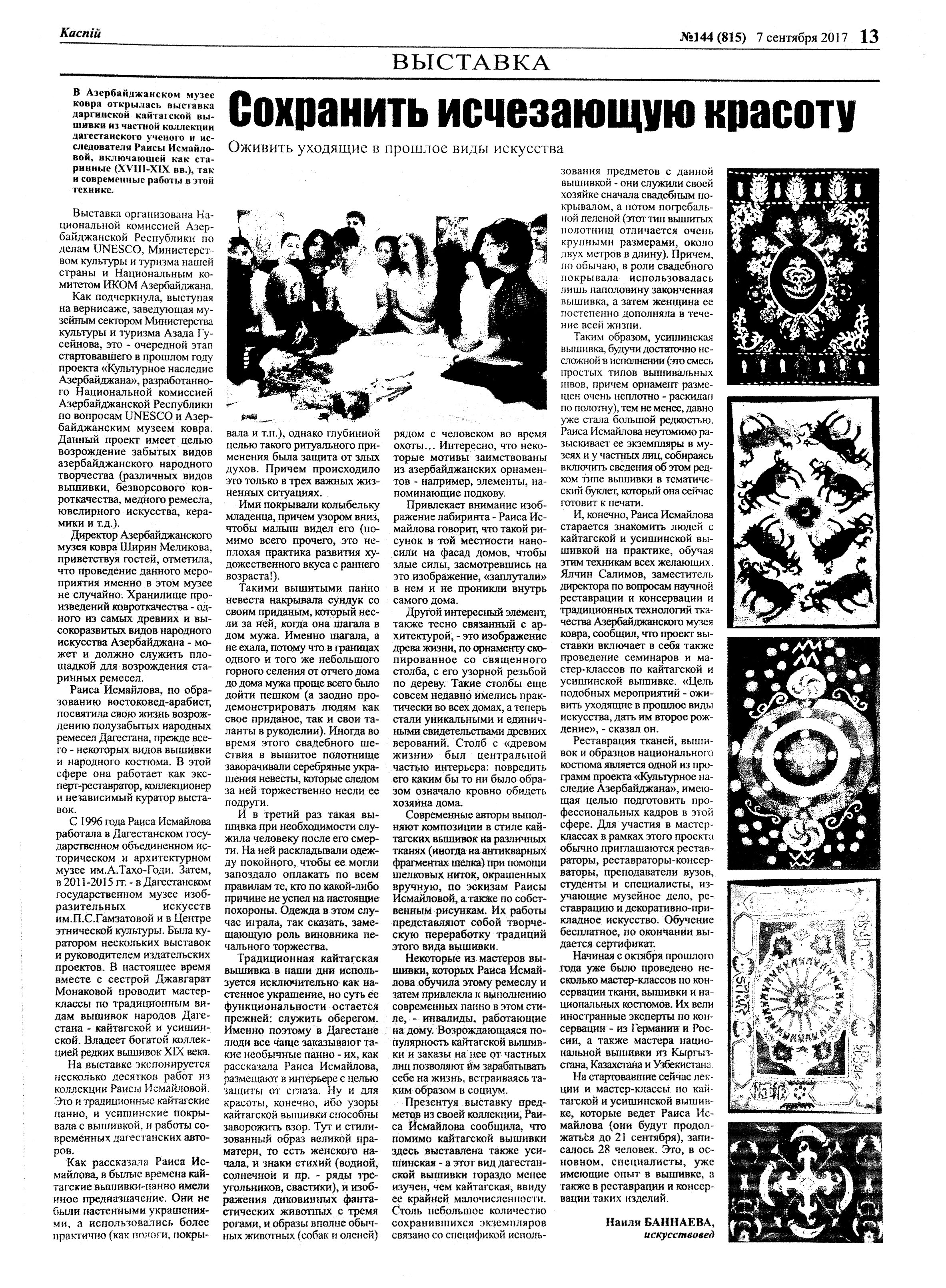 МУЗЕЙНОЕ ДЕЛО 735. Азербайджанский музей ковра получил «Сертификат качества 2017 года» //Бакинский рабочий.- 2017.- 14 сентября.- С.4. 736. Алиева, Г. Заглянуть вглубь веков: Образцы материальной культуры - сокровищница национальной памяти: [об экспонатах Историко-краеведческого музея в Джалилабаде] //Каспiй.- 2017.- 27 сентября.- С. 11. 737. Асадова, И. Вышивать по - «кайтагски»: Лекции и мастер-классы по даргинской «кайтагской» вышивке в Музее Ковра //Эхо.- 2017.- 6 сентября.- С.8. 738. Баннаева, Н. Сохранить исчезающую красоту: [лекции и мастер-классы по даргинской «кайтагской» вышивке в Музее Ковра] //Каспiй.- 2017.- 7 сентября.- С. 13. 739. В Минске презентовали книгу, изданную Зарифой Салаховой: [миниатюрная версия «Книги Юдифи» Франциска Скорины] //Бакинский рабочий.- 2017.- 27 сентября.- С.5. 740. В Национальный музей истории Азербайджана поступил уникальный этнографический материал //Бакинский рабочий.- 2017.- 8 сентября.- С.5. 741. В Сальяне открылся Музей Флага //Бакинский рабочий.- 2017.- 26 сентября.- С.7. 742. Ляшко, Б.Богатство палитры и узоров: [лекции и мастер-классы по даргинской «кайтагской» вышивке в Музее Ковра] //Вышка.- 2017.- 8 сентября.- С.19. 743. Манафов, Р. Лабиринт: Первый в мире музей культурной экспансии близ Шеки //Каспiй.- 2017.- 9 сентября.- С.12-13. 744. Сейидзаде, М. Мое божество - красота и любовь: Репортаж из Дома-музея Гусейна Джавида //Каспiй.- 2017.- 9 сентября.- С. 20.