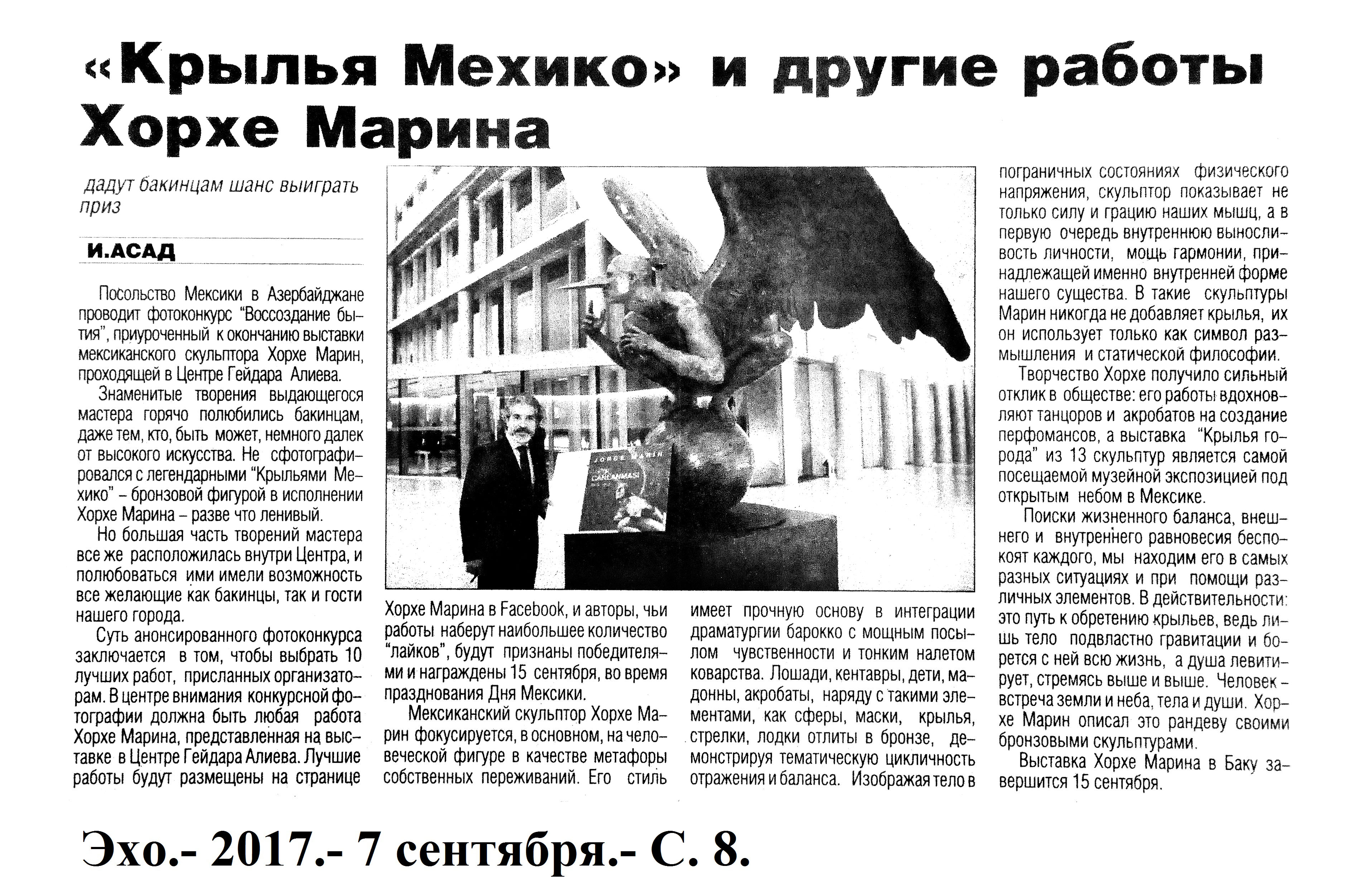 СКУЛЬПТУРА 767. Буланова, О. Тайны Баку: Советский памятник несоветскому Ахундову: [о памятнике писателю и просветителю скульптора Сабсая] //Эхо.- 2017.- 23 сентября.- С.13.