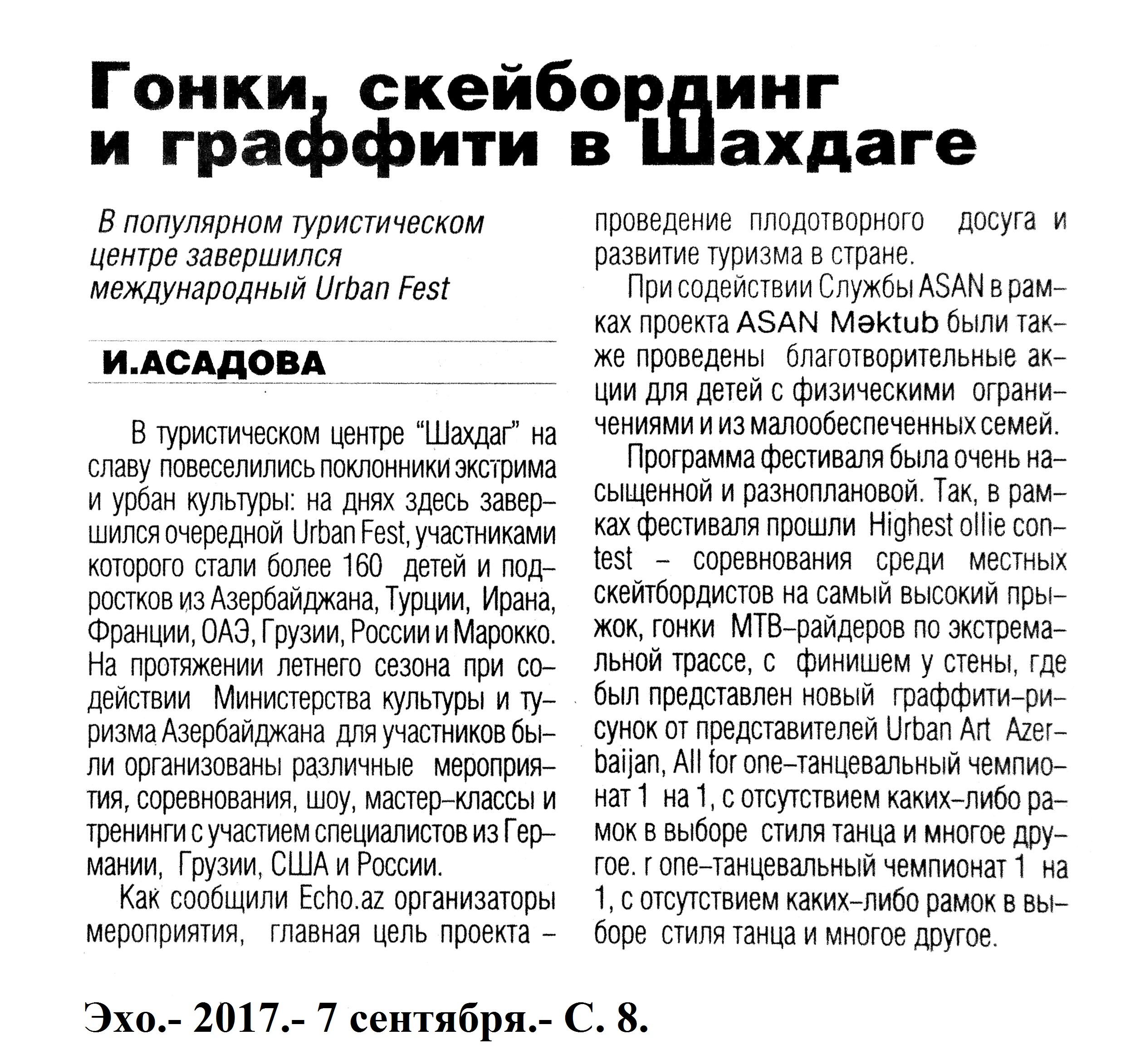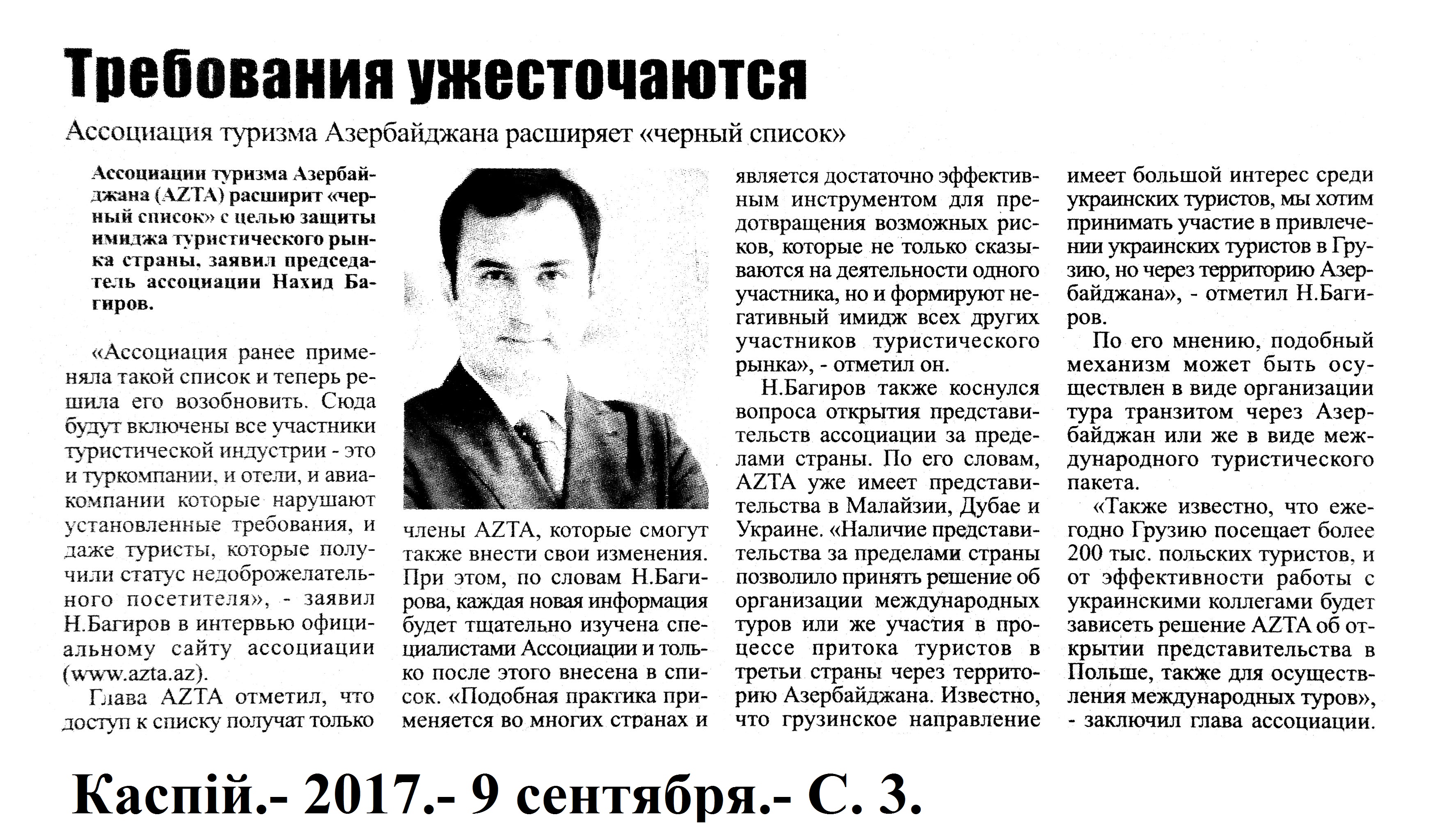 ТУРИЗМ 822. Алиева, С. Баку не подходит для туристических уик-эндов //Эхо.-2017.- 15 сентября.- С.1- 2. 823. Алиева, С. Присудят ли нашим пляжам «Голубой флаг» в 2018 году? //Эхо.-2017.- 29 сентября.- С.1- 2. 824. Аллахверанов, А. Азер Аллахверанов, глава общественного объединения «Хаят»: «Казахстан может перенять опыт Азербайджана по привлечению туристов из арабских стран» //Азербайджанские известия.-2017.- 26 сентября.- С. 1-2. 825. Асадова, И. Выгодный шопинг и много сюрпризов: [II шопинг-фестиваль] //Эхо.-2017.- 28 сентября.- С.8. 826. Асадова, И. Гонки, скейтбординг и граффити в Шахдаге //Эхо.-2017.- 7 сентября.- С.8. 827. Багиров, Н. Нахид Багиров, глава Ассоциации туризма: «В Азербайджане можно отдохнуть по доступным ценам» //Азербайджанские известия.-2017.- 16 сентября.- С. 2. 828. В Лянкяране сдан в эксплуатацию отельный комплекс «Хазар Палас» //Бакинский рабочий.-2017.- 6 сентября.- С. 7. 829. В Ставрополе состоялся российско-азербайджанский межрегиональный форум: [«Инвестиции, инновации, туризм»] //Бакинский рабочий.-2017.- 29 сентября.- С. 2. 830. В Шахдаге прошел Международный фестиваль уличной культуры и экстремального спорта //Ежедневные новости.-2017.- 8 сентября.- С. 6. 831. Малахова, Е. Прошлое не забыть: Или чем может заинтересовать туристов советский период жизни Баку //Каспiй.-2017.- 23 сентября.- С.13. 832. Мамедова, Э. Азербайджанские отели заработали около 137 млн.манатов //Эхо.-2017.- 14 сентября.- С.1- 2. 833. Мамедова, Э. В Азербайджане развивается бизнес-туризм //Эхо.-2017.- 1 сентября.- С.1, 5. 834. Манафов, Ш. Зеленый туризм: Как Шахдаг возрождает пустеющие села //Каспiй.-2017.- 16 сентября.- С.14-15. 835. Раджабли, Х. Развитие туризма по восходящей в нашей стране дает основание с еще большим оптимизмом смотреть в будущее: [интервью председателя комитета Милли Меджлиса] //Бакинский рабочий.-2017.- 28 сентября.- С.2. 836. Рустамова, Э. С какими проблемами сталкиваются туристы в Азербайджане //Эхо.-2017.- 8 сентября.- С.1, 3. 837. Талыбова, М. Старый город встречает гостей: В Ичери шехер состоялся фестиваль, посвященный Международному дню туризма //Азербайджанские известия.-2017.- 30 сентября.- С. 3. 838. Требования ужесточаются: Ассоциация туризма Азербайджана расширяет «черный список» //Каспiй.-2017.- 9 сентября.- С. 3.