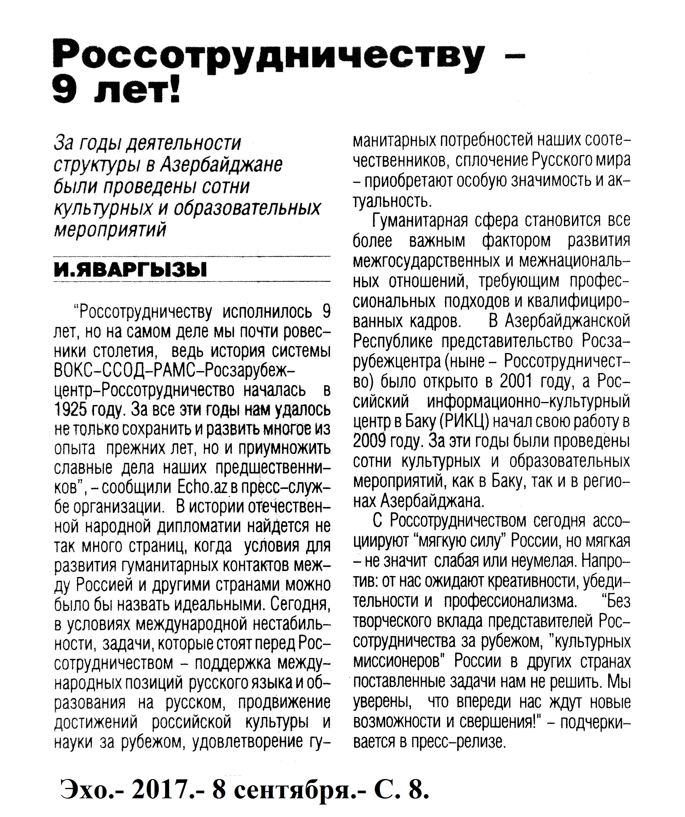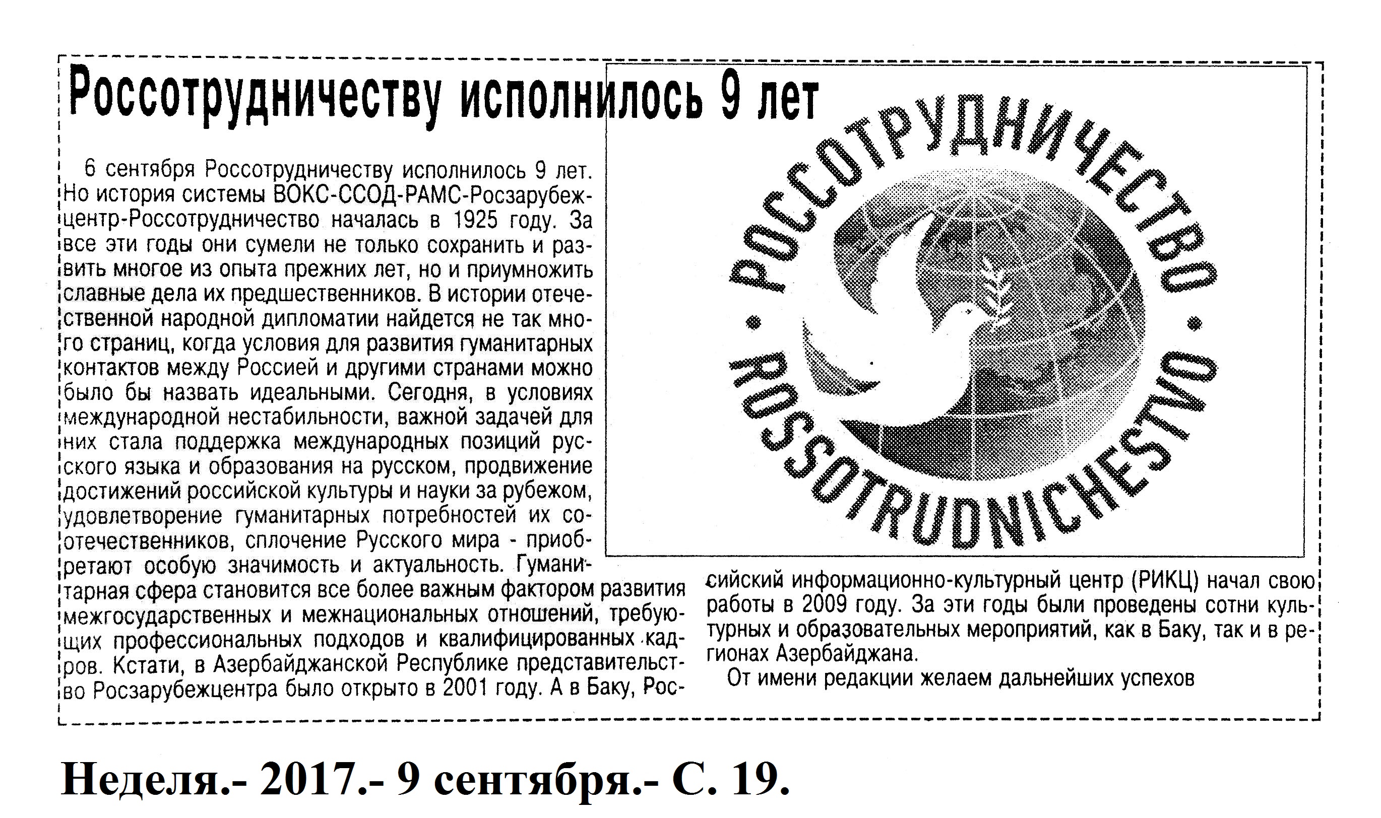 КУЛЬТУРНЫЕ СВЯЗИ 705. Асад, И. «Крылья Мехико» и другие работы Хорхе Марина: [о выставке мексиканского скульптора в Центре Гейдара Алиева] //Эхо.- 2017.- 7 сентября.- С.8. 706. Асад, И. Француз, который играет все, выступит в Баку: [аккордеонист Ришар Гальяно] //Эхо.- 2017.- 20 сентября.- С.8. 707. Асадова, И. Мечты российского фотохудожника об Азербайджане: [выставка С.Комковой в галерее NUR Art House] //Эхо.- 2017.- 21 сентября.- С.8. 708. Бадалова, А. Наши в Бруклине: «Новый рубеж» пропагандирует родной Азербайджан: [беседа с руководителем Центра творческого развития детей My Way] /провел Т.Мамедов //Каспiй.- 2017.- 23 сентября.- С.12-13. 709. Буланова, О. Азербайджанские книги в Пекине: [о 24-ой Международной книжной ярмарке в Китае] //Эхо.-2017.- 1 сентября.- С.8. 710. В Волгограде прошел фестиваль азербайджанской культуры: [организованный местным отделением АМОР] //Бакинский рабочий.- 2017.- 19 сентября.- С.6. 711. В Самарканде прошел международный семинар на тему «Великие моменты диалога в истории человечества»: [XI Международный музыкальный фестиваль «Шарк тароналары»] //Вышка.- 2017.- 1 сентября.- С.8. 712. Гаджиева, Л. Все краски Страны утренней росы: В Габале состоялся фестиваль, посвященный 25-летию установления дипломатических отношений между Азербайджаном и Республикой Корея //Азербайджанские известия.- 2017.- 21 сентября.- С.3. 713. Глебова, Л. Ключевой фактор: Россотрудничество: Русский язык в Азербайджане чувствует себя уверенно //Каспiй.- 2017.- 14 сентября.- С.13. 714. Иосиф Кобзон: Признание моих заслуг Президентом Азербайджана для меня очень дорого //Бакинский рабочий.- 2017.- 13 сентября.- С.6. 715. Кязимова, С. История Моцарта и Сальери:The British Council Azerbaijan продолжает показ самых успешных спектаклей лучших театров Великобритании //Азербайджанские известия.- 2017.- 16 сентября.- С.3. 716. Кязимова, С. Яркие краски Индонезии: [открытие Второго фестиваля культуры Индонезии во Дворце Гeйдapа Aлиeва] //Азербайджанские известия.- 2017.- 12 сентября.- С.1. 717. Манафов, Р. «Жемчужины этнической музыки»: [концерт с участием фольклорных коллективов Молдовы в Центре Мугама] //Эхо.- 2017.- 15 сентября.- С.8. 718. На телеканале «Euronews» состоялся показ сюжета о музыкальных традициях Азербайджана //Бакинский рабочий.- 2017.- 7 сентября.- С.10. 719. Новая постановка пьесы Эльчина «Шекспир» в Италии: [режиссер-постановщик Патриция Ди Фильвиани] //Бакинский рабочий.-2017.- 20 сентября.- С. 6. 720. Нуриев, М. Наши на Апеннинах: Маис Нуриев: У итальянцев много общего с азербайджанцами: [беседа с руководителем культурной ассоциации «Азери» в Италии] /провел: Т.Мамедов //Каспий.- 2017.- 16 сентября.- С.12-13. 721. Подкорытова, У. Первый резидент: Ульяна Подкорытова-пионер Gogova Foundation Artists Residency: [беседа с художником из России] //Каспiй.- 2017.- 8 сентября.- С. 13. 722. Россотрудничеству исполнилось 9 лет! //Неделя.- 2017.- 8 сентября.- С. 19. 723. Свердловская областная общественная организация «Азербайджан» представлена на Дне народов Среднего Урала //Бакинский рабочий.- 2017.- 7 сентября.- С.8. 724. Толстой, В. Владимир Толстой, советник президента России: «Азербайджан своей внешней и внутренней (духовной) красотой вдохновлял многих русских поэтов и писателей» //Азербайджанские известия.- 2017.- 23 сентября.- С.3. 725. Чернова, Т. Саша из фильма «Бахтияр»: [беседа с российской актрисой Т. Черновой] //Вышка.- 2017.- 22 сентября.- С.12. 726. Чернова, Т. Тамара Чернова, актриса (Россия): «Никогда не чувствовала себя чужой в Баку» /интервью провел В.Иманов //Азерба