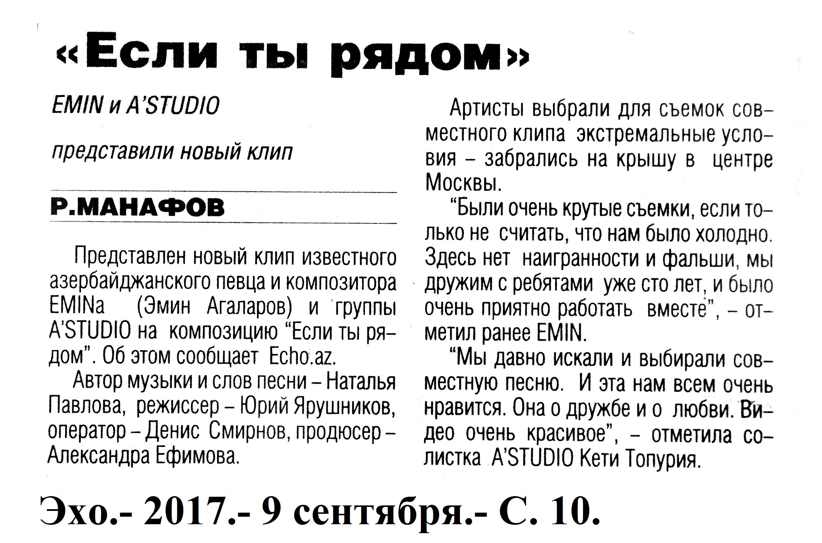 ЭСТРАДА. ЦИРК 796. Асадова, И. «Кубок Каспия наш!»: Команда КВН «Сборная Баку» обыграла всех в Дагестане //Эхо.-2017.- 20 сентября.- С. 8. 797. Алмасова, Э. Уникальный создатель джаз-мугама: [памяти Вагифа Мустафазаде] //Мир литературы.-2017.- №07(121) сентябрь.- С. 14. 798. Асадова, И. «Сборная Баку»: От Ельца до Кремля: [команда в Высшей лиге КВН] //Эхо.-2017.- 16 сентября.- С. 10. 799. Велиева, Н.Женщина, которая поет: В Crystal Hall прошел «концерт всей жизни» Айгюн Кязимовой //Азербайджанские известия.-2017.- 30 сентября.- С. 3. 800. Кадыров, Э. Эмиль Кадыров, певец: «На всех конкурсах я представлял страну, в которой родился. И это – Азербайджан» //Азербайджанские известия.-2017.- 30 сентября.- С. 3. 801. Манафов, Р. «Если ты рядом»: Эмин и А Студио представили новый клип //Эхо.-2017.- 9 сентября.- С. 10.