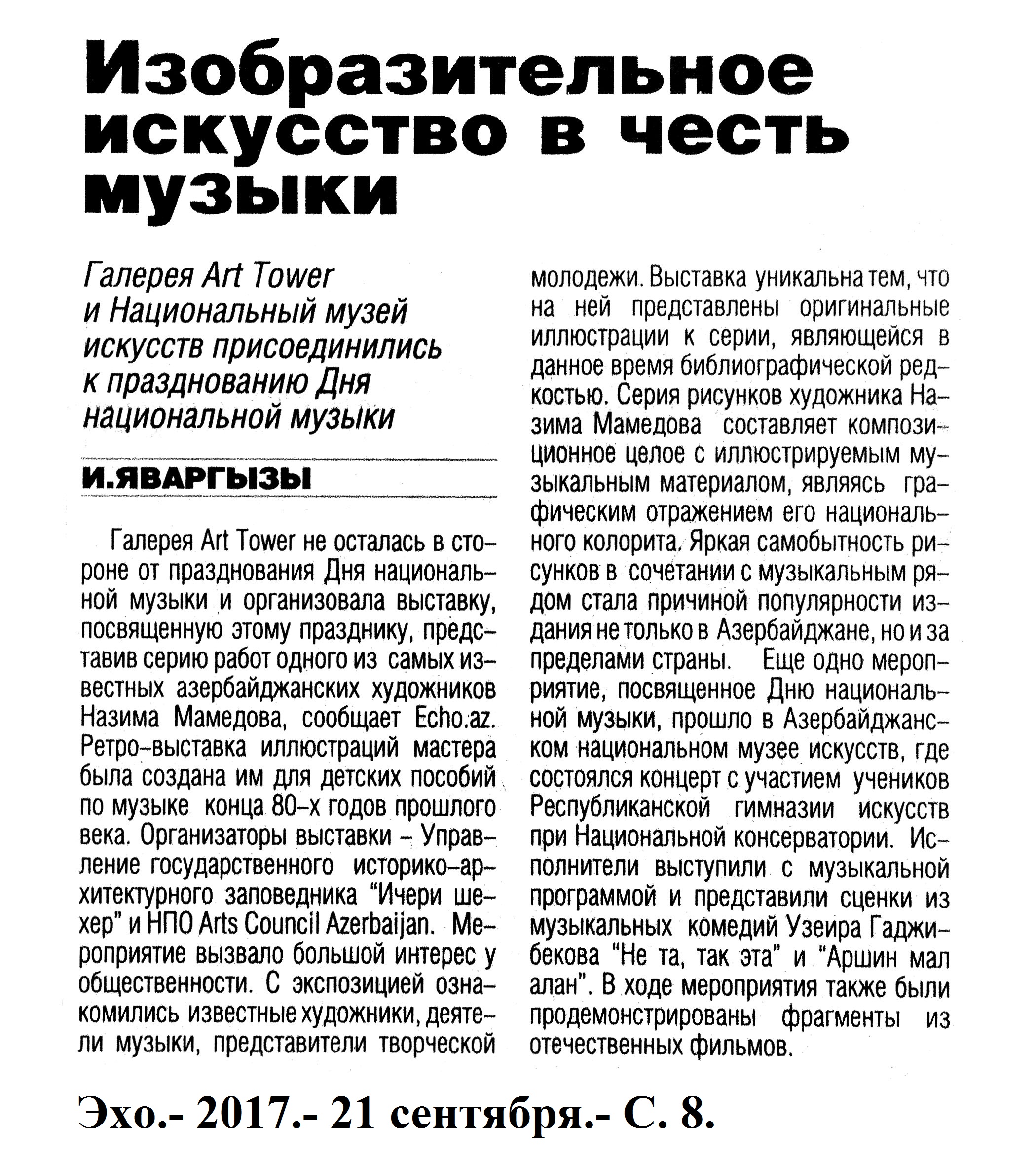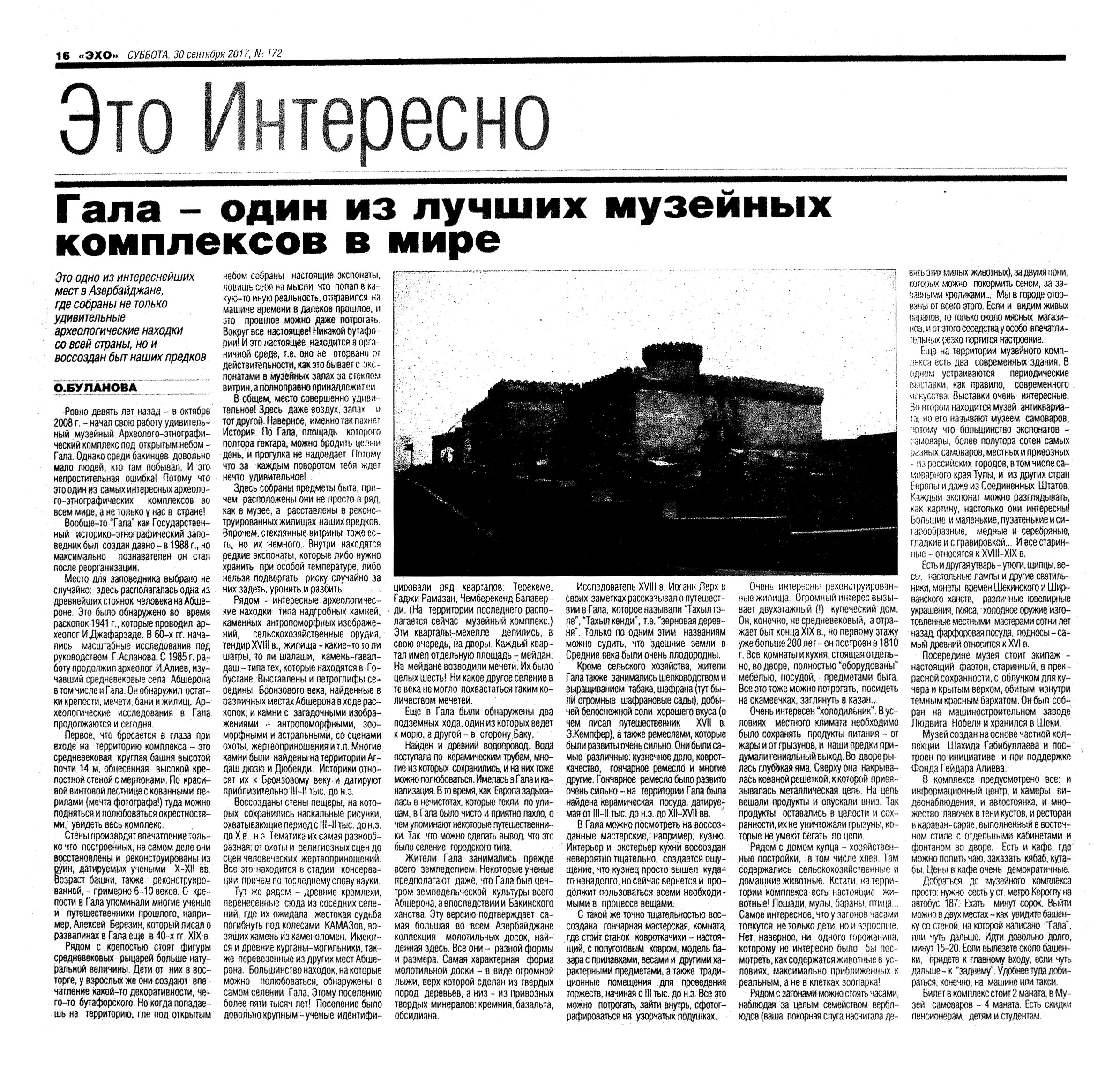 ПАМЯТНИКИ ИСТОРИИ И КУЛЬТУРЫ 745. Багирова, М. Бронзовый скипетр из кургана: Последняя находка азербайджанских археологов на территории Дашкесанского района датируется ХII-XI веками до нашей эры //Азербайджанские известия.- 2017.- 21 сентября.- С.3. 746. Буланова, О. Гала-один из лучших музейных комплексов в мире //Эхо.- 2017.- 30 сентября.- С.16. 747. Буланова, О. Путешественники прошлого об Азербайджане //Эхо.- 2017.- 16 сентября.- С.16. 748. Буланова, О. Путешествие по маякам Абшерона: Самые старые построены во второй половине XIX века //Эхо.- 2017.- 23 сентября.- С.16. ИСКУССТВО 749. Асадова, И. Пленэры и мастер-класс как источники вдохновения: [в галерее Art Tower проходит выставка живописи под названием «Абшерон»] //Эхо.- 2017.- 27 сентября.- С.8. 750. В галерее Art Tower открылась выставка, посвященная Абшерону //Бакинский рабочий.-2017.- 28 сентября.- С.3. 751. Вице-президент Фонда Гейдара Алиева Лейла Алиева побывала в Государственной Академии художеств //Бакинский рабочий.-2017.- 16 сентября.- С.5. 752. Кязимова, С. Вечная сказка Девичьей башни: В VII фестивале искусств «Гыз галасы» приняли участие юные художники //Азербайджанские известия.-2017.- 28 сентября.- С.4. 753. Манафов, Р. YARAT представит выставку «Дальние горизонты»: [работы молодых художников в Центре современного искусства] //Эхо.- 2017.- 12 сентября.- С.8. 754. Микеладзе, Г. Я бы в зрители пошел - пусть меня научат: Об акции Министерства молодежи и спорта «Творческая лаборатория» //Каспiй.- 2017.- 9 сентября.- С.16-17.