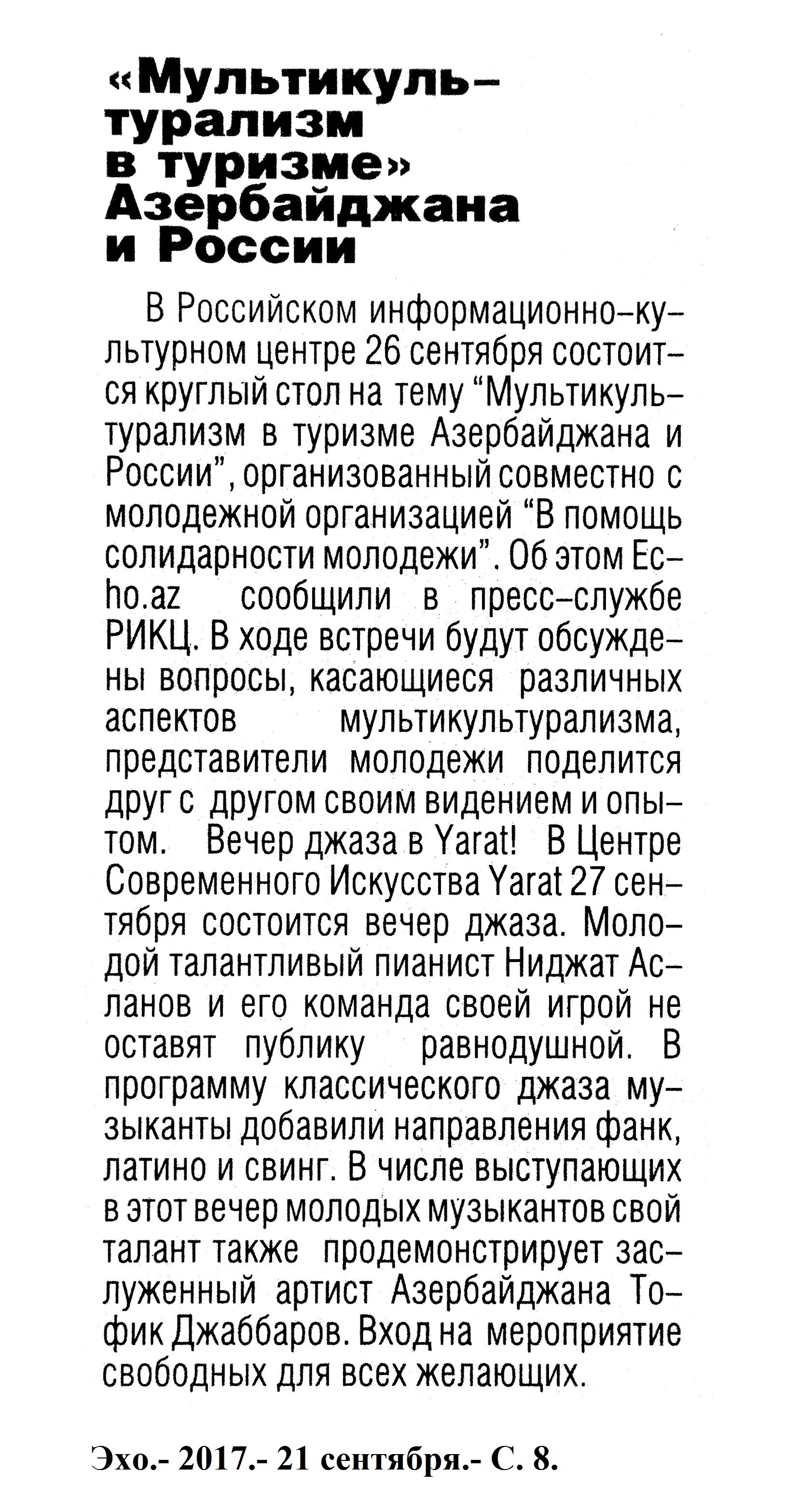 “Multikulturalizm” 35. Ali məktəblər üçün nəzərdə tutulan “Azərbaycan multikulturalizmi” kitabının təqdimatı olub: [Bakı Beynəlxalq Multikulturalizm Mərkəzində (BBMM)] //Yeni Azərbaycan.- 2017.- 23 sentyabr.- S. 7. 36. Azərbaycan dünyanın tanınmış multikulturalizm mərkəzlərindən biridir: [Bu fikri Azərbaycan Respublikasının Prezidenti İlham Əliyev sentyabrın 20-də Nyu-Yorkda BMT Baş Assambleyasının 72-ci sessiyasının açılışındakı çıxışı zamanı səsləndirib] //İki sahil.- 2017.- 26 sentyabr.- S.15. 37. Ömərov, V. Heydər Əliyev Azərbaycanın tolerant mədəniyyəti haqqında //Səs.- 2017.- 23 sentyabr.- S.15. 38. Turan, A. Azərbaycan İslam dünyasının ən nüfuzlu ölkələrindən birinə çevrilir //Xalq qəzeti.- 2017.- 24 sentyabr.- S.4. 39. Üzeyir Hacıbəyli haqqında yeni kitab: [Aida Tağızadənin tərtib etdiyi “Üzeyir Hacıbəyli”adlı kitabı haqqında] //İki sahil.- 2017.-28 sentyabr.-S.5.