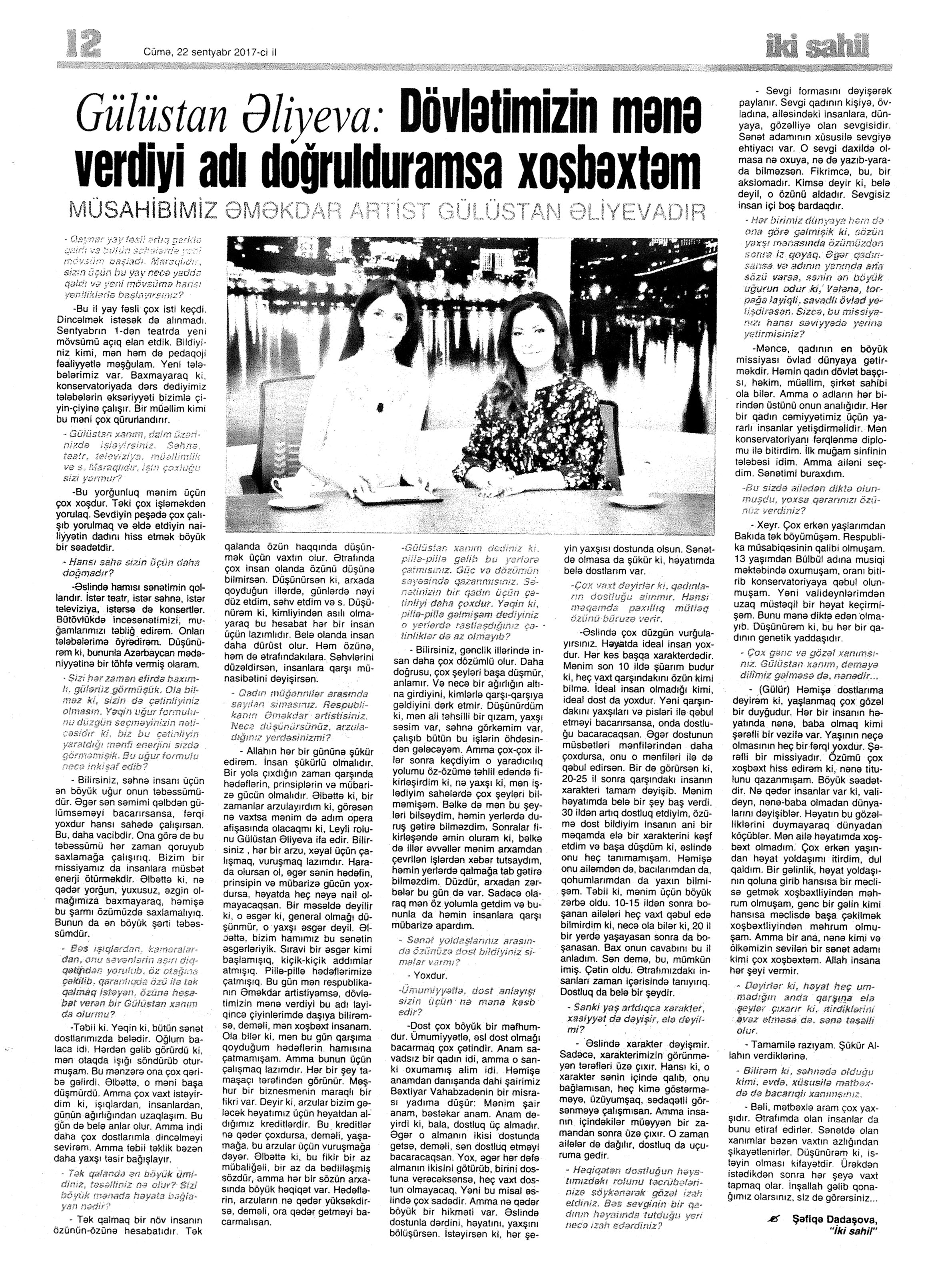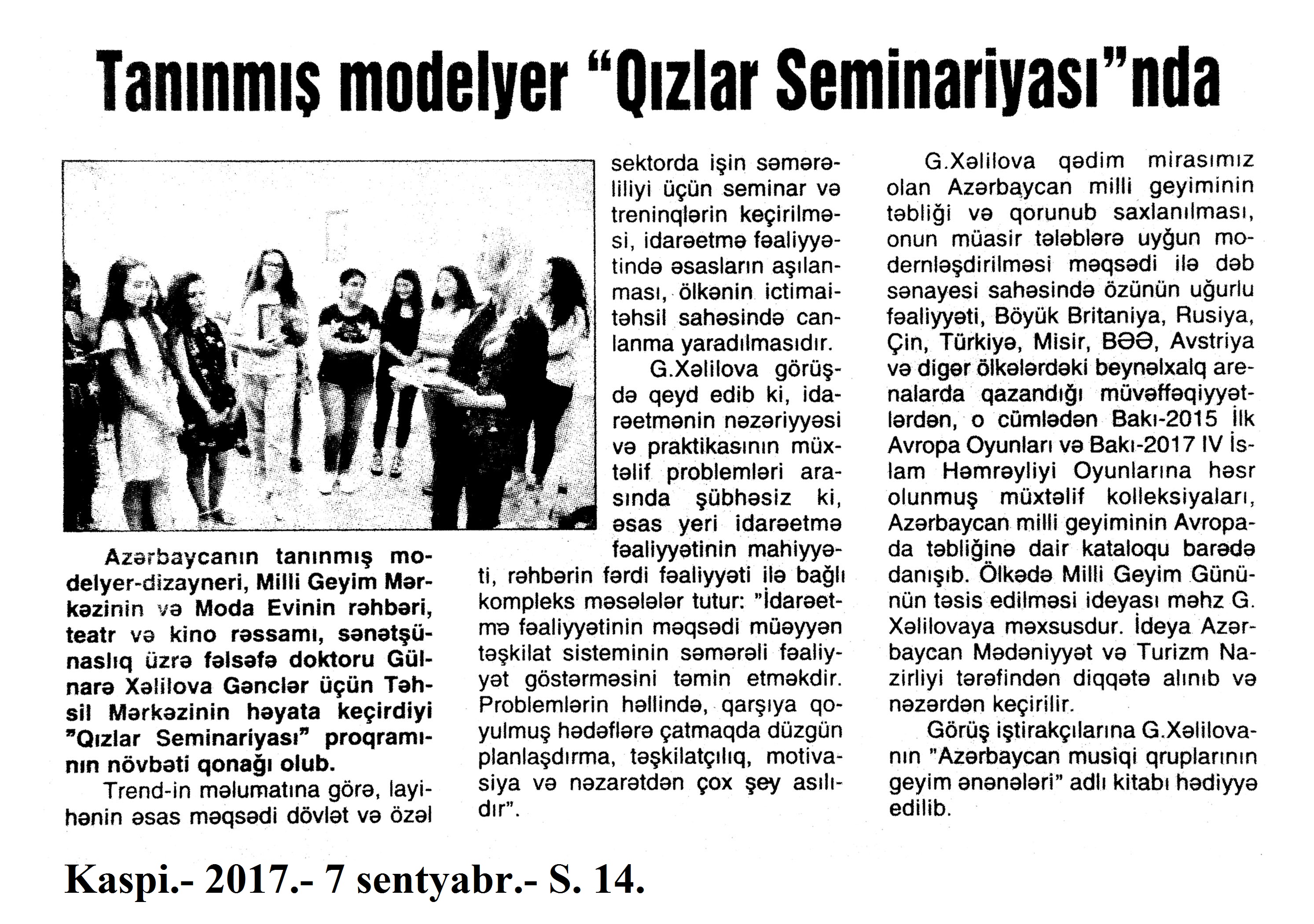 MODA VƏ DIZAYN 168. Tanınmış modelyer “Qızlar Seminariyası”nda: [teatr və kino rəssamı, sənətşünaslıq üzrə fəlsəfə doktoru Gülnarə Xəlilova haqqında] //Kaspi.- 2017.- 7 sentyabr.- S.14.