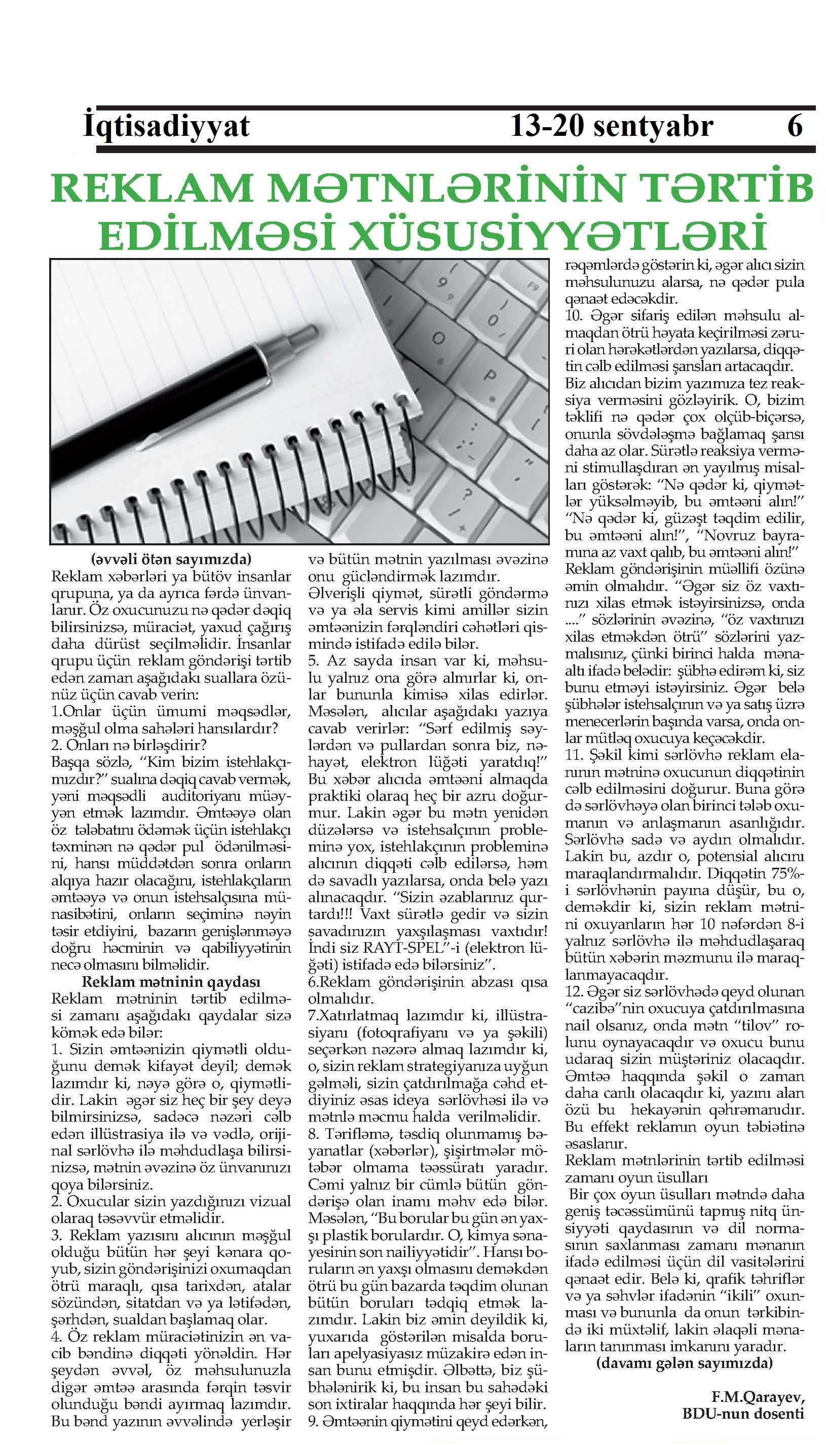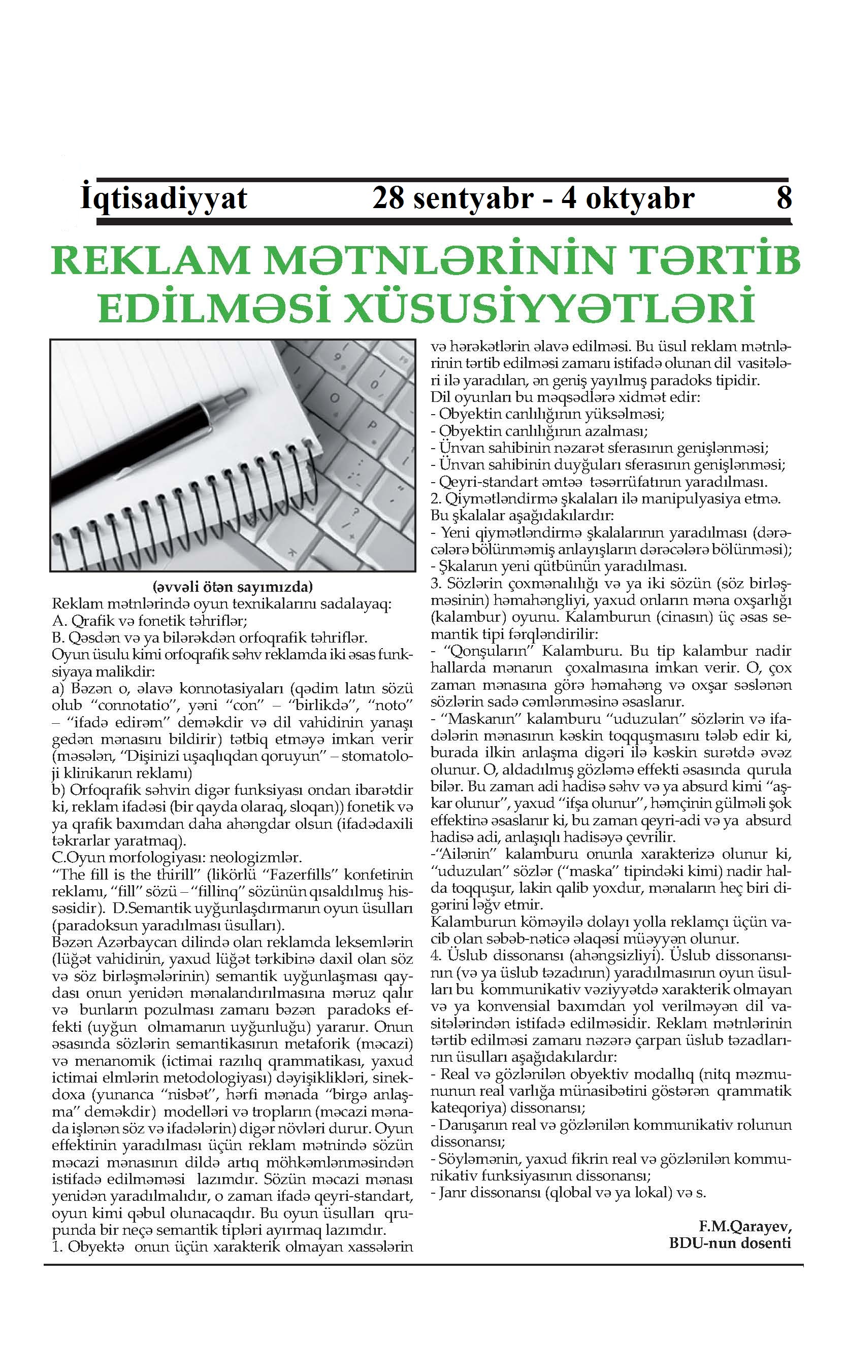 İNFORMASİYA VƏ REKLAM İŞİ 111. Qarayev, F. M. Reklam mətnlərinin tərtib edilməsi xüsusiyyətləri //İqtisadiyyat.- 2017.- 13-20 sentyabr.- S.6. 112. Qarayev, F. M. Reklam mətnlərinin tərtib edilməsi xüsusiyyətləri //İqtisadiyyat.- 2017.- 28 sentyabr - 4 oktyabr.- S.8.
