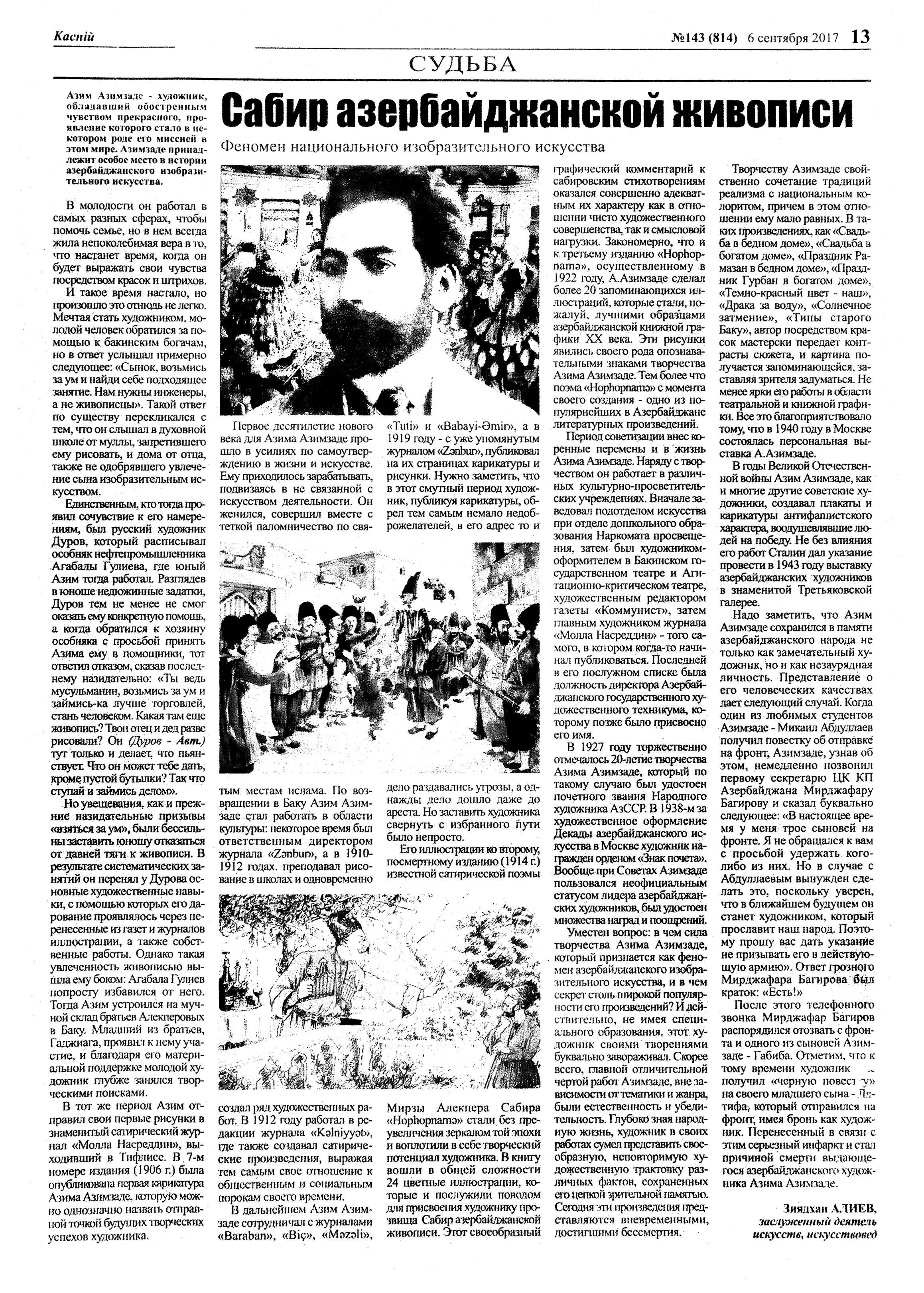 ГРАФИКА 765. Алиев, З. Сабир азербайджанской живописи: [о жизни и творчестве художника Азима Азимзаде] //Каспiй.- 2017.- 6 сентября.- С.13. 766. Алиев-Кенгерли, Р. Грани таланта: Первая женщина - театральный художник в Нахчыване: [о творчестве Физзы Гулиевой] //Каспiй.- 2017.- 28 сентября.- С.13.