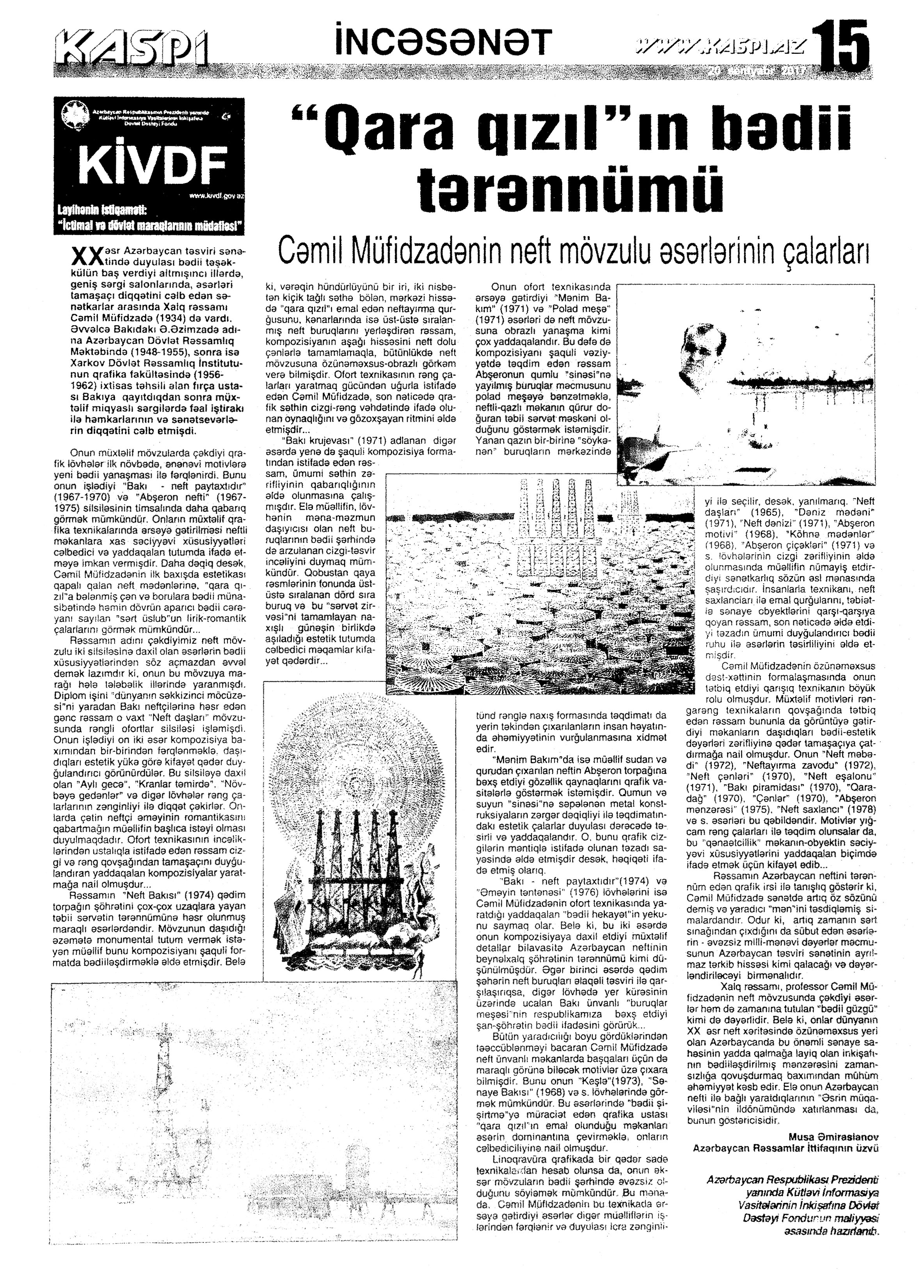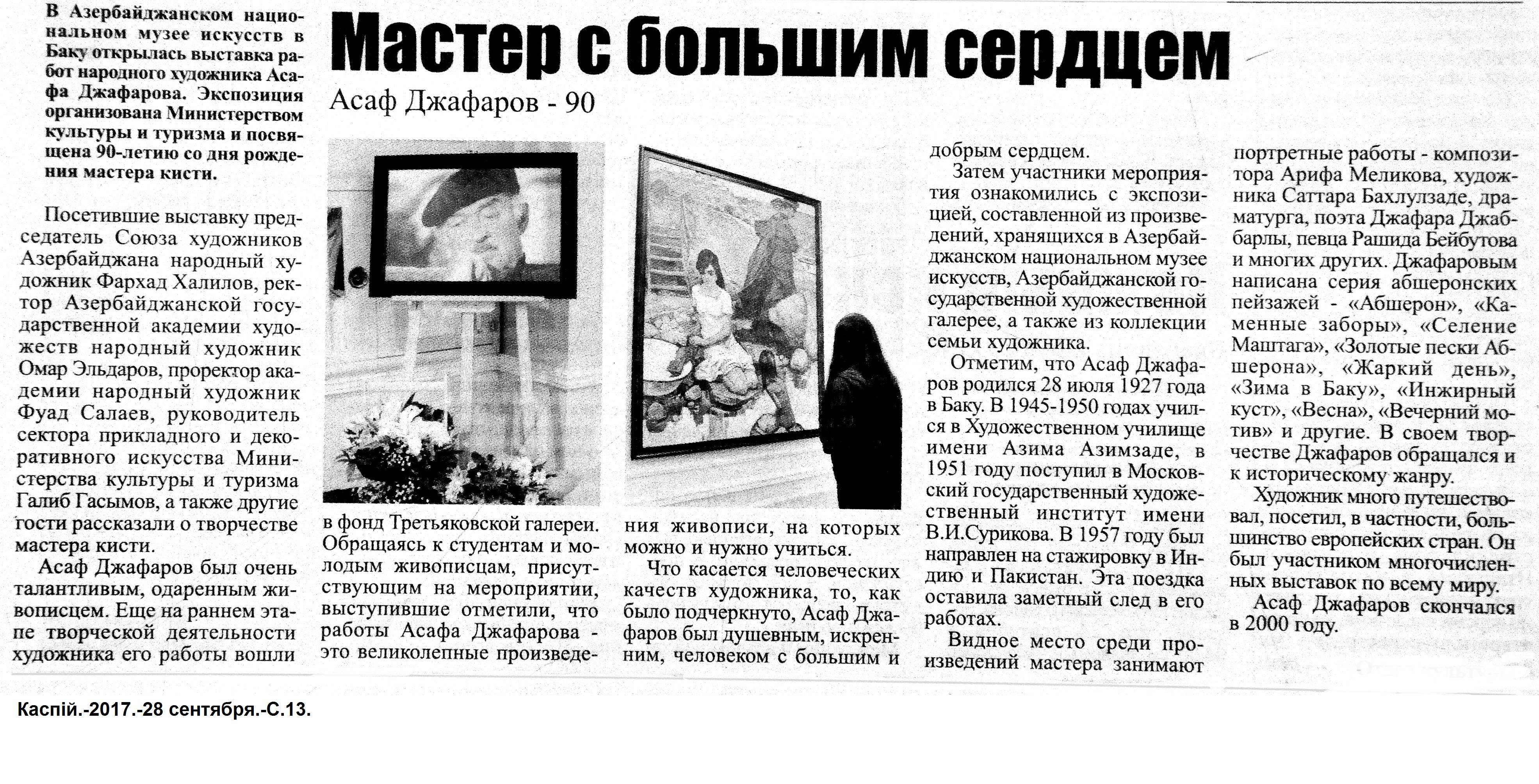 ИЗОБРАЗИТЕЛЬНОЕ ИСКУССТВО 755. Алиев, З. Свежее дыхание реализма: О видном азербайджанском портретисте Теймуре Рзаеве //Каспiй.- 2017.- 13 сентября.- С.13. 756. Асадова, И. Еще одна выставка в рамках Art PAYIZ: [художник Тамилла Гасанова в Port Baku Mall] //Эхо.- 2017.- 28 сентября.- С.8. 757. Выставка работ молодой азербайджанской художницы Тамиллы Гасановой откроется в Баку //Бакинский рабочий.- 2017.- 27 сентября.- С.7. 758. Мастер с большим сердцем: Асаф Джафаров [памяти художника] //Каспiй.- 2017.- 28 сентября.- С.13. 759. Нариманбекова, Н. Нигяр Нариманбекова оживит поэзию великого Низами /беседу с художником провела И.Асадова //Эхо.- 2017.- 29 сентября.- С.8.