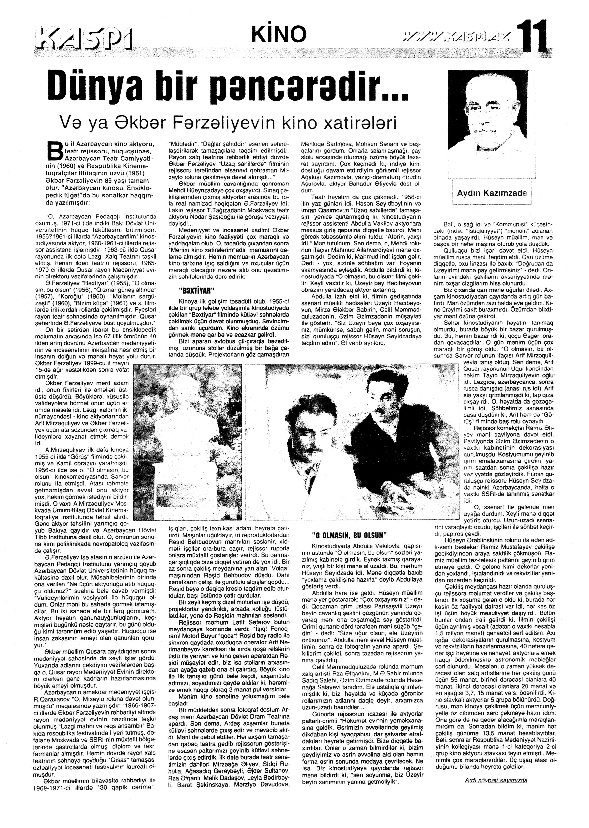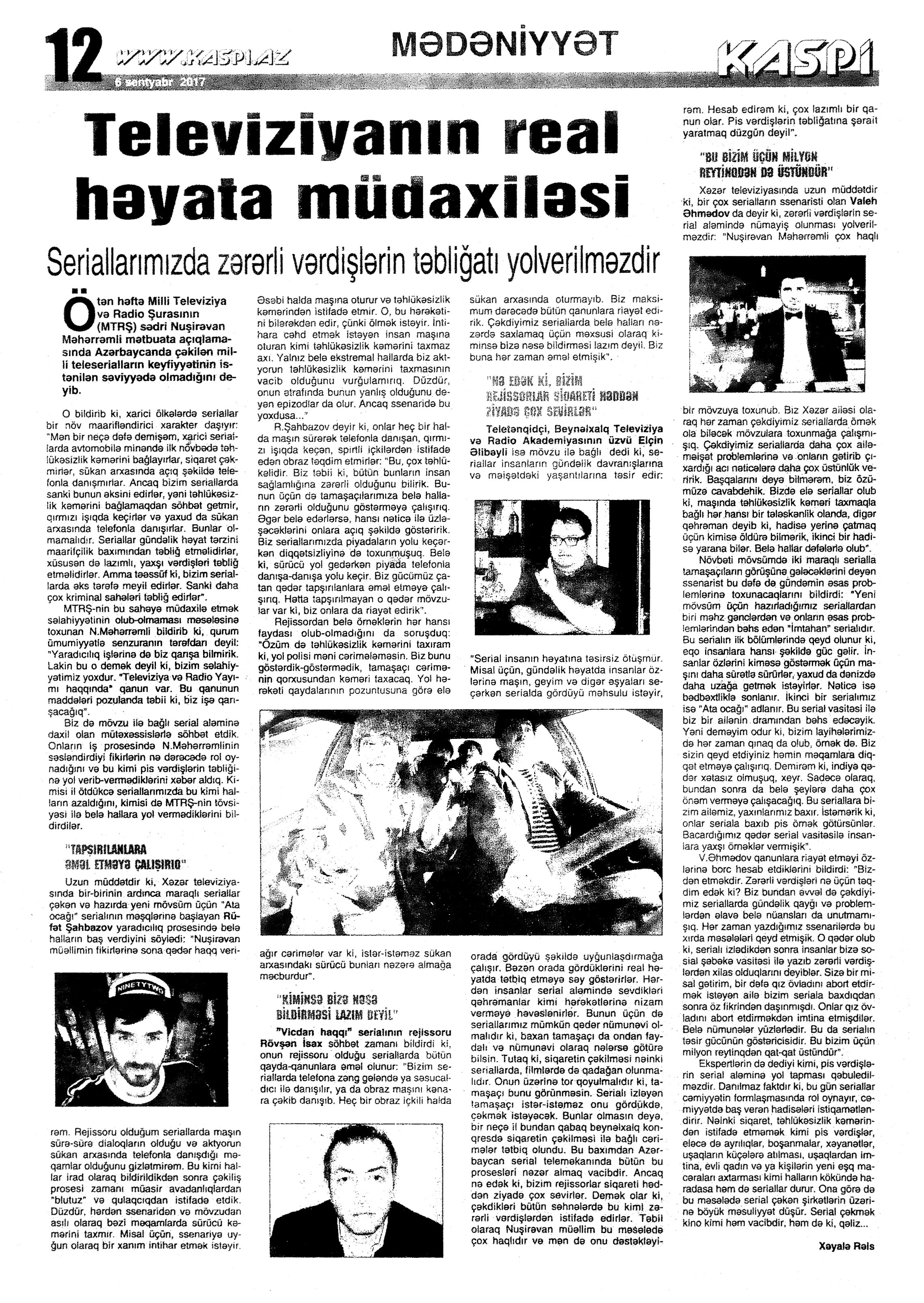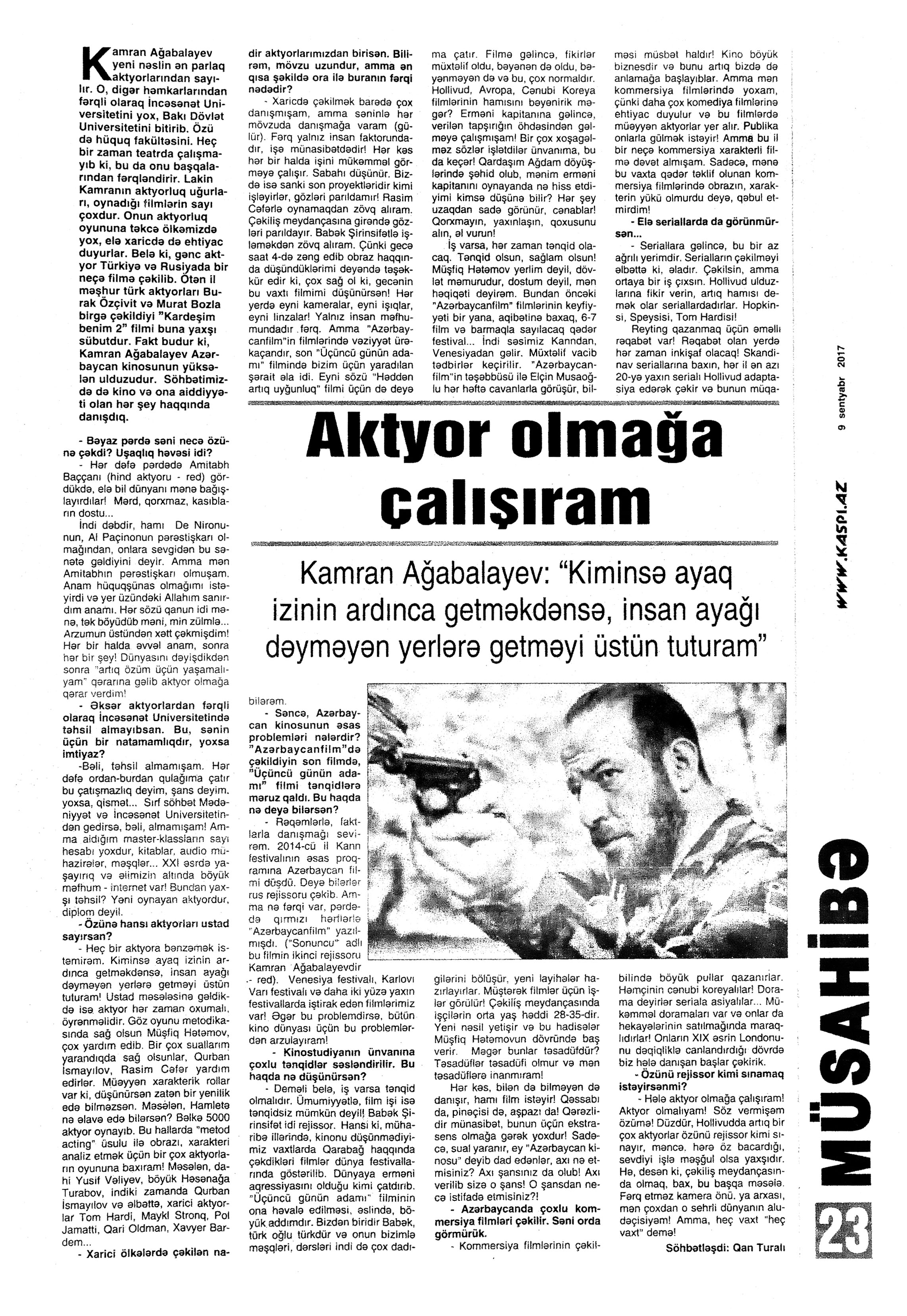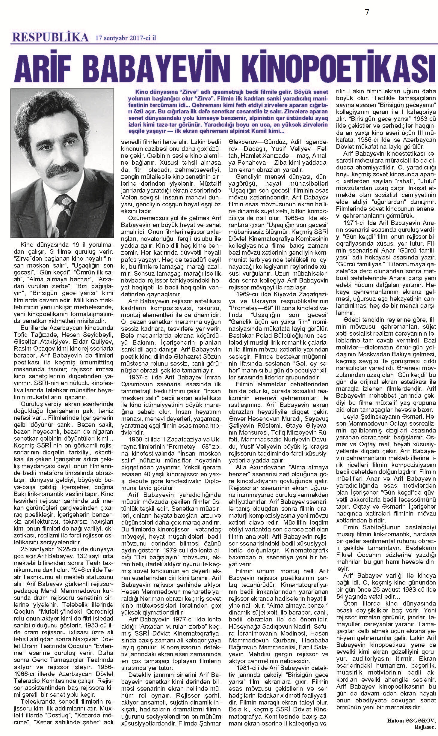 KİNO 277. Ağabalayev, K. Aktyor olmağa çalışıram: [kinoaktyor Kamran Ağabalayevlə müsahibə] /müsahibəni apardı Qan Turalı //Kaspi.- 2017.- 9 sentyabr.- S.16. 278. Azəri, L. Kino işinin təşkili və milli kinematoqrafın inkişaf etdirilməsi: [Kino Mərkəzində Mədəniyyət və Turizm nazirinin müavini Ədalət Vəliyevin gənc kinematoqrafçılarla keçirdiyi görüş haqqında] //Mədəniyyət.- 2017.- 13 sentybar.- S.4. 279. Elcanlı, S. Öz yolunun sahibi Sahib: [rejissor Sahib Əhmədov haqqında] //Olaylar.- 2017.- 23-25 sentyabr.- S.12. 280. Əskərov, H. Arif Babayevin kinopoetikası: [rejissor Arif Babayevin yaradıcılığı haqqında] //Respublika.- 2017.- 17 sentyabr.- S. 7. 281. Fərəcova, Z. Kino mövsümü başlayır: Vətənpərvərlik mövzusunda çəkilmiş ekran əsərlərinə üstünlük veriləcək //Azərbaycan.- 2017.-15 sentyabr.- S. 11. 282. İsmayılov, H. “Bizim sənət asılı sənətdir”: [Xalq artisti Hacı İsmayılovun müsahibəsi] /müsahibəni apardı Tahirə Məmmədqızı //Şərq.- 2017.- 23 sentyabr.- S.13. 283. Kazımzadə, A. Dünya bir pəncərədir...: [kinoaktyor, teatr rejissoru Əkbər Fərzəliyevin 85 illik yubileyi haqqında] //Kaspi.- 2017.- 26 sentyabr.- S.6. 284. Kazımzadə, A. Dünya bir pəncərədir...: Və ya Əkbər Fərzəliyevin kino xatirələri: [kinoaktyor, teatr rejissorunun 85 illik yubileyi ilə bağlı] //Kaspi.- 2017.- 20 sentyabr.- S.11. 285. Qurbanlı, R. O, özü “son rolunu” oynadı...: [Xalq artisti Həsən Məmmədov haqqında] //Üç nöqtə.- 2017.- 20 sentyabr.- S.12. 286. Lalə. “Yarımçıq xatirələr” filmi mühafizə alayının əsgərləri üçün nümayiş olunub: [Elxan Cəfərovun çəkdiyi eyniadlı film haqqında] //Mədəniyyət.- 2017.- 27 sentyabr.- S.6. 287. Mükərrəmoğlu, M. Ölkəmizdə kino mövsümünə start verildi: Paytaxt və bölgələrdə 242 mədəniyyət müəssisəsində kino nümayişi keçirilir //Xalq qəzeti.- 2017.- 21 sentyabr.- S.4. 288. Mükərrəmoğlu, M. Tariximizin kino salnaməçisi: [Xalq artisti Muxtar Dadaşov haqqında] //Xalq qəzeti.- 2017.- 17 sentyabr.- S.6. 289. Müşfiq, Ş. Səhnədə və ekranda möcüzələr silsiləsi: Siyavuş Aslan sənəti //525-ci qəzet.- 2017.- 9 sentyabr.- S.12. 290. Nəcəf, İ. Mən o filmə ürəyimi qoymuşdum: [Kinorejissor İlqar Nəcəf ilə müsahibə] /müsahibəni apardı Samirə Əşrəf //Ədəbiyyat qəzeti.- 2017.- 30 sentyabr.-S.26. 291. Pərvin. “Bu, KİNOdu...”: Azərbaycan kinosu – 120 //525-ci qəzet.- 2017.- 16 sentybar.- S.9. 292. Rəis, X. Televiziyanın real həyata müdaxiləsi: Seriallarımızda zərərli vərdişlərin təbliğatı yolverilməzdir //Kaspi.- 2017.- 6 sentyabr.- S.12. 293. Sarıyeva, İ. Milli Qəhrəmanlar haqda çəkılən sənədli filmlərdə nələr çatışmır? //Bakı xəbər.- 2017.- 29 sentyabr.- S.14. 294. Sarıyeva, İ. Müasir milli kinomuzun bölgələrdə nümayişinə start verilib...: [kinoşünas Aydın Kazımzadənın fikirləri] //Bakı xəbər.- 2017.- 21 sentyabr.- S. 15. 295. “Səs” qısametrajlı bədii filmi beynəlxalq festivalda: [Rusiya Federasiyası Tatarıstan Respublikasının paytaxtında XIII Kazan Beynəlxalq Müsəlman Kinofestivalında] //Mədəniyyət.- 2017.- 6 sentyabr.- S.3. 296. “Şəhadət” gənclərin vətənpərvərlik ruhunda tərbiyəsinə töhfədir: [rejissoru və ssenari müəllifi Nadir Bədəlov olan eyniadlı filmin Dövlət Təhlükəsizlik Xidmətinin Mədəniyyət Mərkəzində düzənlənən təqdimatı haqqında] //Azərbaycan.- 2017.- 23 sentyabr.- S.7. 297. Turqut, T. Cocuq Mərcanlı haqqında filmin təqdimatı keçirilib: [“İlham Əliyev bizi Cocuq Mərcanlıya qaytardı” kitabının və “Böyük Qayıdışın başlanğıcı” – Cocuq Mərcanlı” filminin təqdimatı haqqında] //İki sahil.- 2017.- 22 sentyabr.- S.6. 298. Vəliyev, Ə. “Həyata keçiriləcək tədbirlərin kinoya tamaşaçı marağını artıracağına inanıram”: [Mədəniyyət və Turizm nazirinin müavini Ədalət Vəliyevin müsahibəsi] //Mədəniyyət.- 2017.- 15 sentybar.- S.6-7.