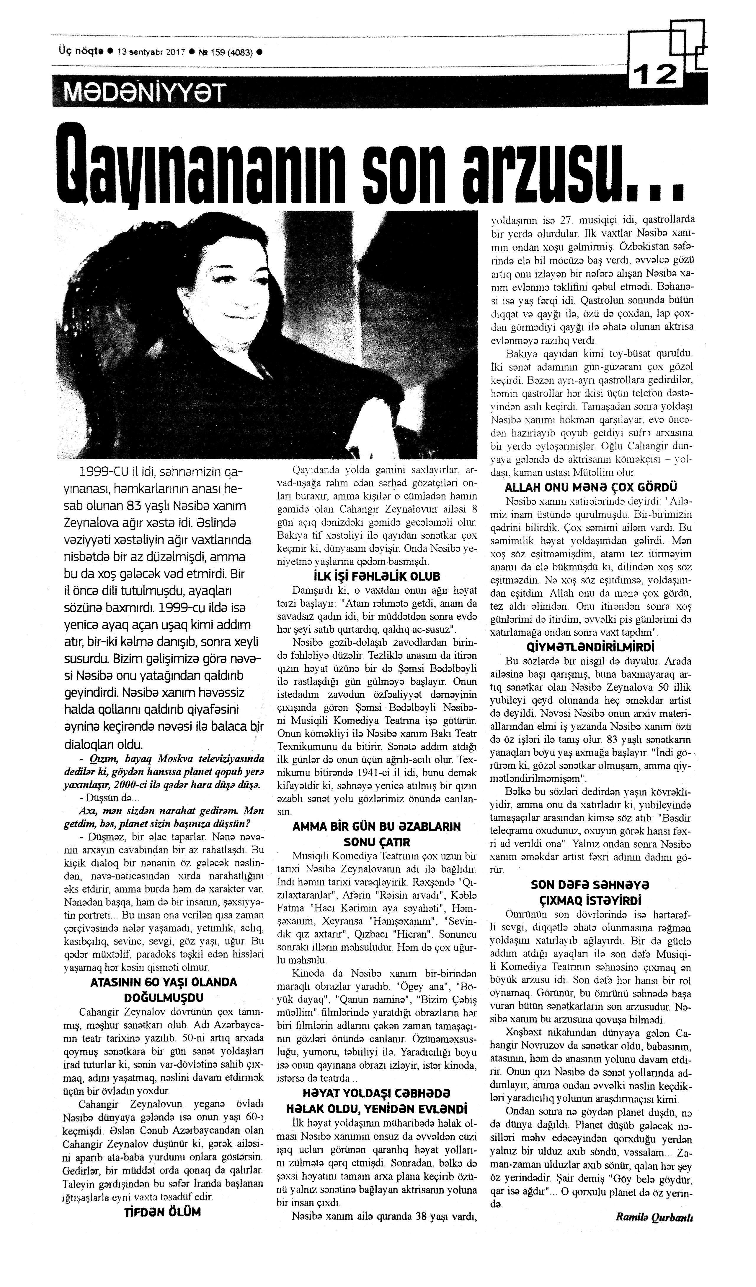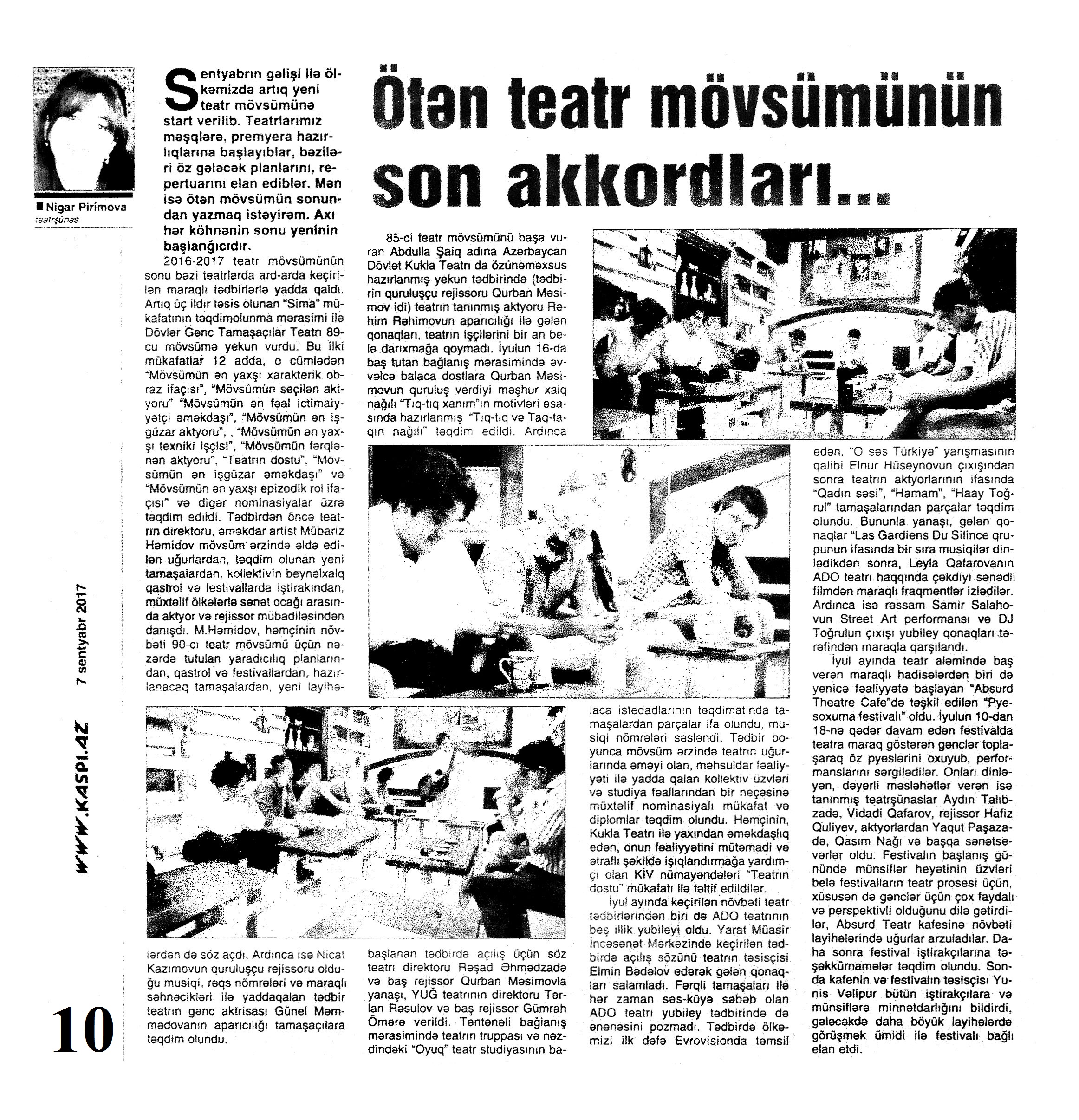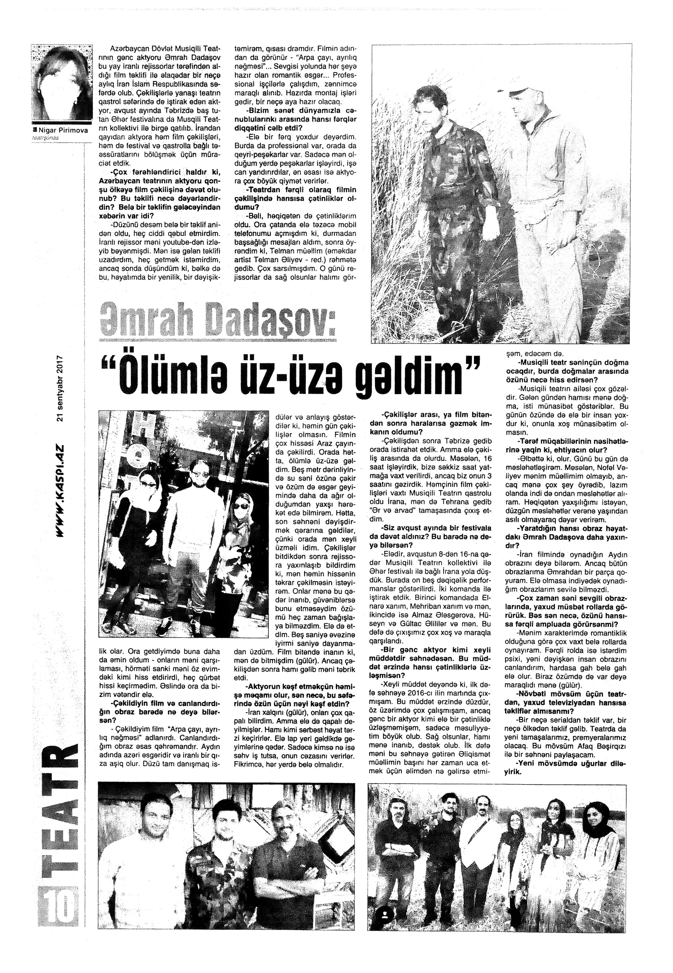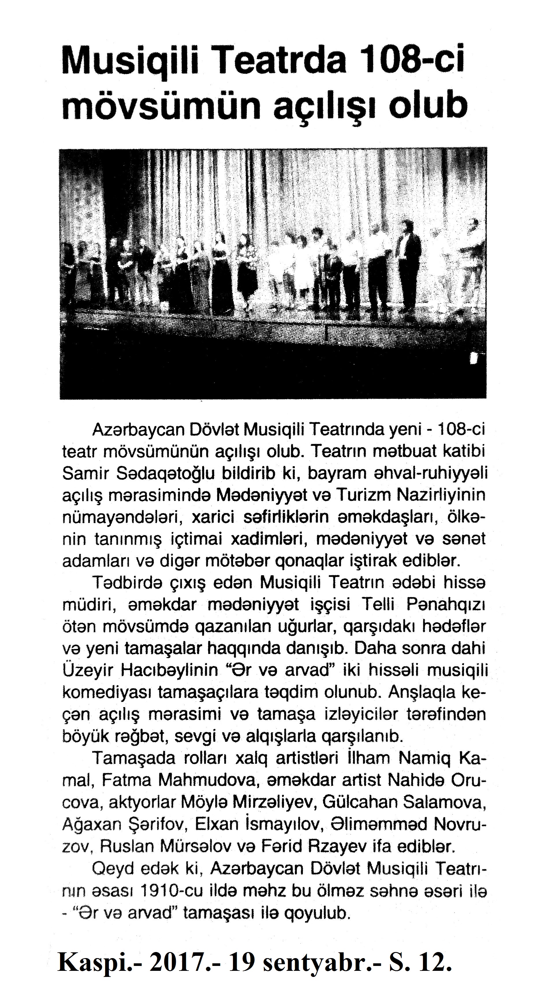 Azərbaycan Dövlət Musiqili Teatrı 341. Bayramlı, M. Musiqili Teatrı yeni mövsümü “Ər və arvad” tamaşası ilə açıb //Yeni Azərbaycan.- 2017.- 19 sentyabr.- S.7. 342. Əmrah Dadaşov: “Ölümlə üz-üzə gəldim”: [teatrın aktyoru ilə müsahibə] /müsahibəni apardı Nigar Pirimova //Kaspi.- 2017.- 21 sentyabr.- S.10. 343. Qurbanlı, R. Qayınananın son arzusu...: [Xalq artisti Nəsibə Zeynalova haqqında] //Üç nöqtə.- 2017.- 13 sentyabr.- S.-12. 344. Musiqili Teatrda 108-ci mövsümün açılışı olub //Kaspi.- 2017.- 19 sentyabr.- S.12. 345. Pənahqızı, T.. 108 illik sənət və sevgi tarixçəsi: [teatrın fəaliyyəti haqqında] //525-ci qəzet.- 2017.- 14 sentyabr.- S.8.