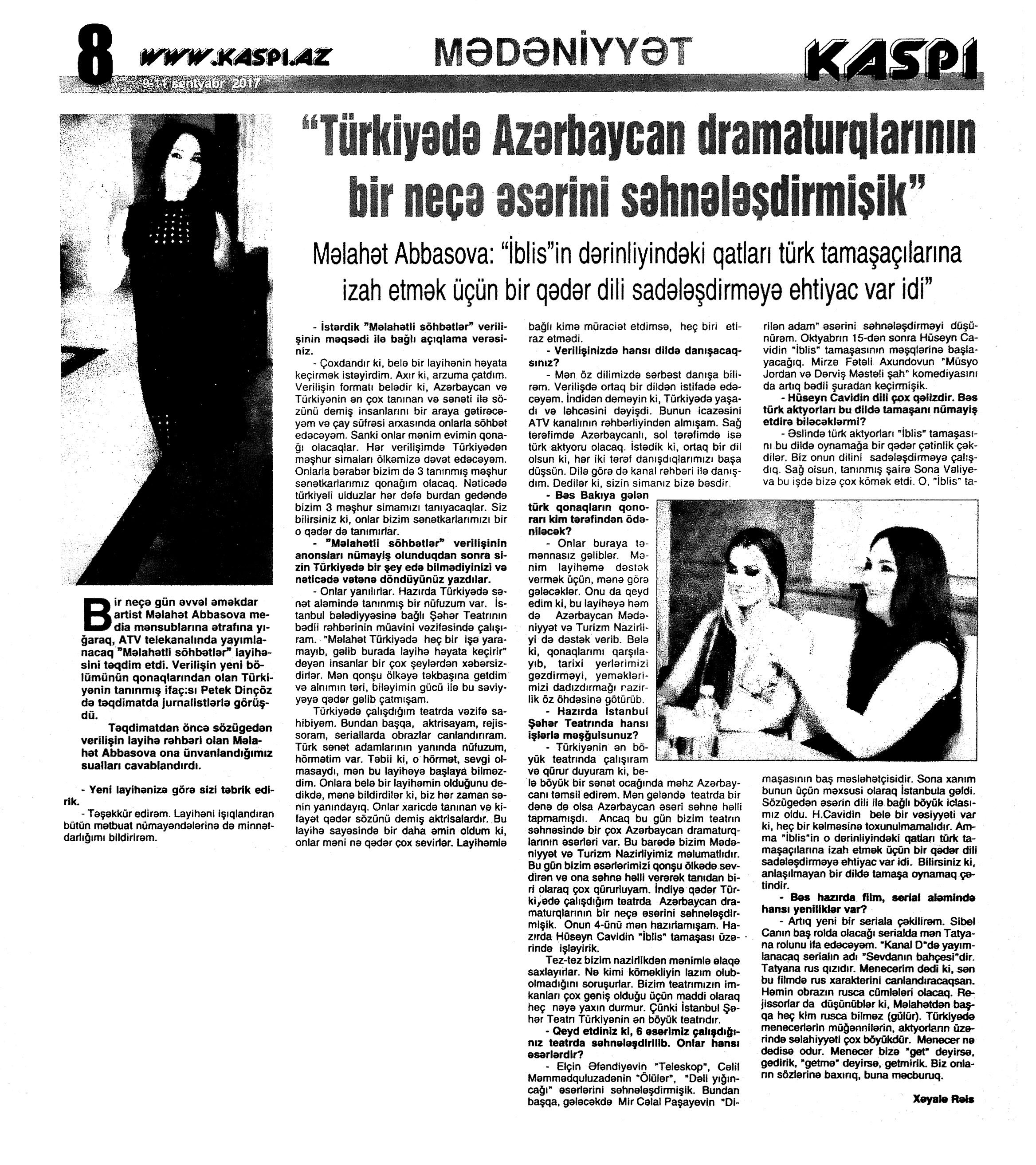 TEATR 299. Abbaslı, T. Harada... iş - orada baş: Dövrünün ədəbiyyat, mədəniyyət, ictimaiyyət aləmi azmanlarından Sabit Rəhman //Mədəniyyət.- 2017.-27 sentyabr.- S.13. 300. Abbasova, M. “Türkiyədə Azərbaycan dramaturqlarının bir neçə əsərini səhnələşdirmişik”: [Türkiyədə yaşayan həmyerlimiz, rejissor Məlahət Abbasova ilə müsahibə] /müsahibəni apardı Xəyalə Rəis //Kaspi.- 2015.- 9-11 sentyabr.- S.8. 301. Abdulla, E. “Əsgərlikdən gələndə mənimlə o qədər sadə görüşdü ki...”: [mərhum aktyor Fərman Şəkili ilə bağlı oğlunun müsahibəsi] /müsahibəni apardı Xəyalə Rəis //Kaspi.- 2017.- 14 sentyabr.- S.14. 302. Ağayev, N. “Əsl film həm kino peşəkarlarının diqqətini çəkməli, həm də kütlə tərəfindən sevilməlidir”: [rejissor, aktyor Namiq Ağayevlə müsahibə] /müsahibəni apardı Sərdar Amin //Ədəbiyyat qəzeti.- 2017.- 9 sentyabr.- S.14. 303. Aslan, V. Telefon zəngləri: Respublikamızın Əməkdar artisti, rejissor Mərdan Feyzullayevi düşünərkən //525-ci qəzet.- 2017.- 19 sentyabr.- S.8. 304. Babayev, A. Səhnədən deyilən söz təsirli olur: Teatrlarımız: [Lənkəran Dövlət Dram Teatrının aktyoru, Xalq artisti Qabil Mehdixanlı haqqında] //Azərbaycan.- 2017.-10 sentyabr.- S.5. 305. Bayramlı, M. Sənət ocaqları yeni mövsümdə tamaşaçılara nə vəd edir? //Yeni Azərbaycan.- 2017.- 30 sentyabr- S.7. 306. Bayramlı, M. Teatrlarımız yeni mövsümü açıb //Yeni Azərbaycan.- 2017.- 26 sentyabr.- S.7. 307. Fərəcov, S. Mədəniyyətə həsr olunan ömür: [Milli teatr sənətinin inkişafında xidmətləri olan ziyalılarımızdan biri Səkinə Axundzadə haqqında] //Mədəniyyət.- 2017.- 13 sentyabr.- S.15. 308. Füzuli Dram Teatrında yeni mövsüm: [Asif Şirinovun hazırladığı “Özümüz bilərik” tamaşasının nümayişi haqqında] //Mədəniyyət.- 2017.-29 sentyabr.- S.4. 309. Hacıyev, Ə. “Teatr canlı orqanizmdir, sevgiyə ehtiyacı var”: [Azərbaycan Dövlət Rus Dram Teatrının direktoru Ədalət Hacıyevin müsahibəsi] /Müsahibəni apardı Mirməmməd, Gülcahan //Mədəniyyət.- 2017.- 15 sentyabr.- S.10. 310. Hüseynov, F. Teatr və konsert müəssisələrinin fəaliyyəti müzakirə olunub: [Rəşid Behbudov adına Azərbaycan Dövlət Mahnı Teatrında Mədəniyyət və Turizm nazirinin müavini Ədalət Vəliyevin iştirakı ilə] //Mədəniyyət.- 2017.- 15 sentyabr.- S.4. 311. İsmayıl. Məmməd İsmayılının əsərləri Rumıniya və Moldovada çap olunur: [Türkiyədə yaşayan yazıcı həmvətənimiz haqqında] //Şərq.- 2015.- 29 sentyabr.- S.12. 312. Qax Dövlət Kukla Teatrının 46-cı mövsümü: [Rahib Məmmədovun hazırladığı “Babamın nəsihəti” tamaşasının nümayişi haqqında] //Mədəniyyət.- 2017.- 22 sentyabr.- S. 7. 313. Qaliboğlu, S. Oyun – dünyanın dərk üsulu: [professor Füzuli Bayatın meydan tamaşaları haqqında fikirləri] //Mədəniyyət.- 2017.- 8 sentyabr.- S.11. 314. Qazax teatrı “Bəxtsiz cavan”la pərdəni açıb: [Musa Eyyubovun hazırladığı eyniadlı tamaşa haqqında] //Mədəniyyət.- 2017.- 22 sentyabr.- S. 7. 315. Mikayılov, M. Rejissor Mikayıl Mikayılov: “İlk cümləni oxuyan kimi anamı düşündüm”: [rejissorla müsahibə] //Kaspi.- 2017.- 7 sentyabr.- S.12. 316. Mirməmməd, G. Fələyə boyun əyməyən hökmdarın son “Mərasim”i: [Ərşad Ələkbərovun hazırladığı eyniadlı tamaşa Azərbaycan Dövlət Rus Dram Teatrının səhnəsində] //Mədəniyyət.- 2017.- 29 sentyabr.- S.10. 317. Mirməmməd, G. Mövsüm “Mərasim”lə başlayıb, qastrolla davam edir: [rejissor Ərşad Ələkbərovun hazırladığı eyniadlı tamaşa haqqında] //Mədəniyyət.- 2017.- 20 sentyabr.- S. 9. 318. Mirməmməd, G. Yeni mövsümü başlayan “Ocaq”: [Sumqayıt Dövlət Musiqili Dram Teatrında Firudin Məhərrəmovun hazırladığı eyniadlı tamaşa haqqında] //Mədəniyyət.- 2017.- 29 sentyabr.- S.6. 319. Naxçıvan Dövlət Musiqili Dram Teatrı 135-ci mövsümünə “Onun iki qabırğası” komediyası ilə başlayıb: [Xalq artisti Kamran Quliyevin quruluşunda] //Azərbaycan.- 2017.- 28 sentyabr.- S.7. 320. Pərvin. Səsimi unutma: [Yuğ Teatrında Gümrah Ömərin hazırladığı eyniadlı tamaşa haqqında] //525-ci qəzet.- 2017.- 23 sentyabr.- S.14. 321. Rəhimli, İ. Sadəliyin əzəməti: [teatr xadimi Məmmədəli Ağayev haqqında] //Mədəniyyət.- 2017.- 27 sentyabr.- S.11. 322. Rəis, X. Bakı Uşaq Teatrı yeni mövsümü Qusarda açdı //Kaspi.- 2017.- 28 sentyabr.- S.11. 323. Rəis, X. Rasim Aşının “Səyyar” teatrı: [Türkiyədə yaşayan rejissor həmyerlimiz haqqında] //Kaspi.- 2017.- 28 sentyabr.- S.12. 324. Rəsulov, T. “Yuğ” digər teatrlardan hər zaman fərqlənib: [teatrın rejissoru Tərlan Rəsulovun müsahibəsi] //Ekspress.- 2017.- 9-11 sentyabr.- S.13.