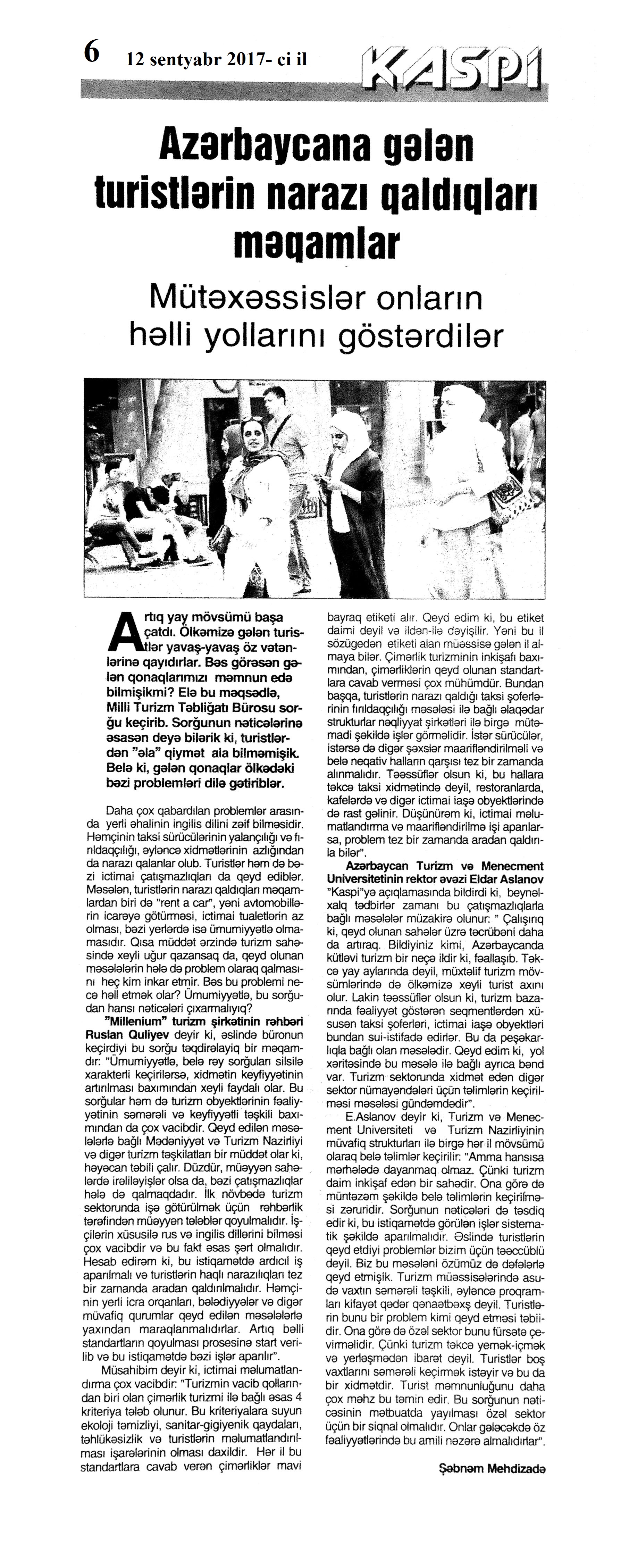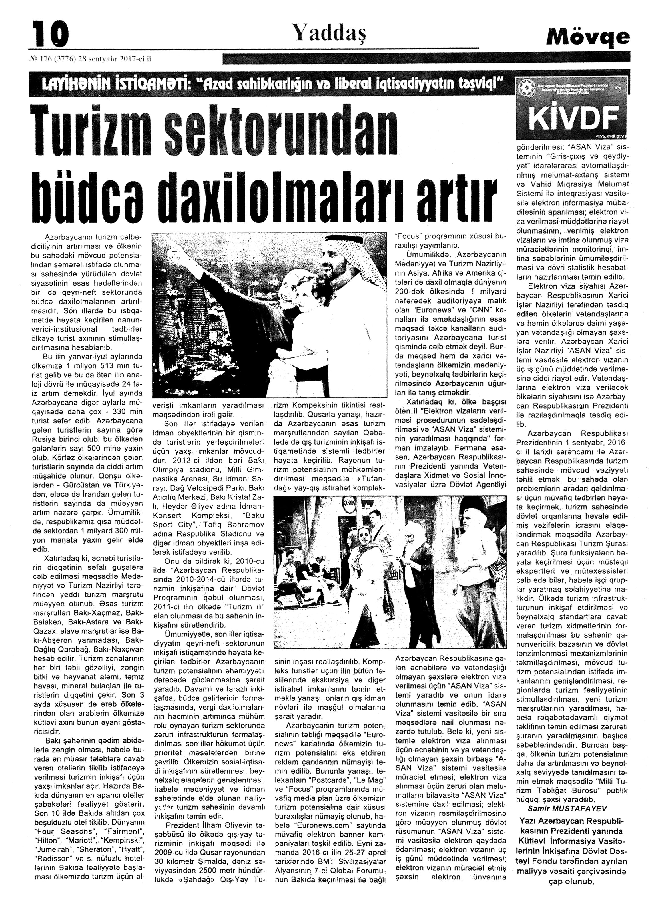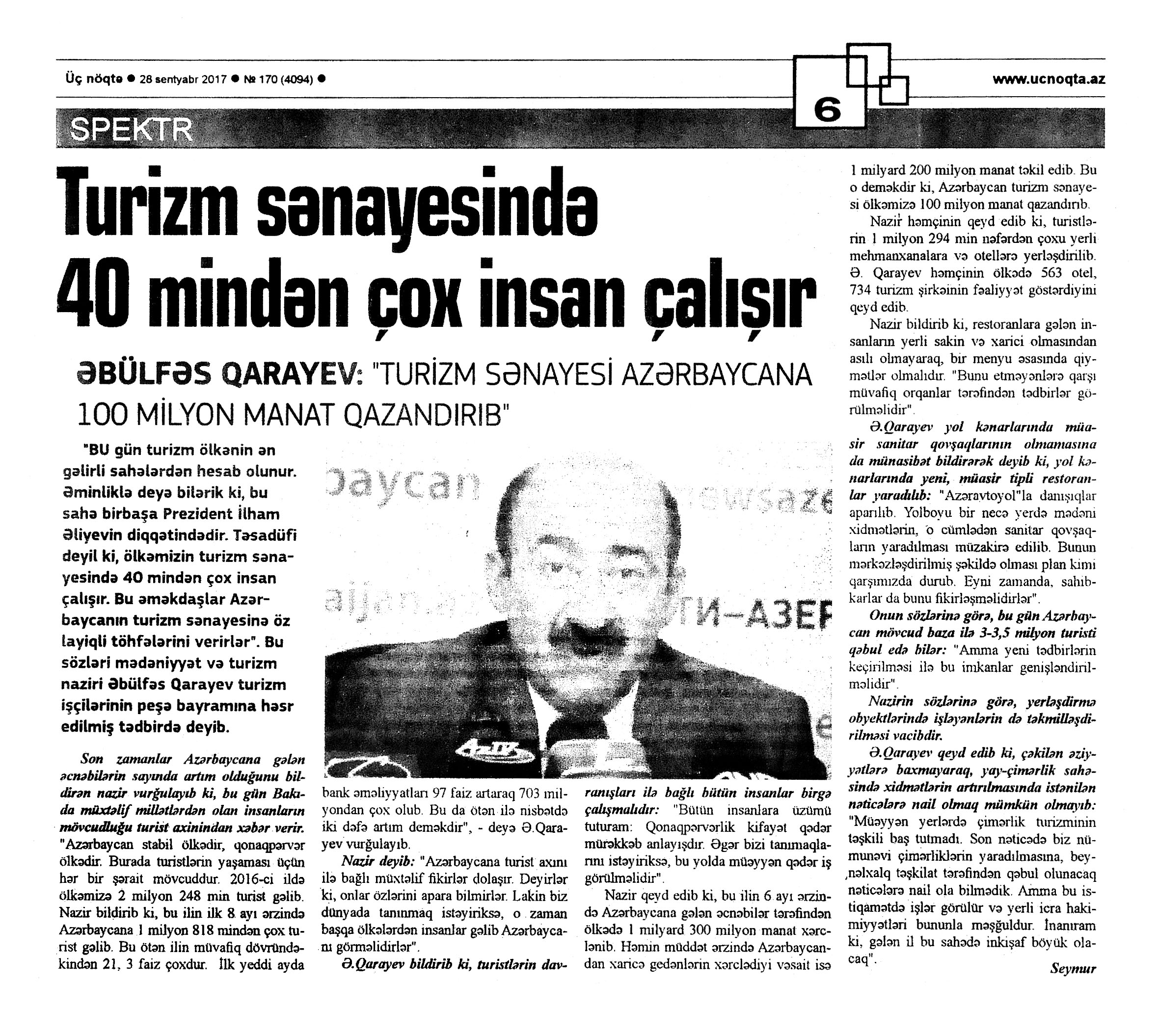 TURİZM 346. Ağalarova, Ş. Azərbaycan ilə Fransa arasında turizm sahəsində əməkdaşlığa dair müzakirələr aparılıb: [Parisdə keçirilən “Top Resa 2017” beynəlxalq turizm sərgisi çərçivəsində Azərbaycanın Fransadakı səfiri Rəhman Mustafayev Fransanın “Entreprises de Voyage” şirkətinin vitse-prezidenti Rişar Subyel ilə görüşüb] //Xalq qəzeti.- 2017.-28 sentyabr.- S.6. 347. Azər. Türkiyənin nüfuzlu nəşri Azərbaycanın turizm potensialından yazdı //Kaspi.- 2017.- 19 sentyabr.- S.5. 348. “Azərbaycan ilk baxışdan özünü sevdirir”: Rusiyanın “Metro” qəzeti ölkəmizin turizm imkanlarından yazır //Mədəniyyət.- 2017.- 1 sentyabr.- S.9. 349. Azəri, L. Azərbaycanın turizm imkanları ekran əsərlərində: Ölkəmizin təbii gözəllikləri, görməli yerləri və tarixi-mədəni irsindən bəhs edən onlarla film lentə alınıb //Mədəniyyət.- 2017.- 8 sentyabr.- S.9. 350. Azəri, L. Şərqlə Qərbin arasında...: Rusiya mətbuatında Azərbaycan turizmindən bəhs edən daha bir məqalə yayımlanıb //Mədəniyyət.- 2017.- 1 sentyabr.- S.5. 351. Azəri, N. Ölkəmizdə həyata keçirilən turizm layihələri öz müsbət nəticələrini verir: [Birləşmiş Millətlər Dünya Turizm Təşkilatı (UNWTO) və Dünya Turizm Etika Komitəsi qurumunun təsis etdiyi forum haqqında] //Yeni Azərbaycan.- 2017.- 19 sentyabr.- S.7. 352. Bağırov, N. Turizm sahəsində xidmət keyfiyyəti artırılacaq: [Azərbaycan Turizm Assosiasiyanın sədri Nahid Bağırovla müsahibə] //Olaylar.- 2017. - 12 sentyabr.- S.12. 353. Bayramova, Z. “Şahdağ” Turizm Mərkəzi yay mövsümünü başa vurub //Səs.- 26 sentyabr.- S.11. 354. 1,8 milyon turist...: Azərbaycana 8 ayda bu qədər əcnəbi gəlib //Ekspress.- 2017.- 22 sentyabr.- S.6. 355. Çində Dünya Turizm Təşkilatı Baş Assambleyasının sessiyası keçirilir: Təşkilatın İcraiyyə Şurasının 106-cı sessiyasına Azərbaycan sədrlik edir //Mədəniyyət.- 2017.- 13 sentyabr.- S.2. 356. Dünya Turizm Təşkilatı Baş Assambleyasının 22-ci sessiyası davam edir: [Çin Xalq Respublikasının Çenqdu şəhərində keçirilən sessiyada Mədəniyyət və Turizm naziri Əbülfəs Qarayevin iştirak etməsi haqqında] //Mədəniyyət.- 2017.- 15 sentyabr.- S.3. 357. Dünya Turizm Təşkilatı Baş Assambleyasının sessiyası başa çatıb: Nazir Əbülfəs Qarayev bir sıra görüşlər keçirib] //Mədəniyyət.- 2017.- 20 sentyabr.- S.5. 358. Əliyeva, S. Azərbaycan Tokioda keçirilən “JATA 2017” beynəlxalq turizm sərgisində təmsil olunub //Xalq qəzeti.- 2017.-26 sentyabr.- S.11. 359. Əsədov, A. Turizm sektoru büdcənin əsas mənbələrindən biri olacaq //Xalq qəzeti.- 2017.- 28 sentyabr.- S.4. 360. Mehdiyev, N. Ölkəmizin böyük turizm potensialı var: Nizami Mehdiyev: “Yaxın gələcəkdə bu sahədə lider ölkələrdən birinə çevriləcəyimizə inanırıq”: [“Alison Travel” turizm şirkətinin rəhbəri Nizami Mehdiyevlə müsahibə] //Olaylar.- 2017.-14 sentyabr.- S.12. 361. Mehdizadə, Ş. Azərbaycana gələn turistlərin narazı qaldıqları məqamlar: Mütəxəssislər onların həlli yollarını göstərdilər //Kaspi.- 2017.- 12 sentyabr.- S.7. 362. Mustafayev, S. Turizm sektoru yeni inkişaf mərhələsinə qədəm qoyub //Mövqe.- 2017.-21 sentyabr.- S.10. 363. Mustafayev, S. Turizm sektorundan büdcə daxilolmaları artır //Mövqe.- 2017.- 28 sentyabr.- S.10. 364. Mükərrəmoğlu, M. Turizm: yeni hədəflərə doğru: Strateji Yol Xəritəsi turizmin inkişafına güclü stimul yaradıb //Xalq qəzeti.- 2017.-13 sentyabr.- S.9. 365. Nərimanoğlu, M. Turistlərin Azərbaycana marağı artıb: Dünyanın 139 ölkəsindən 1,2 milyondan çox əcnəbi ölkəmizə səfər edib //Azərbaycan.- 2017.- 7 sentyabr.- S.7. 366. Ölkəmiz Tokioda beynəlxalq turizm sərgisində təmsil olunub: [“JATA 2017” sərgisində] //Mədəniyyət.- 2017.- 27 sentyabr.- S.9. 367. Regional turizm infrastrukturu ən yüksək səviyyəyə çatır: [Prezident İlham Əliyev Lənkəran rayonuna səfəri çərçivəsində “Xəzər Palace” otel kompleksinin açılışında iştirak edib] //Azərbaycan.- 2017.- 6 sentyabr.- S.6. 368. Rəsulova, İ. Azərbaycan tibbi turizm üçün unikal ölkədir: Mineral müalicəvi bulaqlar, zəngin təbiət böyük imkanlar yaradır //Bizim yol. - 2017.-23 sentyabr.- S.11. 369. Sadıqov, Ə. “Euro- Group” şirkəti muştərilərə keyfiyyətli xidmət göstəriri: [şirkətin rəhbəri Aydın Əhmədovun fikirləri] //Respublika.- 2017.- 22 sentyabr.- S.5. 370. Turizm sənayəsində 40 mindən çox insan çalışır: [Mədəniyyət və Turizm naziri Əbülfəs Qarayevin fikirləri] //Üç nöqtə.- 2017.- 28 sentyabr.- S.6.