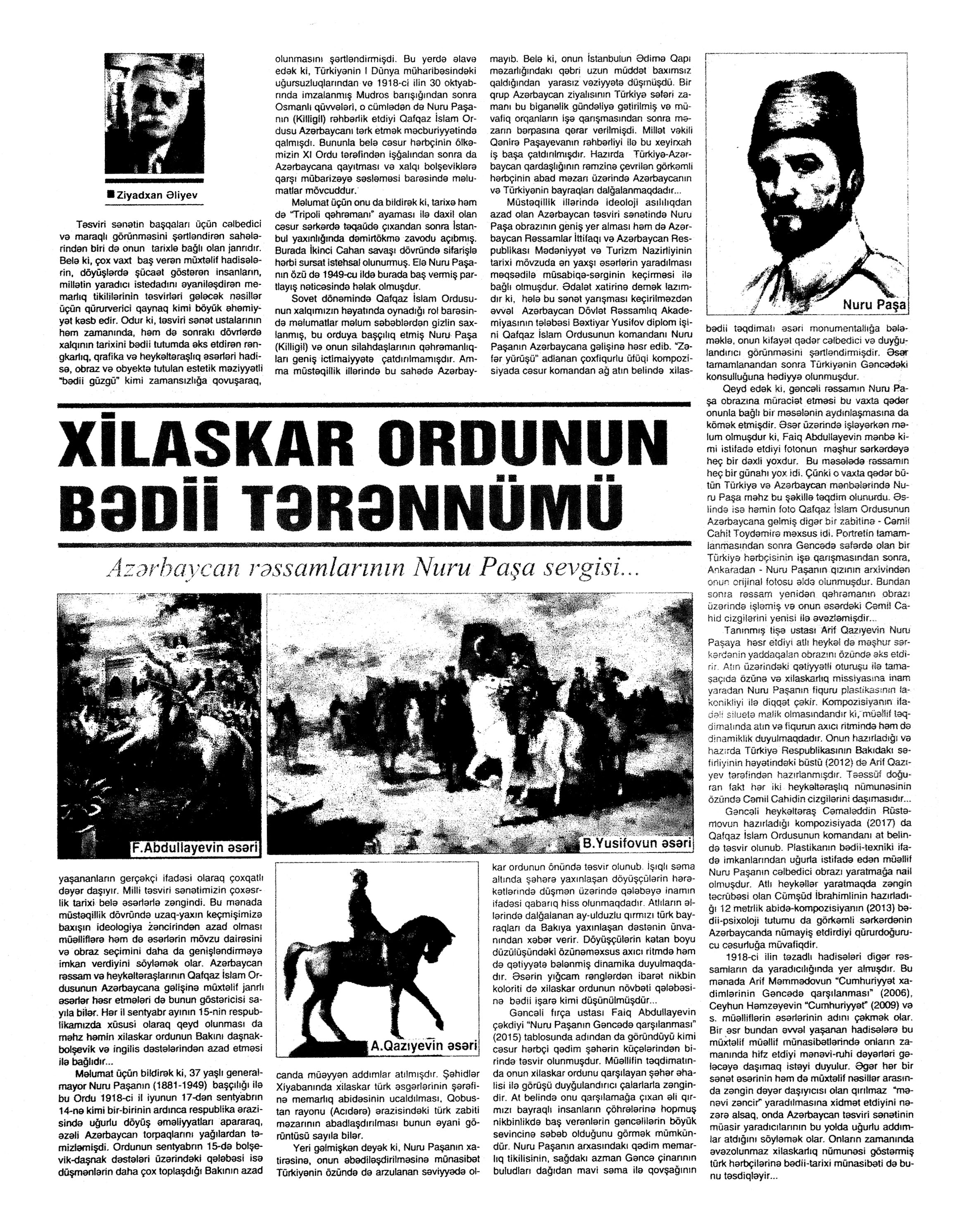İNCƏSƏNƏT RƏNGKARLIQ 134. Ağsuda Xalq rəssamı Asəf Cəfərovun sərgisi açılıb: [90 illiyi münasibətilə] //Mədəniyyət.- 2017.- 8 sentyabr.- S.2. 135. Azərbaycanlı rəssam: Rusiya Rəssamlıq Akademiyasının fəxri adı seçildi: [Teymur Rzayev haqqında] //Kaspi.- 2017.- 21 sentyabr.- S.13. 136. Əliyev, Z. “Manqa başçısı Rəxşəndə”nin taleyi: Bir əsərin tarixçəsi: [Mikayıl Abdullayevin yaradıcılığı haqqında] //Mə-dəniyyət.- 2017.- 29 sentyabr.- S.13. 137. Əliyev, Z. Gəncəli rəssamın Nuru Paşa sevgisi: Bir əsərin tarixçəsi: [rəssam Faiq Abdullayevin Nuru Paşaya həsr etdiyi portreti haqqında] //Mədəniyyət.- 2017.- 15 sentyabr.- S.12. 138. Əliyev, Z. Həyata gerçəkçi baxışın lirik çalarları: Rəssam Firudin Quliyevin sənət dünyası... //Kaspi.- 2017.- 30 sentyabr.- S.24. 139. Əliyev, Z. Xilaskar ordunun bədii tərənnümü: Azərbaycan rəssamlarının Nuru Paşa sevgisi... //Kaspi.- 2017.- 15 sentyabr.- S.24.; 525-ci qəzet.- 2017.- 14 sentyabr.- S.7. 140. Əmiraslanov, M. “Qara qızıl”ın bədii tərənnümü: Cəmil Müfidzadənin neft mövzulu əsərlərinin çalarları: [Xalq rəssamı, görkəmli qrafika ustası, professor haqqında] //Kaspi.- 2017.- 20 sentyabr.- S.15. 141. Fərəcov, S. Misir nağılları balaca azərbaycanlı rəssamların gözü ilə: “İslam Həmrəyliyi İli”nə həsr olunmuş sərgi: [“Azərkitab” Kitab mərkəzində] //Mədəniyyət.- 2017.- 27 sentyabr.- S.4. 142. Heydər Əliyev Fondunun vitse-prezidnti Leyla Əliyeva Dövlət Rəssamlıq Akademiyasında olub //Azərbaycan.- 2017.-16 sentyabr.- S.6. 143. Xalq rəssamının yubileyinə həsr olunmuş sərgi açılıb: [Azərbaycan Milli İncəsənət Muzeyində Asəf Cəfərovun 90 illiyinə həsr olunmuş sərgi haqqında] //Bizim yol.- 2017.-23 sentyabr.- S.11. 144. Kamal, R. Baramaçılığın dirçəldilməsi ipəkçiliklə yanaşı, xalçaçılığın da inkişafına şərait yaradır //Azərbaycan.- 2017.-20 sentyabr.- S.7. 145. Kəngərli, R. Naxçıvanın ilk qadın teatr rəssamı: [Fizzə Quliyeva haqqında] //Kaspi.- 2017.- 21 sentyabr.- S.12. 146. Qaliboğlu, S. “Aydınlığın rəssamı, rəssamın aydınlığı”: Naxçıvanlı gənc rəssamın Bakıda sənətsevərlərlə görüşü: [Xətai Sənət Mərkəzində Səbrəli Nəbiyevin eyniadlı fərdi sərgisinin açılışı haqqında] //Mədəniyyət.- 2017.- 13 sentyabr.- S.13. 147. Qaliboğlu, S. “Milliliyimizi qoruyaq”: Xətai Sənət Mərkəzində Beynəlxalq Sülh Gününə həsr edilmiş sərgi //Mədəniyyət.- 2017.- 22 sentyabr.- S.2. 148. Qaliboğlu, S. Əyalətdə rəssam olmaq: [Əməkdar rəssam Rafael Zeynal haqqında] //Mədəniyyət.- 2017.- 27 sentyabr.- S.11. 149. Qaliboğlu, S. Xalq rəssamı Asəf Cəfərovun yubileyinə həsr edilmiş sərgi: [Milli İncəsənət Muzeyində] //Mədəniyyət.- 2017.- 27 sentyabr.- S.2. 150. Qaliboğlu, S. Ömrün yaradıcı anlamı: [rəssam Bayram Qasımxanlı haqqında] //Mədəniyyət.- 2017.-6 sentyabr.- S.12. 151. Qaliboğlu, S. Teatr rəssamı və tətbiqi sənət ustası: [Sənubər Səmədova haqqında] //Mədəniyyət.- 2017.- 15 sentyabr.- S.10. 152. “Qoy həmişə sülh olsun”: [Beynəlxalq Sülh Gününə həsr olunmuş eyniadlı rəsm müsabiqəsi haqqında] //Mədəniyyət.- 2017.- 8 sentyabr.- S.5. 153. Quliyeva, S. Hyustondan gələn sənət səsi: [rəssam Səidə Haqverdiyeva haqqında] //Mədəniyyət.- 2017.- 22 sentyabr.- S.13. 154. Mehdizadə, Ş. “Çərçivəyə girməkdən qorxuram”: Rəssam Pərviz Əsədov əsərləri uzunömürlü olsun deyə, onları dəri üzərində çəkir //Kaspi.- 2017.- 8 sentyabr.- S.15. 155. Mənsimov, E. Azadlığı vəsf edən fırça: [məhkum Bəhram Məmmədovun əl işləri] //Azərbaycan.- 2017.- 6 sentyabr.- S.15. 156. Rəsmləri ürəyi ilə çəkən sənətkar: [Astara Rayon Mədəniyyət mərkəzində rəssam Firudin Quliyevin əsərlərindən ibarət sərgi və anadan olmasının 70 illik yubileyi ilə əlaqədar keçirilən tədbir haqqında] //Mədəniyyət.- 2017.- 13 sentyabr.- S.10. 157. Sarıyeva, İ. Dünyada Azərbaycanı tanıdan müasir rəssamlar...: [sənətşünas Ziyadxan Əliyev haqqında] //Bakı xəbər.- 2017.-16-18 sentyabr.- S.15. 158. Sarıyeva, İ. Milli təsviri incəsənətimizdə yeni janr- neft rəssamlığı...: Səkinə Baharlı: “Neftlə əsər yaratmaq yeni dəst-xətt, yeni janrdır: [rəssam Sabir Çopuroğlu haqqında] //Bakı xəbər.- 2017.- 13 sentyabr.- S. 15. 159. Soydaşımız Rusiya Rəssamlıq Akademiyasının fəxri akademiki seçilib: [Teymur Rzayev] //Mədəniyyət.- 2017.- 22 sentyabr.- S.16. 160. Şıxəliyeva, S. Rənglərə ixtiyar verən rəssam: [Xalq rəssamı Hüseyn Əliyev] //Mədəniyyət.- 2017.- 13 sentyabr.- S.12. 161. Teymur Rzayev Rusiya Rəssamlıq Akademiyasının fəxri akademiki seçilib //Xalq qəzeti.- 2017.- 20 sentyabr.- S.4.