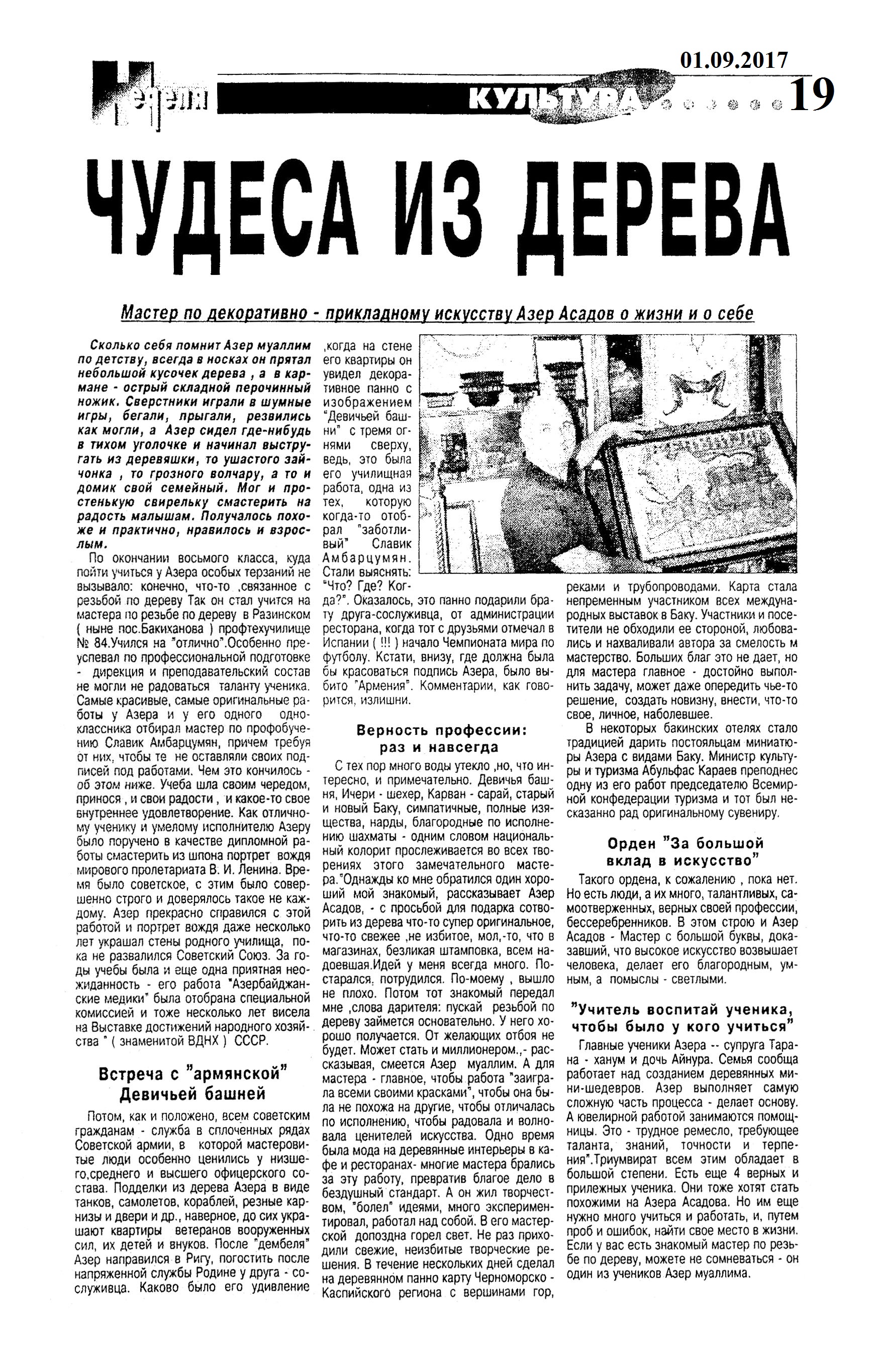 ДЕКОРАТИВНО-ПРИКЛАДНОЕ ИСКУССТВО 760. Алиева, Ф. Сказочный мир Фарах Алиевой: Интервью с членом Международной организации авторских кукол /провела З.Исмайлова //Эхо.- 2017.- 30 сентября.- С.10. 761. В Центре современного искусства YARAT! Состоится встреча с известными кукольниками: [П.Гусейновым и И.Гундориной] //Бакинский рабочий.- 2017.- 27 сентября.- С.7. 762. Ляшко, Б. Национальное достояние: В течение двух предстоящих лет в стране войдут в строй 30 новых ковроткацких фабрик: [открытие филиала «Азерхалча» в Шамкире] //Азербайджанские известия.- 2017.- 9 сентября.- С.2. 763. Ляшко, Б. Чудеса из дерева: Мастер по декоративно-прикладному искусству Азер Асадов о жизни и о себе //Неделя.- 2017.- 1 сентября.- С.19. 764. Ханджанбекова, Ф. Живет в Баку мастер: Али Искендеров кудесник художественной резьбы по дереву //Каспiй.- 2017.- 20 сентября.- С.13.