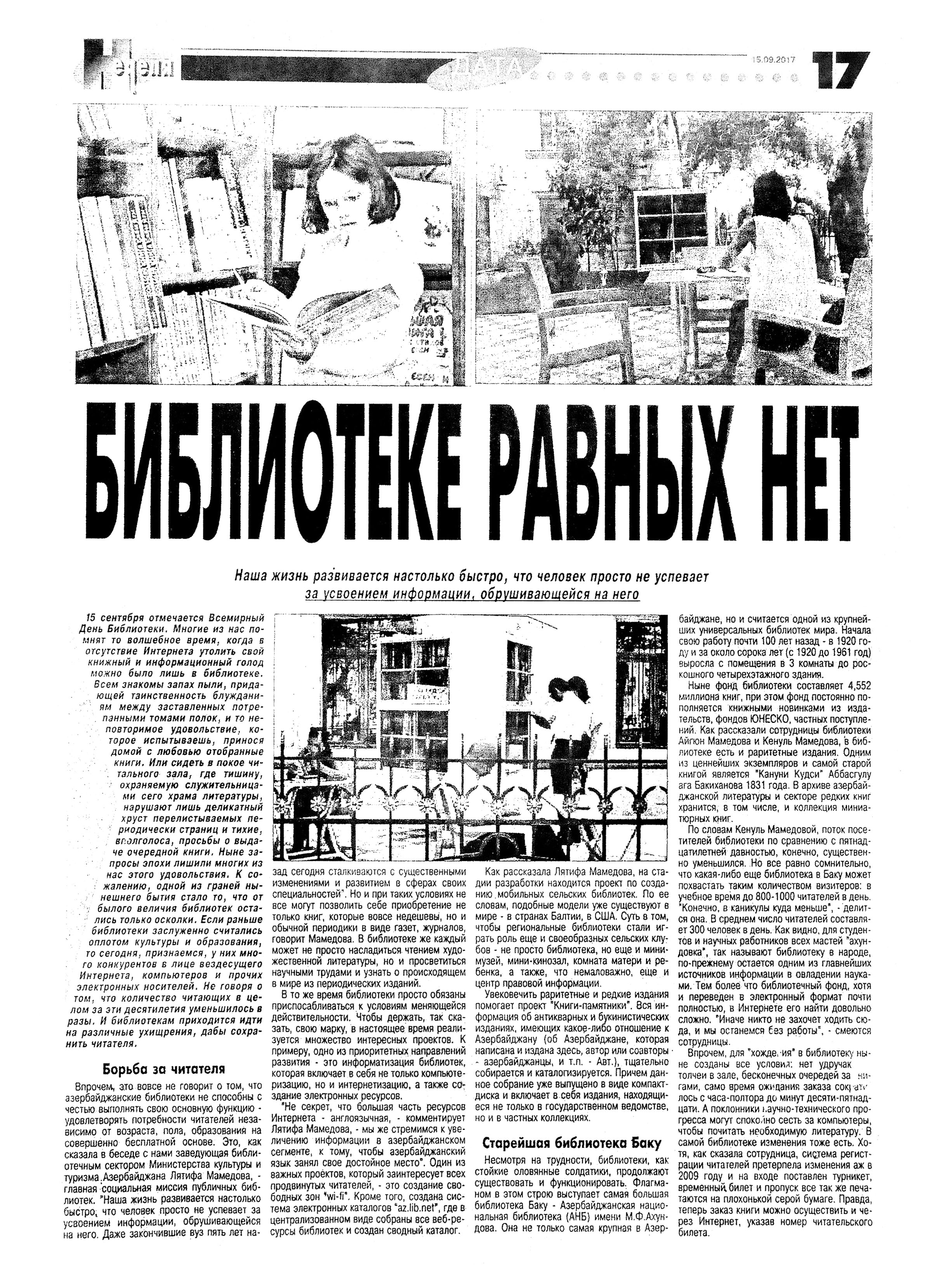 БИБЛИОТЕЧНОЕ ДЕЛО БИБЛИОТЕКОВЕДЕНИЕ 732. Библиотеке равных нет: Наша жизнь развивается настолько быстро, что человек просто не успевает за усвоением информации, обрушивающейся на него //Неделя.- 2017.- 15 сентября.- С.17. 733. Директор Азербайджанской национальной библиотеки, профессор Керим Таиров принял участие в Международной конференции в столице Беларуси Минске //Неделя.- 2017.- 22 сентября.- С.19.